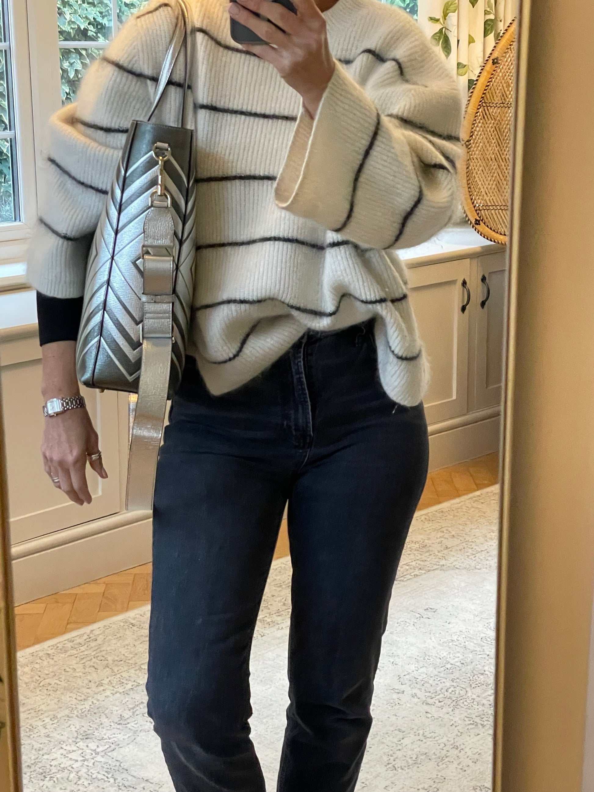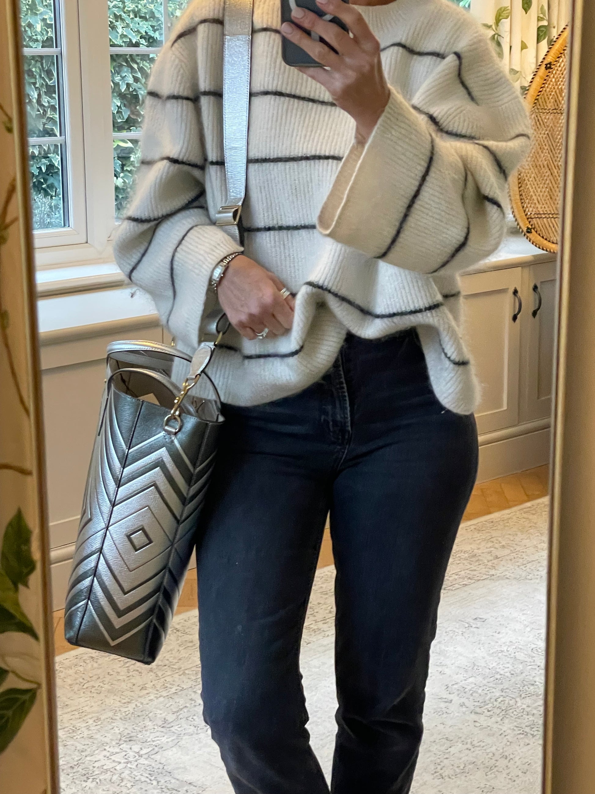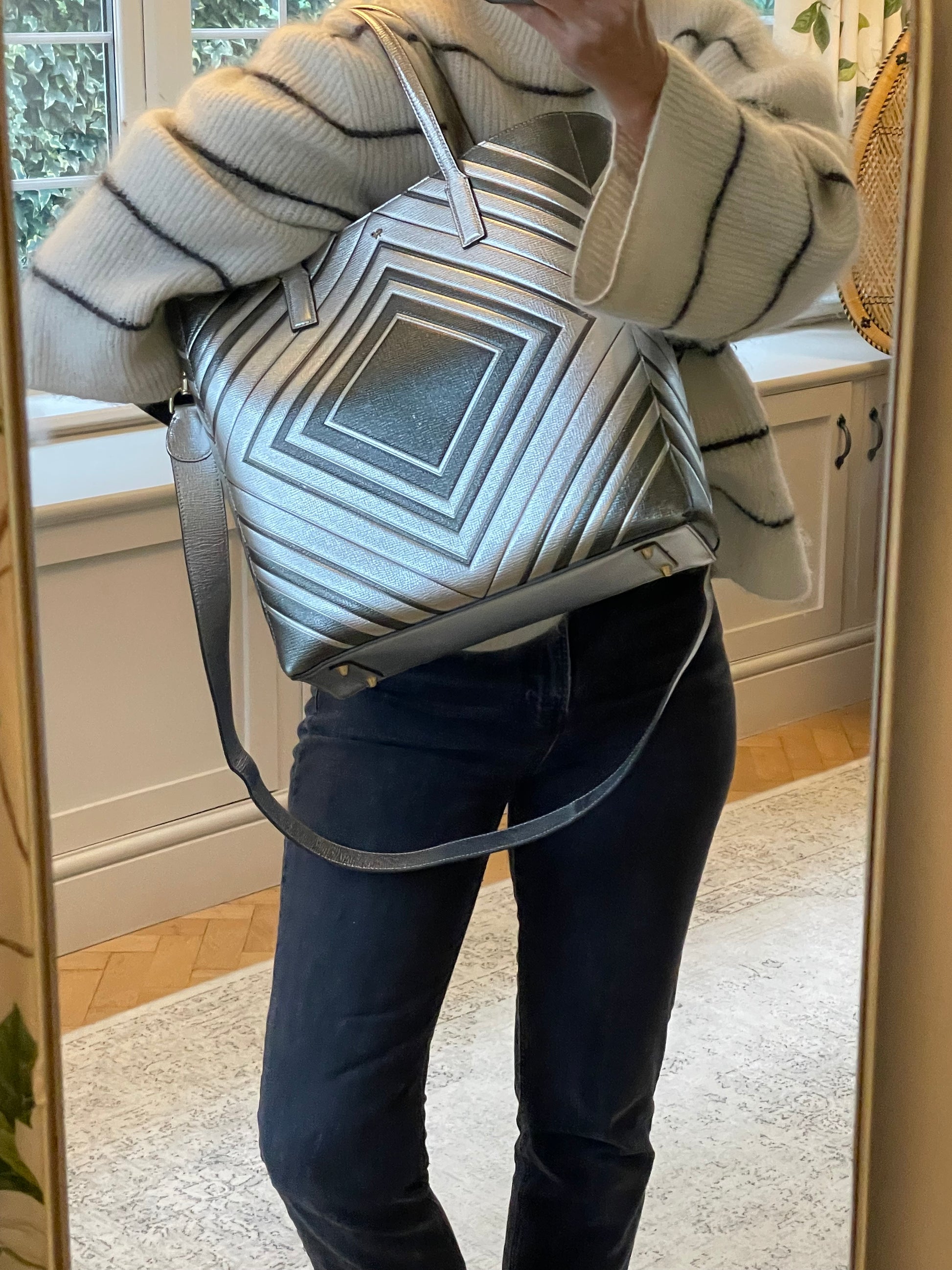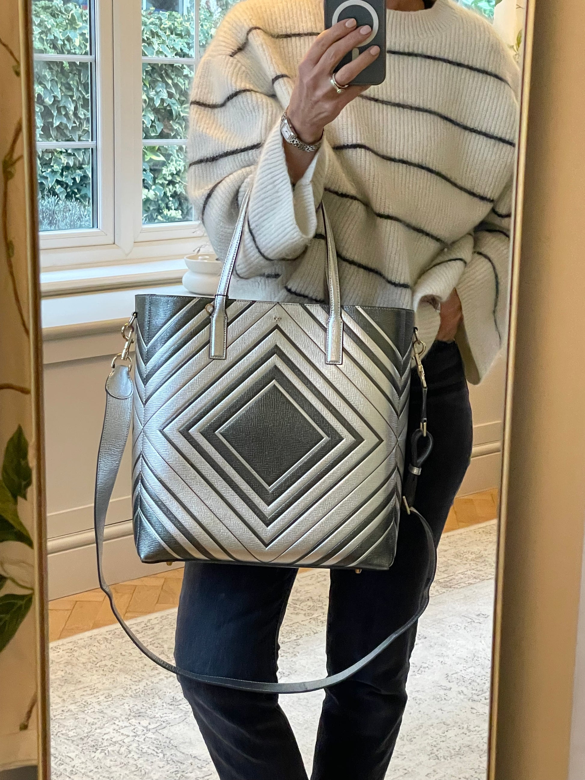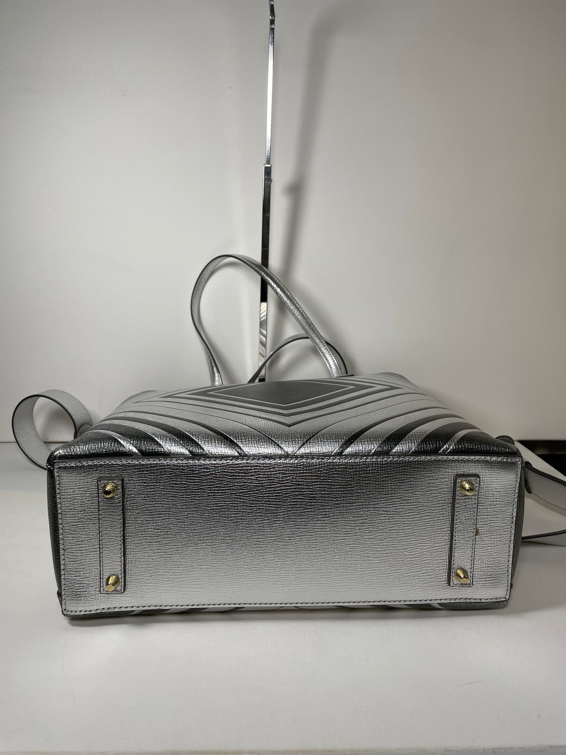 This is a beautiful Anya Hindmarch Ebury Tote bag in Silver Geometric print. One internal pocket, hooks to attach a long strap. Tie close to top. Very spacious, eye catching tote .