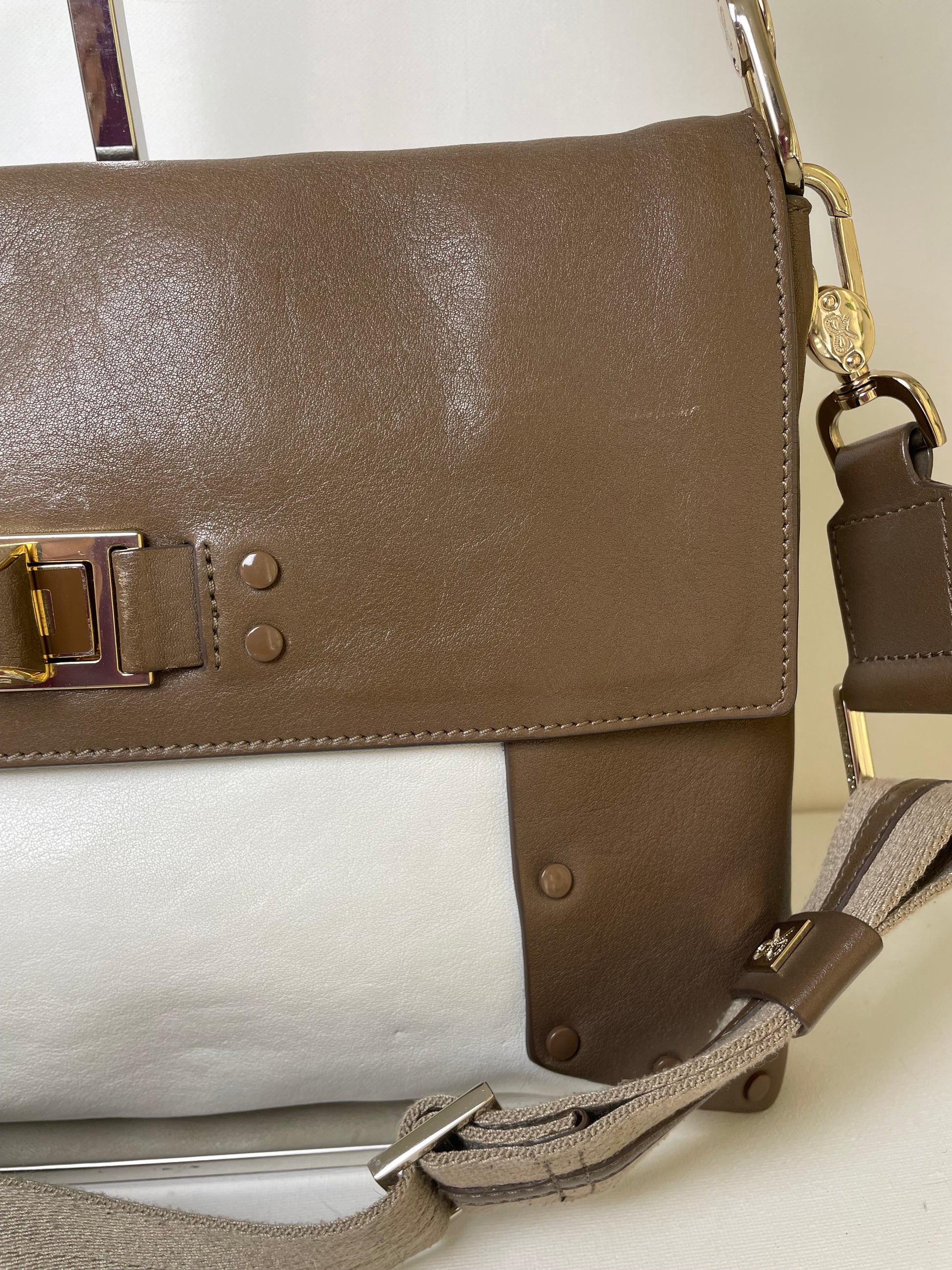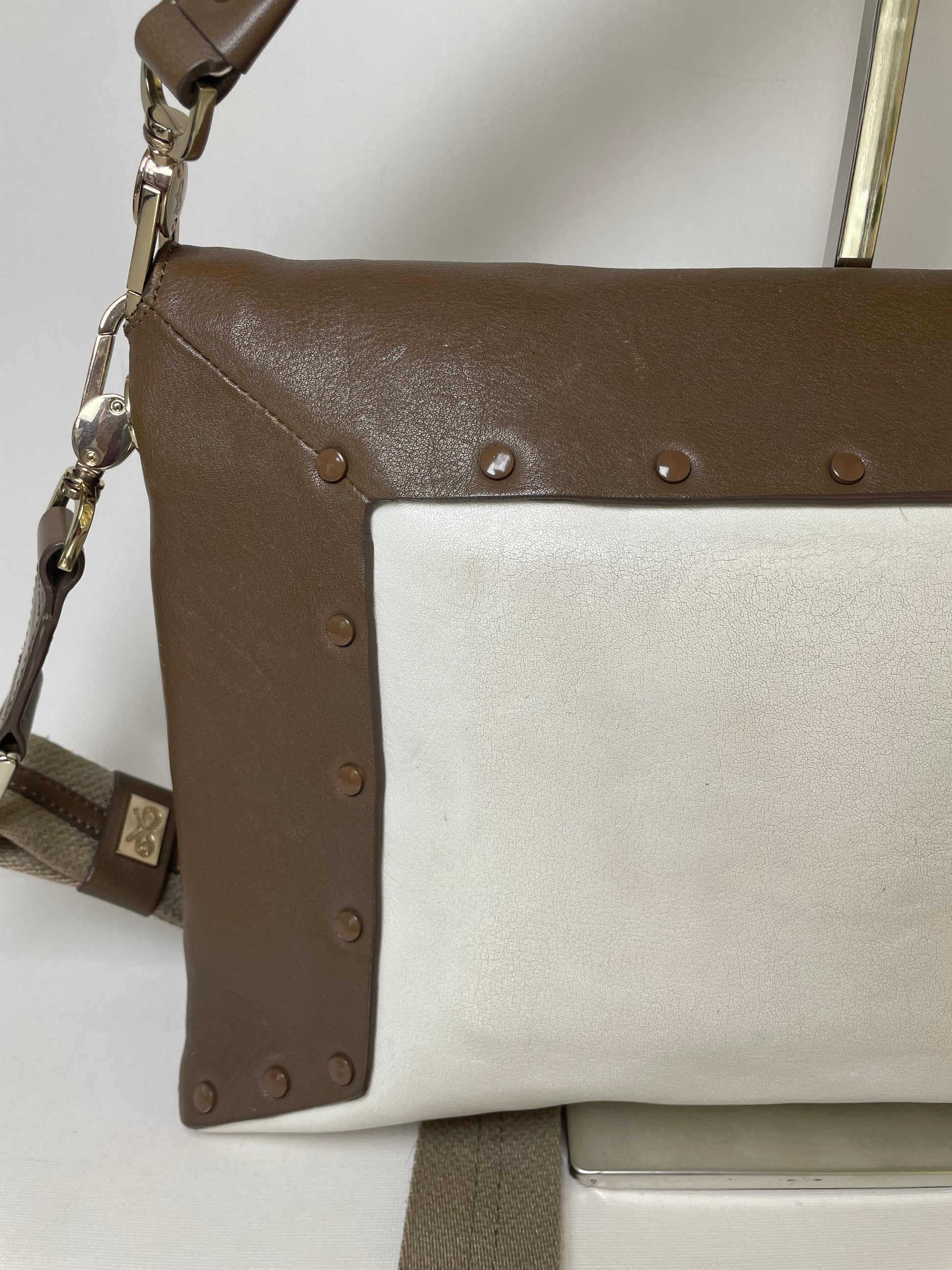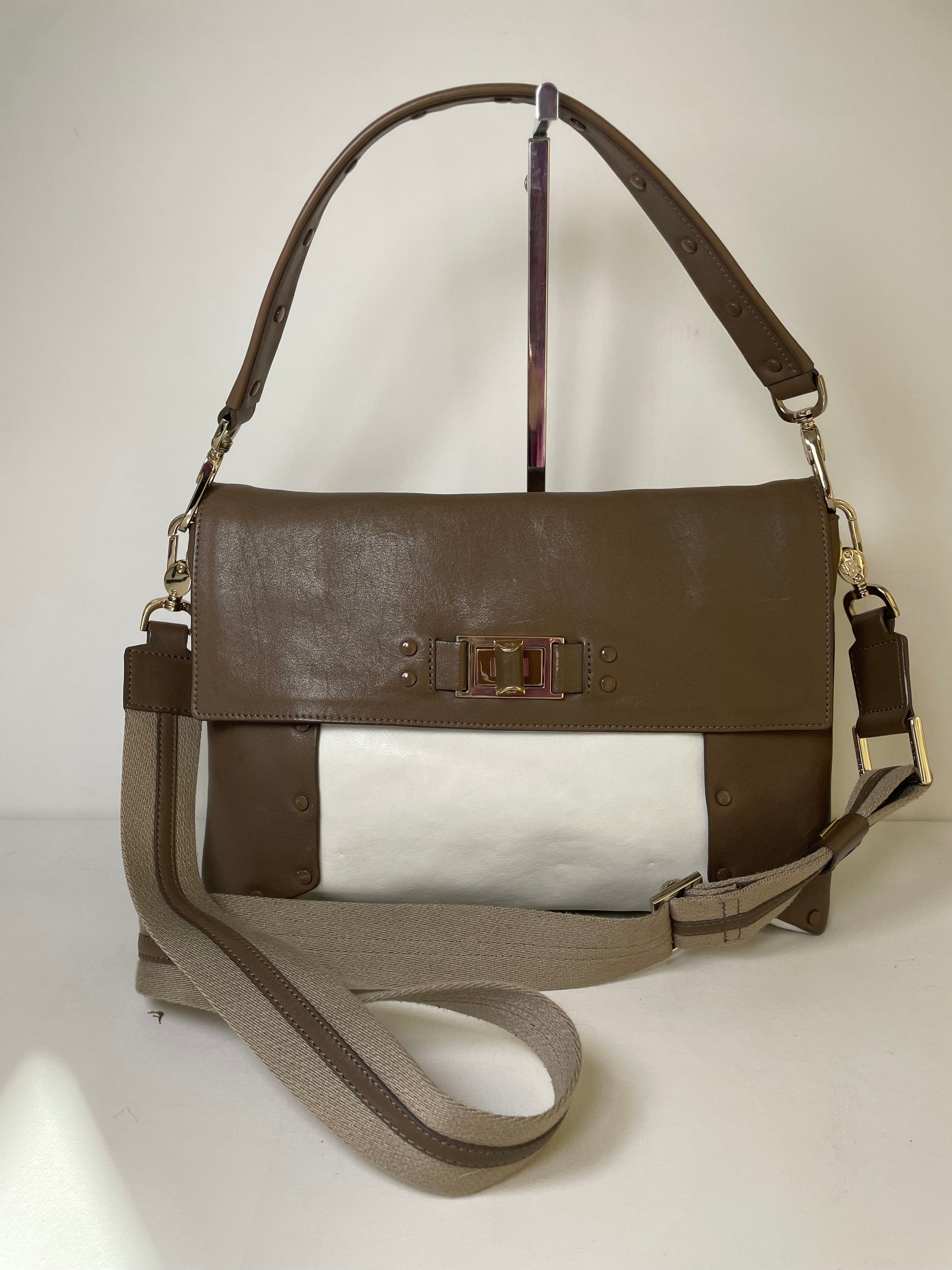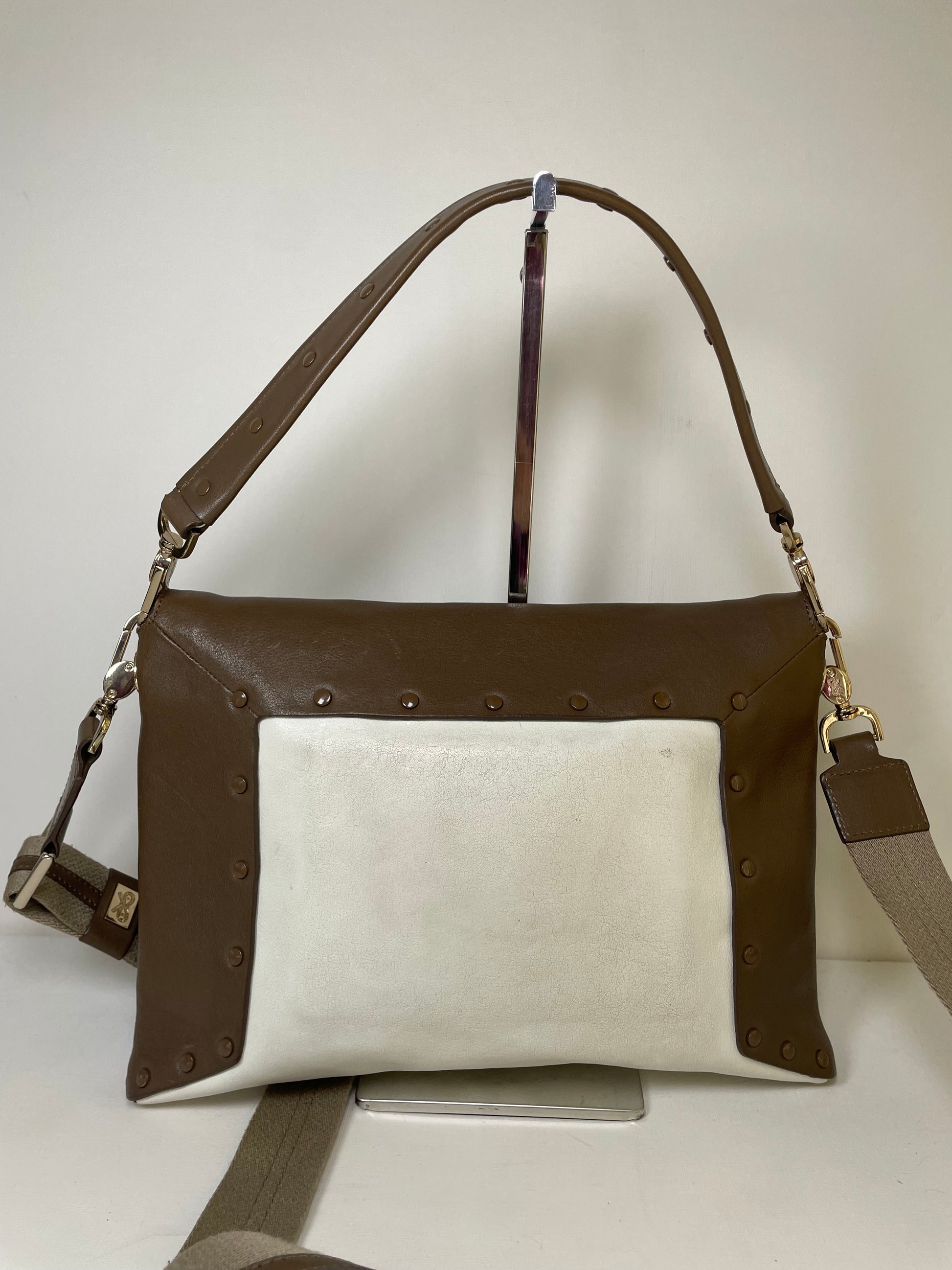 This is a striking and versatile Anya Hindmarch medium sized shoulder bag with contrasting panels of soft coffee and cream coloured leather with stud detailing.