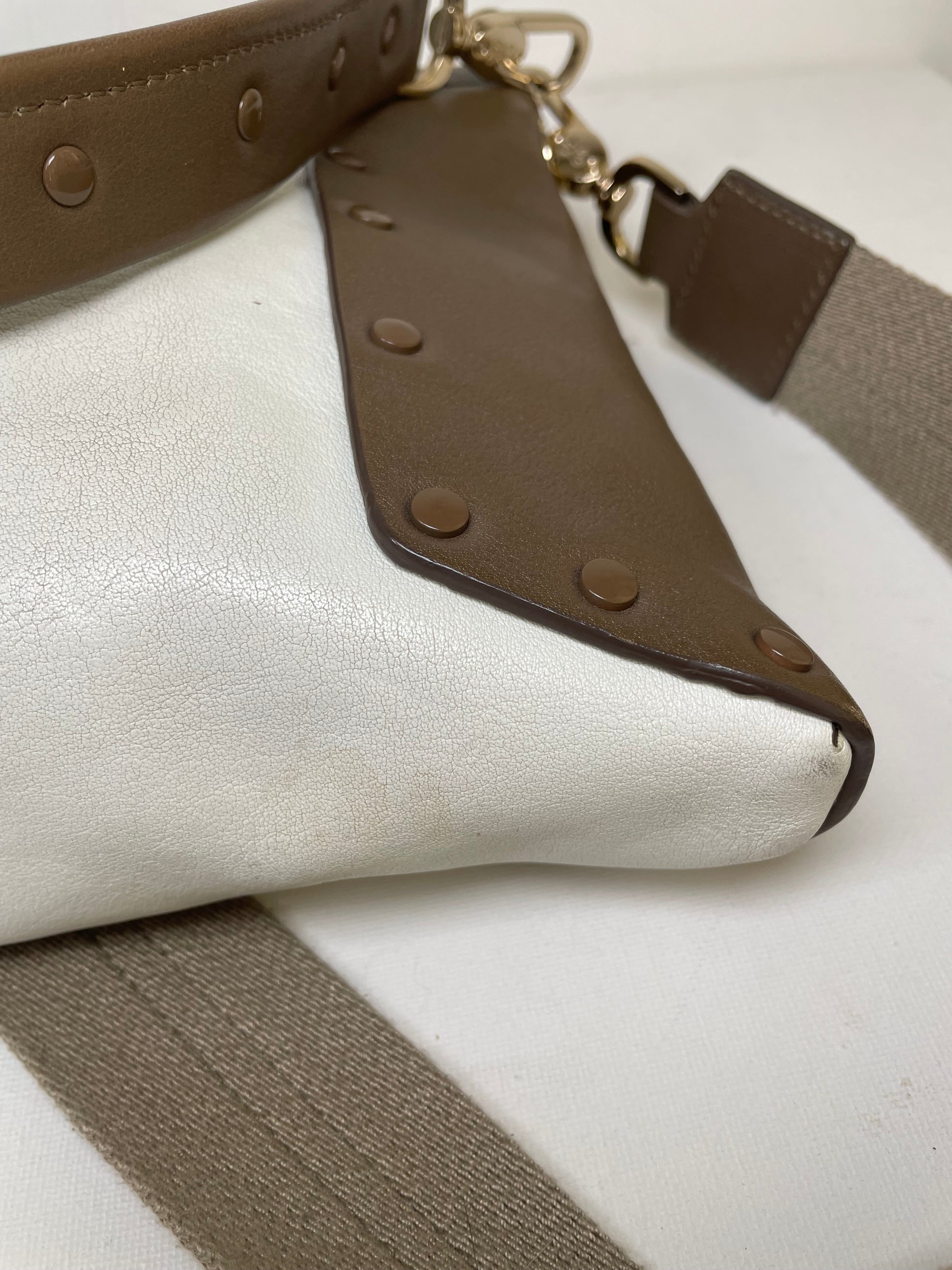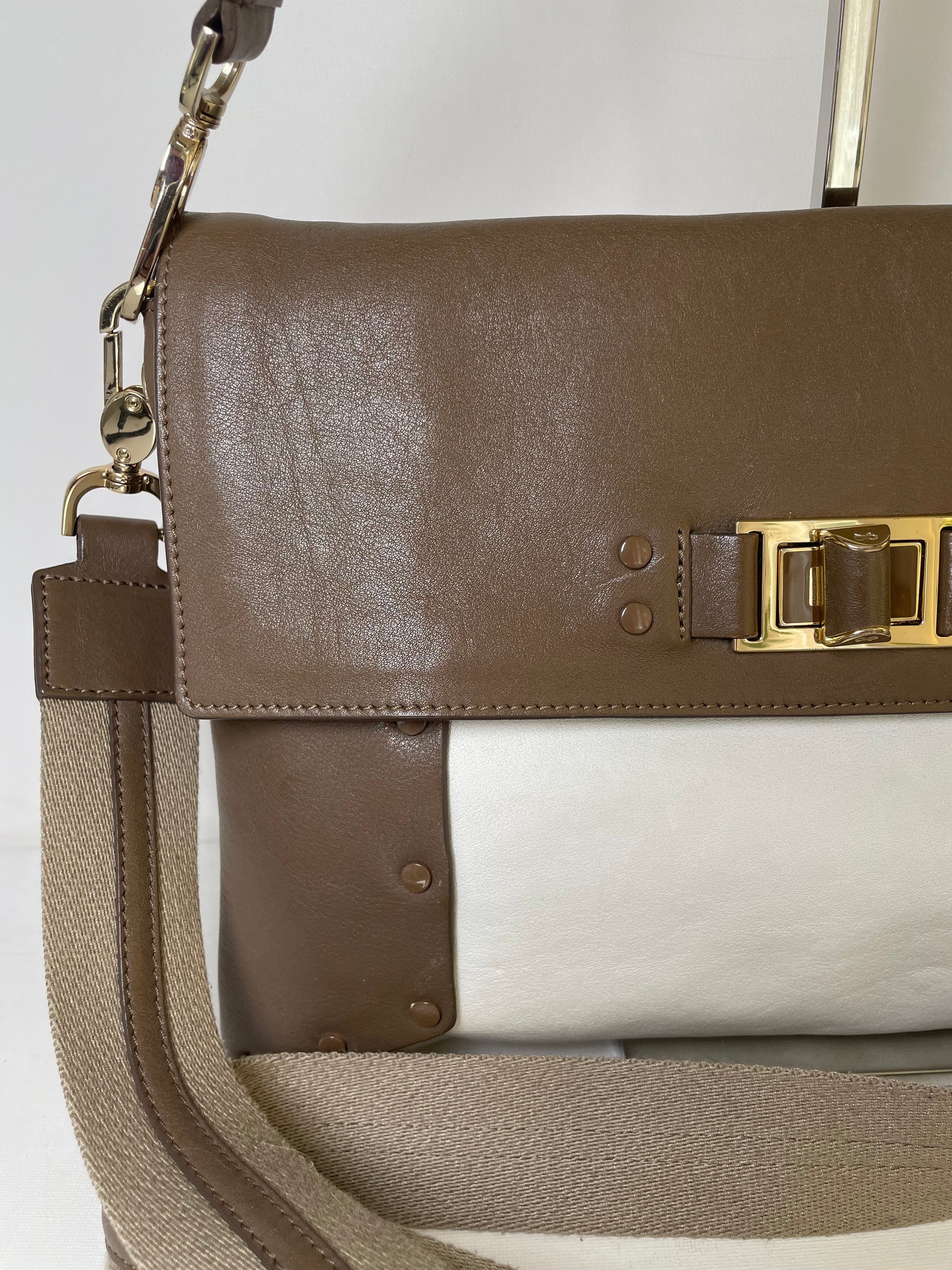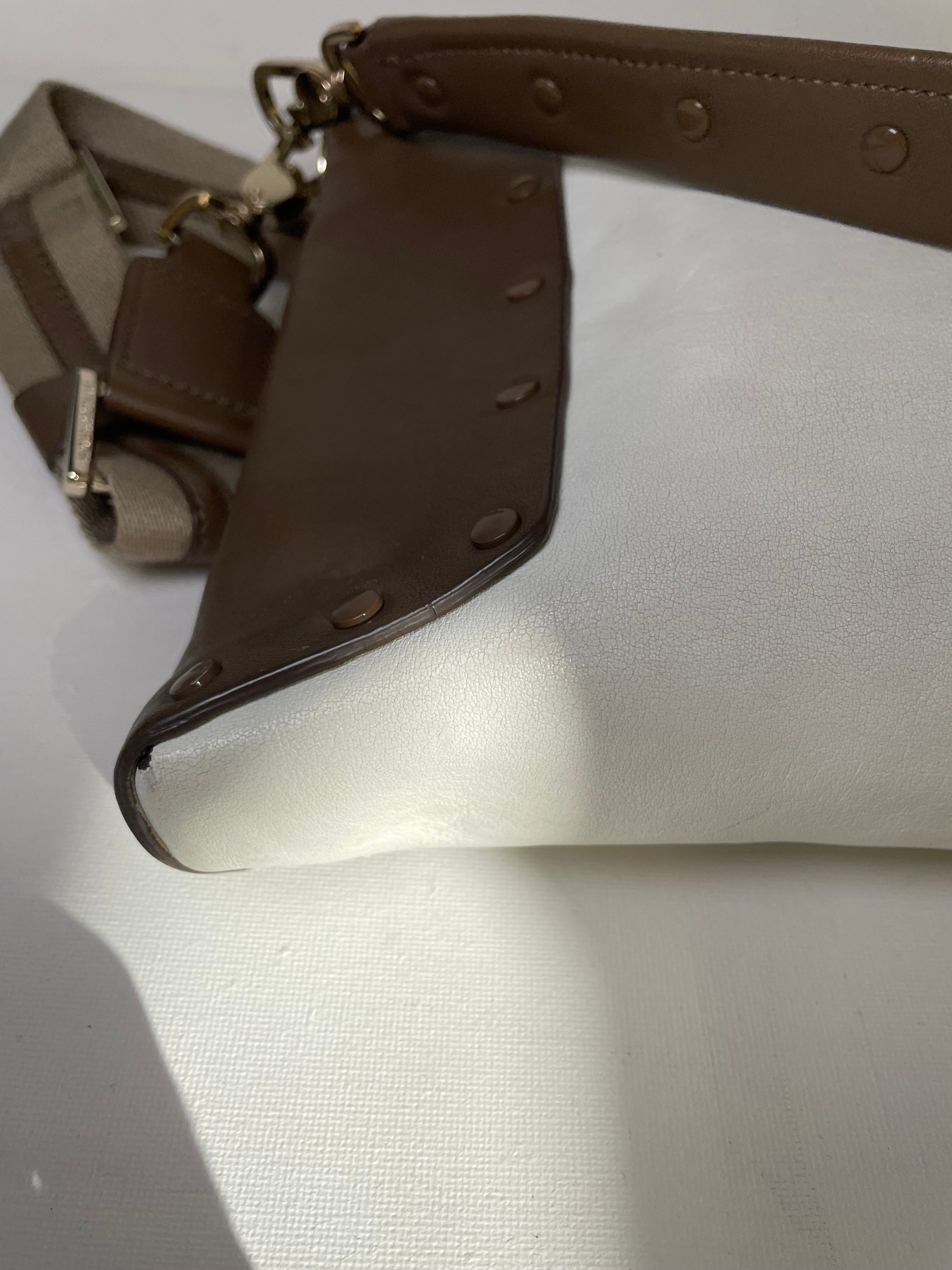 This is a striking and versatile Anya Hindmarch medium sized shoulder bag with contrasting panels of soft coffee and cream coloured leather with stud detailing.