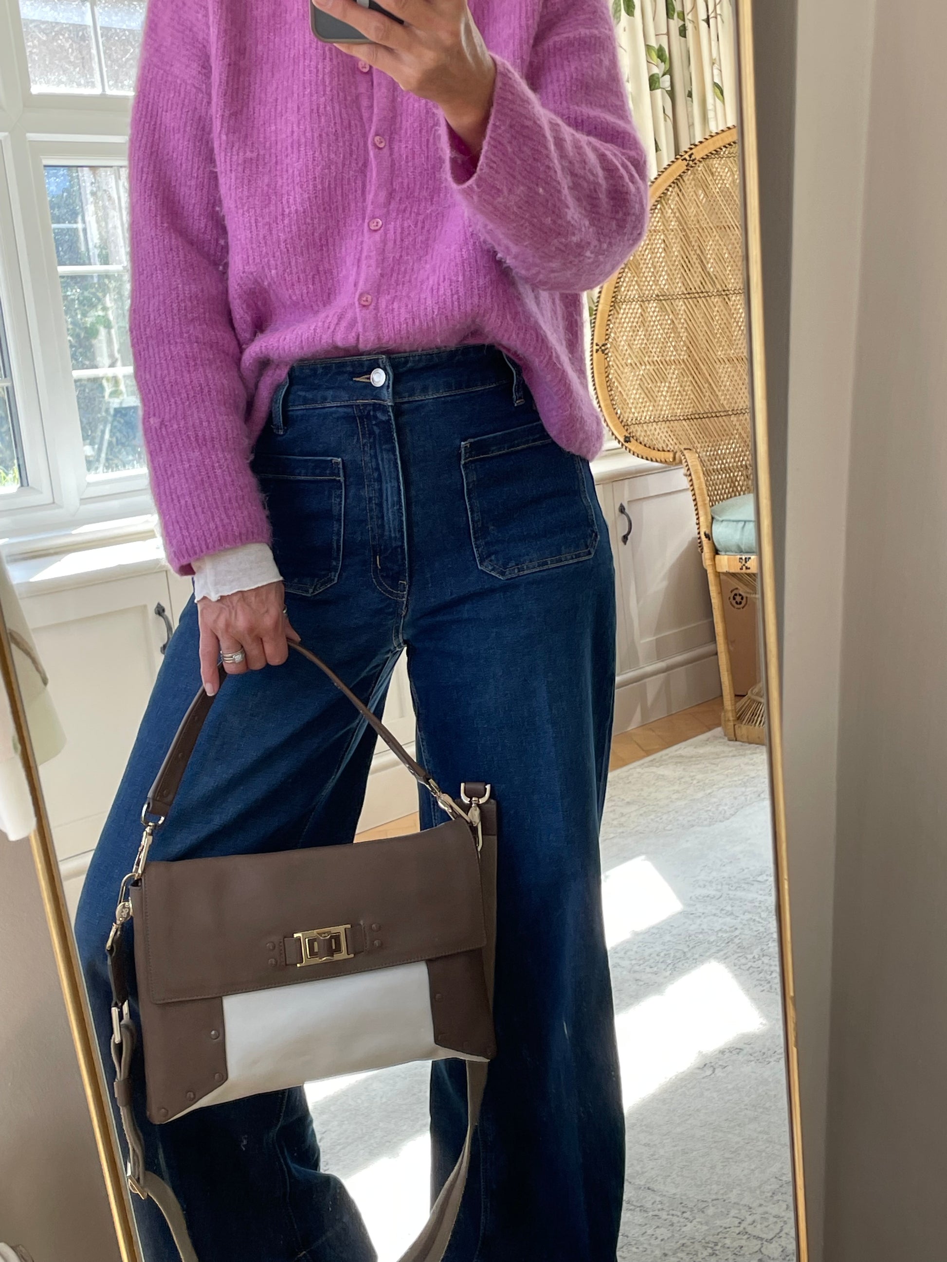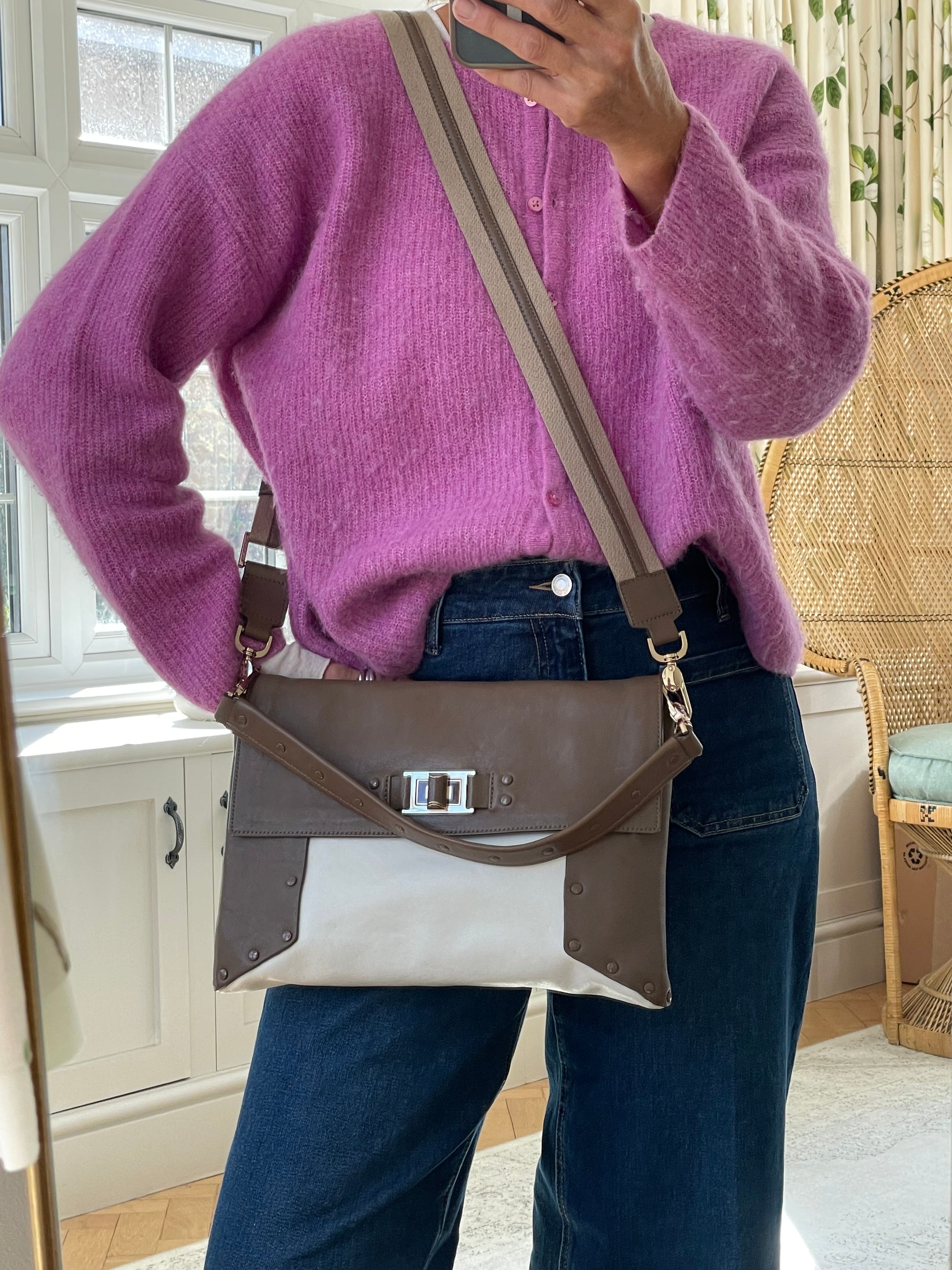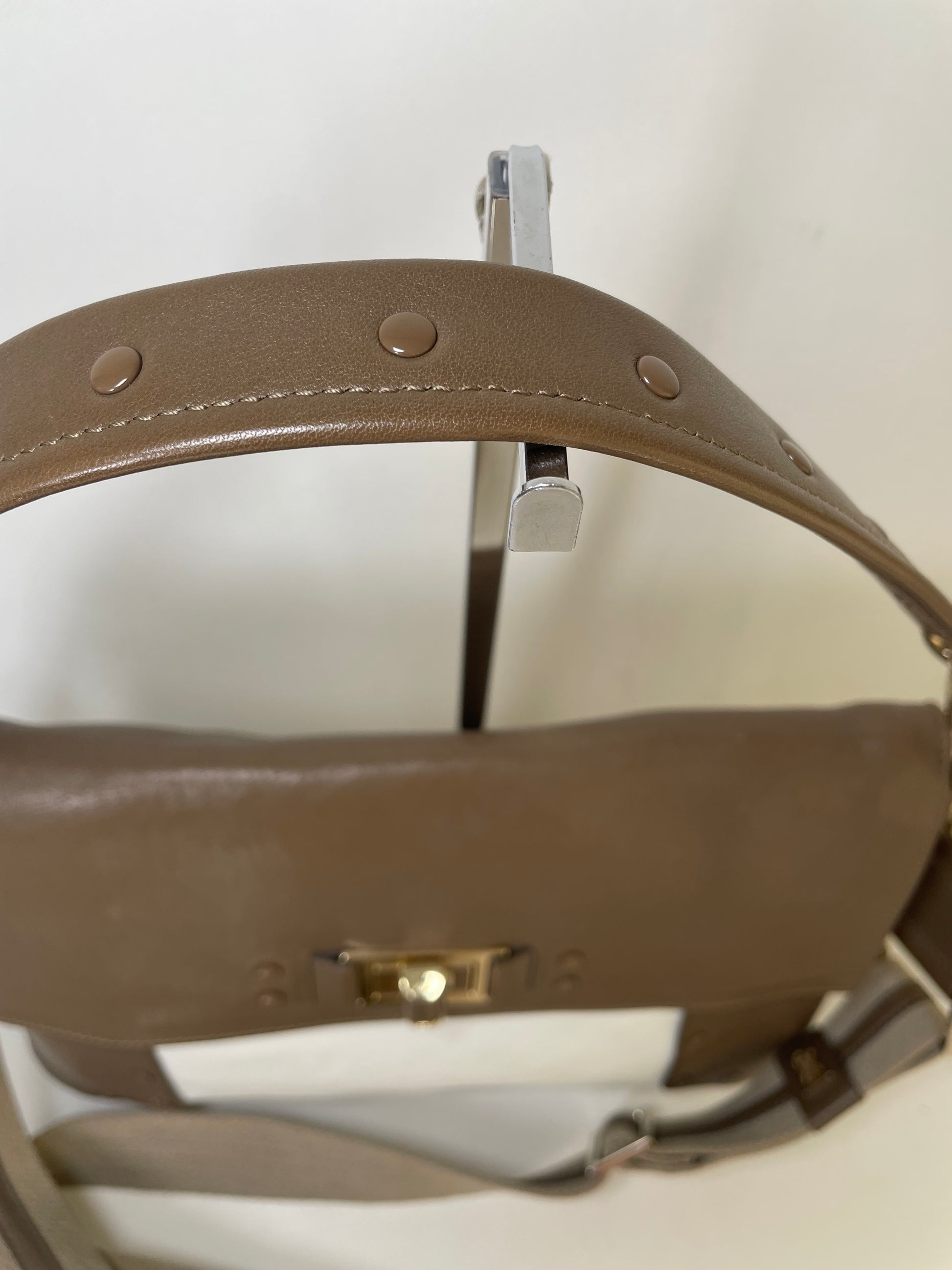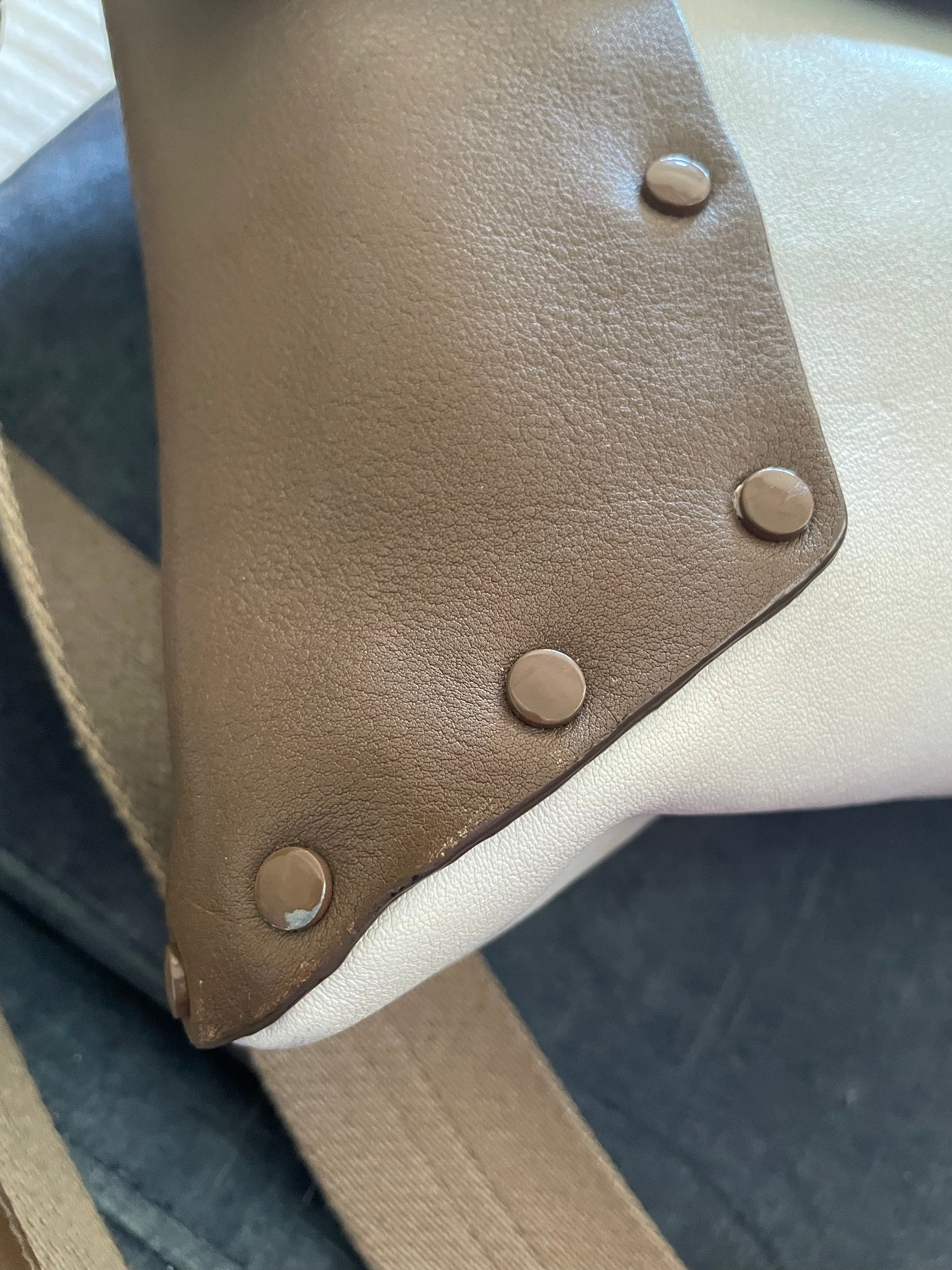 This is a striking and versatile Anya Hindmarch medium sized shoulder bag with contrasting panels of soft coffee and cream coloured leather with stud detailing.