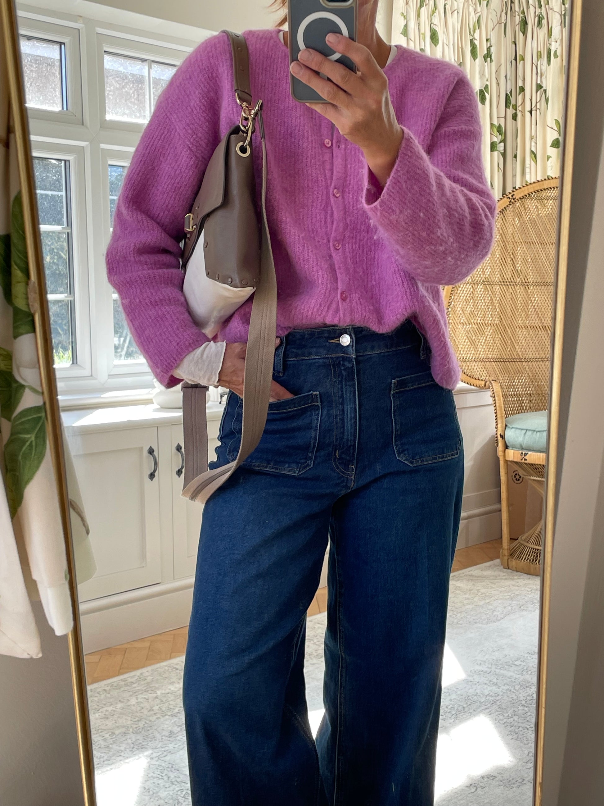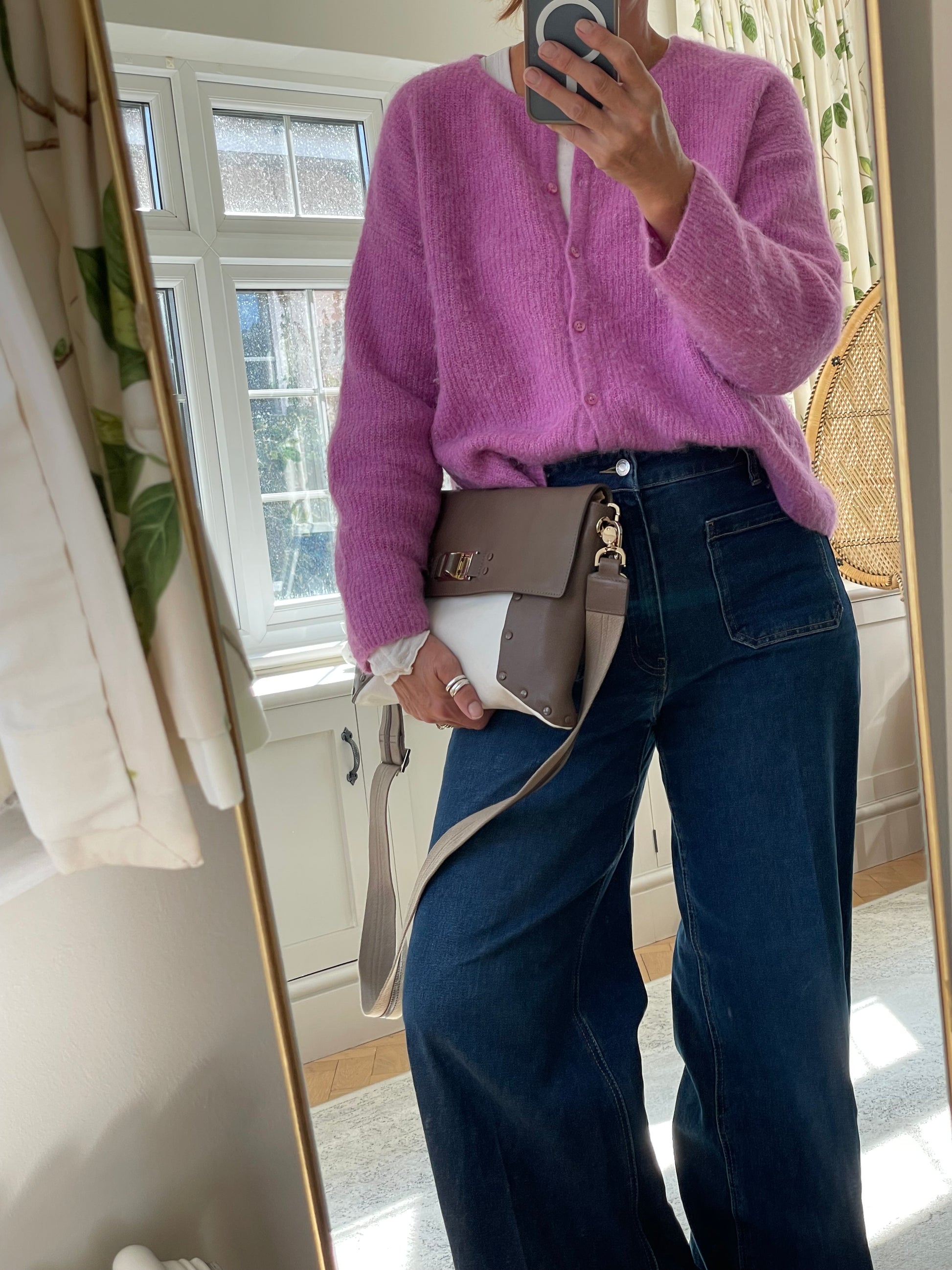 Flat rectangular shape, with front fold-over flap and turn lock fastening. Shoulder strap and crossbody straps which are removable which allows you to carry it as a clutch bag should you wish. The lining is in suede with an open slip pocket.