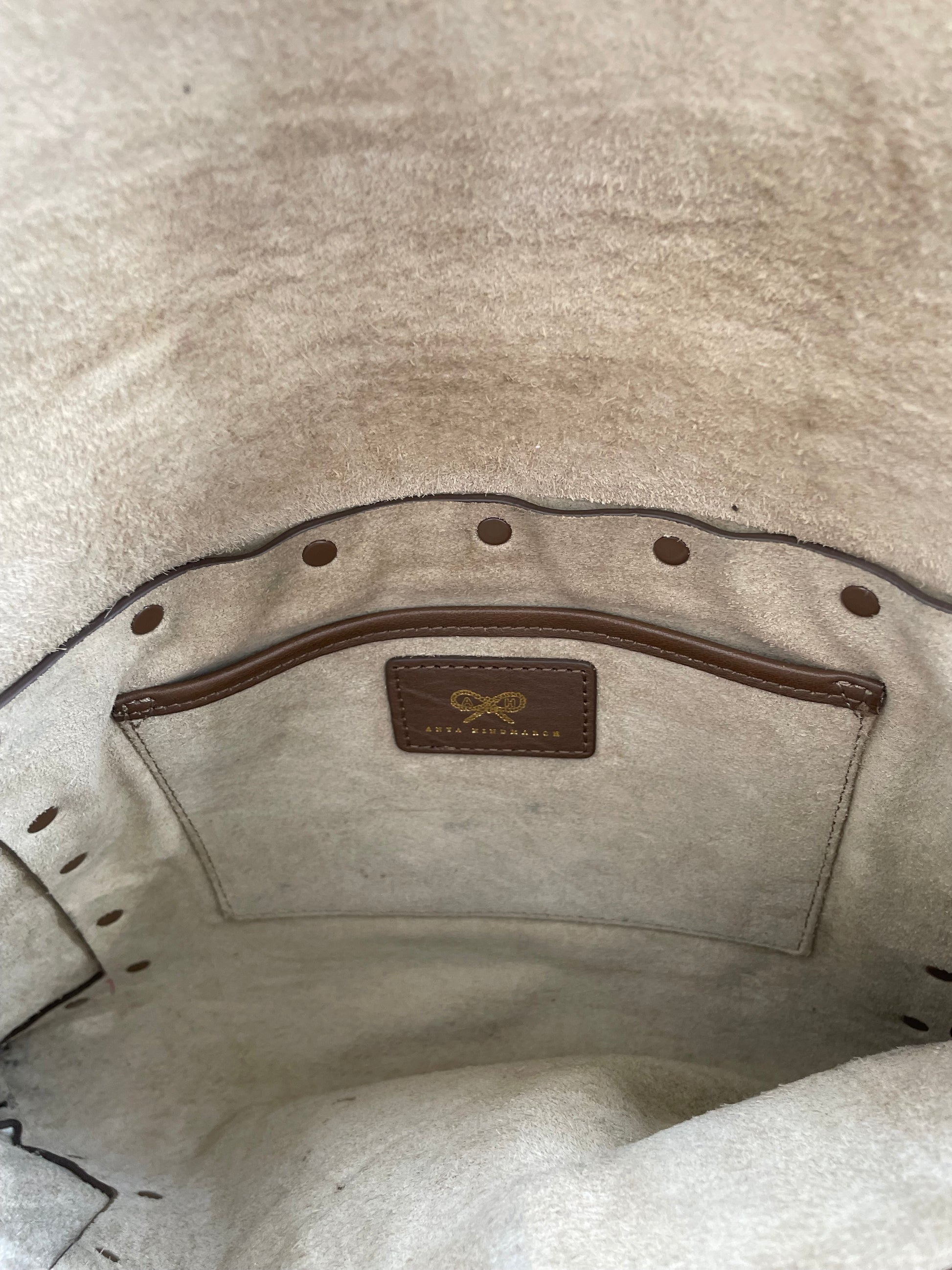 This is a versatile bag by Anya Hindmarch. This is an older style bag and some signs of use. There are some light signs of use to the hardware studs. Creasing to the leather, a couple of light scratches to the back, soft signs of use to the corners. Some darkening to the suede on the underside of the opening flap.