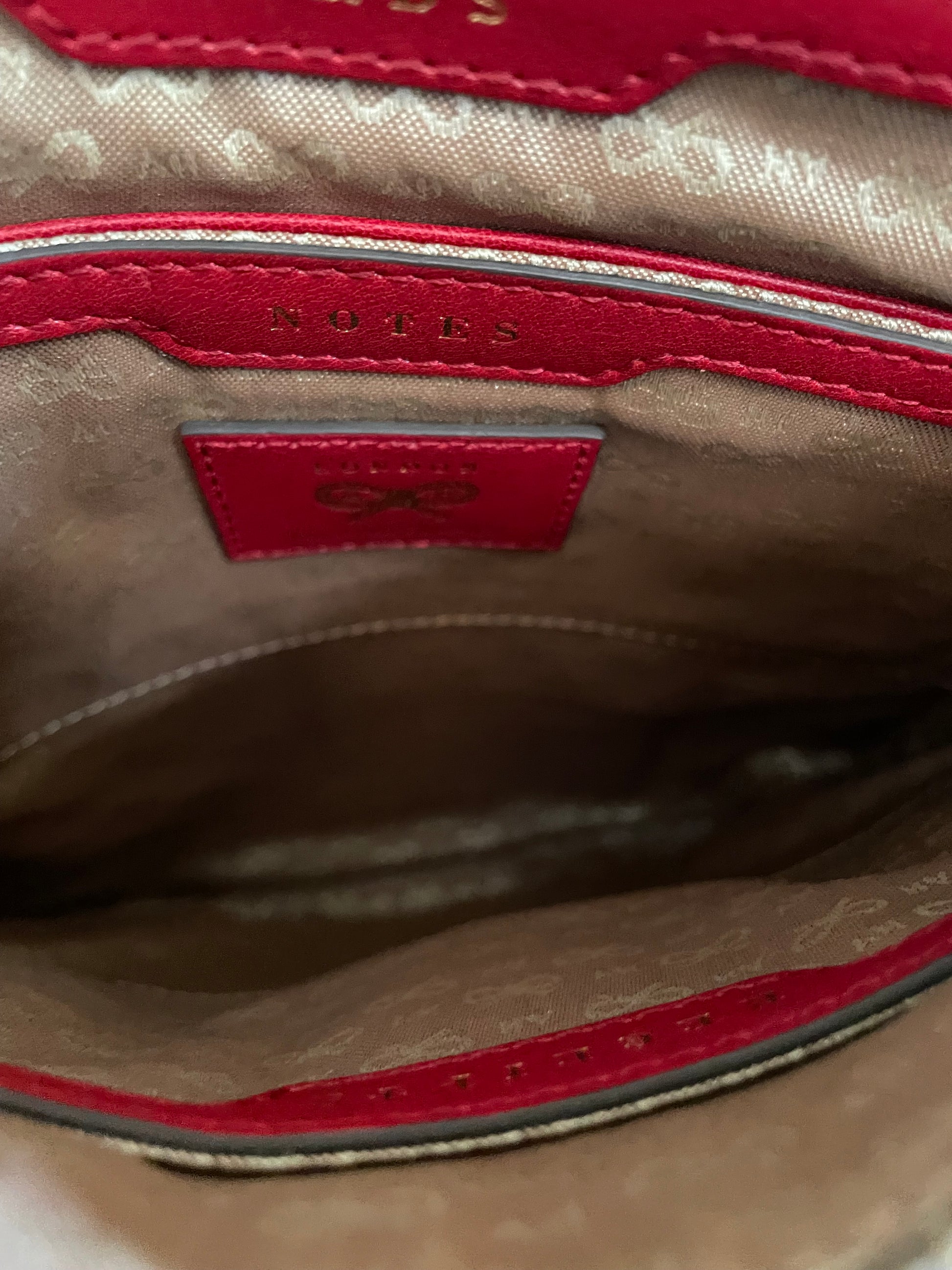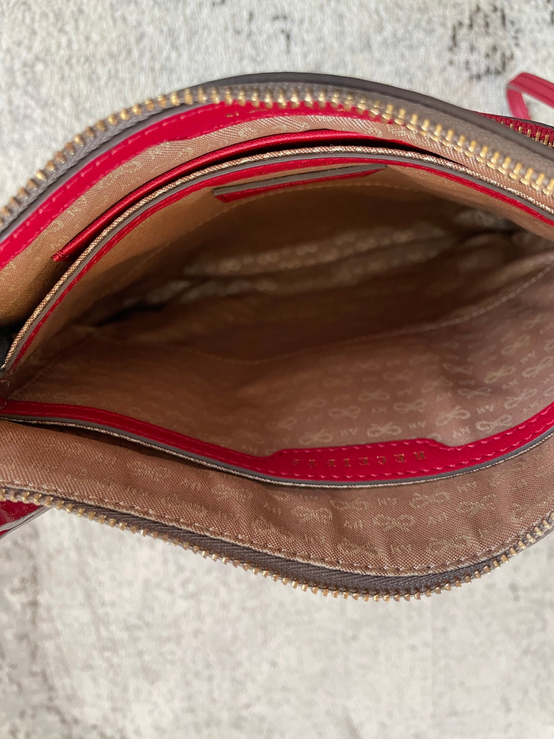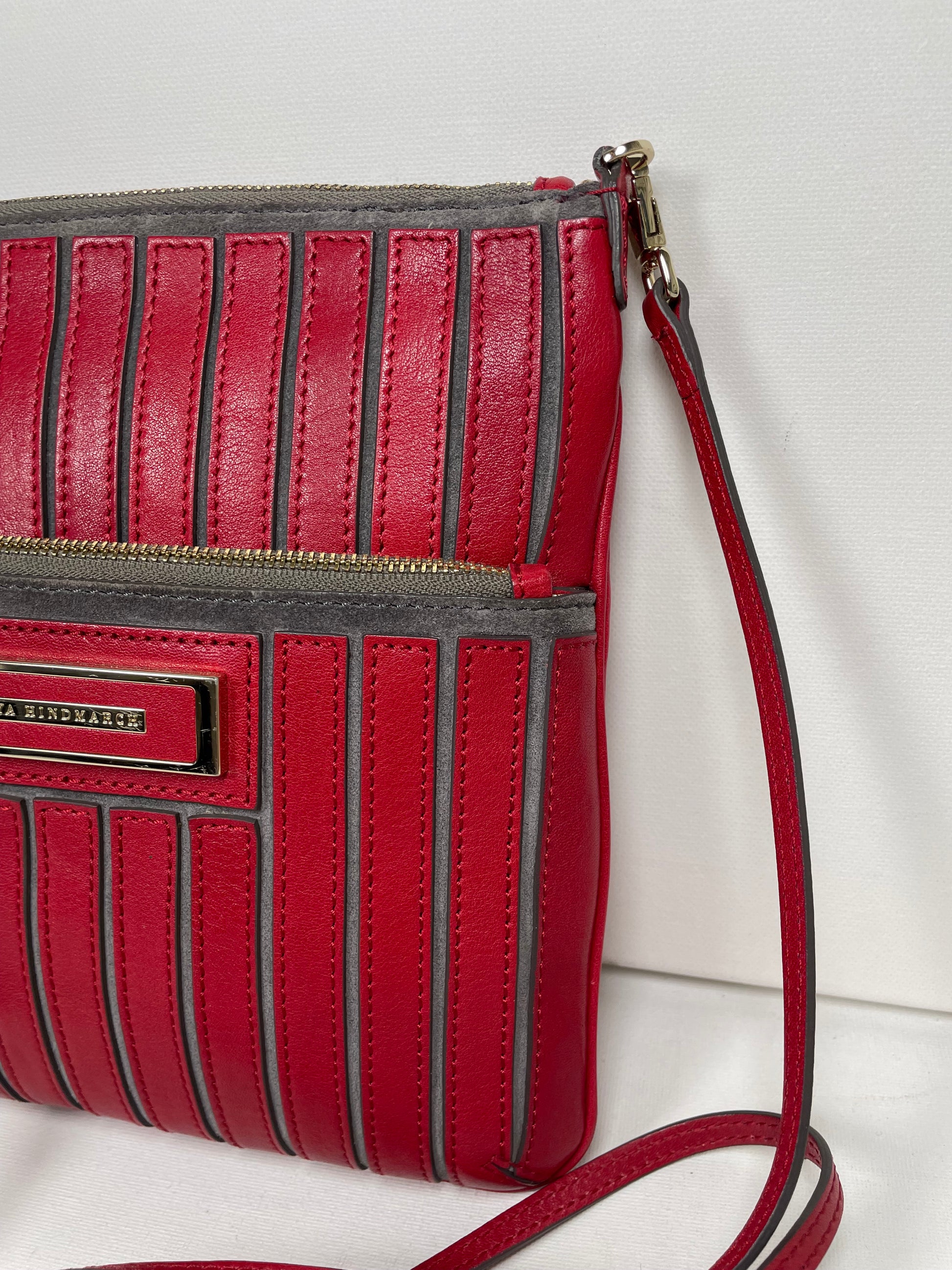 This is a super useful and convenient Anya Hindmarch crossbody bag. Perfect for carrying all your essentials, it’s a great bag for day to day. The combination of red leather strips on a grey suede background creates a soft and visually beautiful finish. There is a small zip close pocket to the front as well as a larger zip close pocket to the back. The main compartment is also secured with a zip. Inside there is are credit card slots as well as open slip pockets.