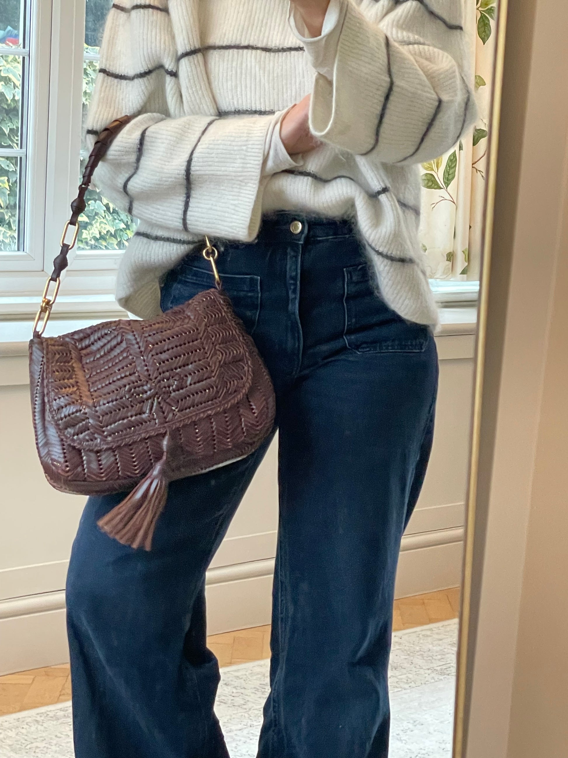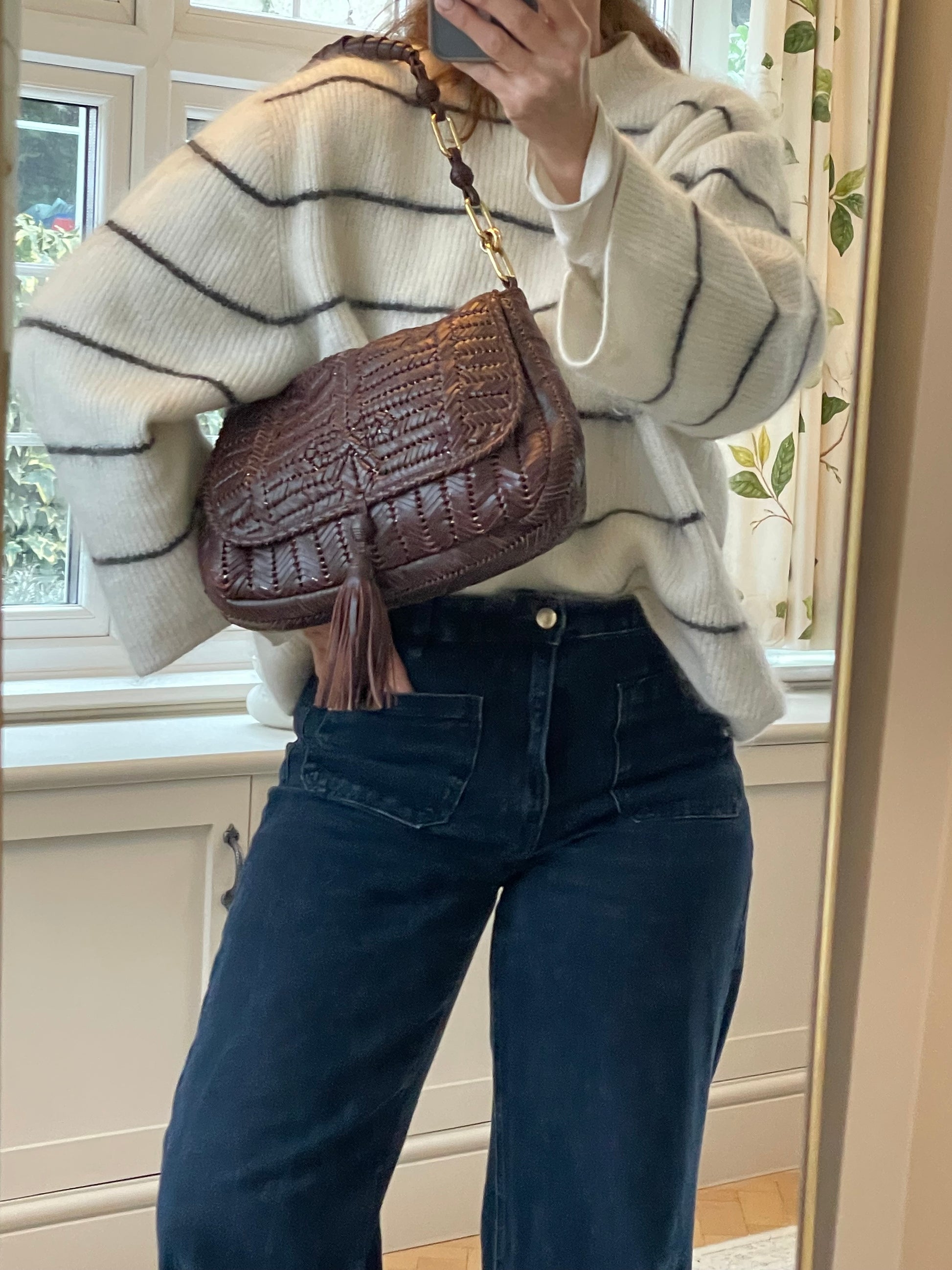This is a stunning vintage bag in great condition. The woven leather is supple and lovely. The tassel has softened. Inside is clean and in great condition.