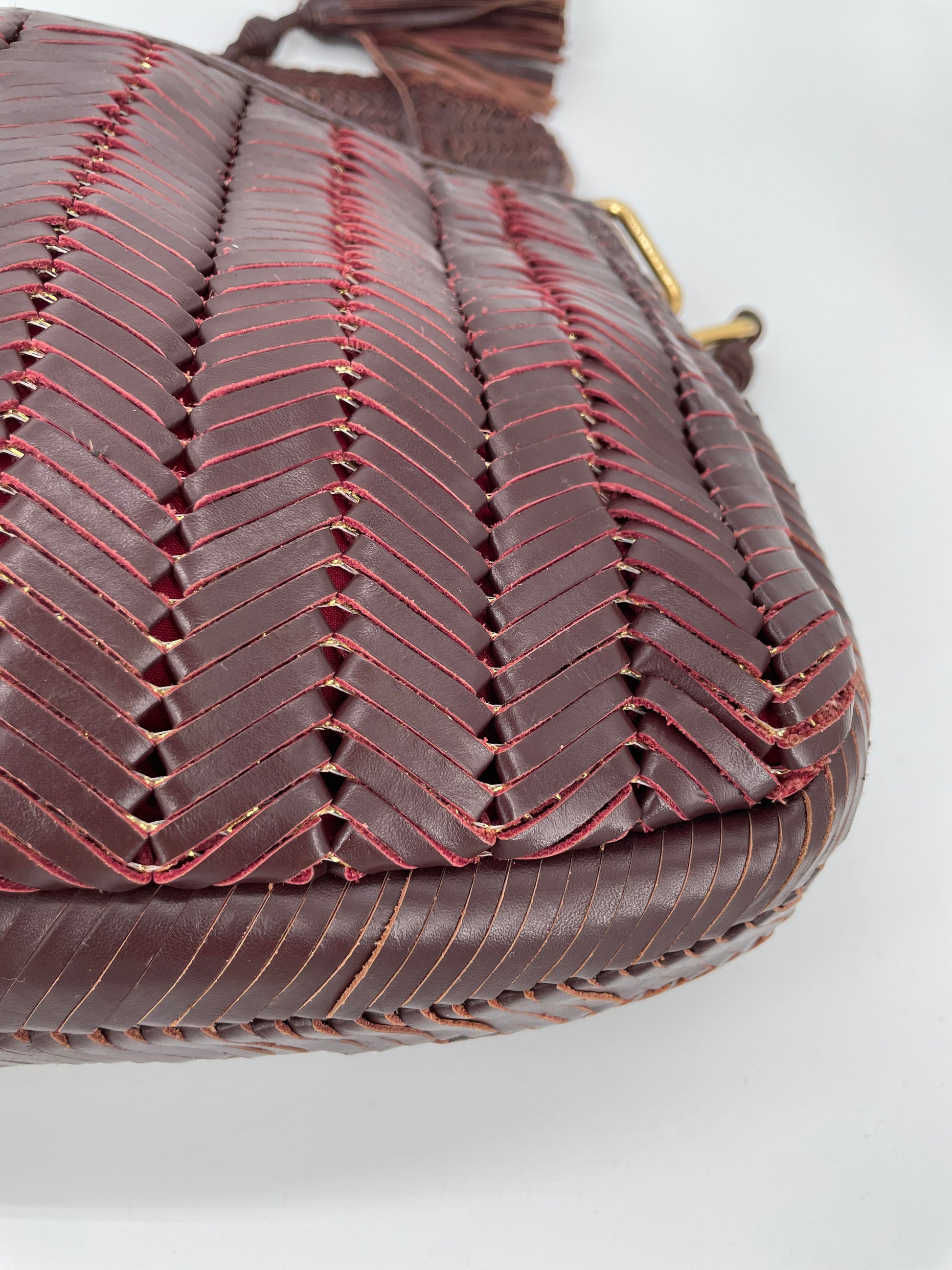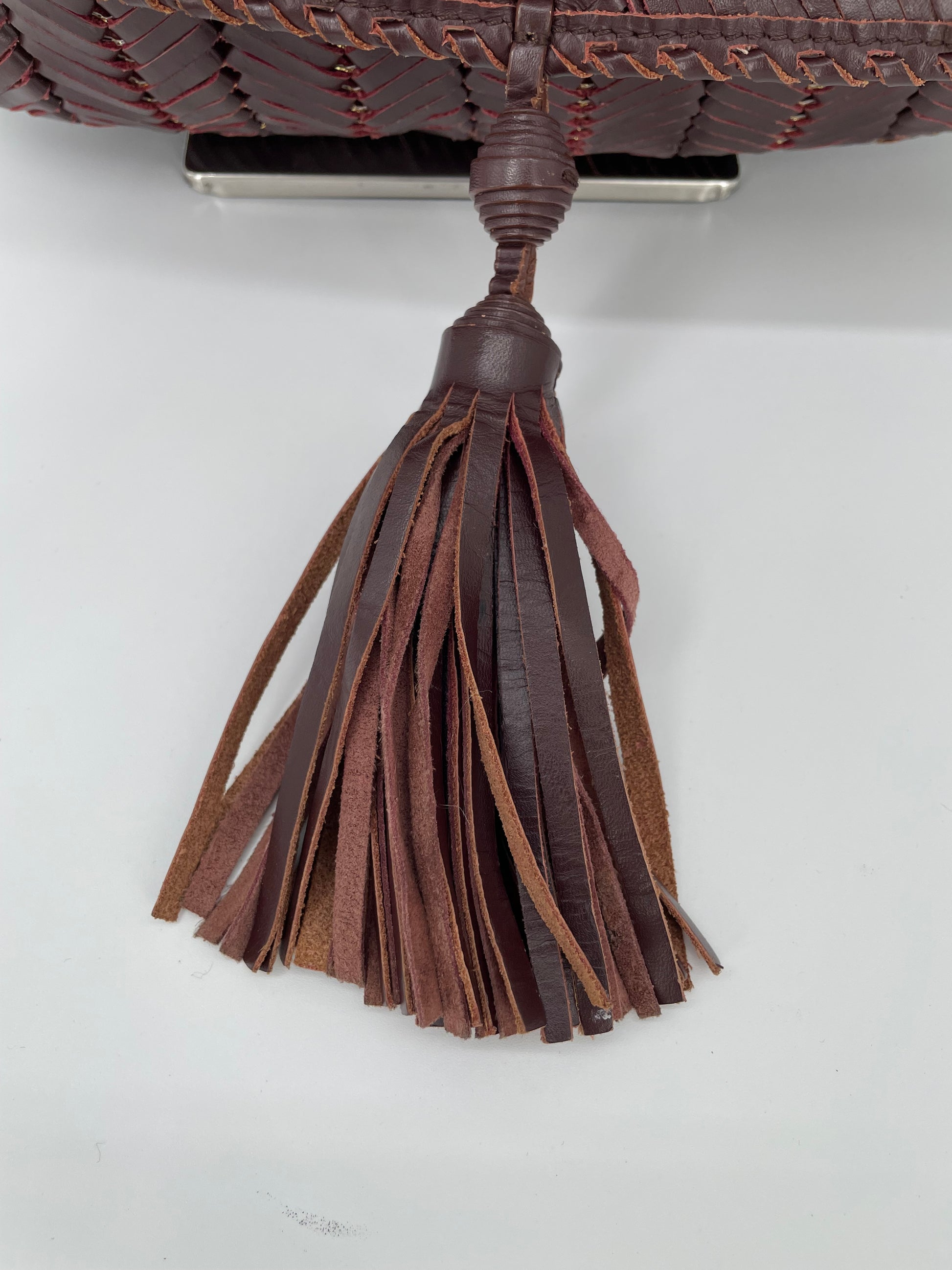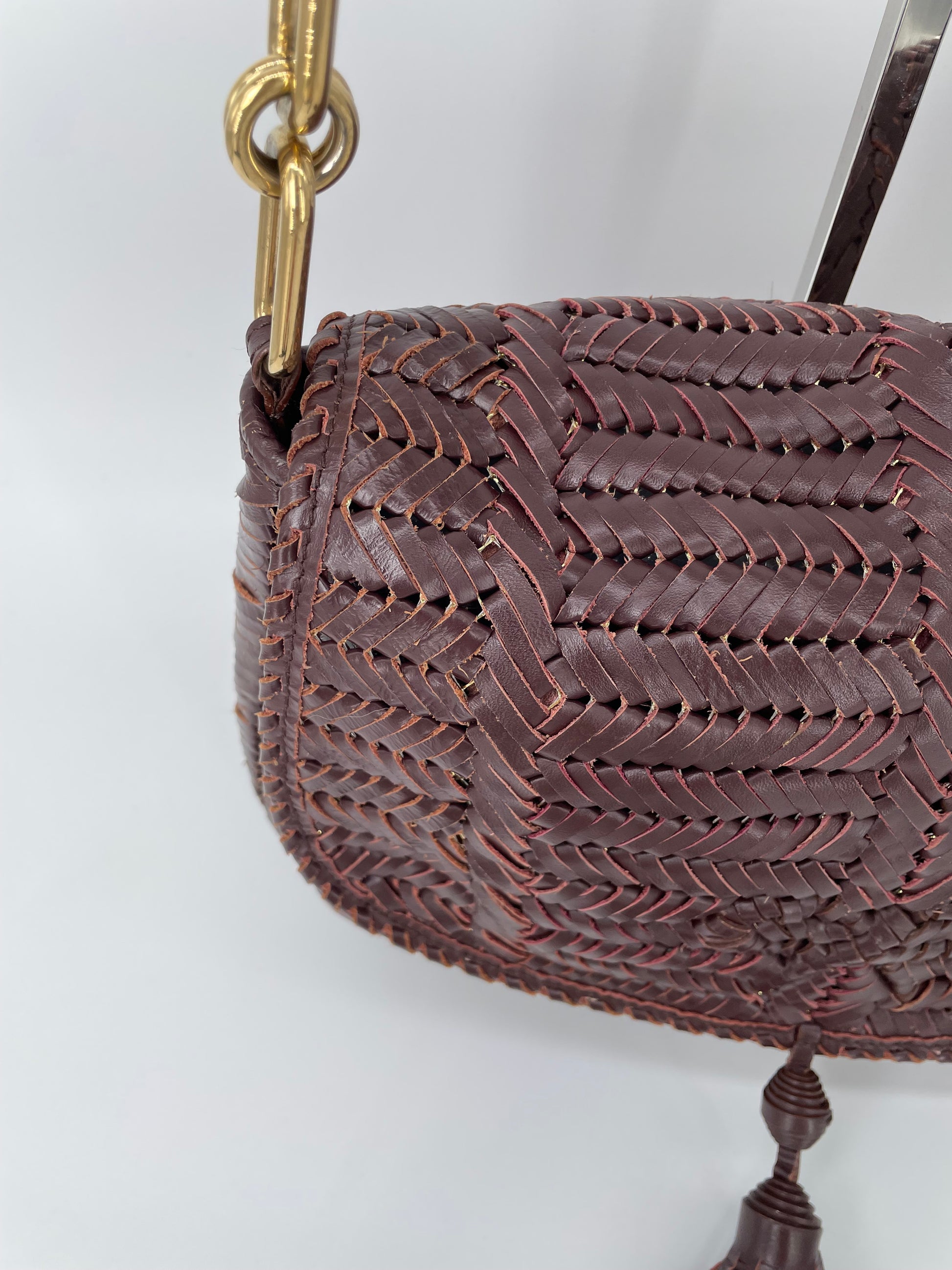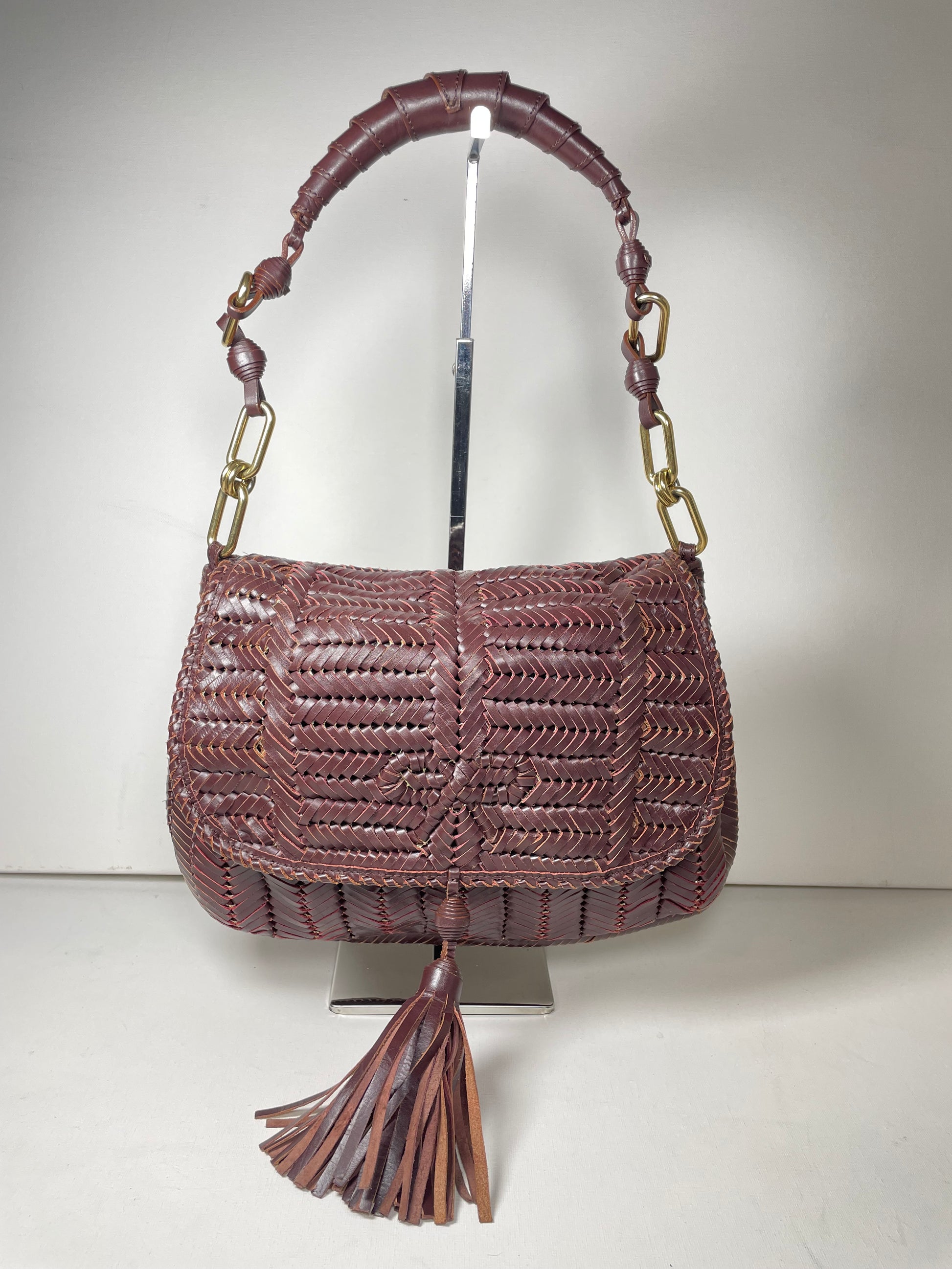 This is a beautiful, vintage, Anya Hindmarch Neeson Tassel Shoulder Bag in a dark burgundy red. The Neeson collection features bags that are meticulously hand-woven from leather strips, a process that can take several hours per bag. The intricate, hand-woven design incorporates the brand's signature bow motif and is crafted from capra (goatskin) leather. The tassel detailing and wrapped shoulder strap finishes the bag perfectly.