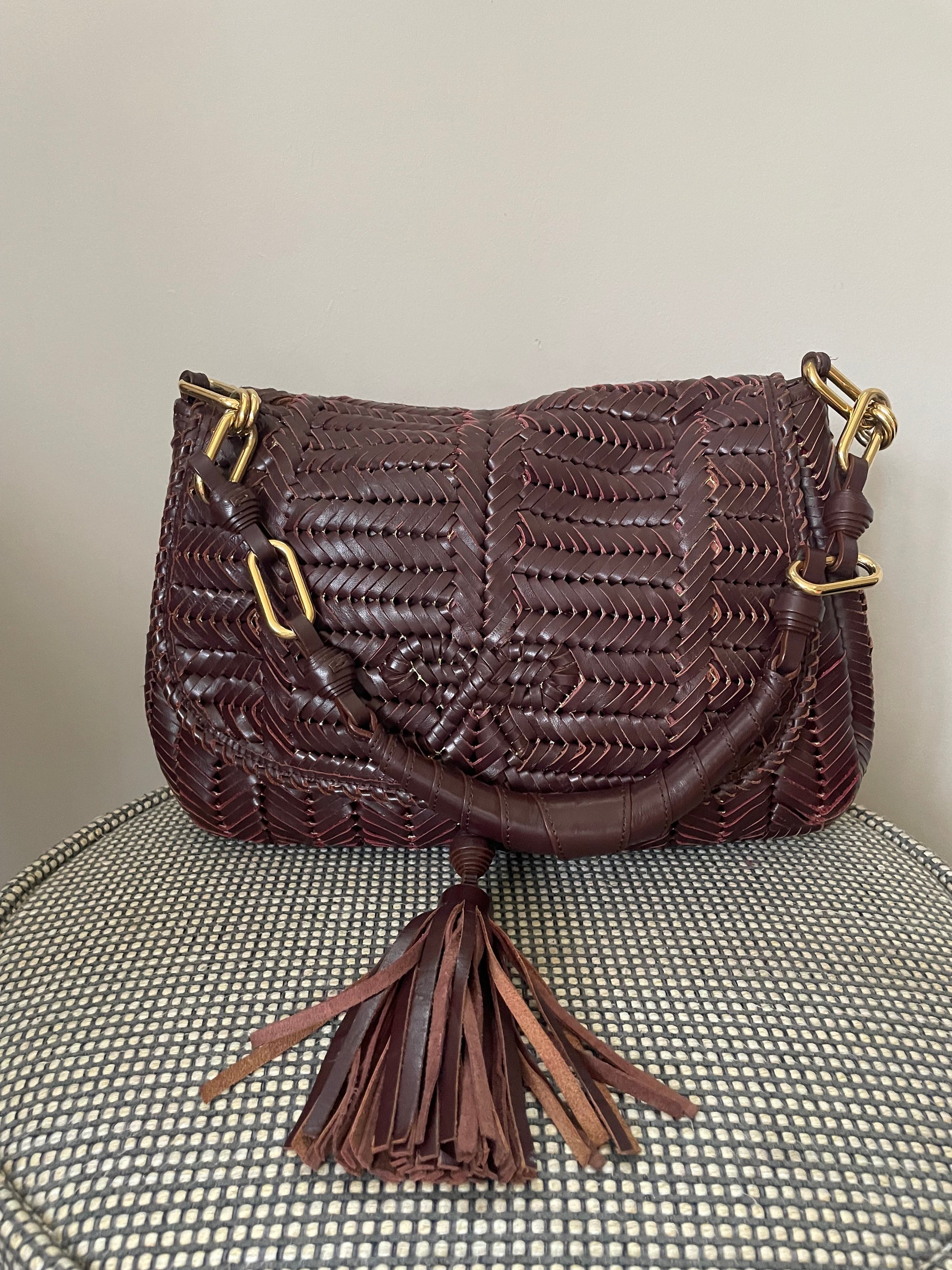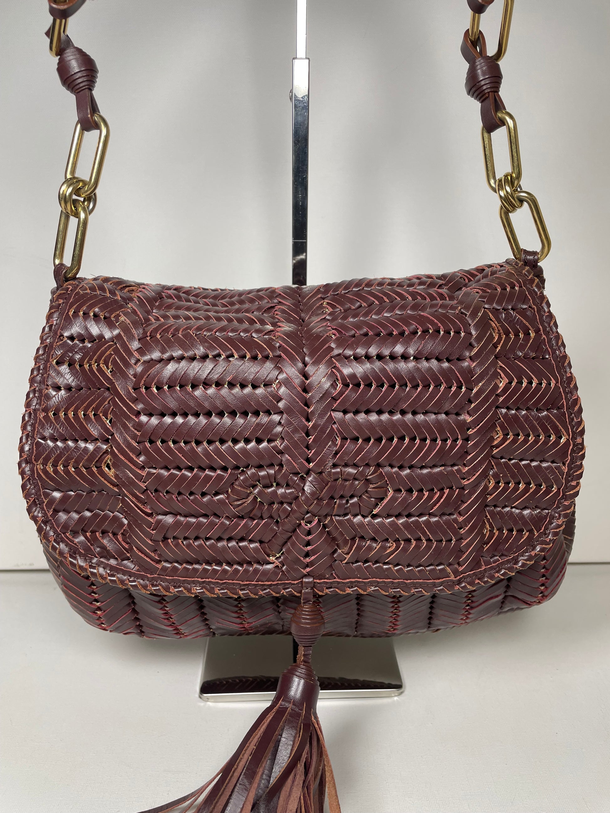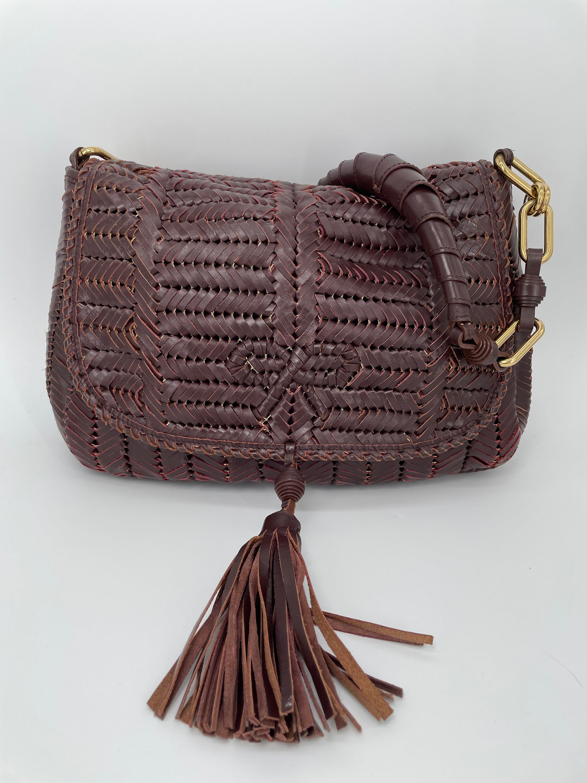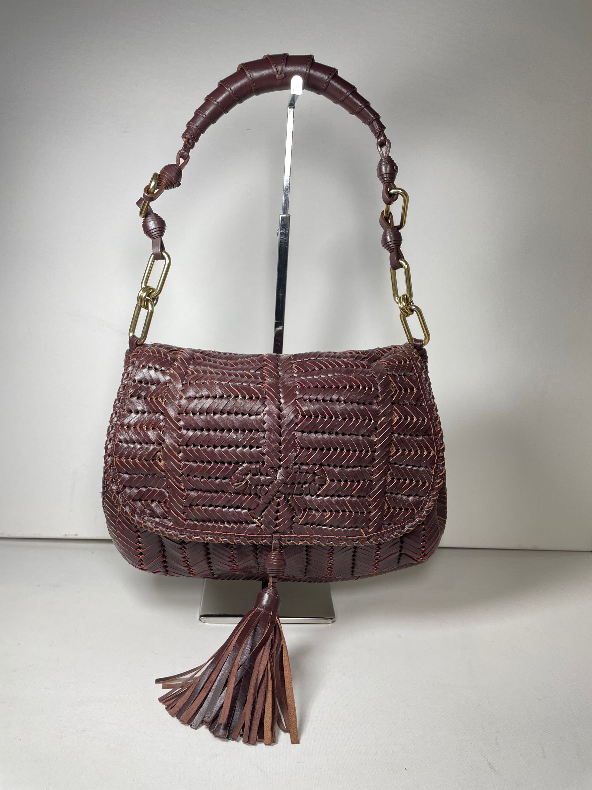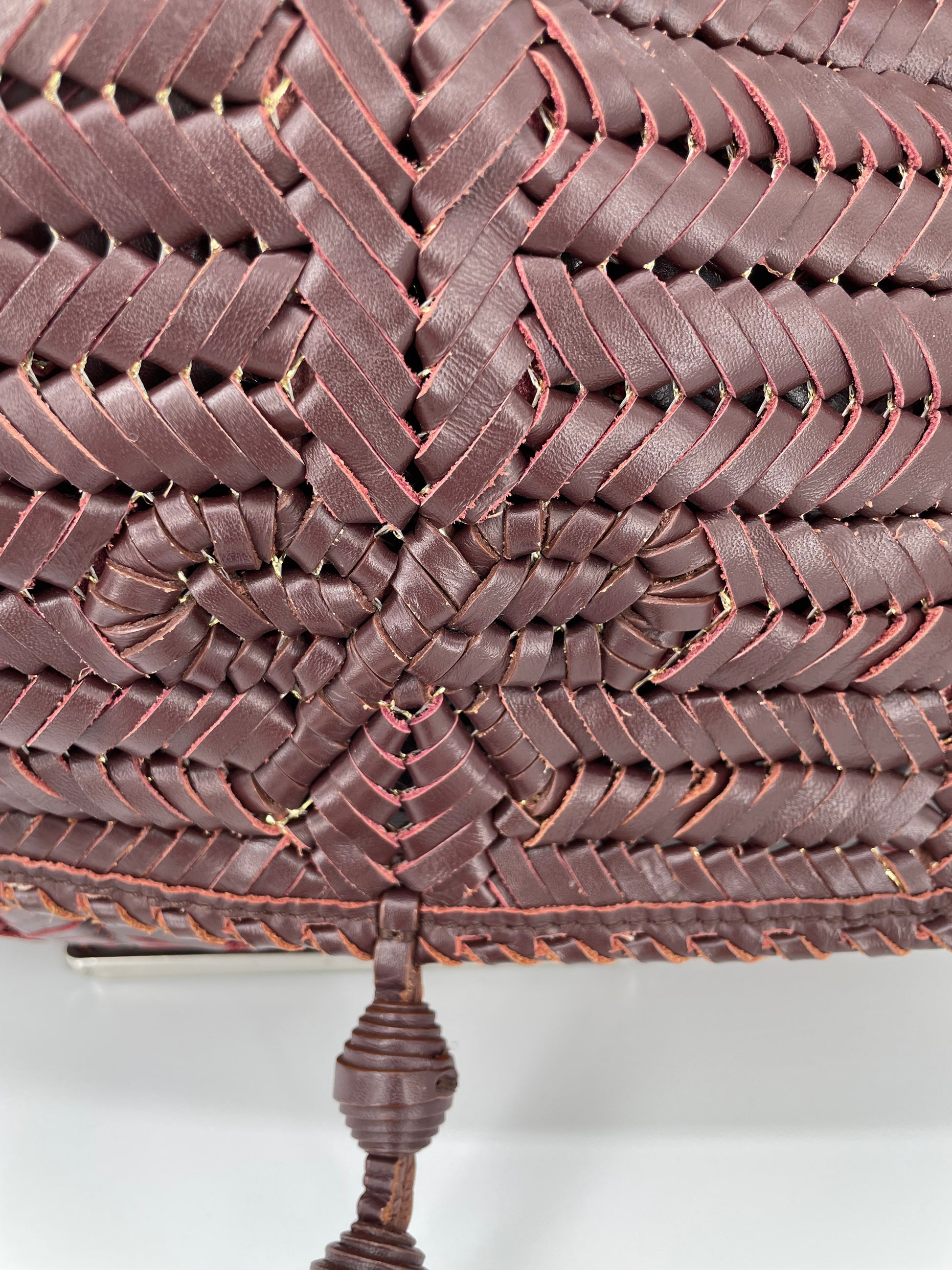 This is a beautiful, vintage, Anya Hindmarch Neeson Tassel Shoulder Bag in a dark burgundy red. The Neeson collection features bags that are meticulously hand-woven from leather strips, a process that can take several hours per bag. The intricate, hand-woven design incorporates the brand's signature bow motif and is crafted from capra (goatskin) leather. The tassel detailing and wrapped shoulder strap finishes the bag perfectly.