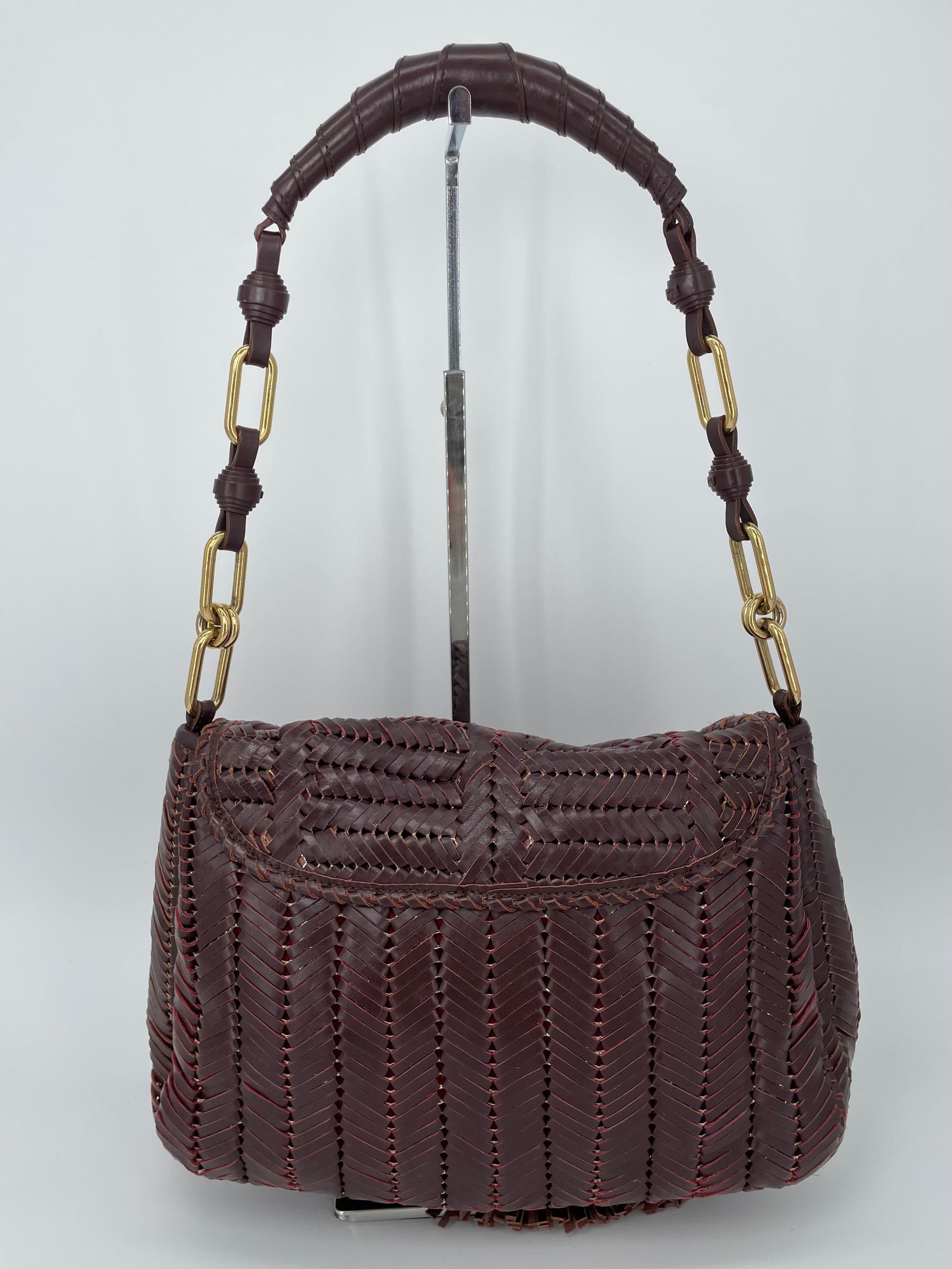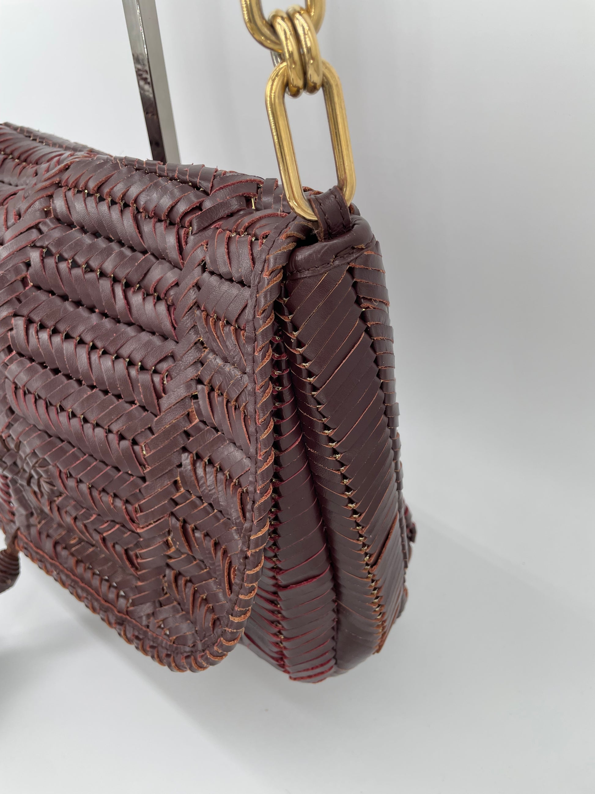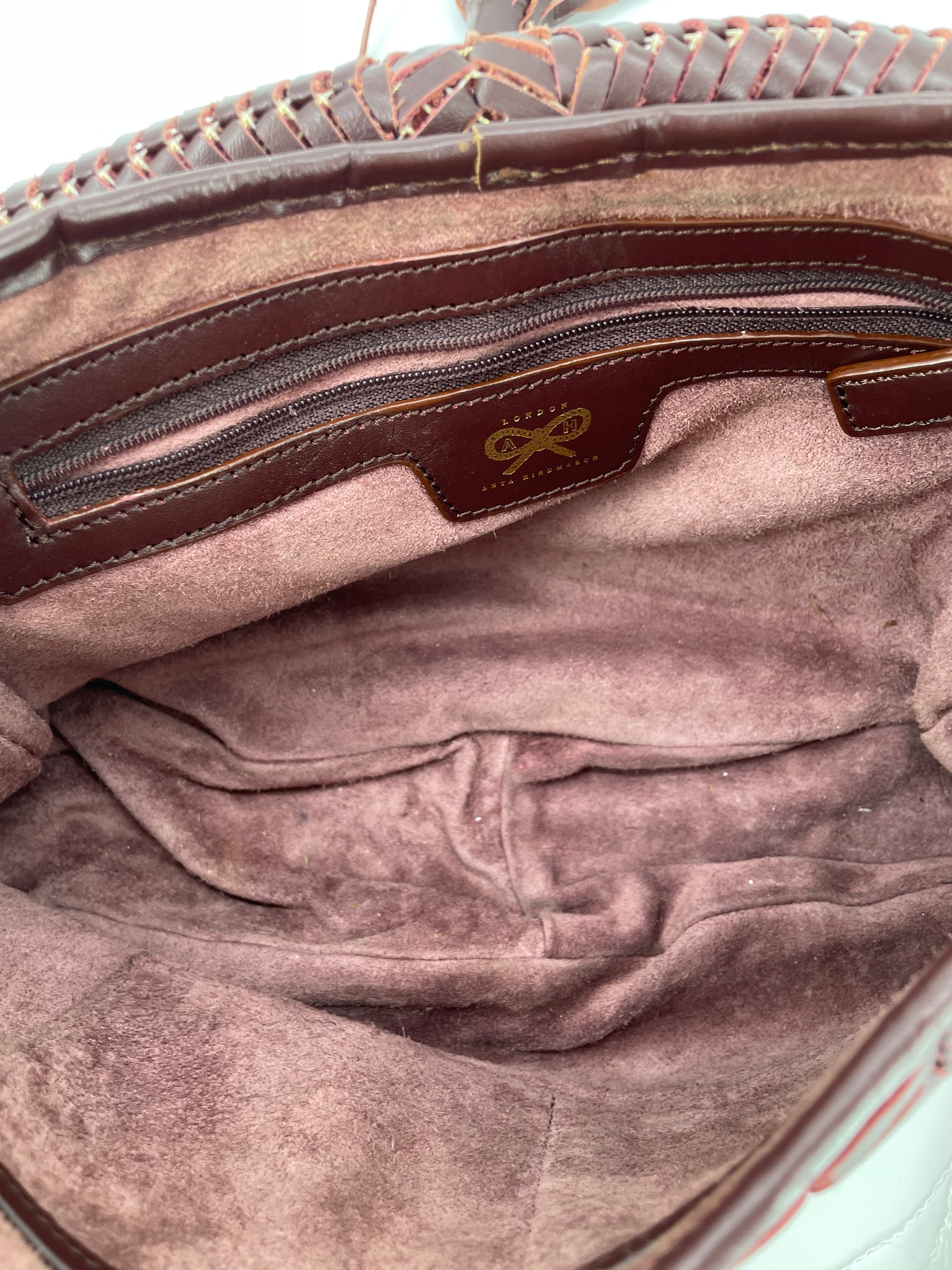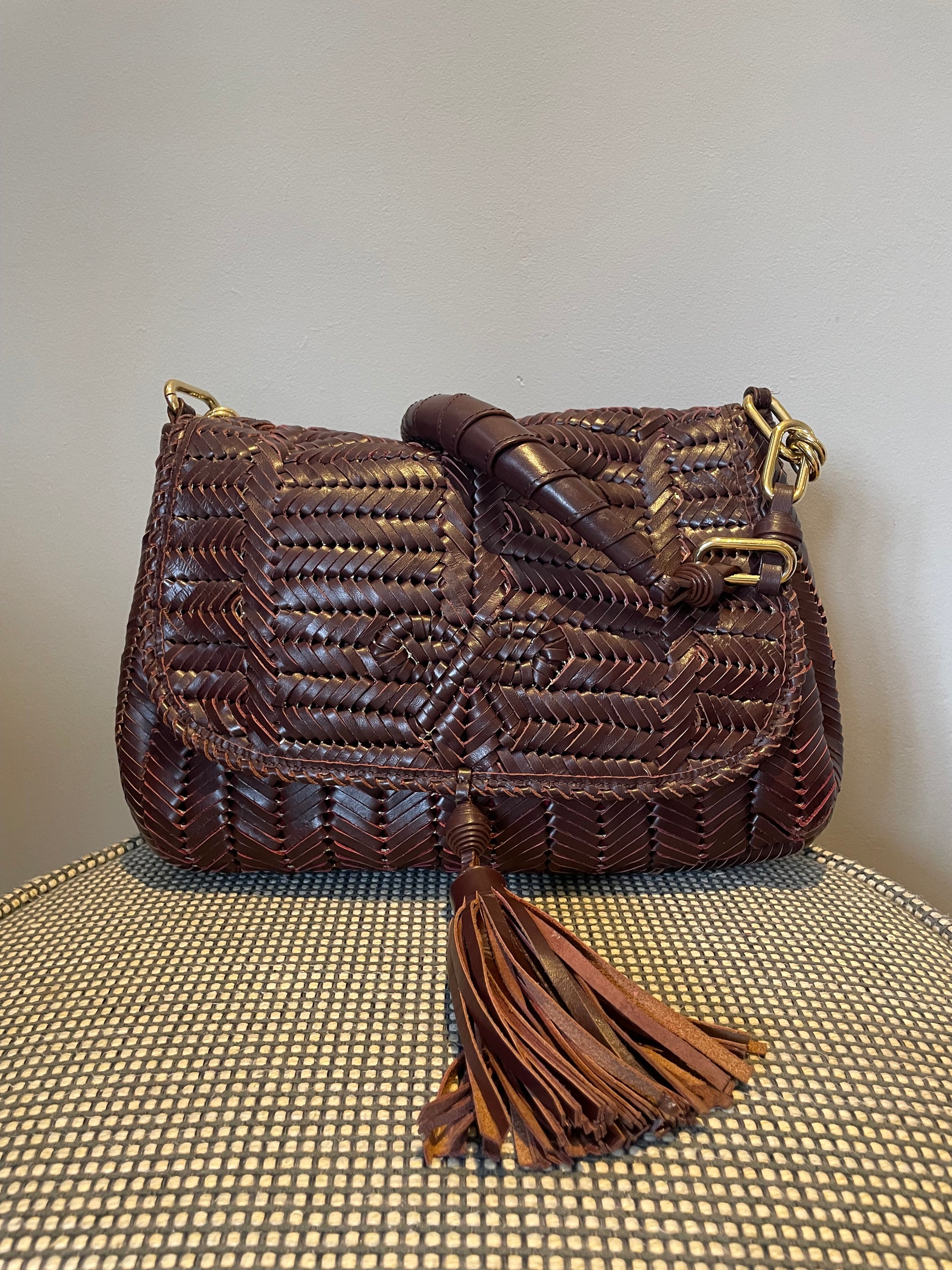 This is a beautiful, vintage, Anya Hindmarch Neeson Tassel Shoulder Bag in a dark burgundy red. The Neeson collection features bags that are meticulously hand-woven from leather strips, a process that can take several hours per bag. The intricate, hand-woven design incorporates the brand's signature bow motif and is crafted from capra (goatskin) leather. The tassel detailing and wrapped shoulder strap finishes the bag perfectly.