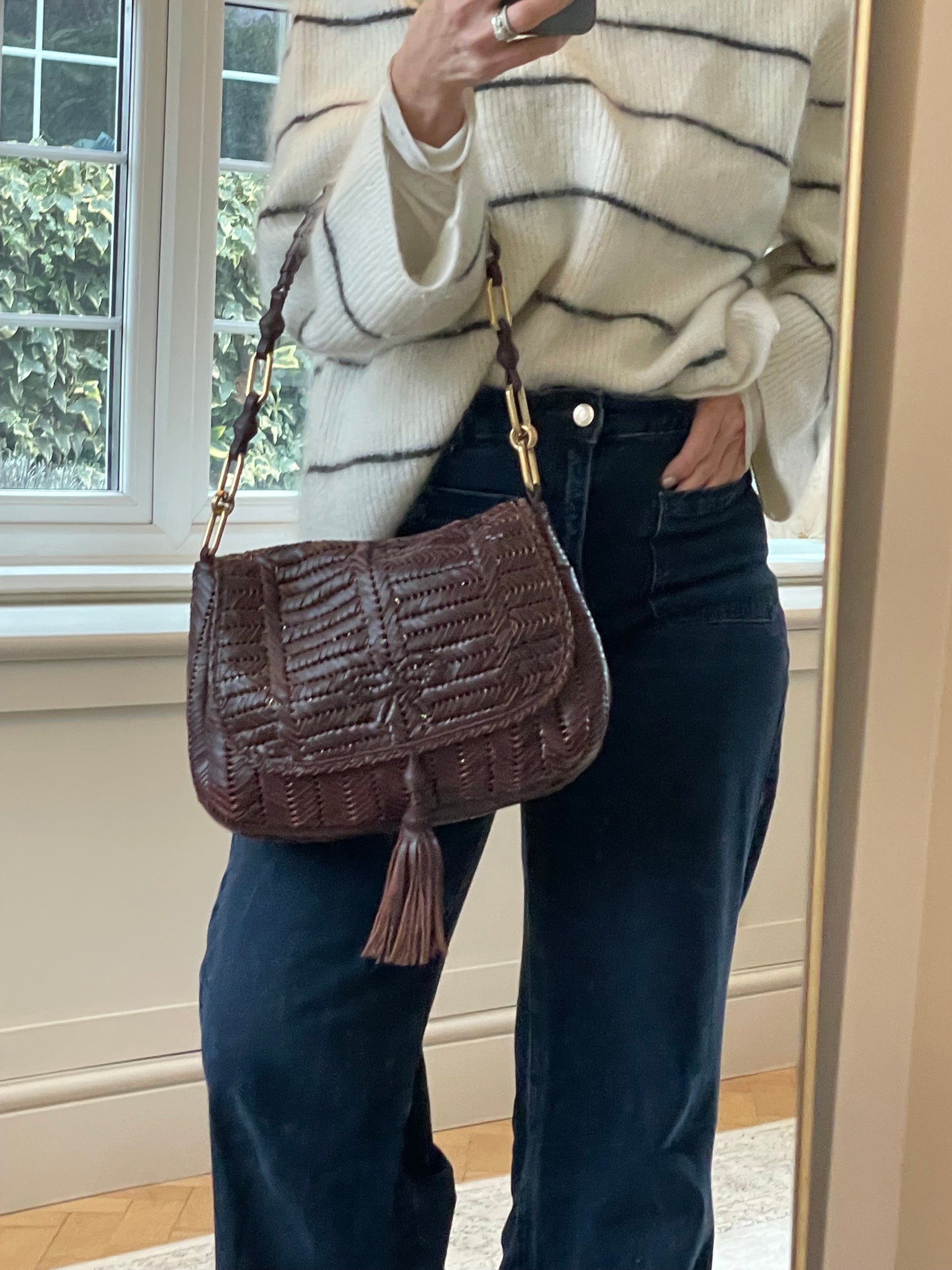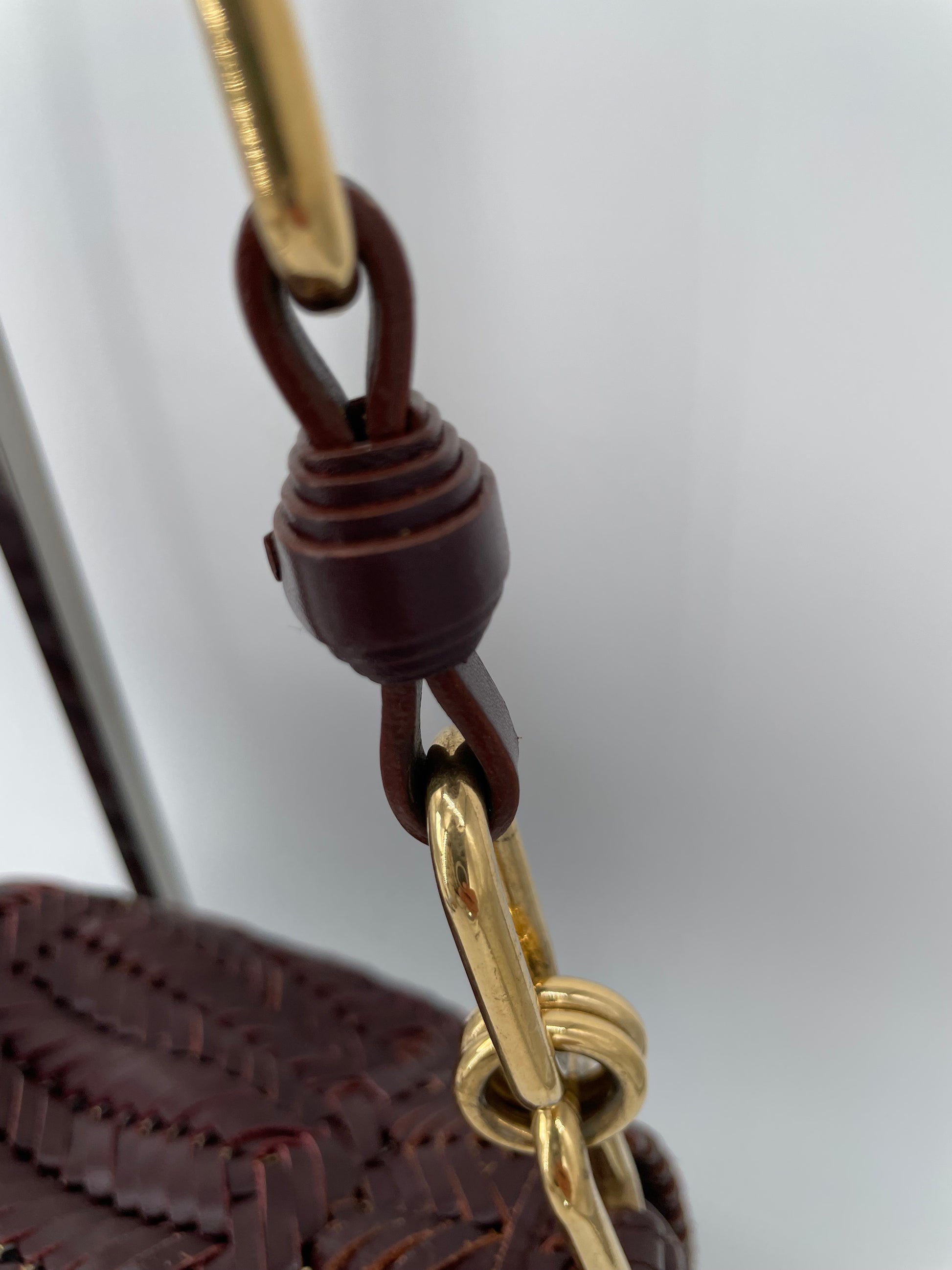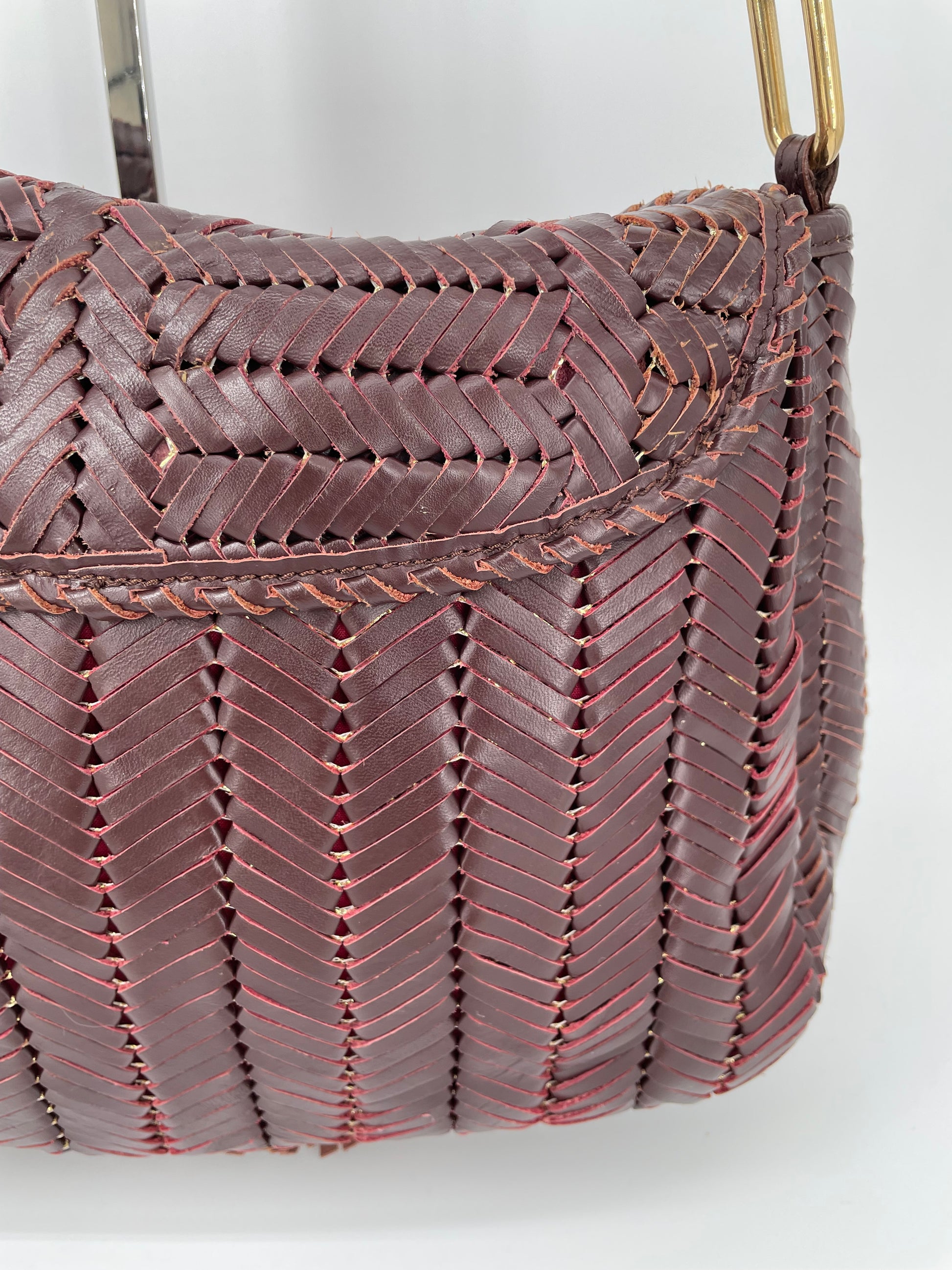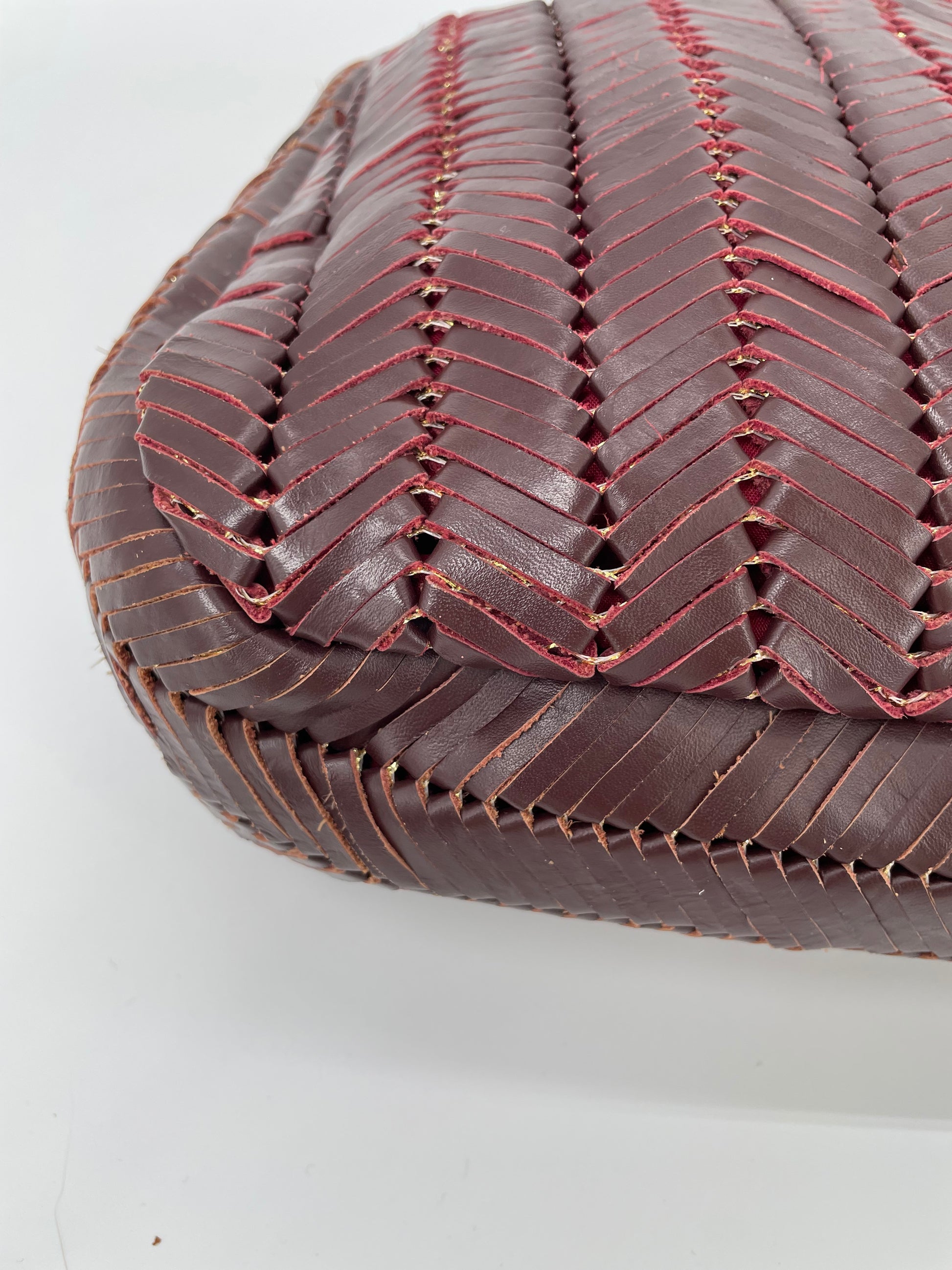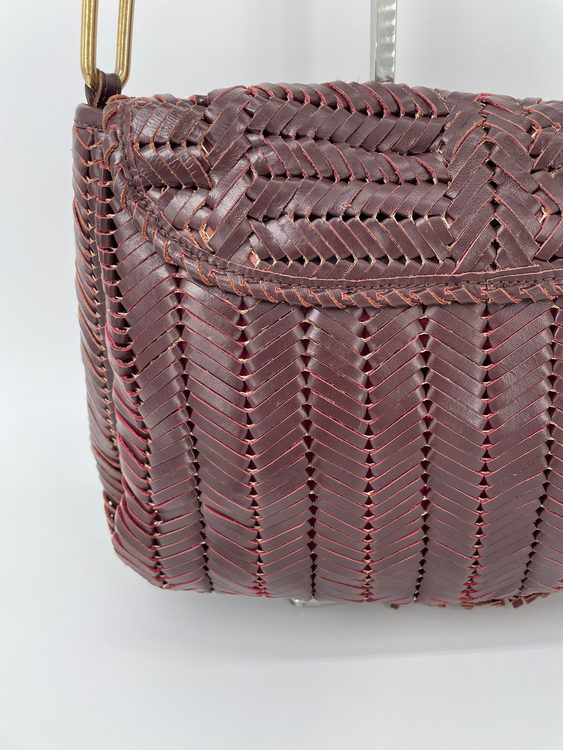 This is a beautiful, vintage, Anya Hindmarch Neeson Tassel Shoulder Bag in a dark burgundy red. The Neeson collection features bags that are meticulously hand-woven from leather strips, a process that can take several hours per bag. The intricate, hand-woven design incorporates the brand's signature bow motif and is crafted from capra (goatskin) leather. The tassel detailing and wrapped shoulder strap finishes the bag perfectly.