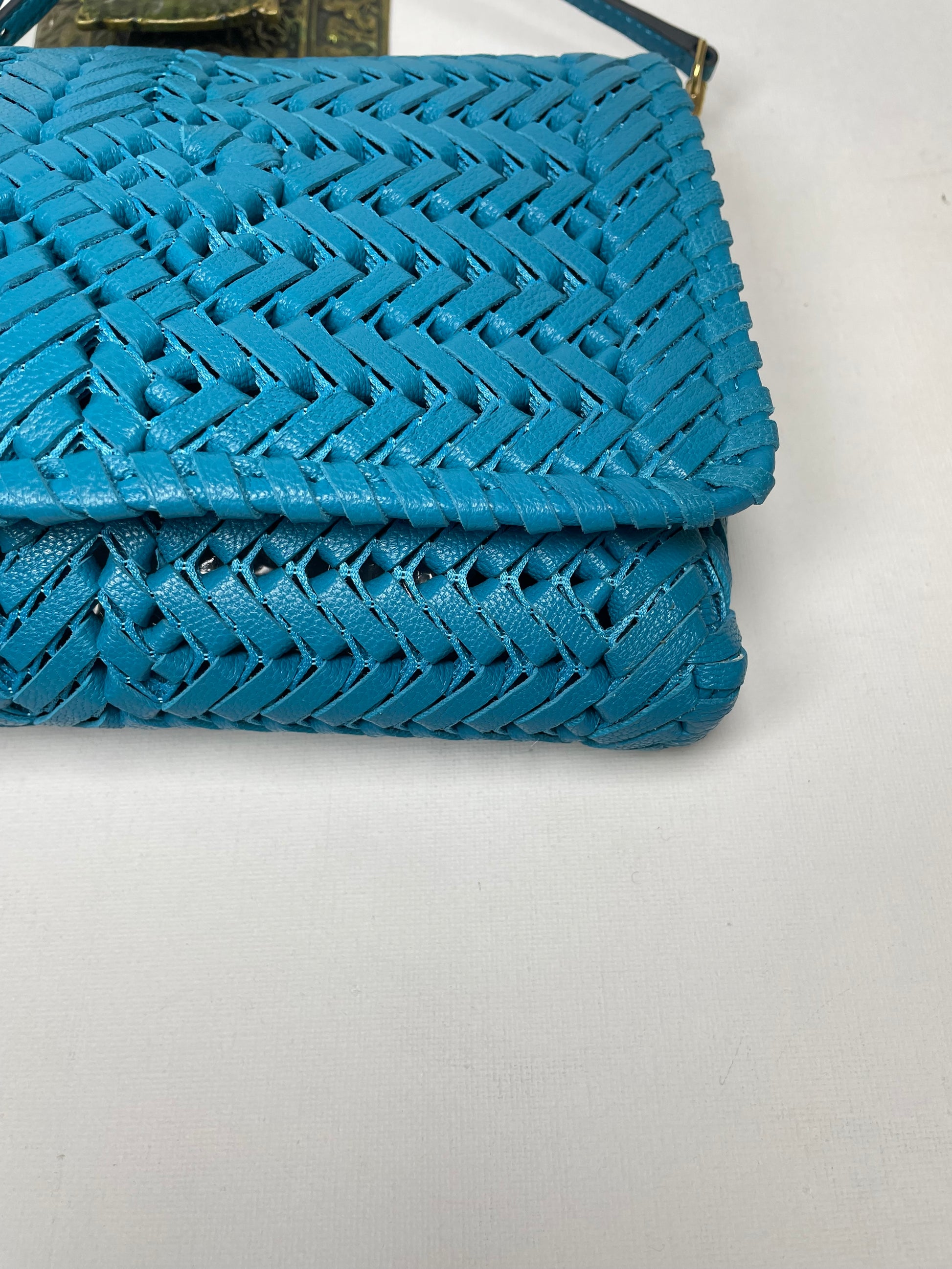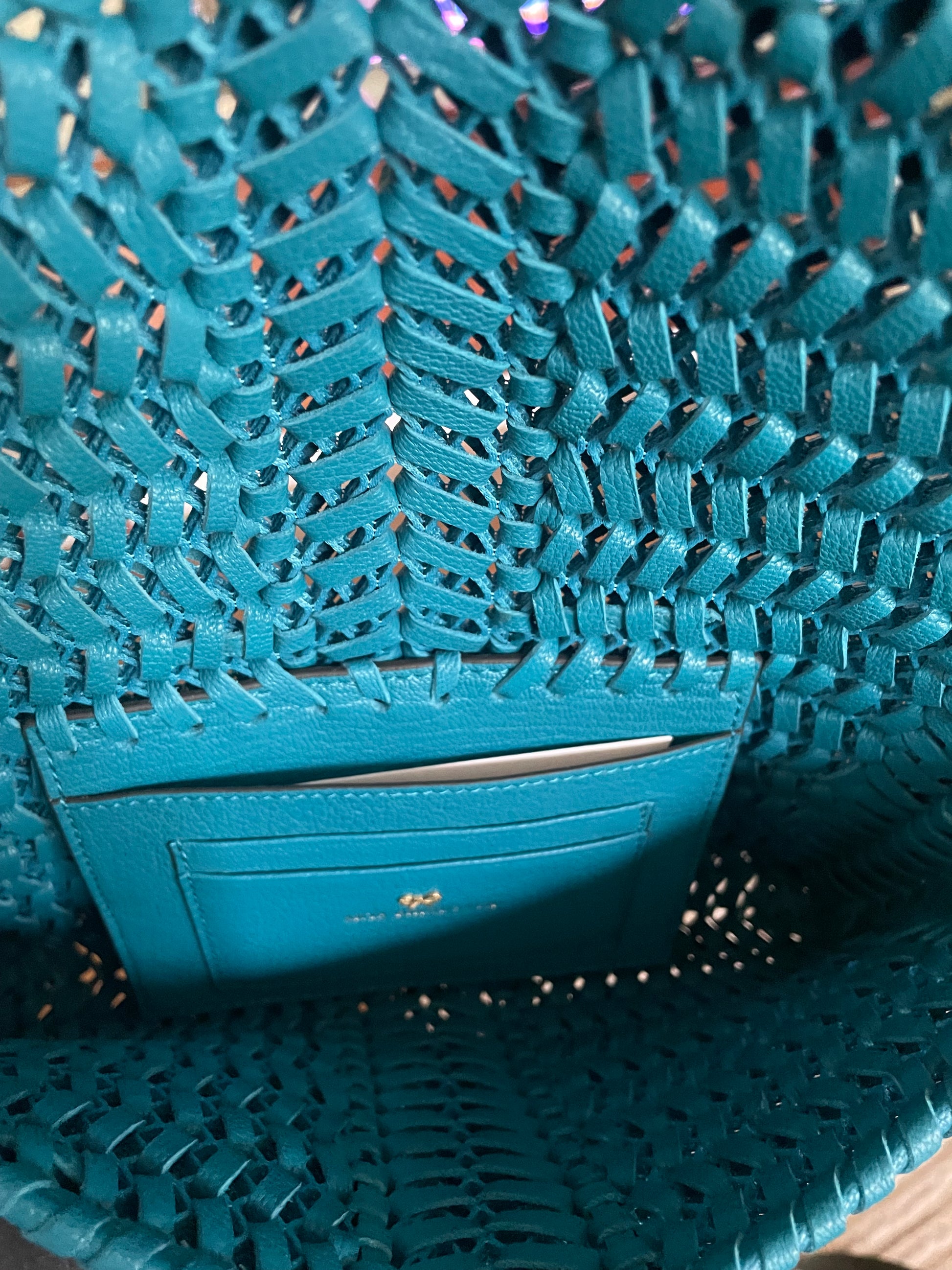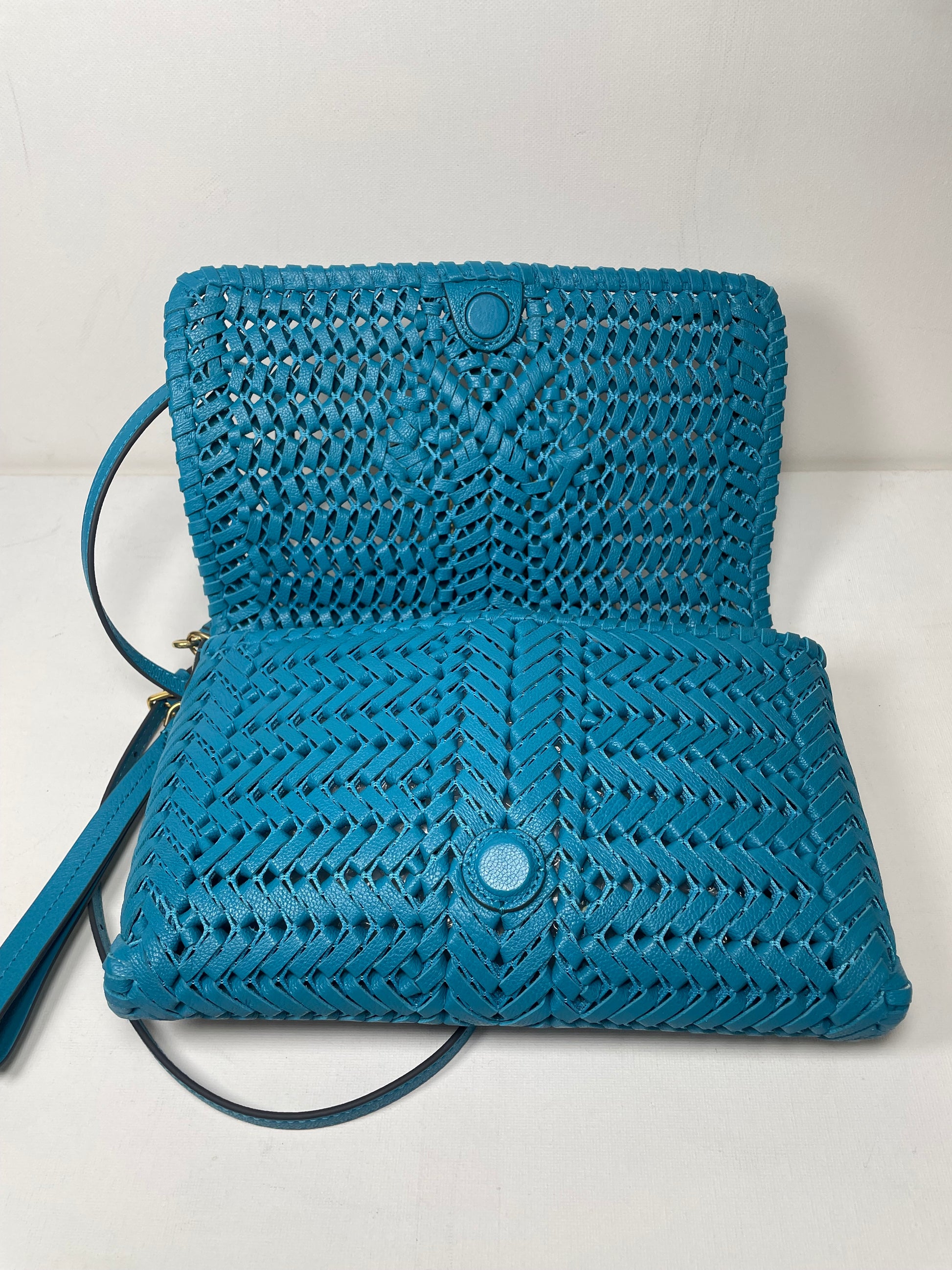 This is a beautiful Anya Hindmarch Neeson crossbody in a vibrant blue woven leather (the colour is Peacock) This woven leather crossbody bag is an updated version of one of Anya Hindmarch's most recognisable styles. Crafted from lightweight leather with the brand's signature woven bow logo at the front, this unlined mesh cross-body bag features a large magnetic front flap and a single internal slip pocket with two card slots. This bag has the added versatility of an adjustable long strap so it can be worn crossbody or on the shoulder and a wrist strap so it can be used as a clutch.