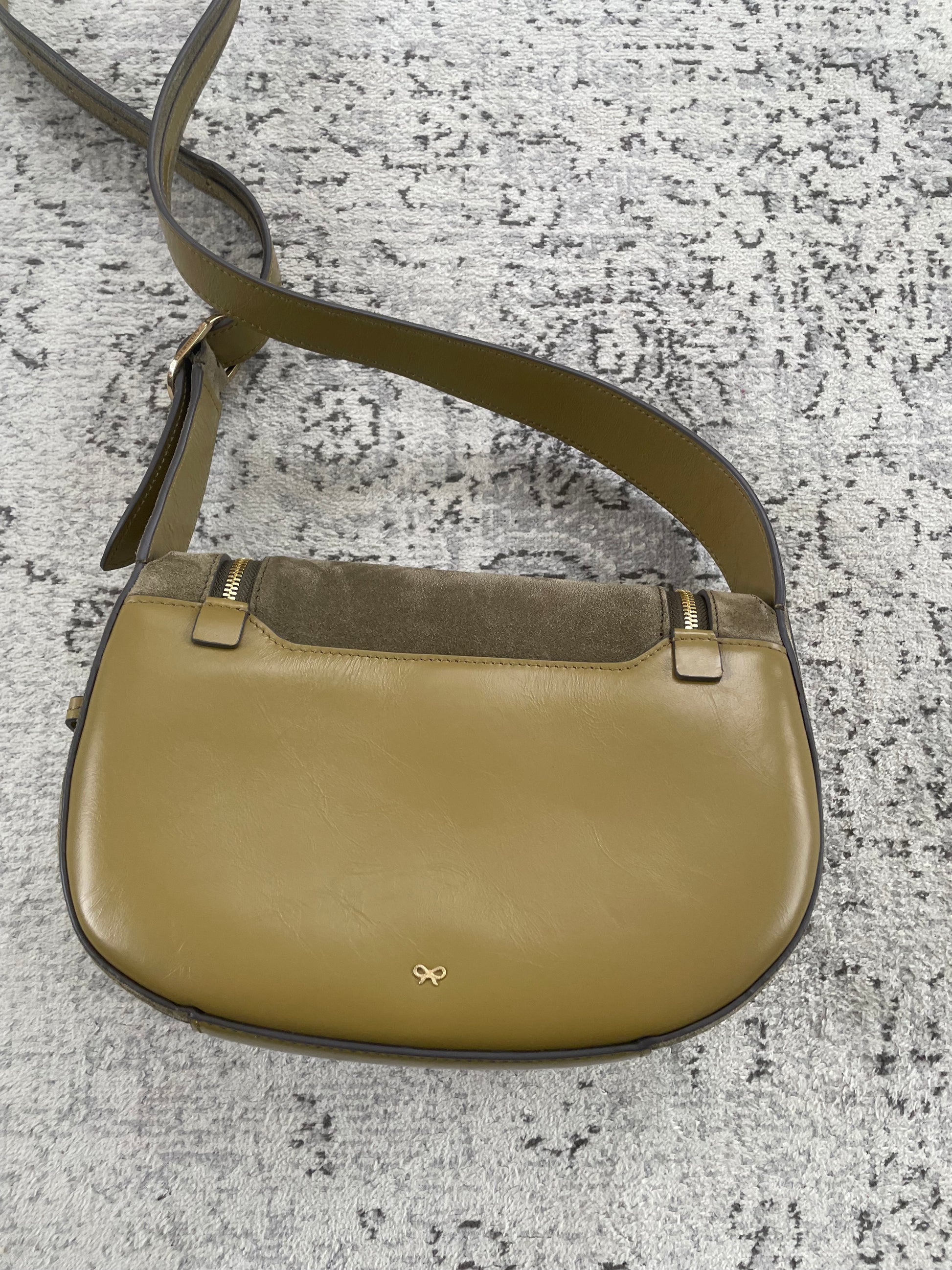 This is a lovely Anya Hindmarch small Vere Soft shoulder Satchel in a tactile moss green suede and contrasting lighter green leather. This smaller size is large enough to carry all your essentials perfectly, the adjustable strap allows the bag to be carried neatly on the shoulder or longer as a shorter crossbody. The goldtone hardware complements the suede beautifully. Inside there is an open slip pocket along with a useful central zip close pocket and a larger main compartment. There is a magnetic closing slip pocket to the back, perfect for keeping your phone safe.