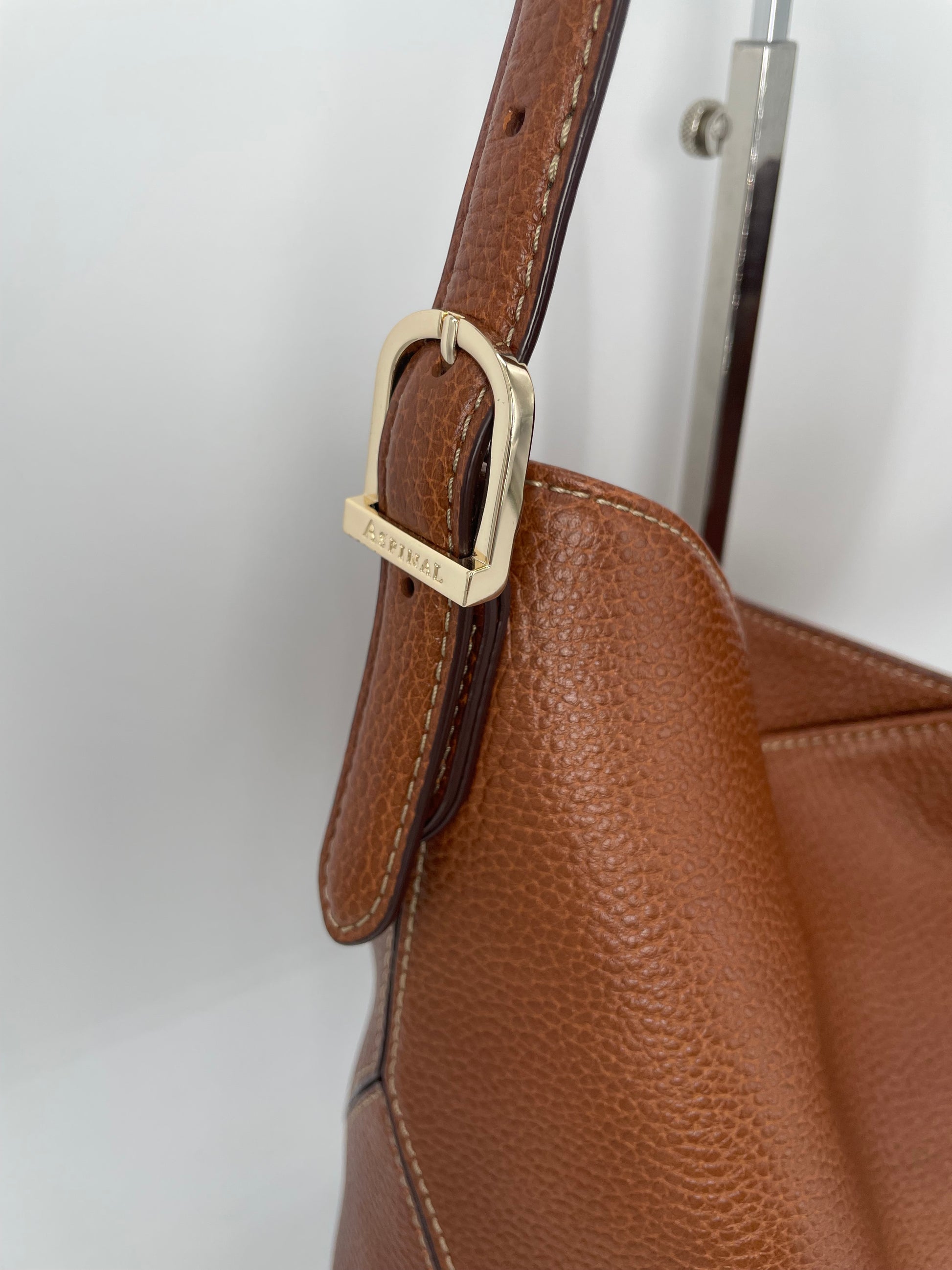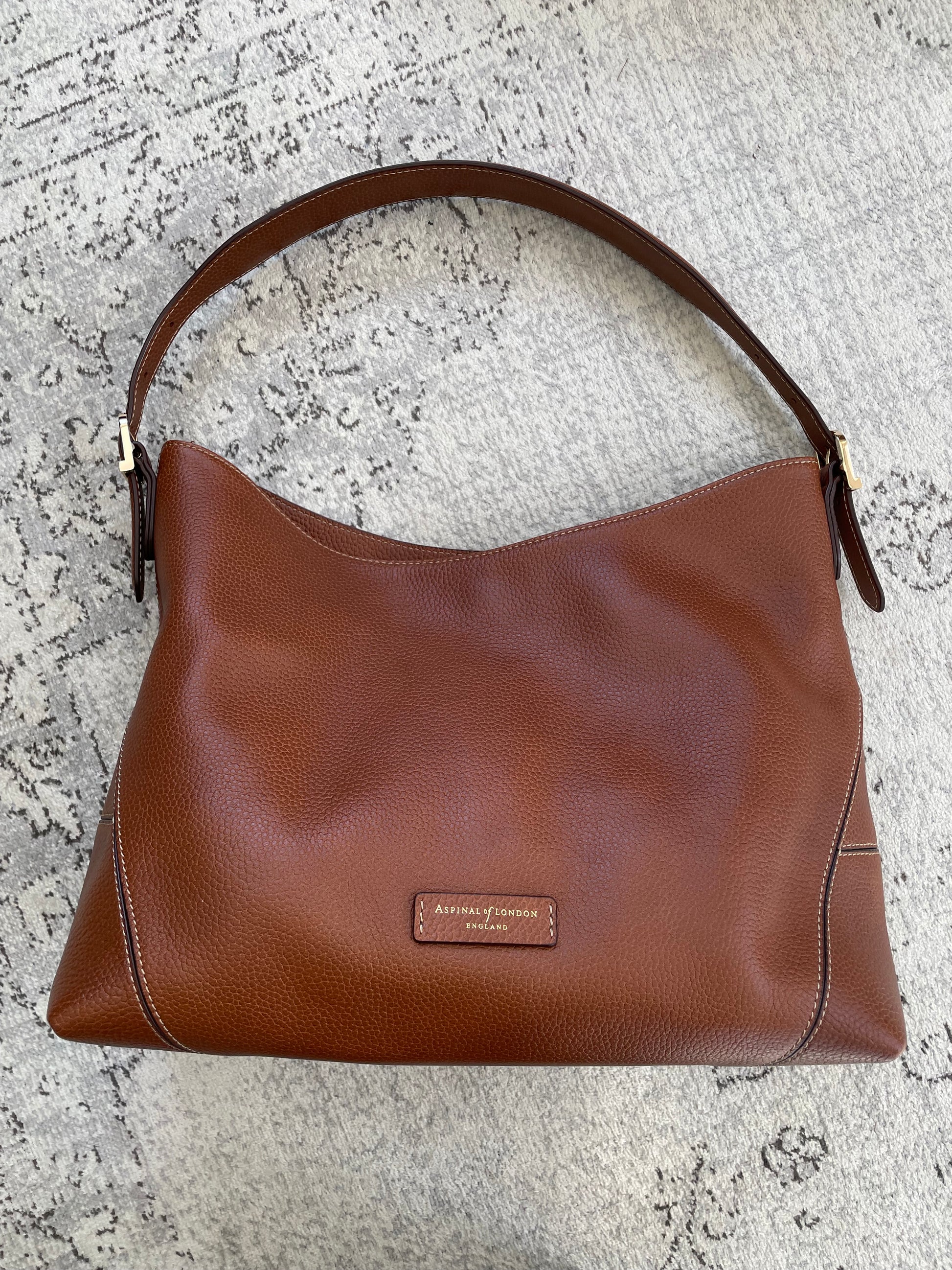 This is a stunning Aspinal of London Hobo Bag. This sleek bag is handcrafted from grainy leather with equestrian bridle inspired hardware detailing and contrast stitching. The top handle is adjustable to both sides. The interior is secured with a magnetic closure and inside there are open slip pockets to keep you organised.
