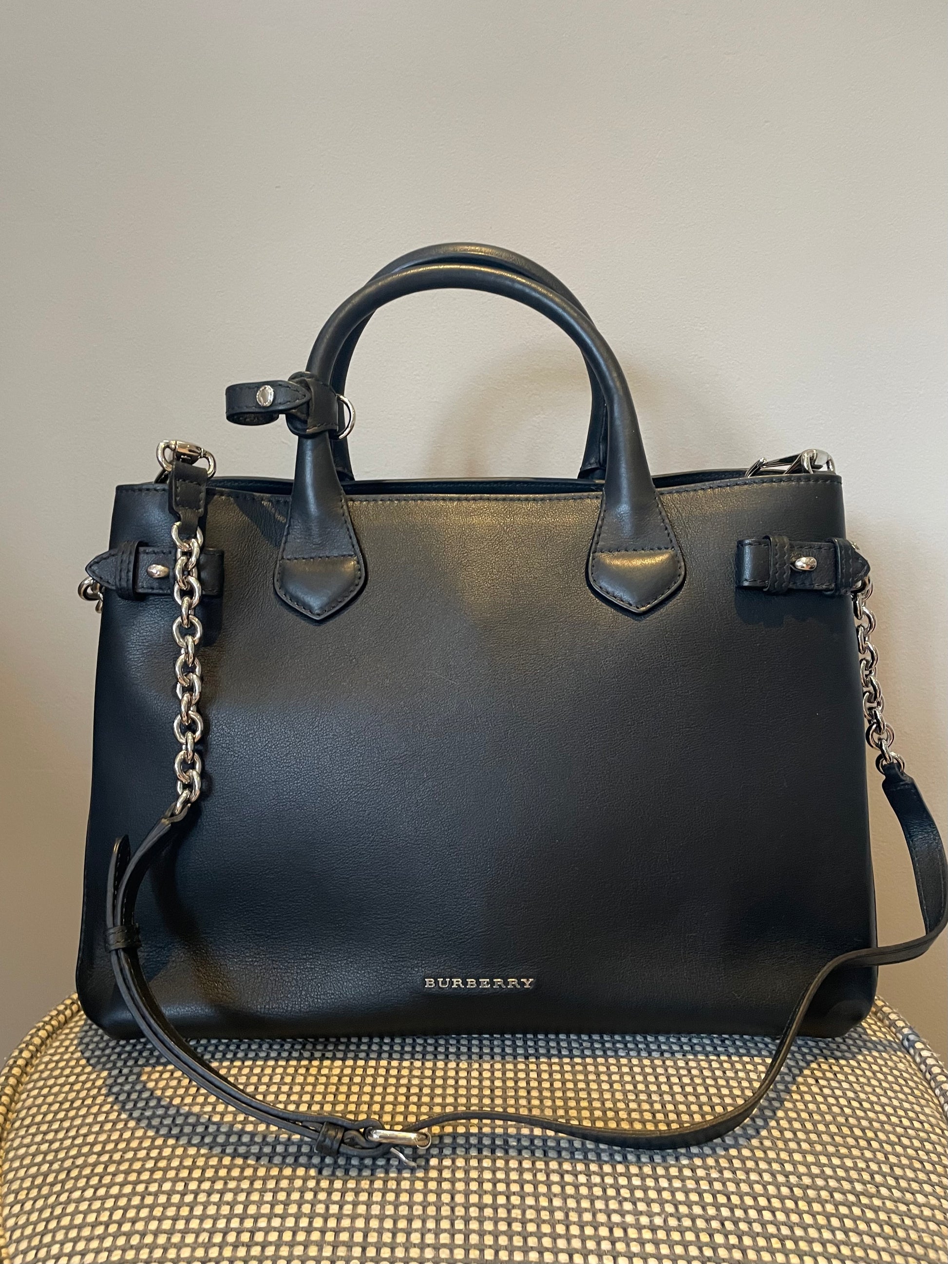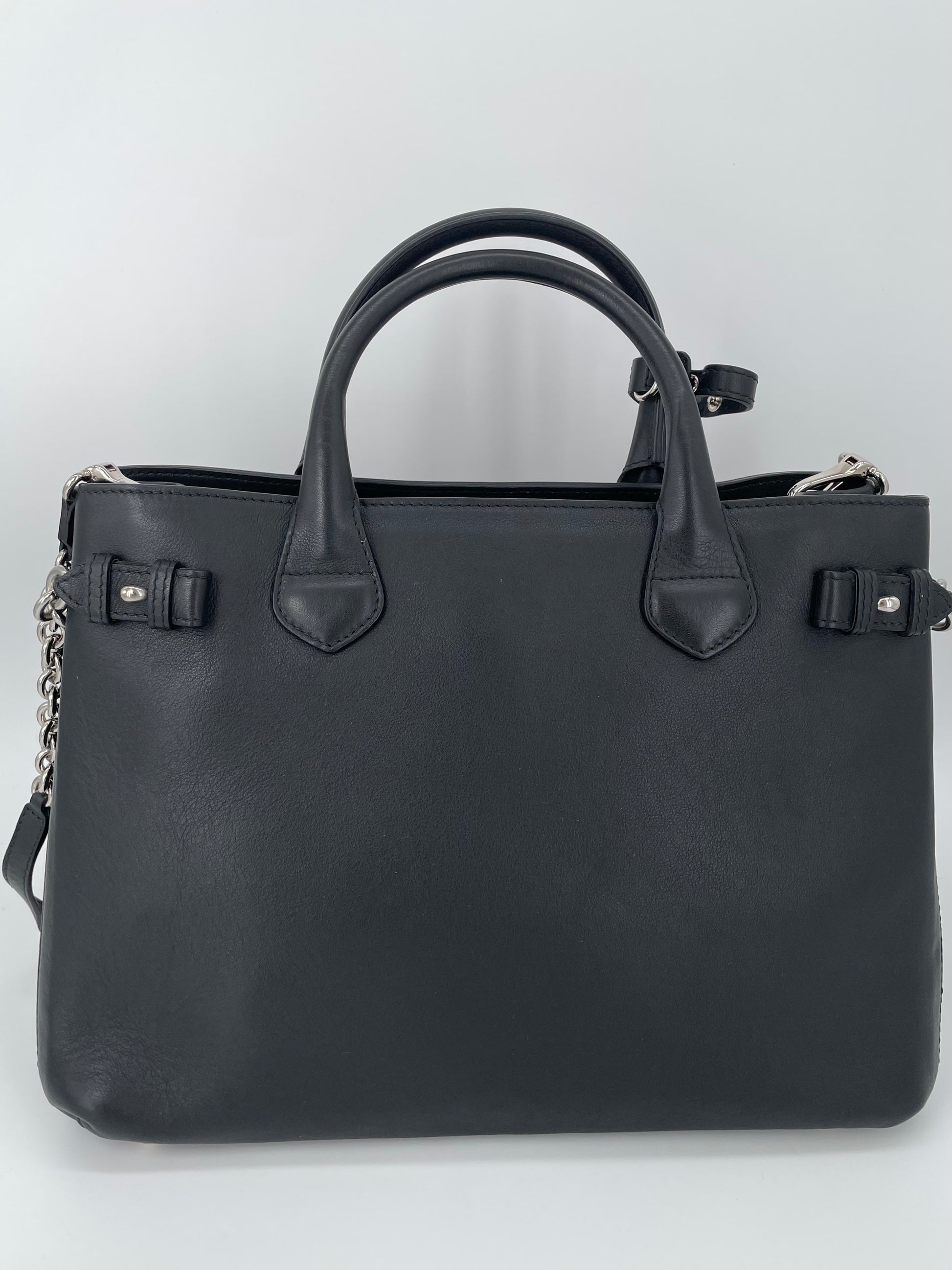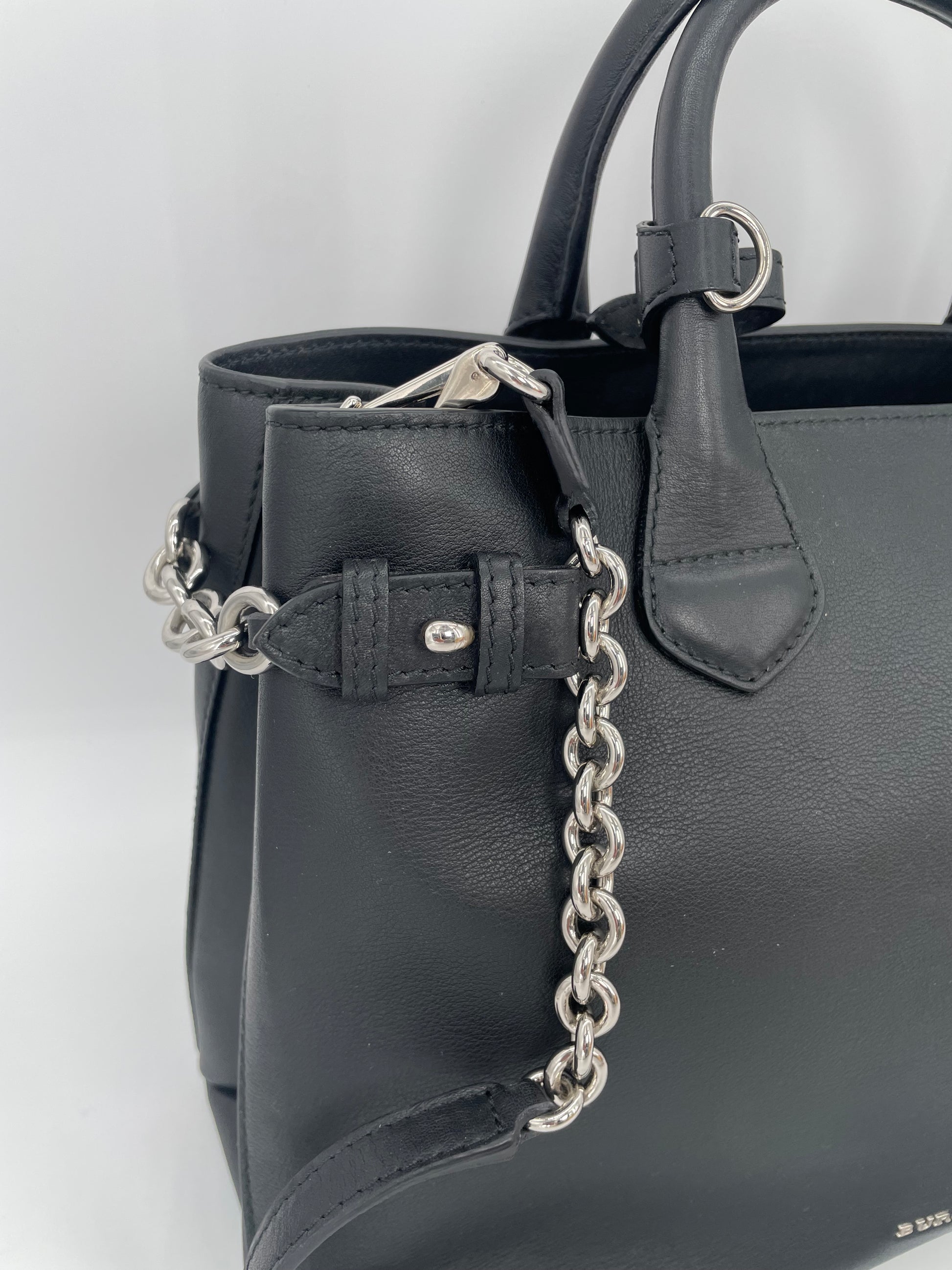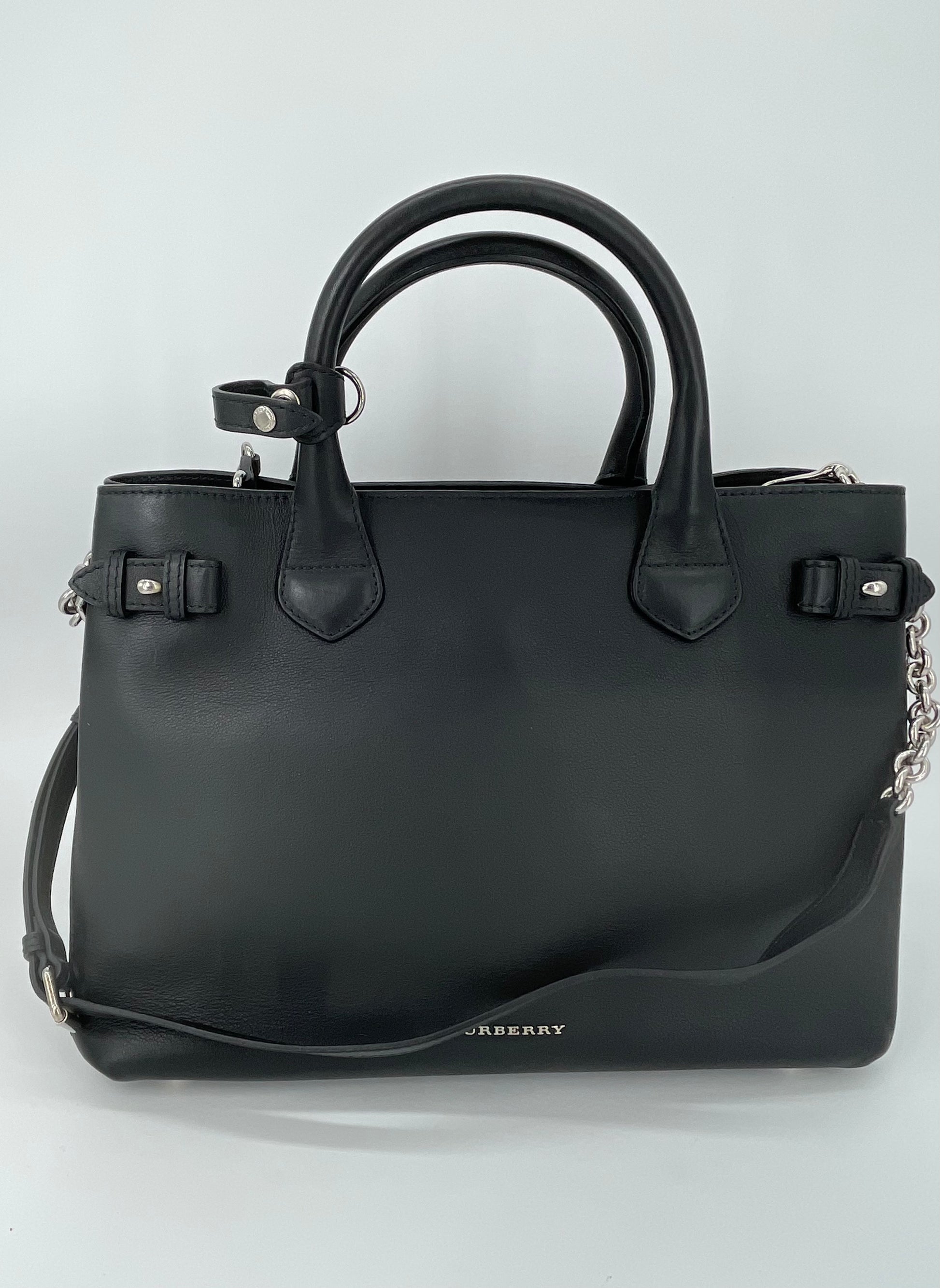 This is a classic and elegant medium Burberry Banner Tote Bag in a sleek black leather, with silvertone hardware. The shoulder bag features rolled leather top handles with side belts with chain detailing. There is an optional leather and chain shoulder strap which allows it to be carried on the shoulder for hands free convenience. Inside has the classic Burberry check lining with 2 open compartments and a central zip pocket. Back zip close pocket and two front slip pockets.