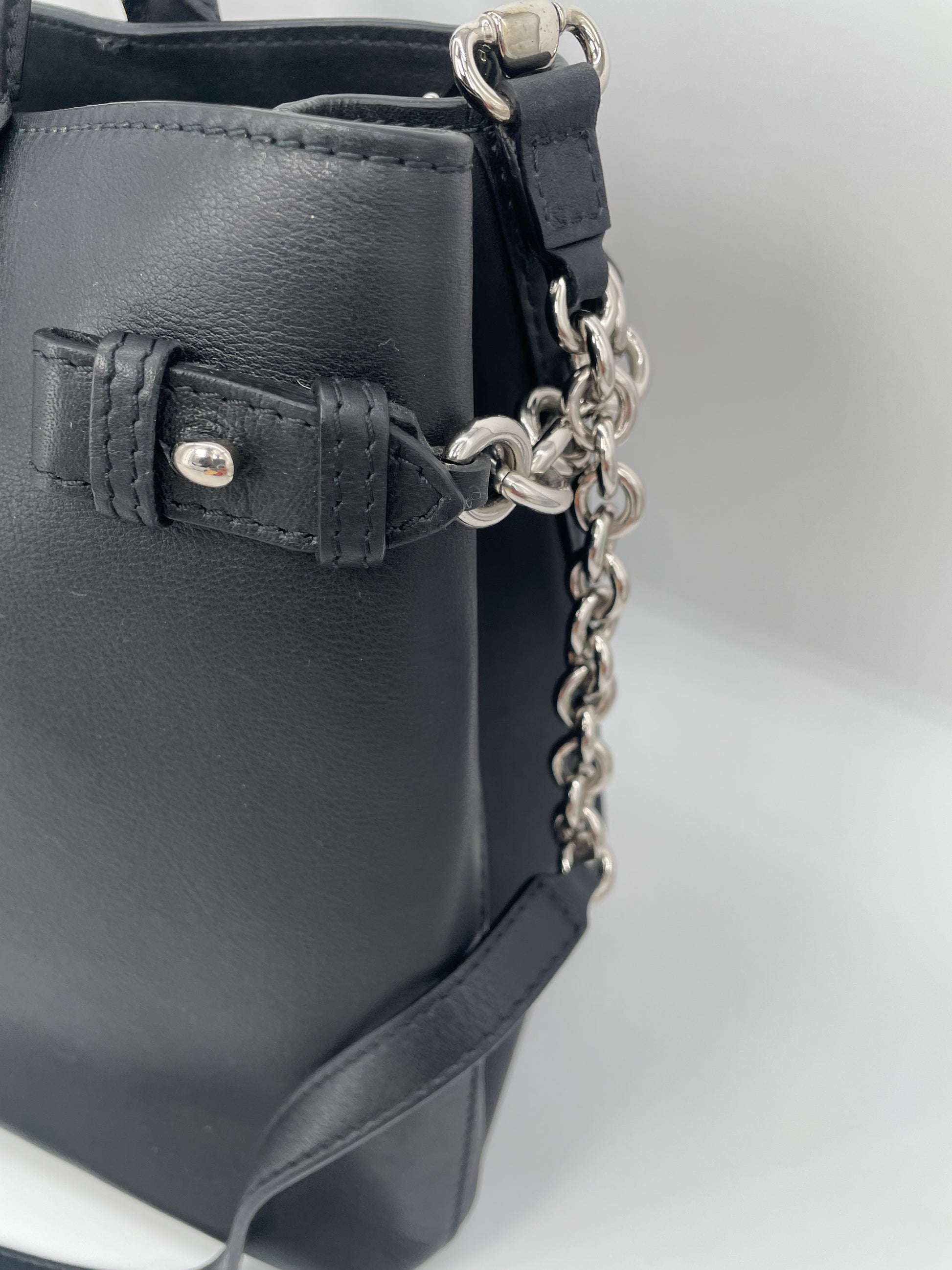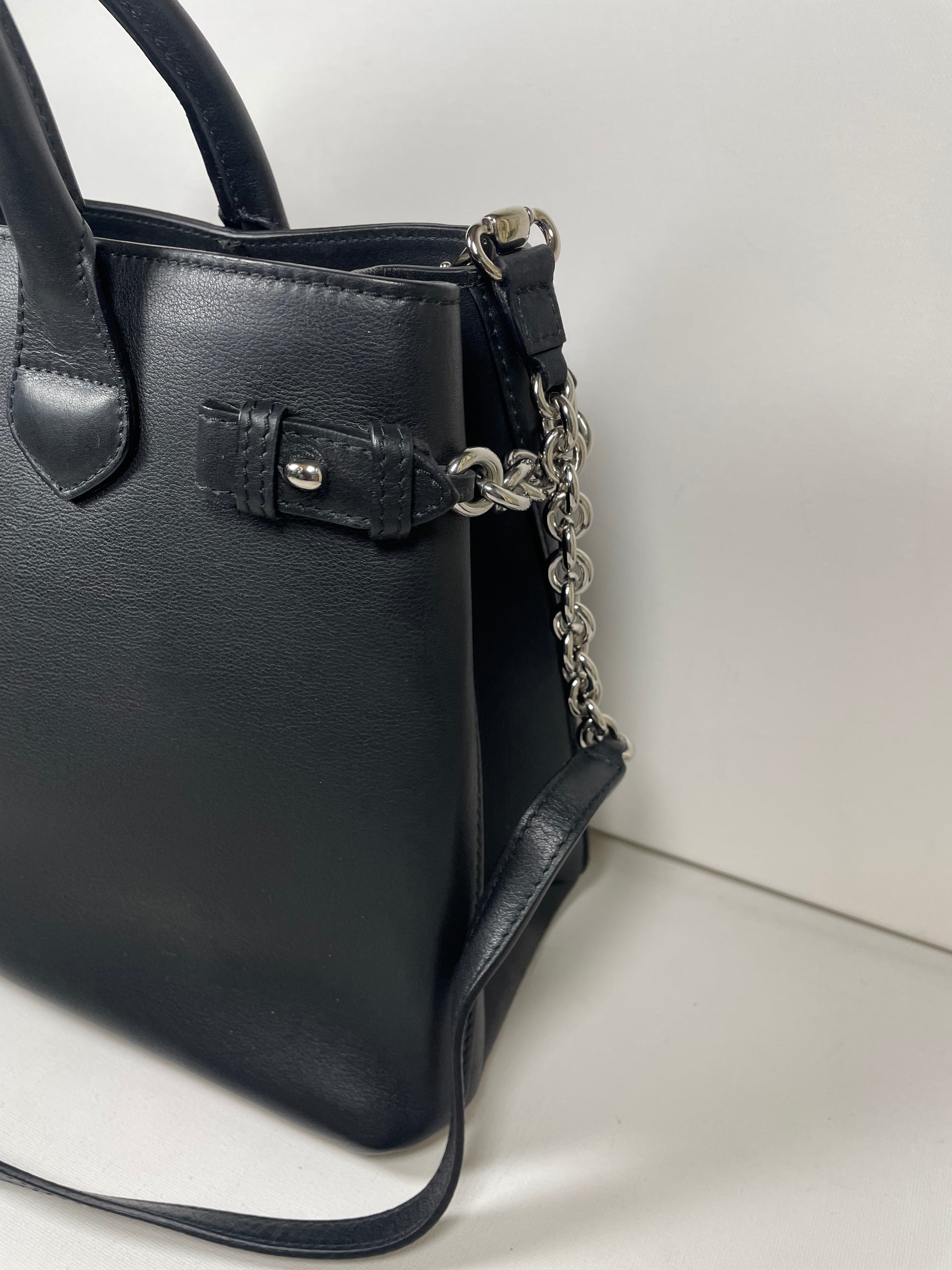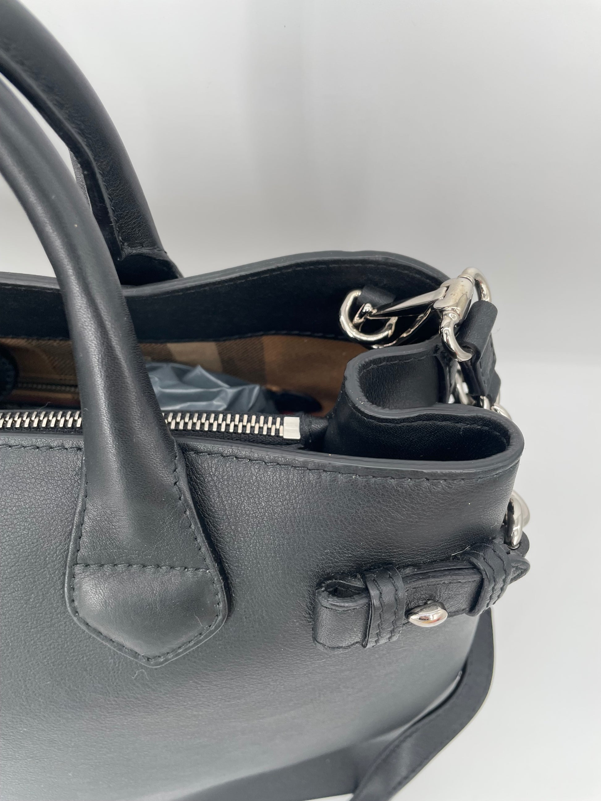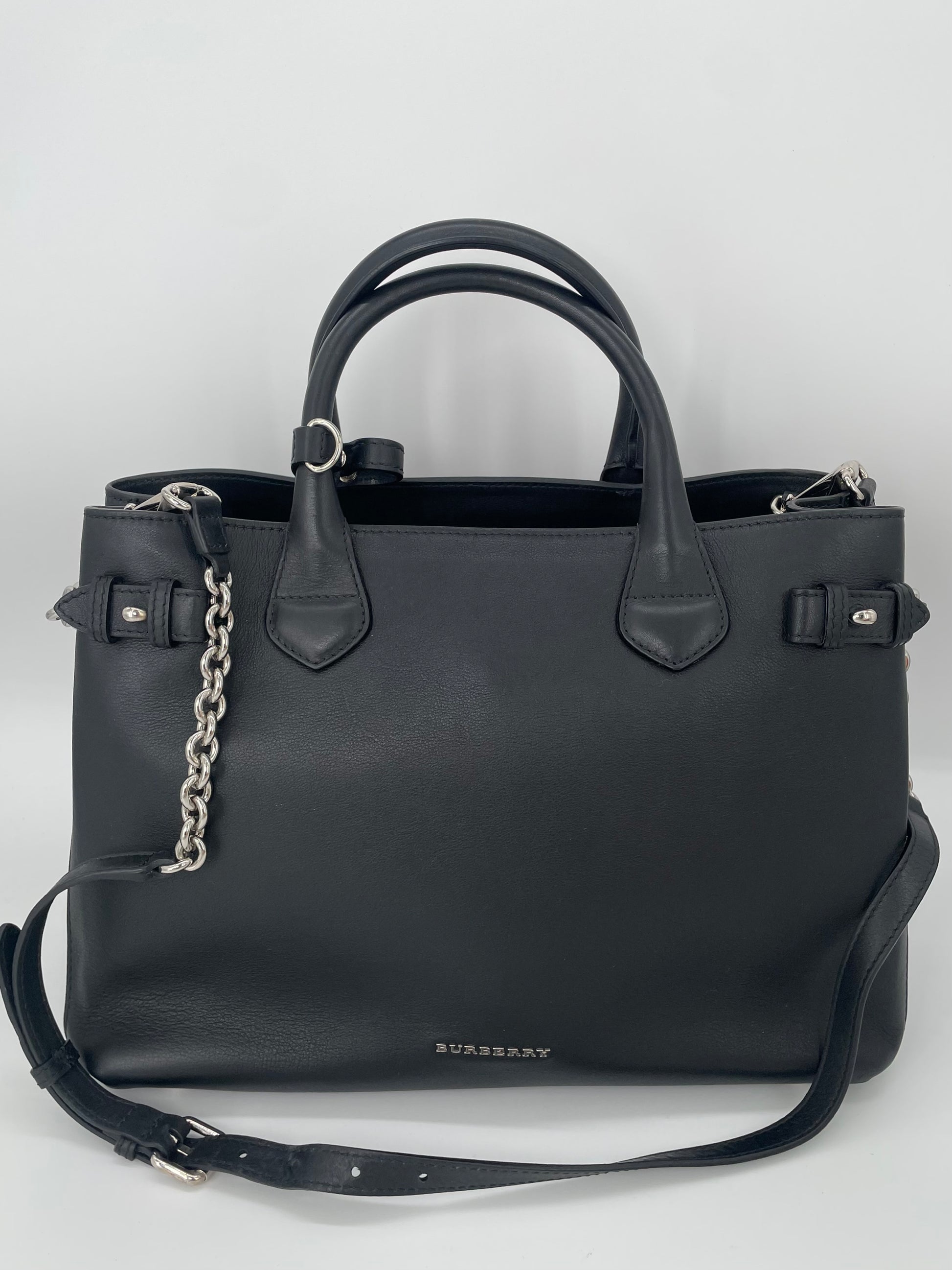 This is a classic and elegant medium Burberry Banner Tote Bag in a sleek black leather, with silvertone hardware. The shoulder bag features rolled leather top handles with side belts with chain detailing. There is an optional leather and chain shoulder strap which allows it to be carried on the shoulder for hands free convenience. Inside has the classic Burberry check lining with 2 open compartments and a central zip pocket. Back zip close pocket and two front slip pockets.