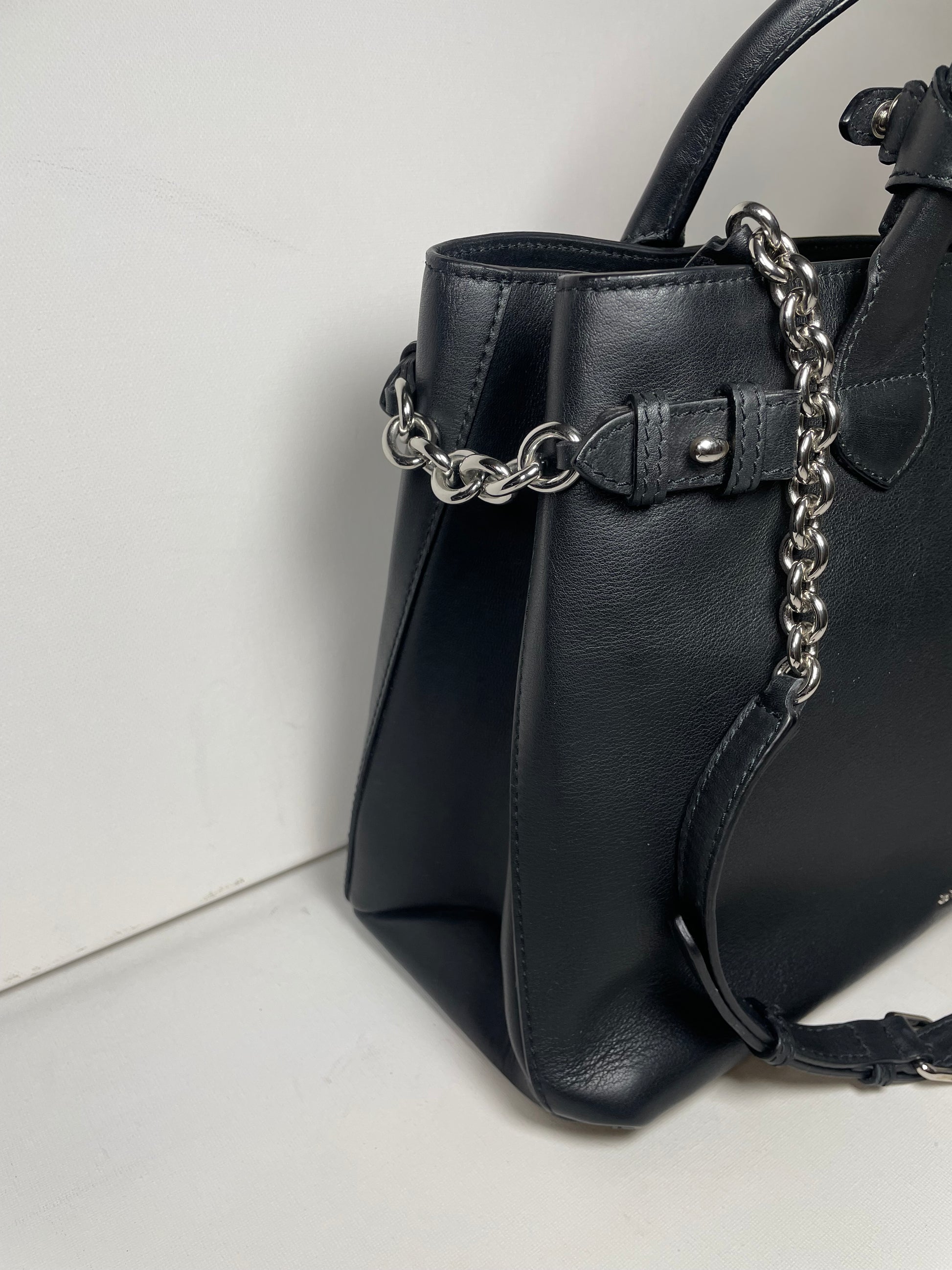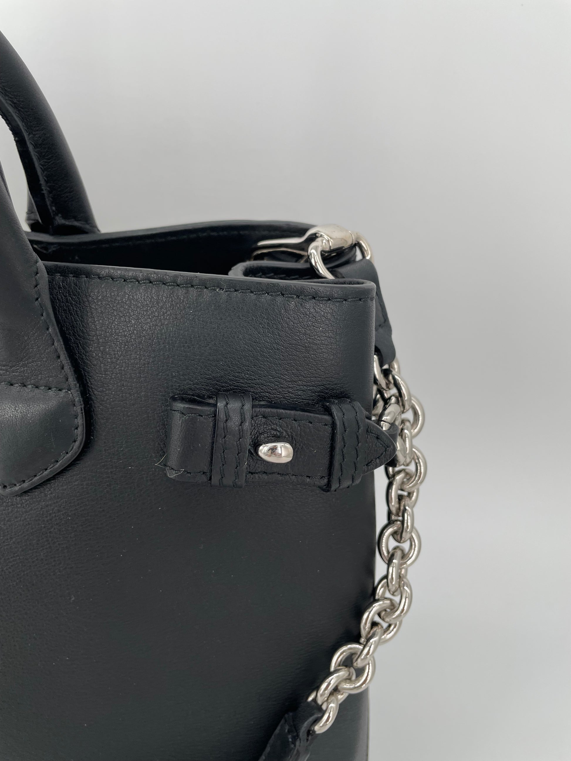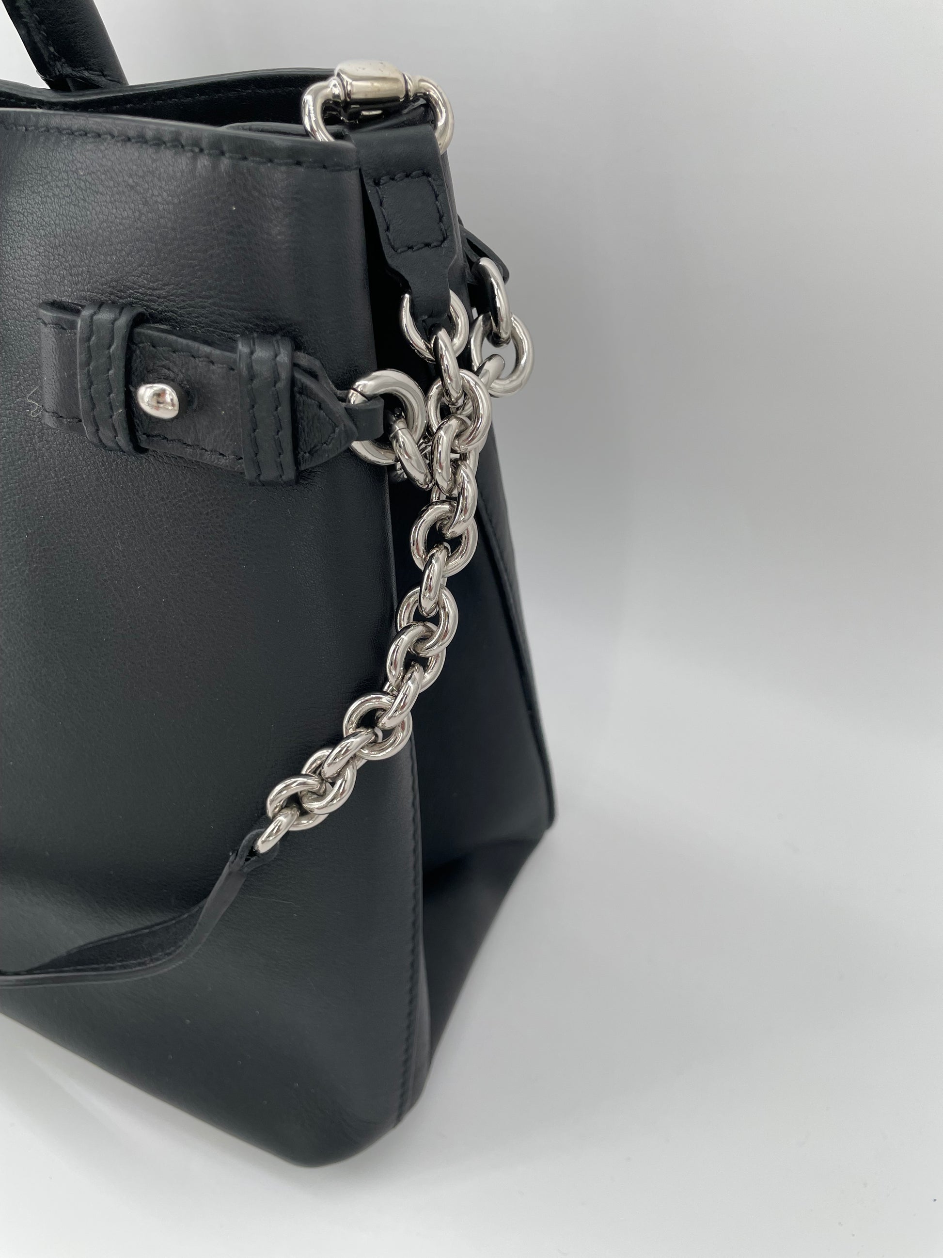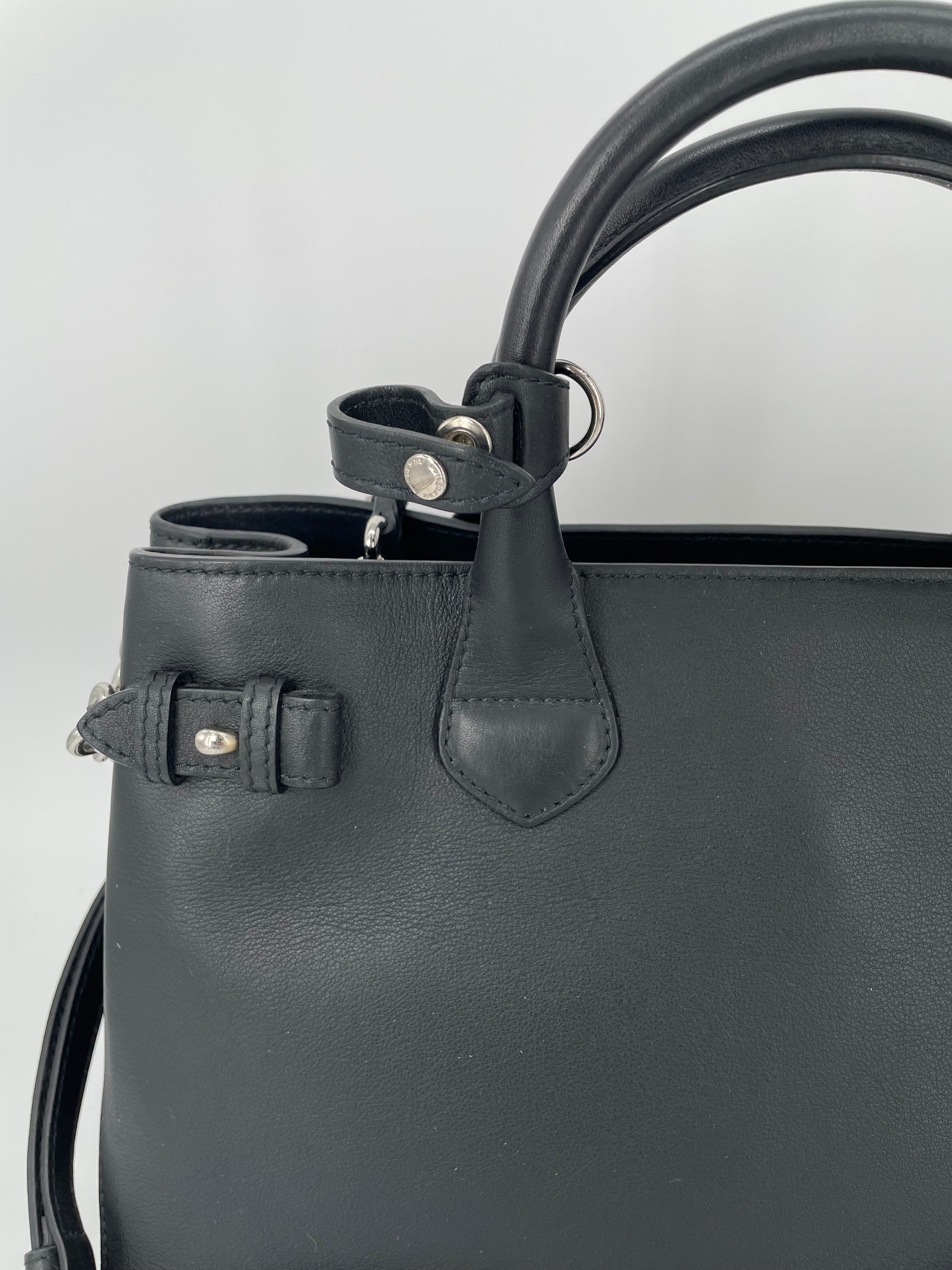 This is a classic and elegant medium Burberry Banner Tote Bag in a sleek black leather, with silvertone hardware. The shoulder bag features rolled leather top handles with side belts with chain detailing. There is an optional leather and chain shoulder strap which allows it to be carried on the shoulder for hands free convenience. Inside has the classic Burberry check lining with 2 open compartments and a central zip pocket. Back zip close pocket and two front slip pockets.