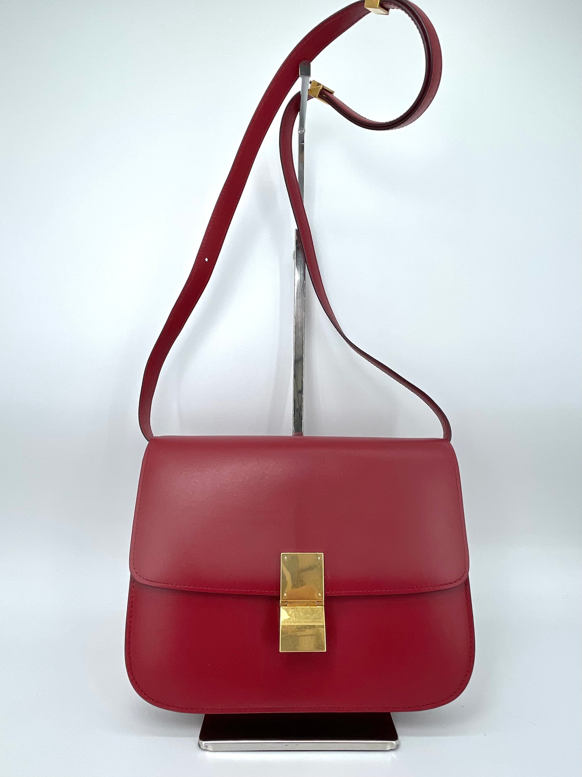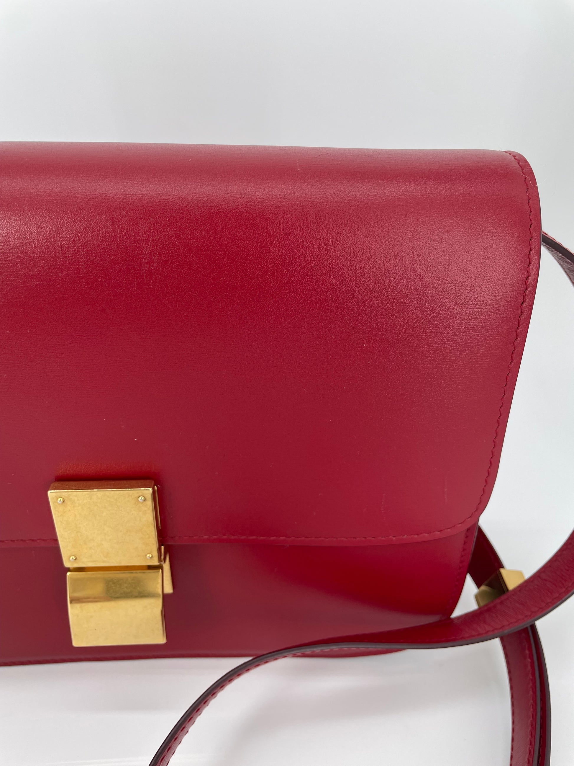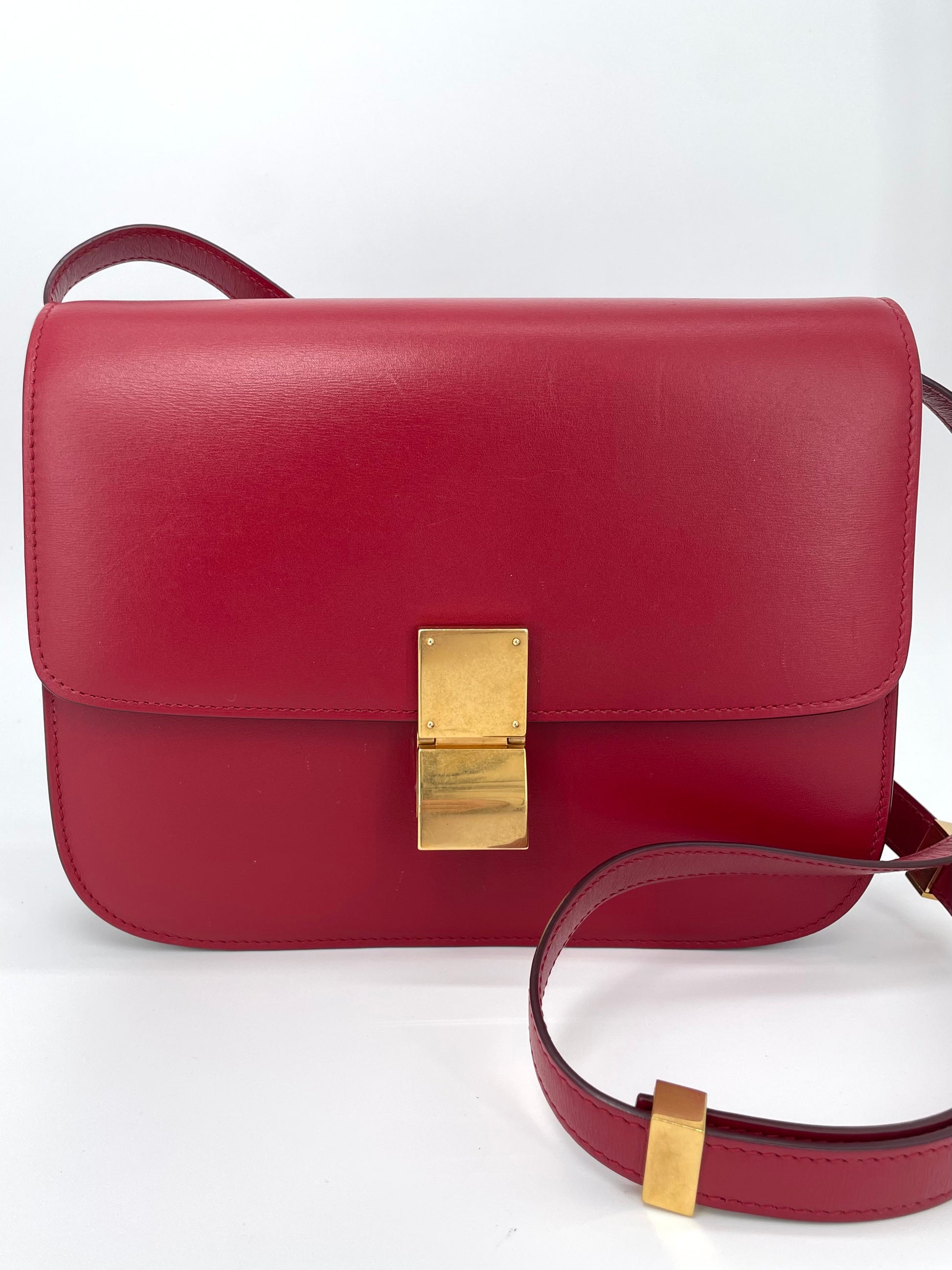 This is a stunning Celine Box Calfskin Medium Classic Box Flap Bag in Dark Brick Red. This elegant shoulder bag is crafted of fine smooth box calfskin leather with complementing goldtone hardware. This handbag features an adjustable leather shoulder strap with aged gold hardware, and a matching gold press lock on the crossover flap that opens to two compartments, two small slip pockets and a zip close pocket.