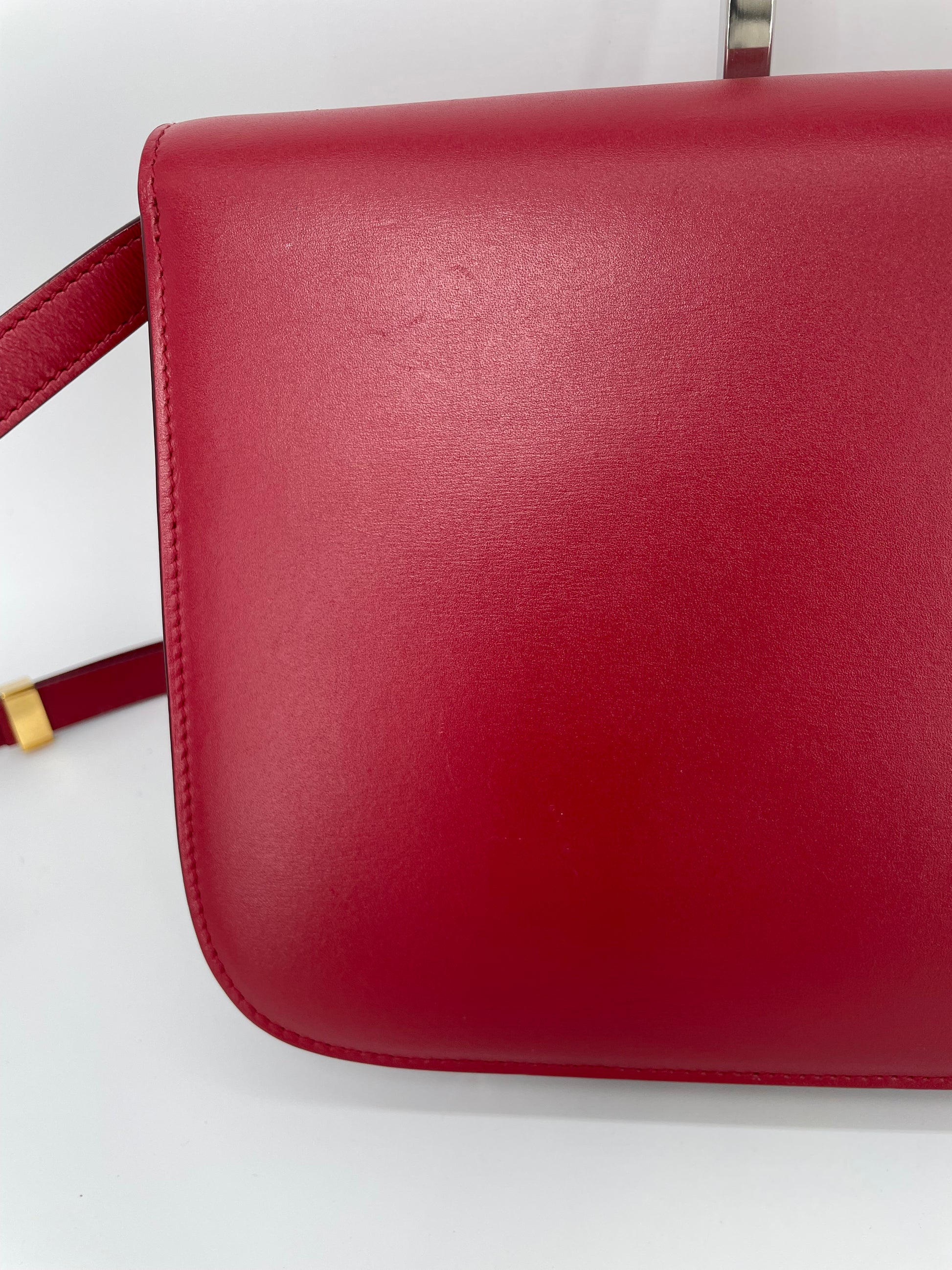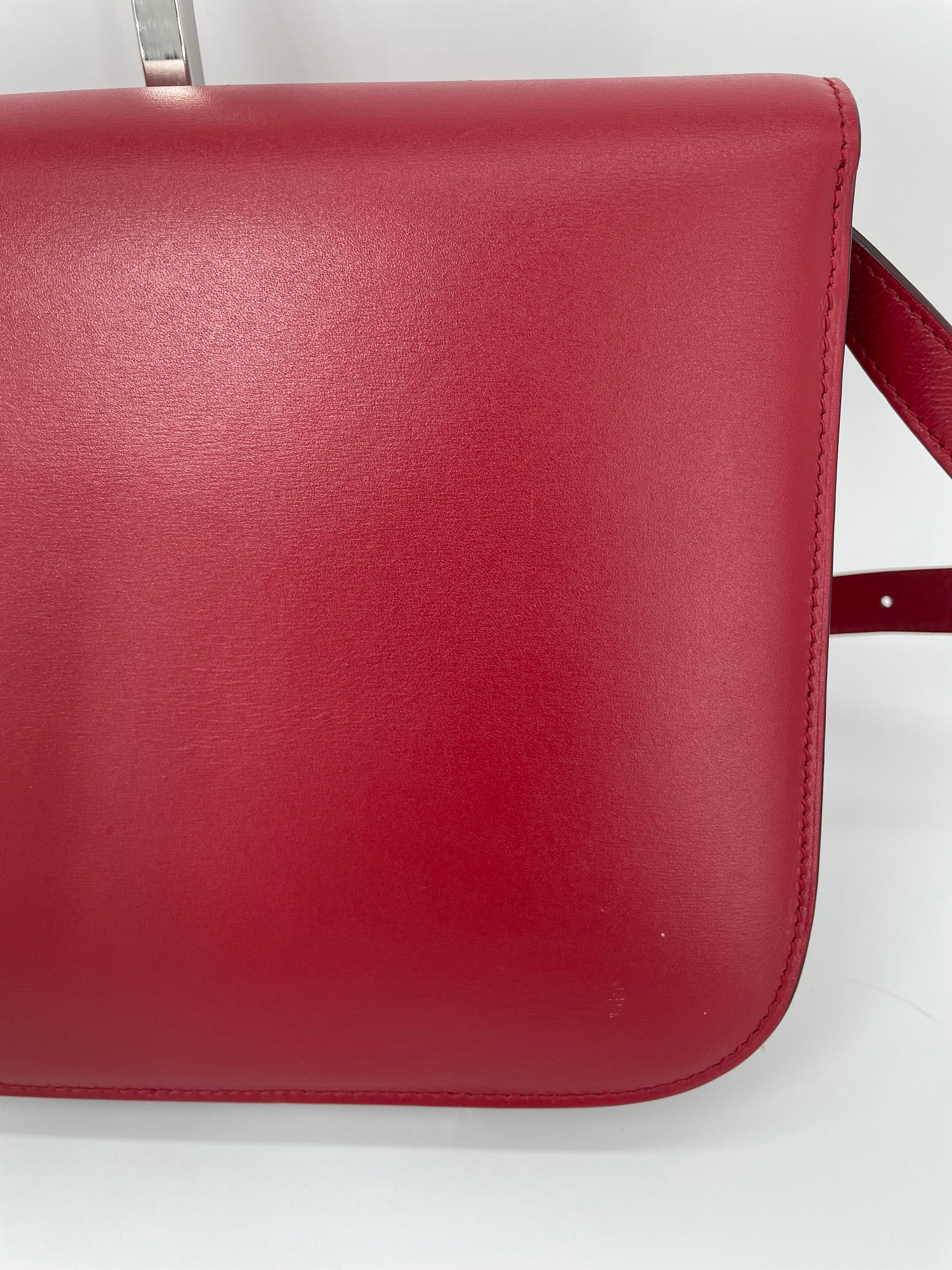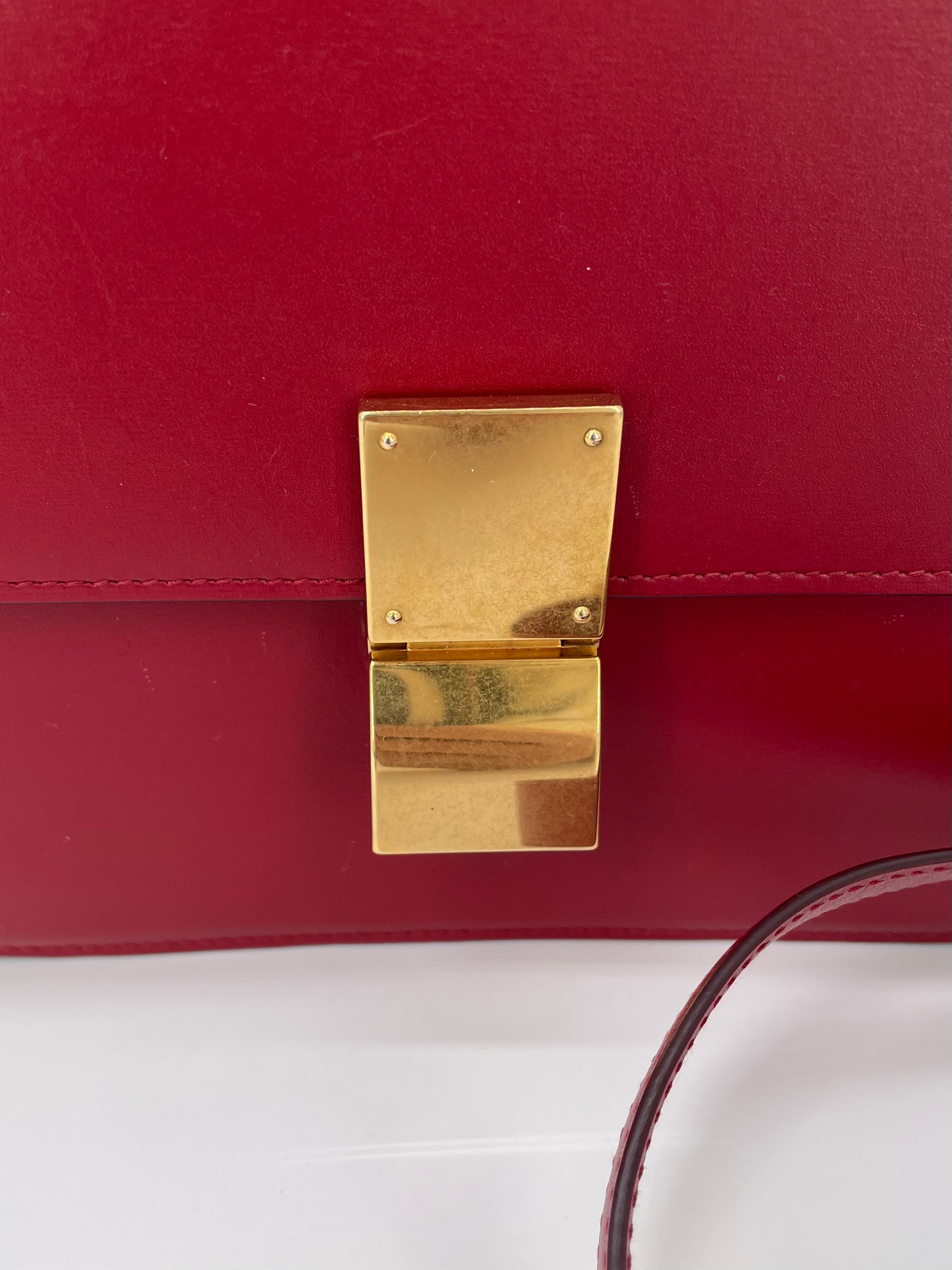 This is a stunning Celine Box Calfskin Medium Classic Box Flap Bag in Dark Brick Red. This elegant shoulder bag is crafted of fine smooth box calfskin leather with complementing goldtone hardware. This handbag features an adjustable leather shoulder strap with aged gold hardware, and a matching gold press lock on the crossover flap that opens to two compartments, two small slip pockets and a zip close pocket.