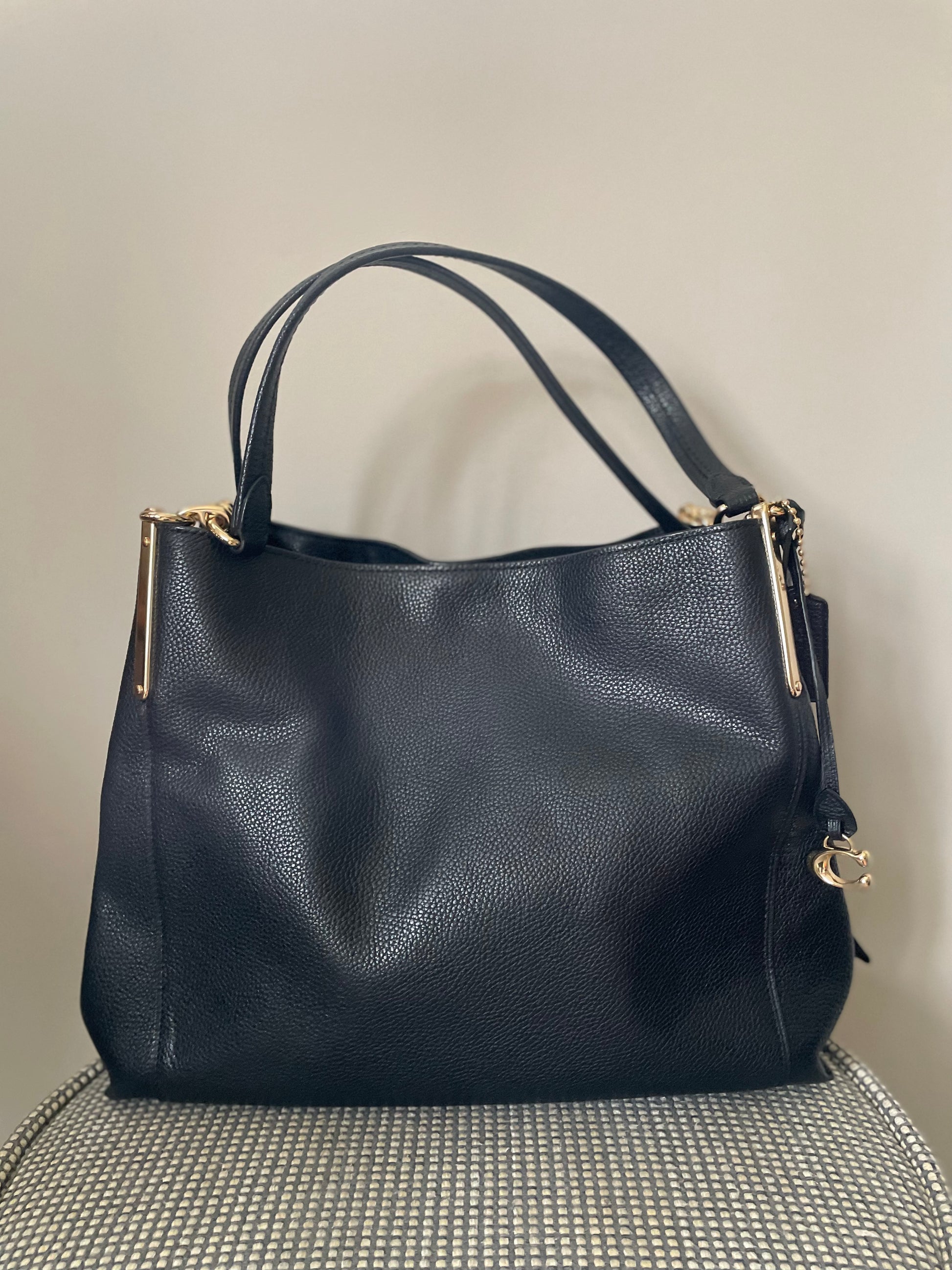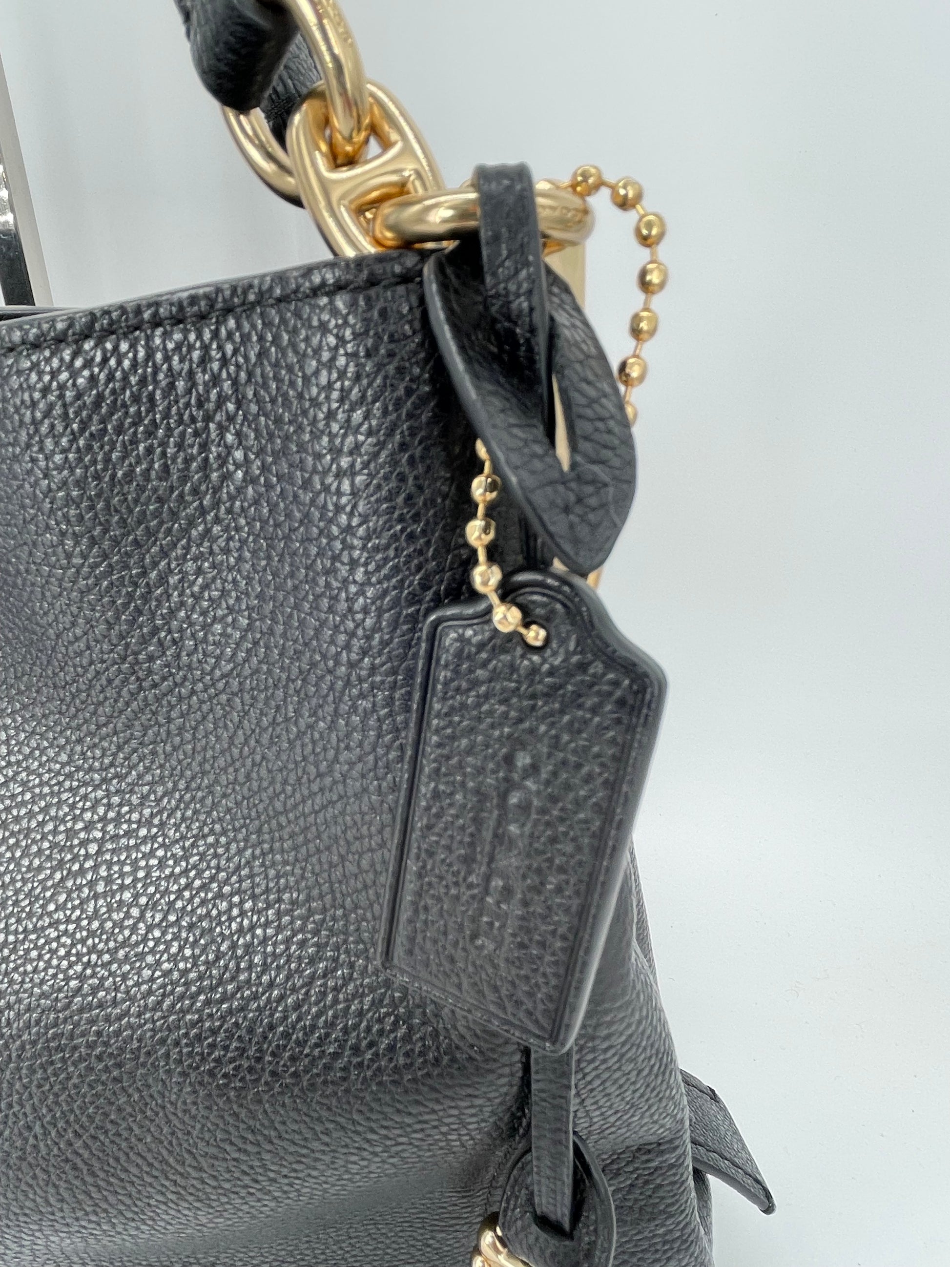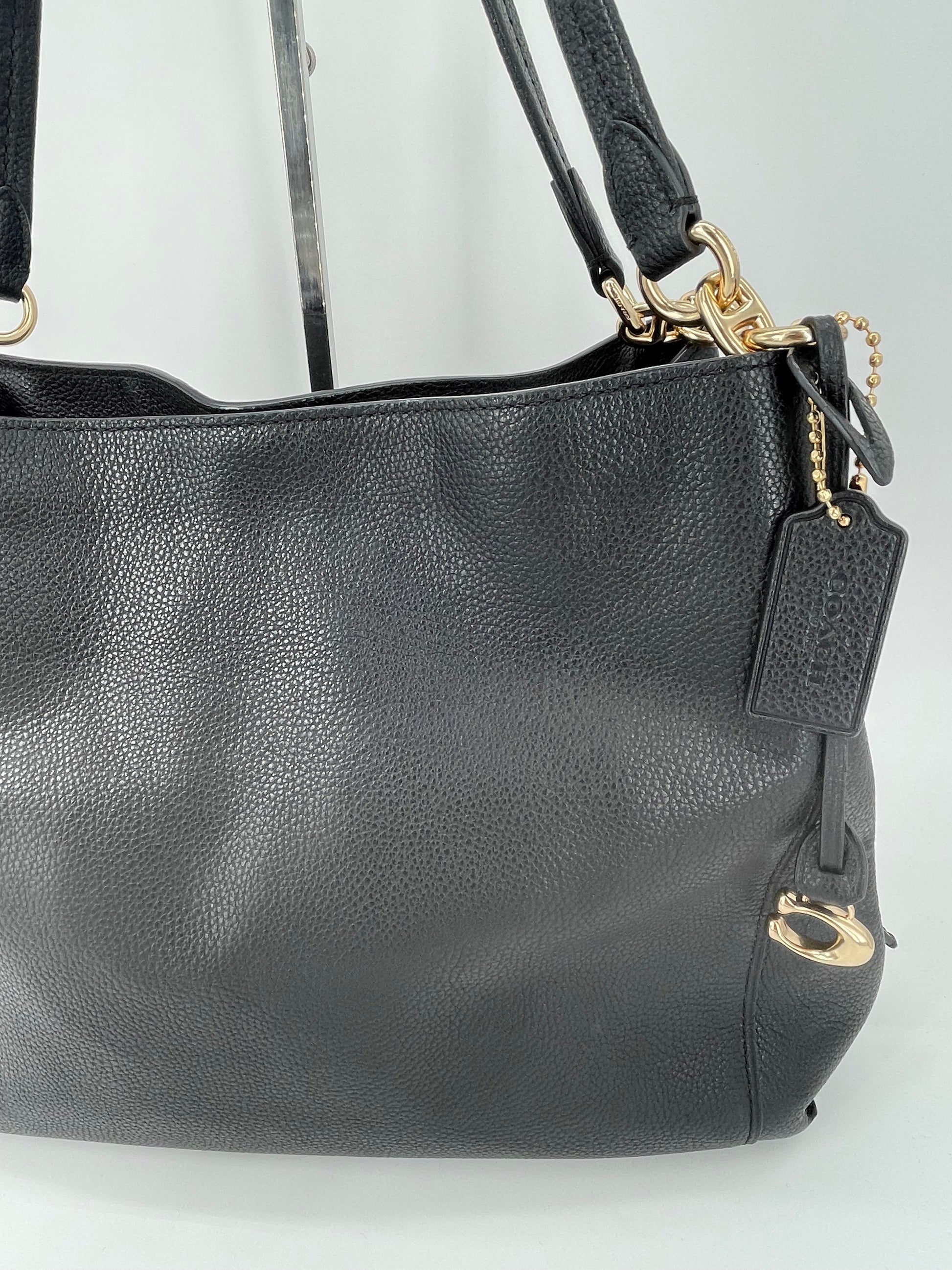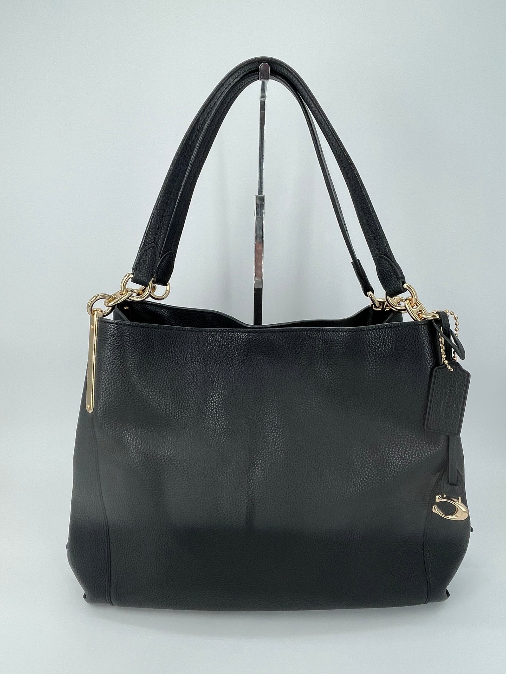 The Coach Dalton 28 is a soft, slouchy, timeless shoulder bag. The bag is made from grainy black leather and is the perfect everyday bag. crafted from polished pebble leather. The combination of black leather and light goldtone hardware work together perfectly. There is a decorative hanging tag. The bag is carried with two top handles. Inside there are two main compartments and a central secure zip close pocket.
