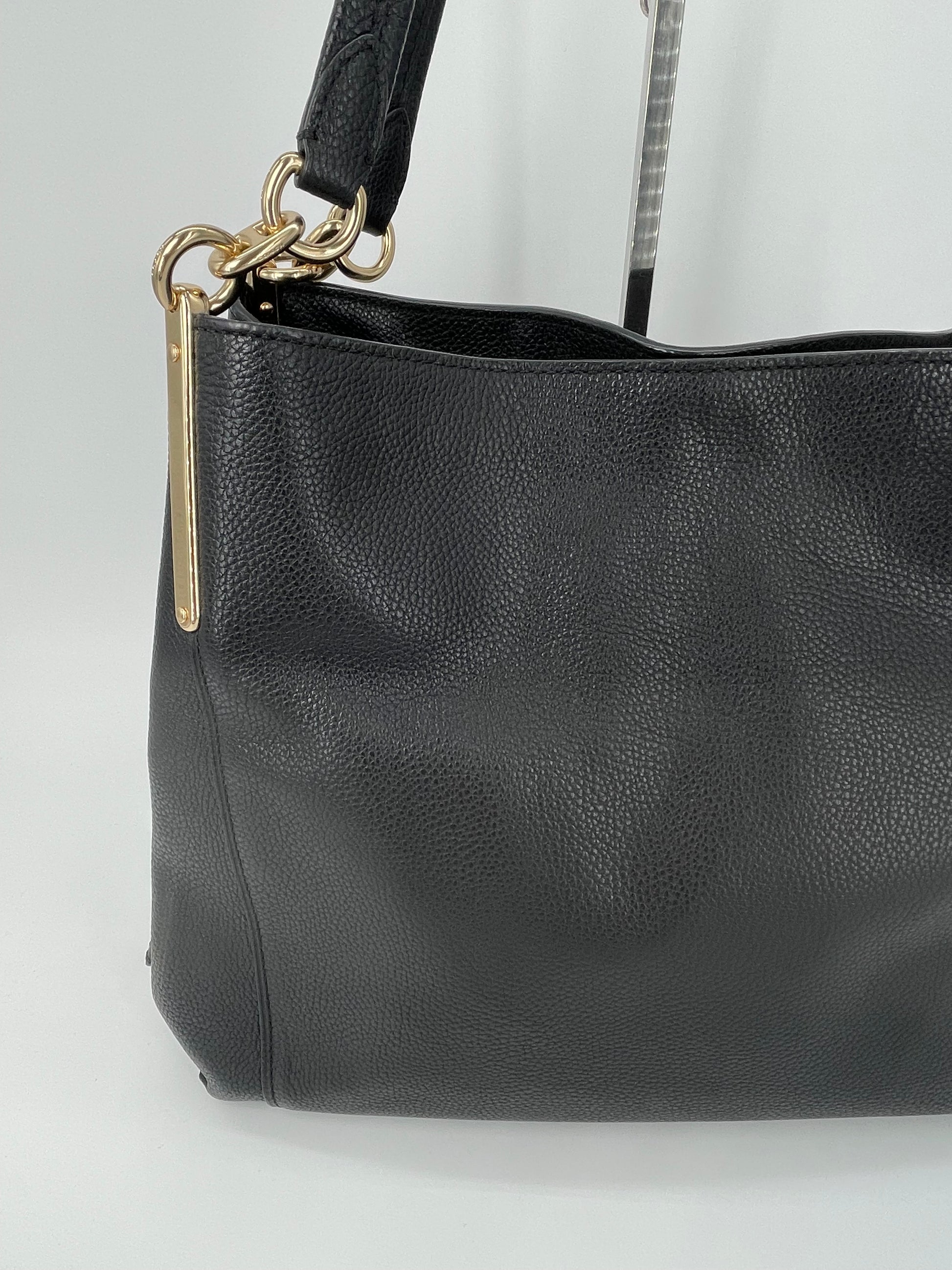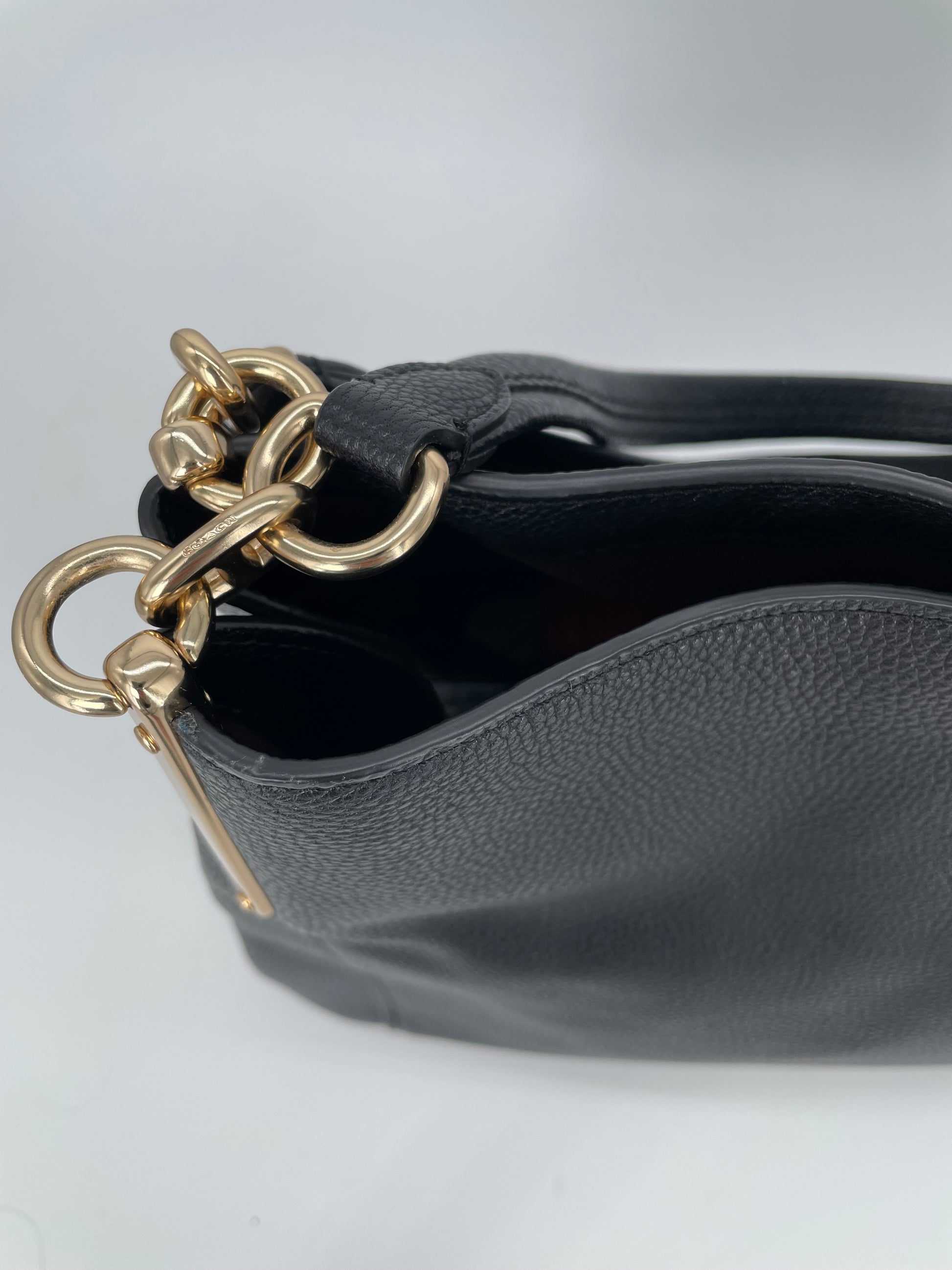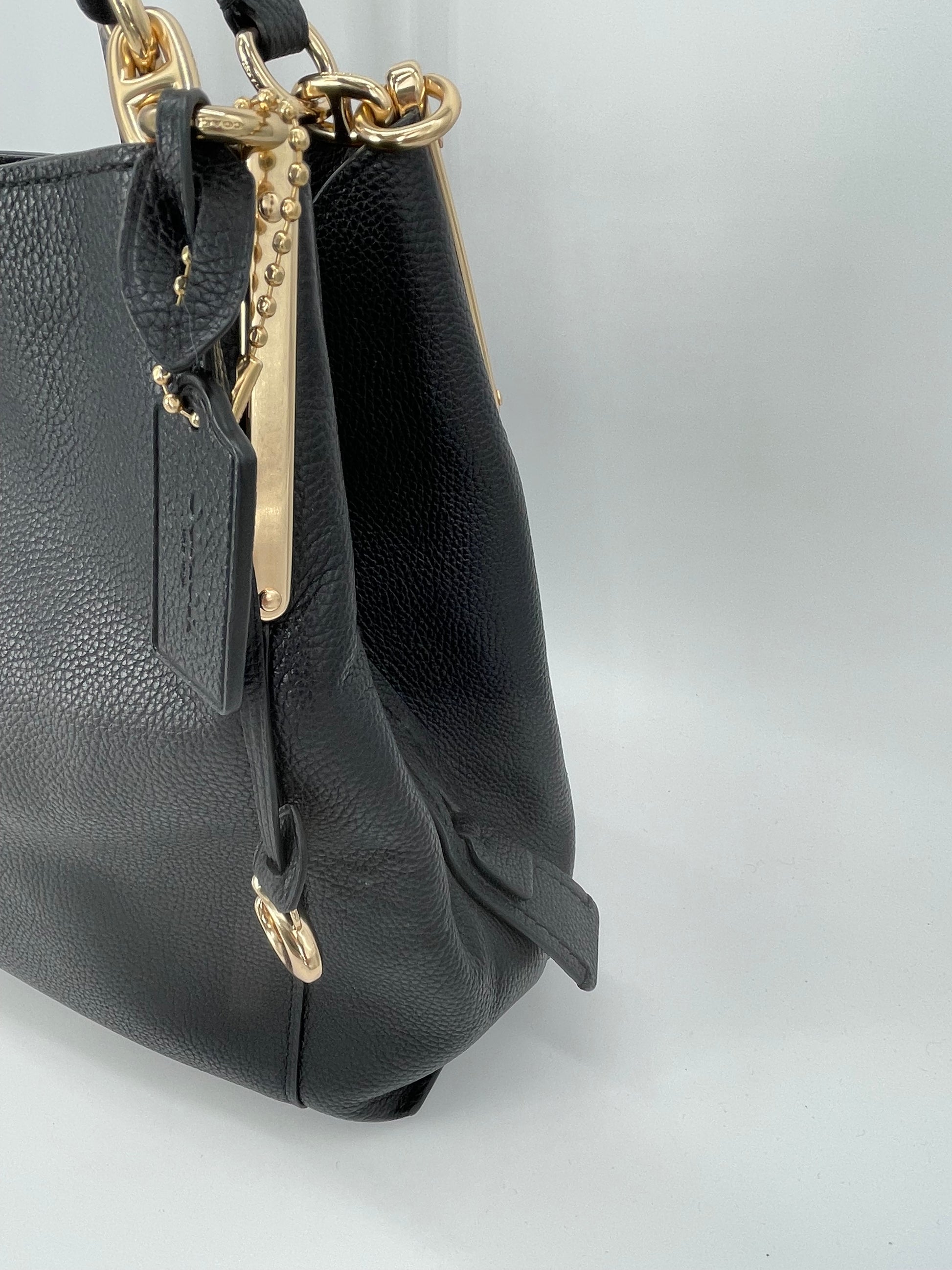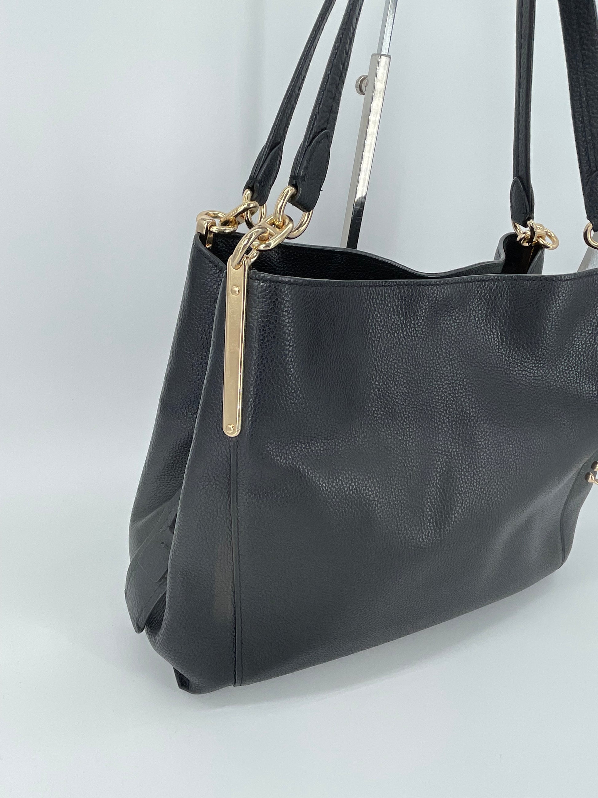 The Coach Dalton 28 is a soft, slouchy, timeless shoulder bag. The bag is made from grainy black leather and is the perfect everyday bag. crafted from polished pebble leather. The combination of black leather and light goldtone hardware work together perfectly. There is a decorative hanging tag. The bag is carried with two top handles. Inside there are two main compartments and a central secure zip close pocket.
