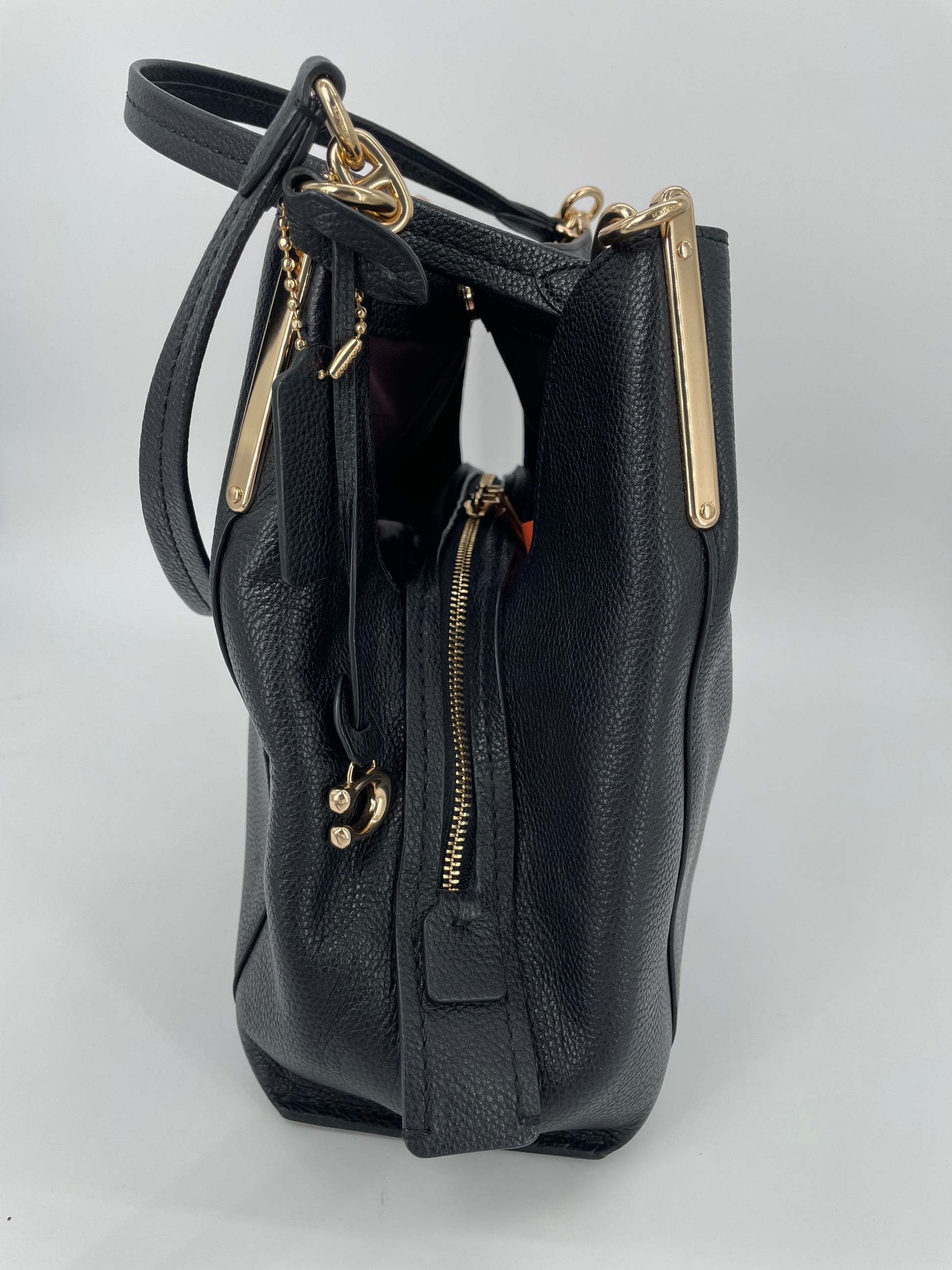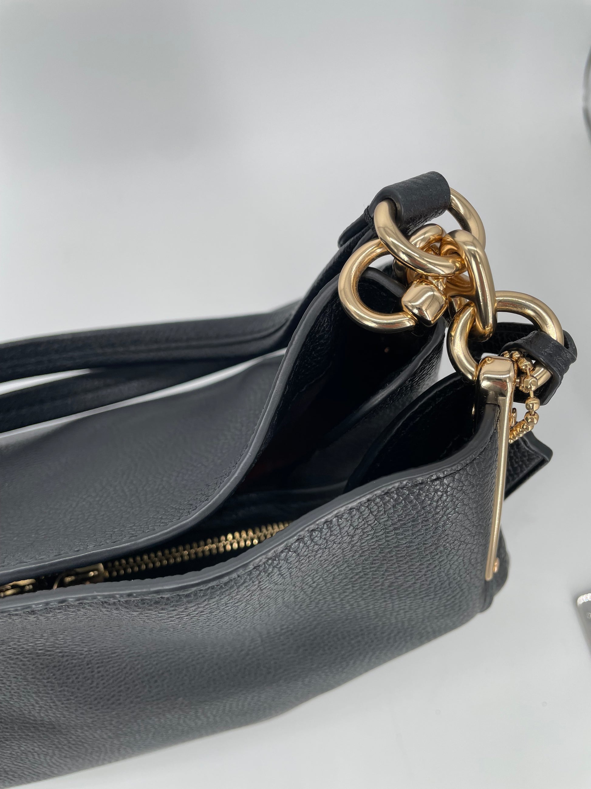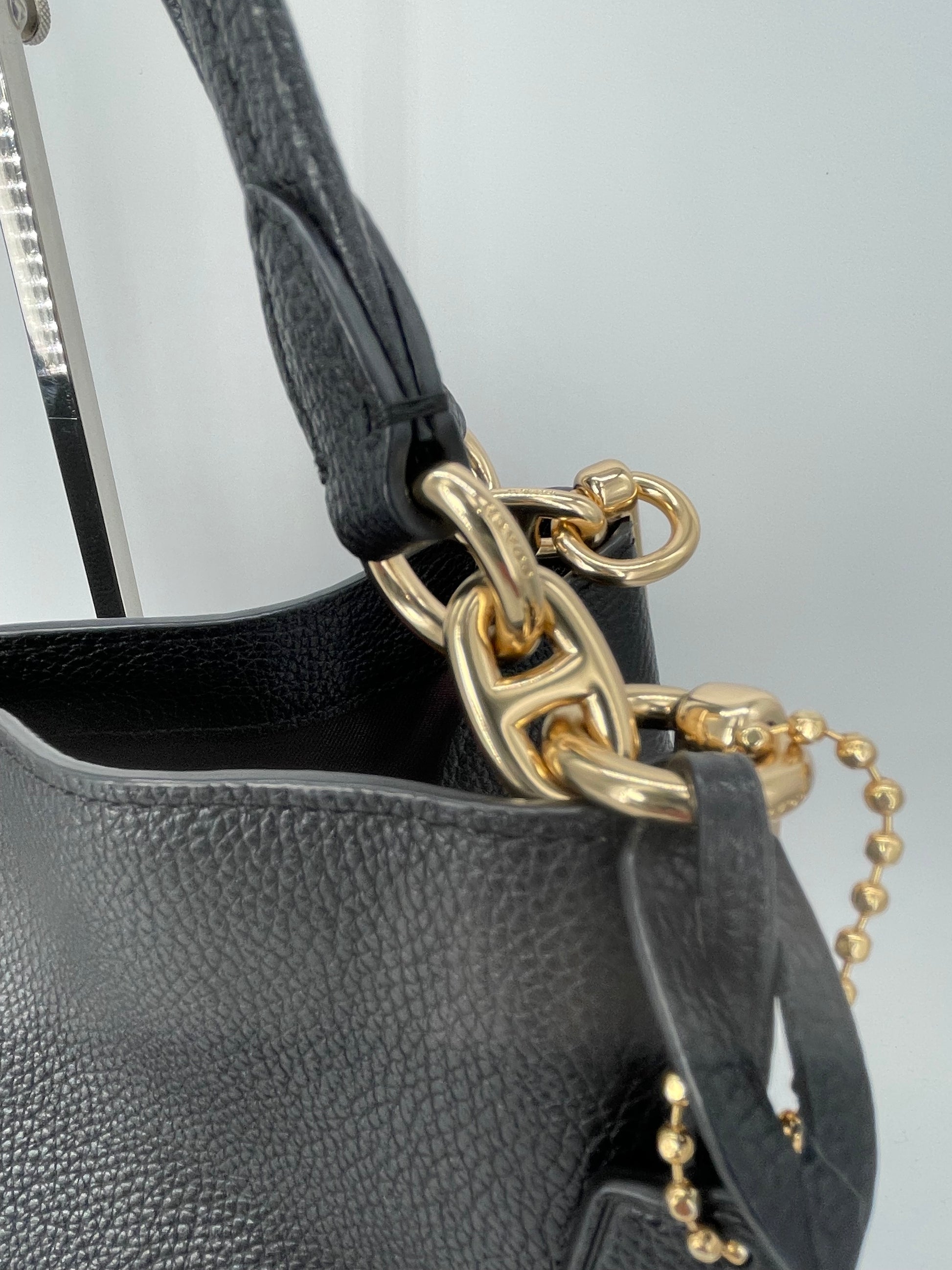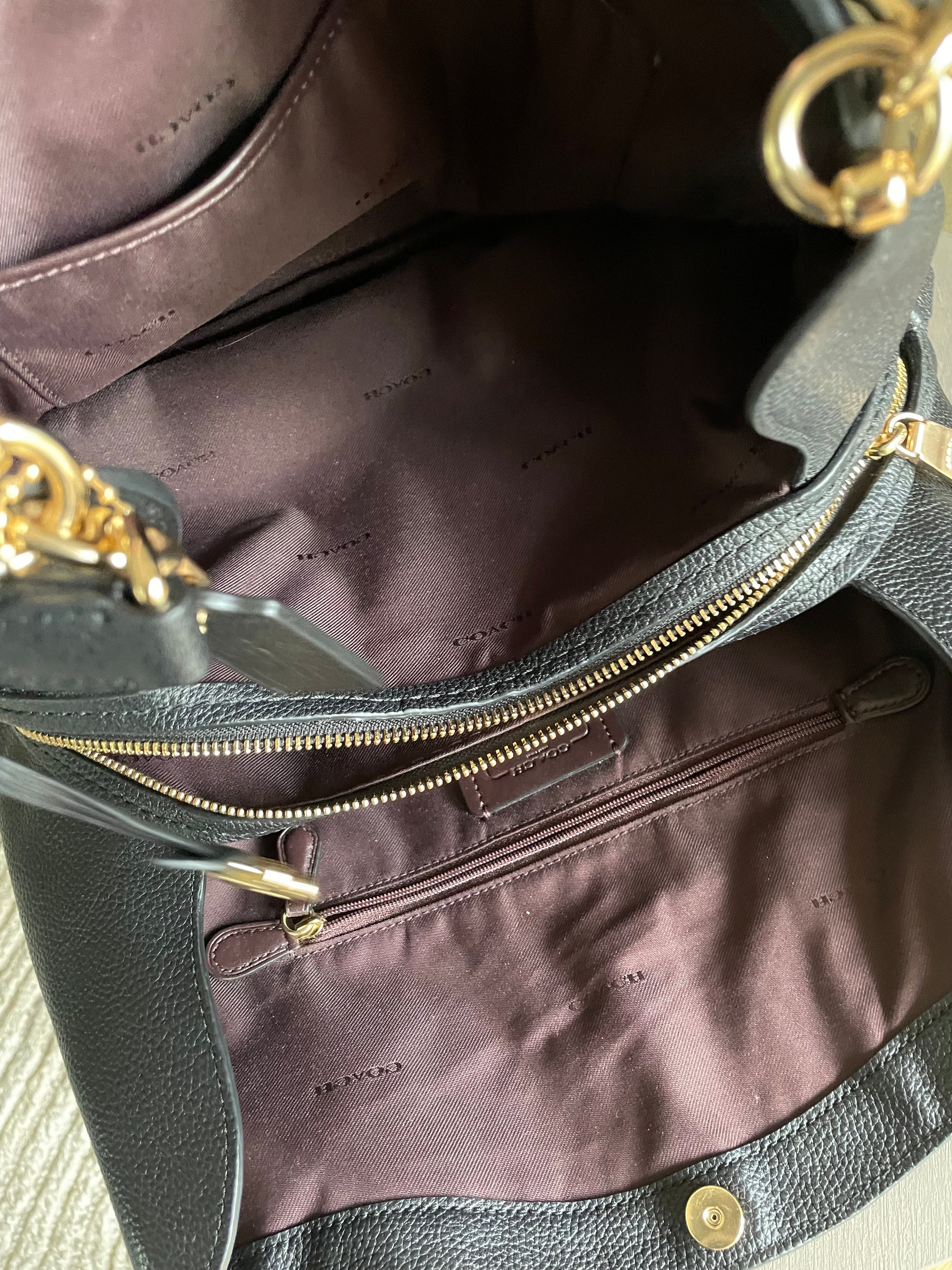 The Coach Dalton 28 is a soft, slouchy, timeless shoulder bag. The bag is made from grainy black leather and is the perfect everyday bag. crafted from polished pebble leather. The combination of black leather and light goldtone hardware work together perfectly. There is a decorative hanging tag. The bag is carried with two top handles. Inside there are two main compartments and a central secure zip close pocket.