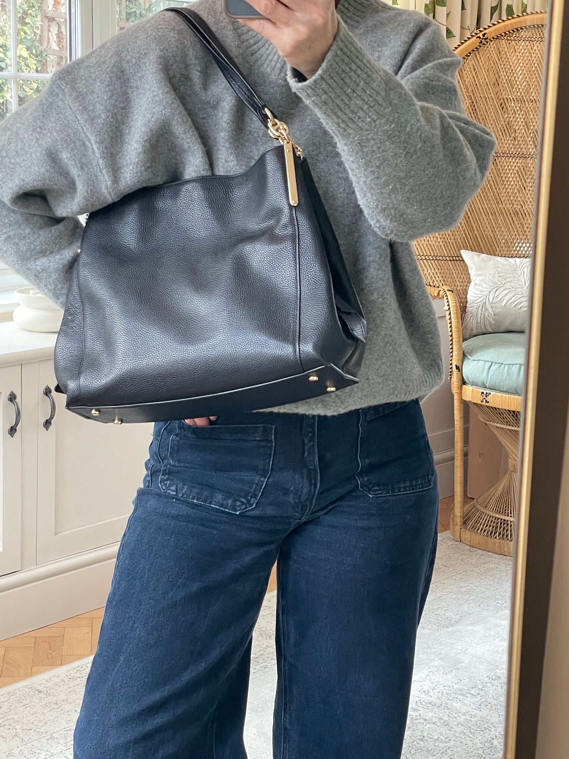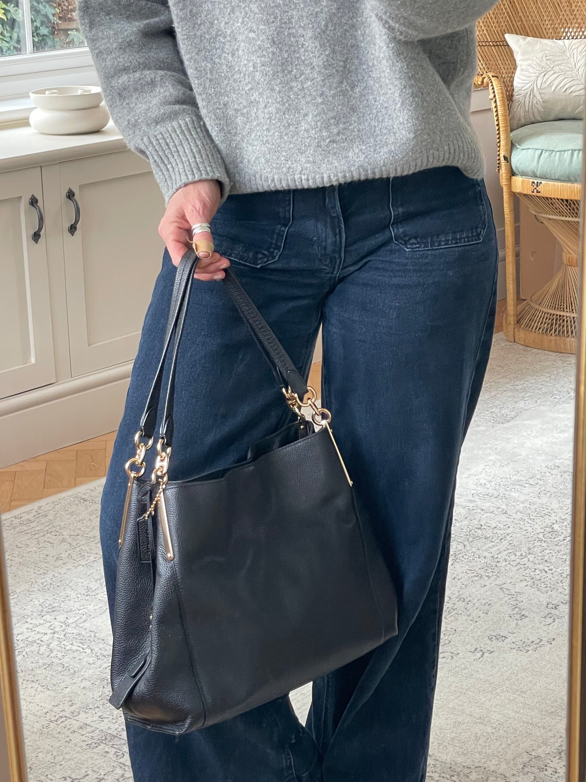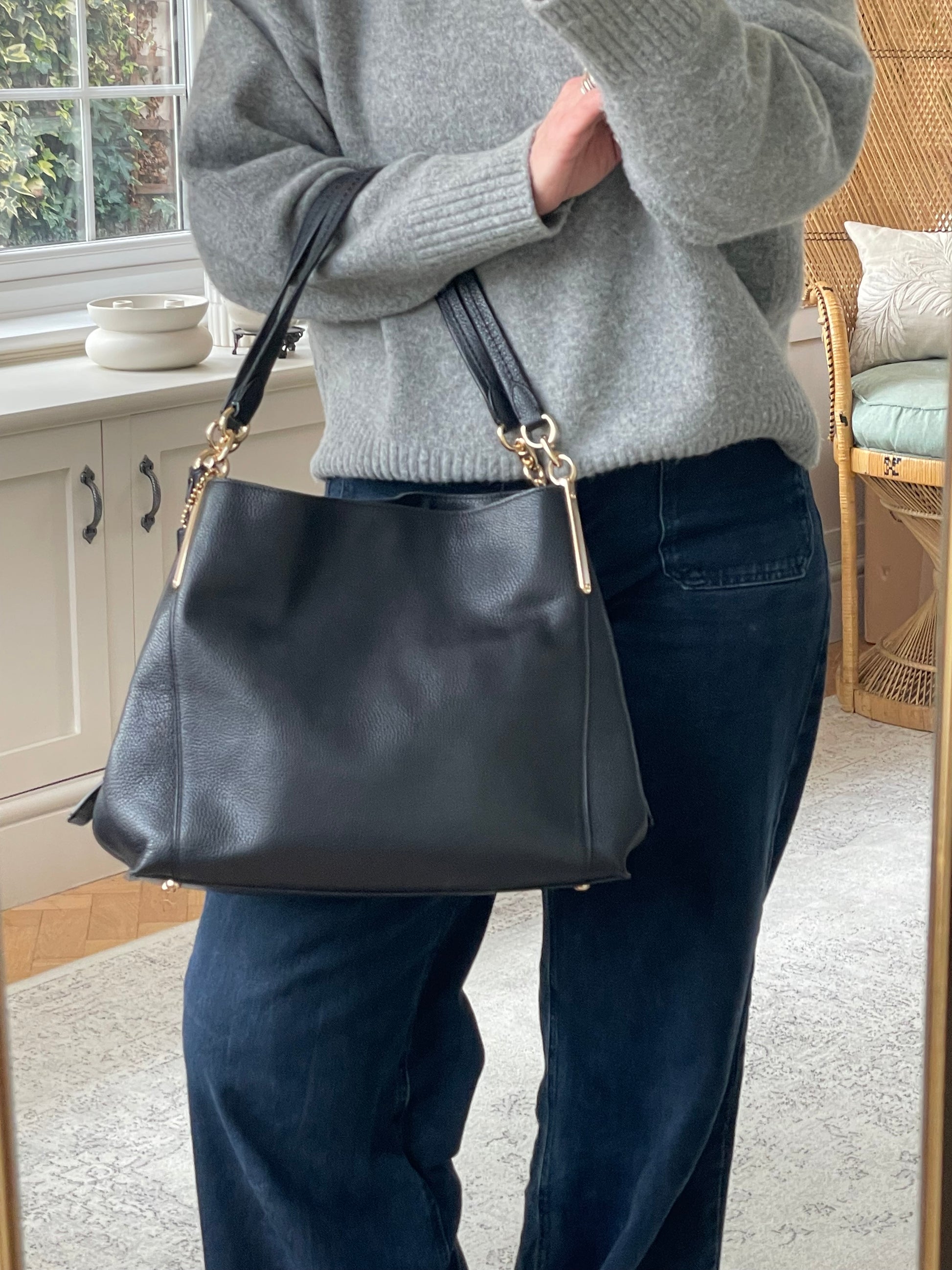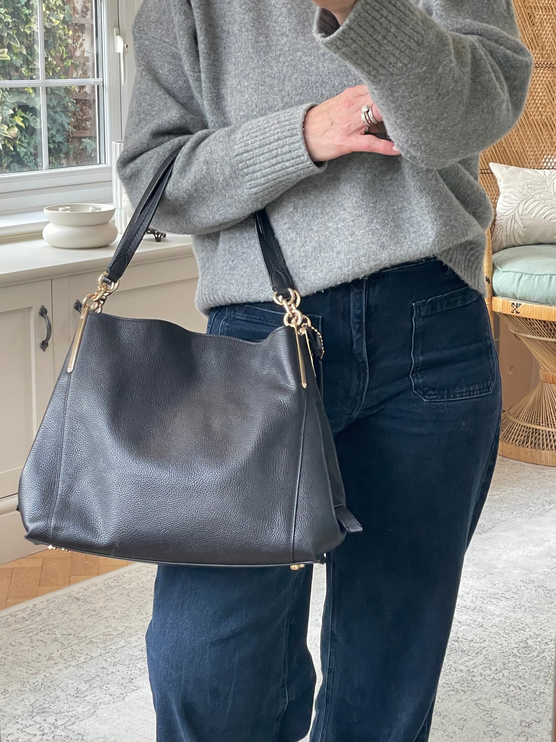 The Coach Dalton 28 is a soft, slouchy, timeless shoulder bag. The bag is made from grainy black leather and is the perfect everyday bag. crafted from polished pebble leather. The combination of black leather and light goldtone hardware work together perfectly. There is a decorative hanging tag. The bag is carried with two top handles. Inside there are two main compartments and a central secure zip close pocket.