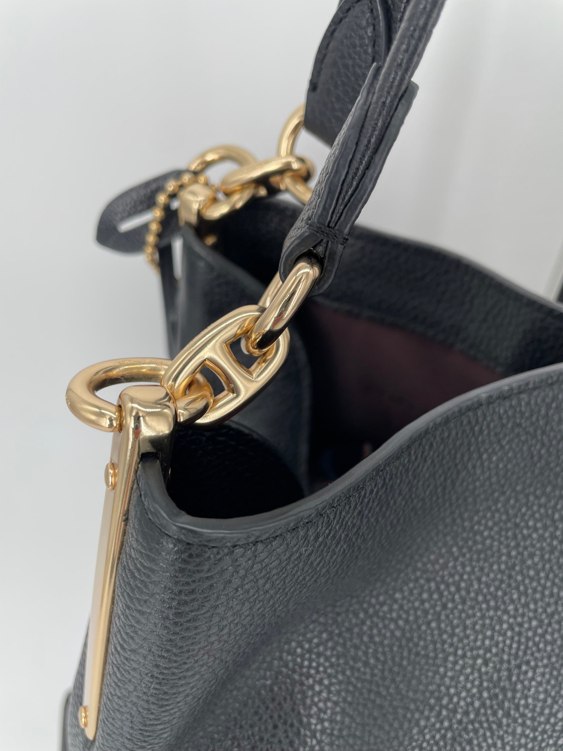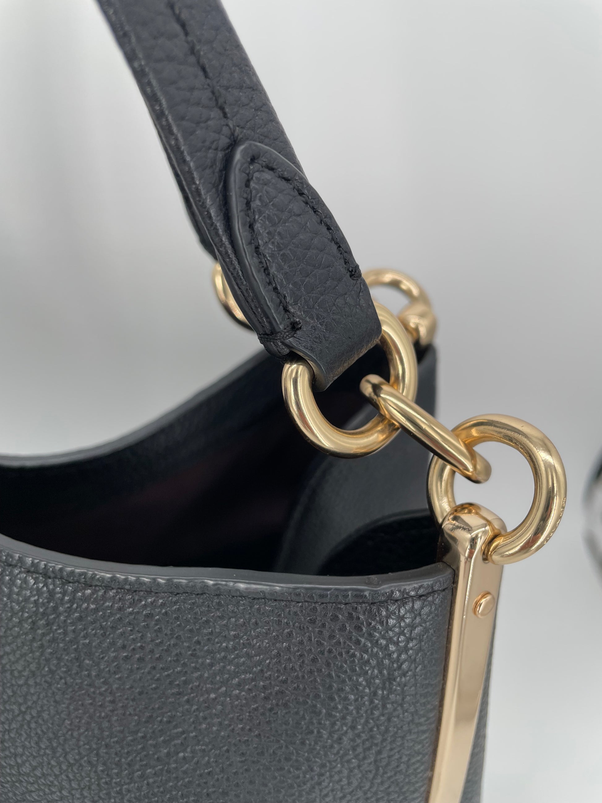 This is a really useful bag in fantastic condition. The leather shows little sign of use. The hardware is bright and shiny. Inside is clean and in great condition.