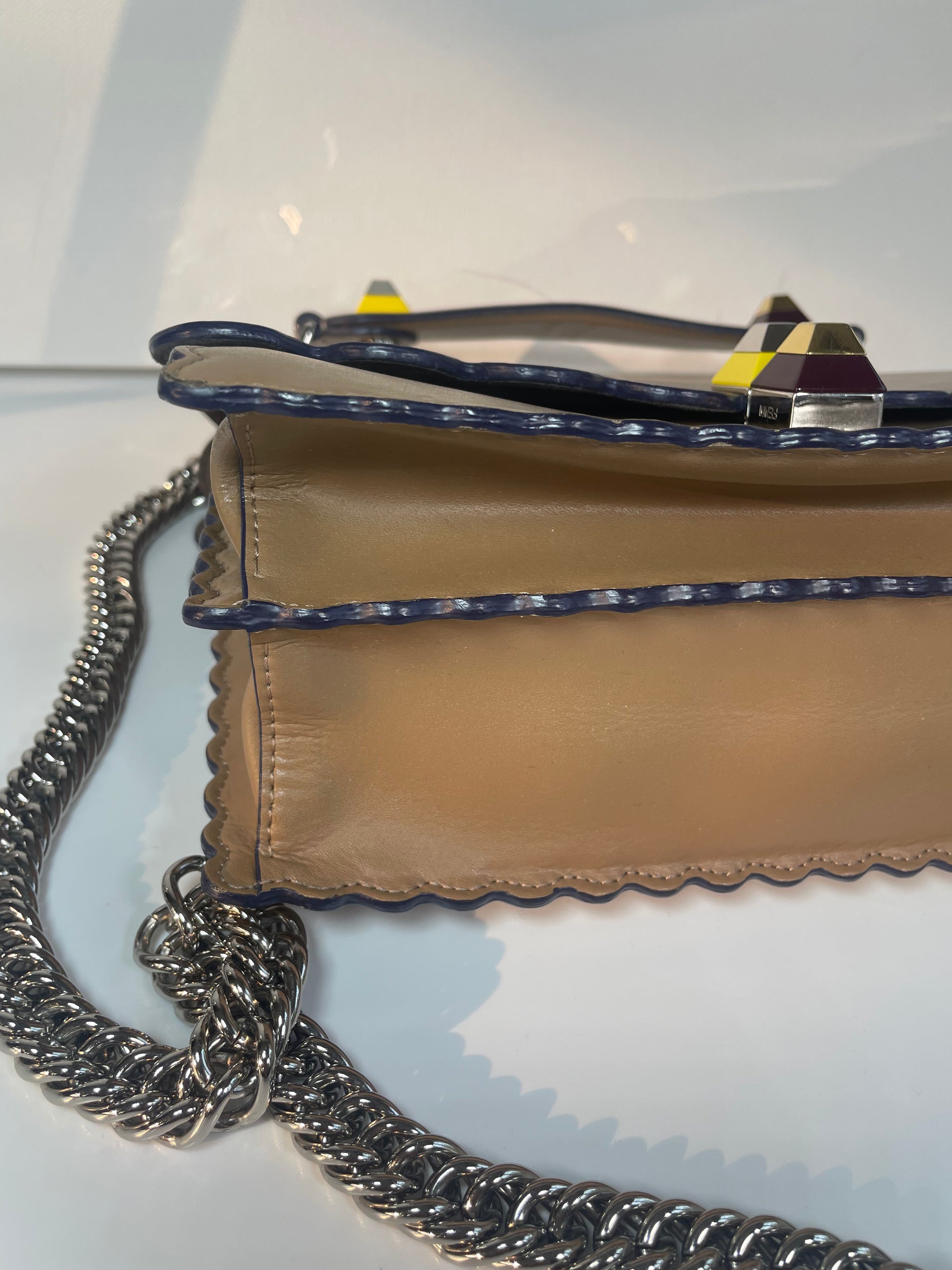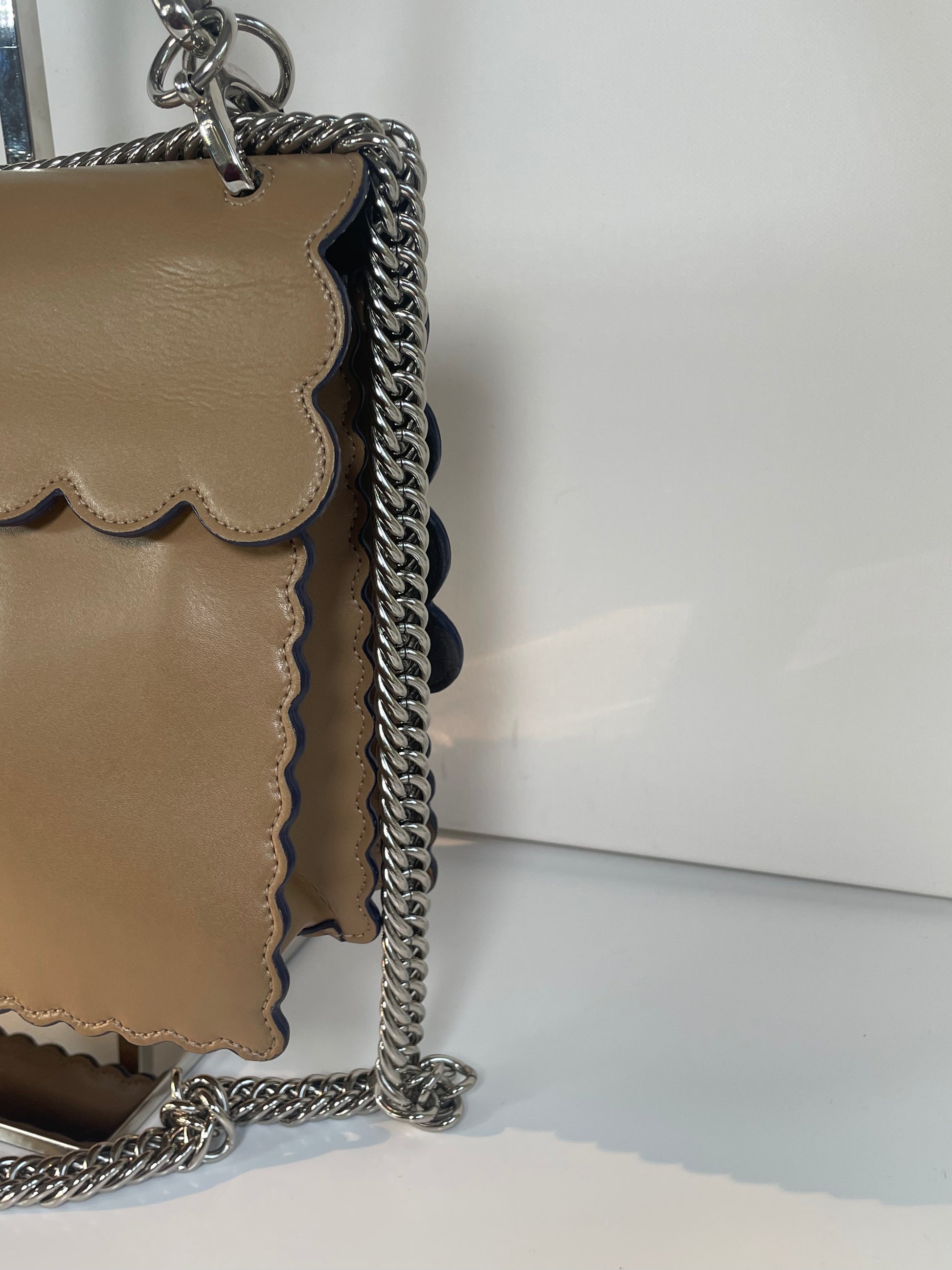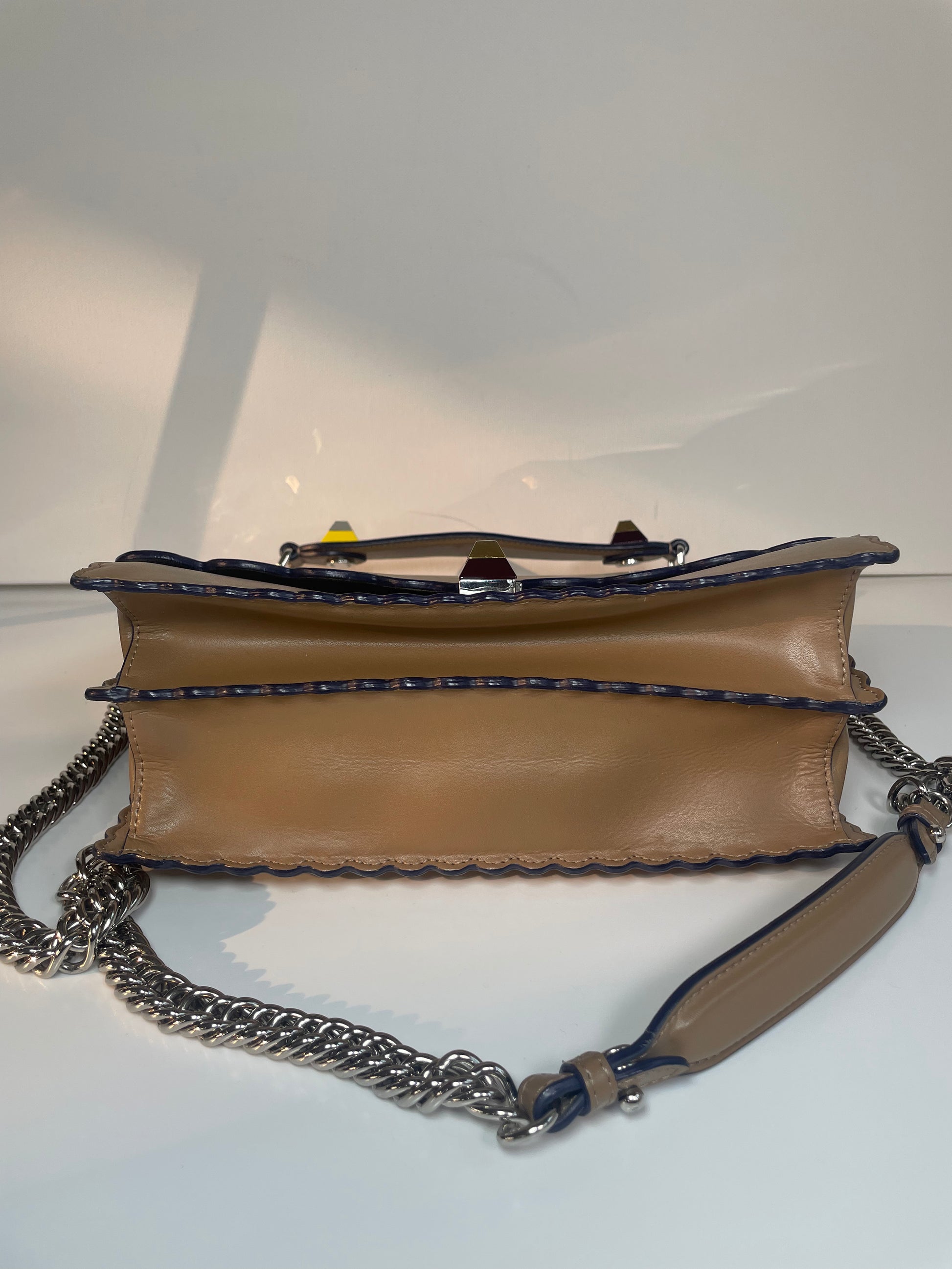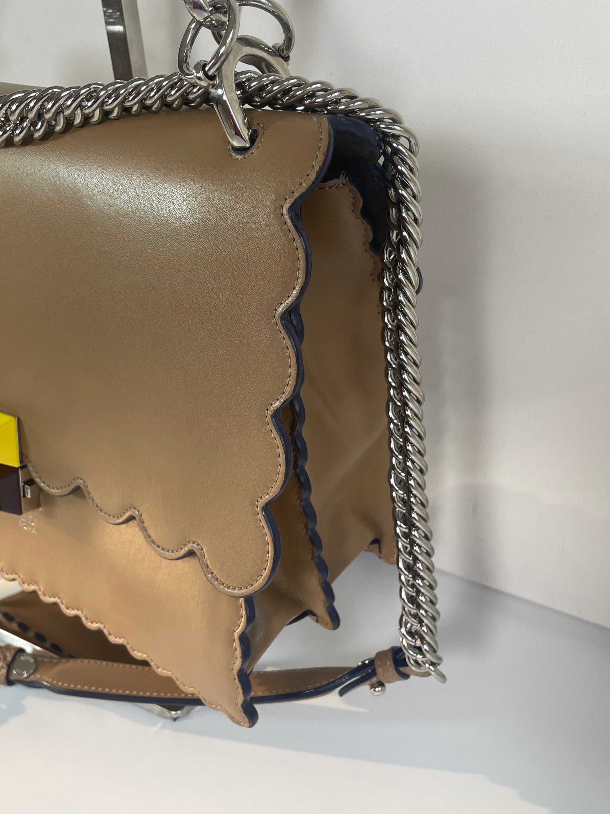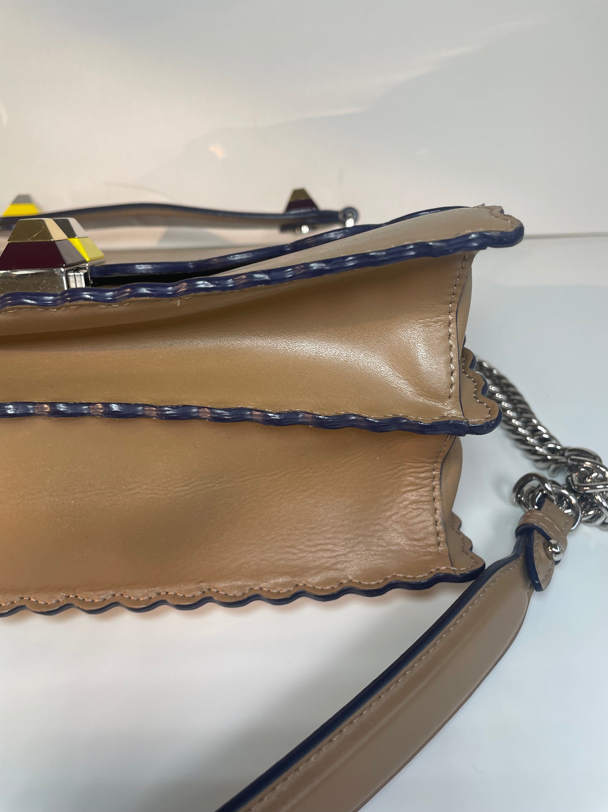 This is a gorgeous and playful Medium Fendi Kan I bag in sleek, deep beige with contrasting Blue Inking. This bag is crafted from smooth calfskin with scalloped edges and a push-clasp closure with contrasting pops of colour. The bag has a sliding chain strap and leather top handle again with the playful pops of colour. The flap opening, opens to a spacious interior with two compartments and a back wall open slip pockets. This is a bag that takes you