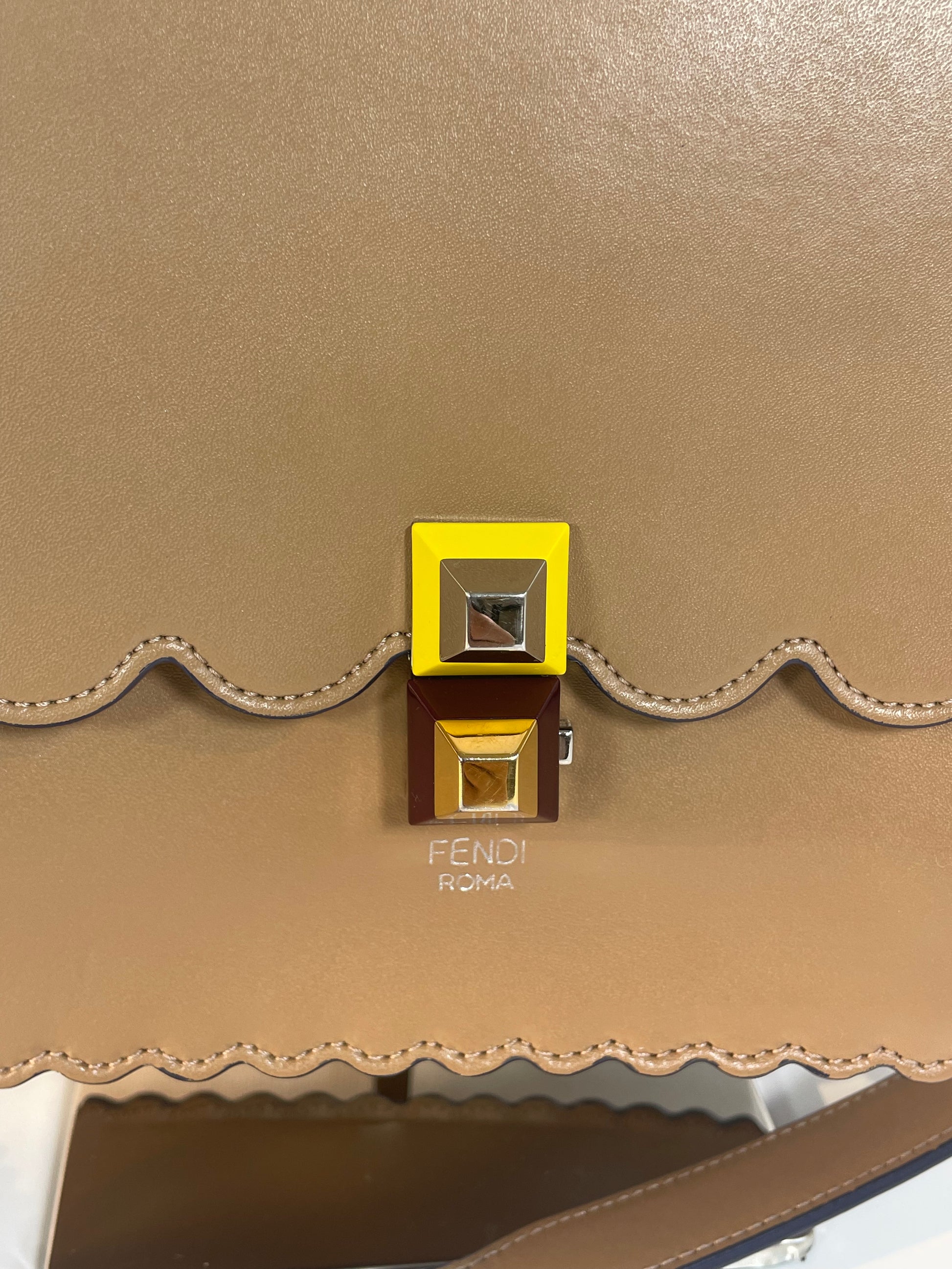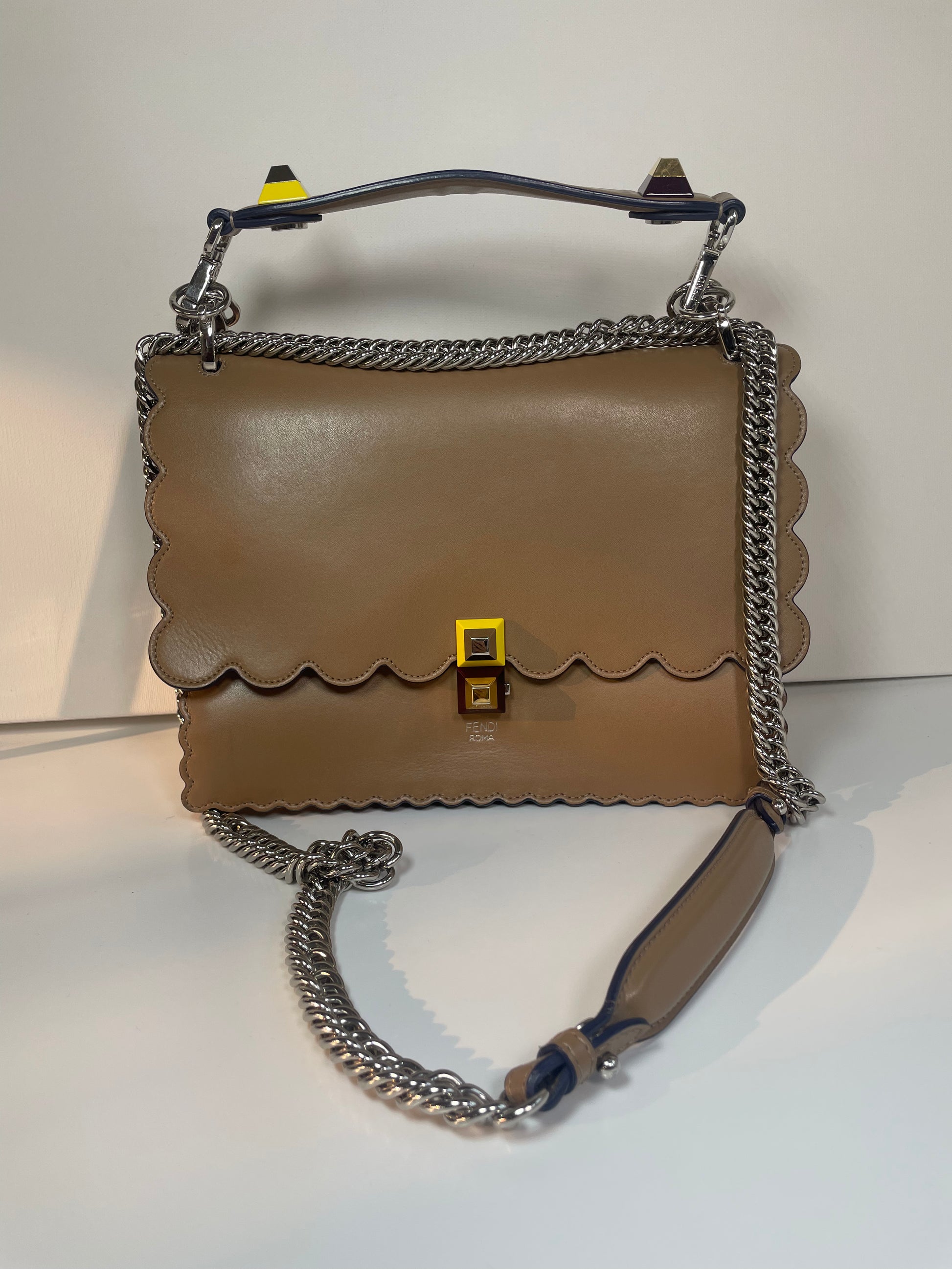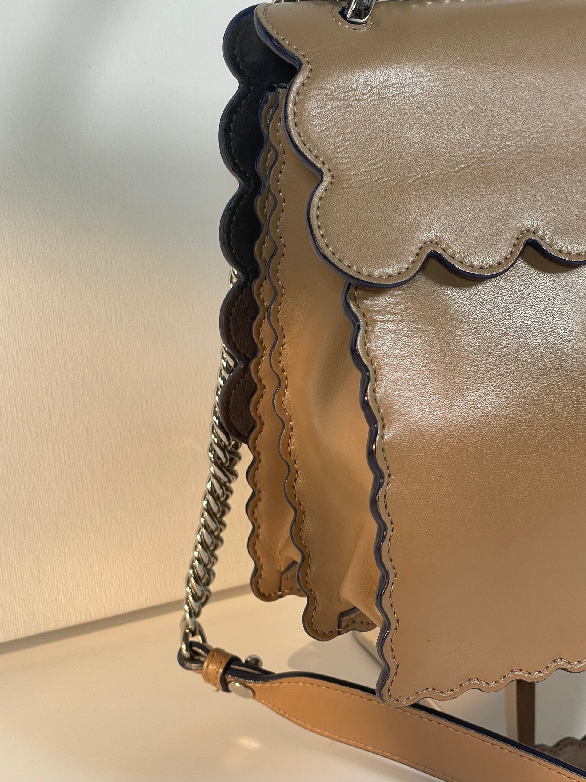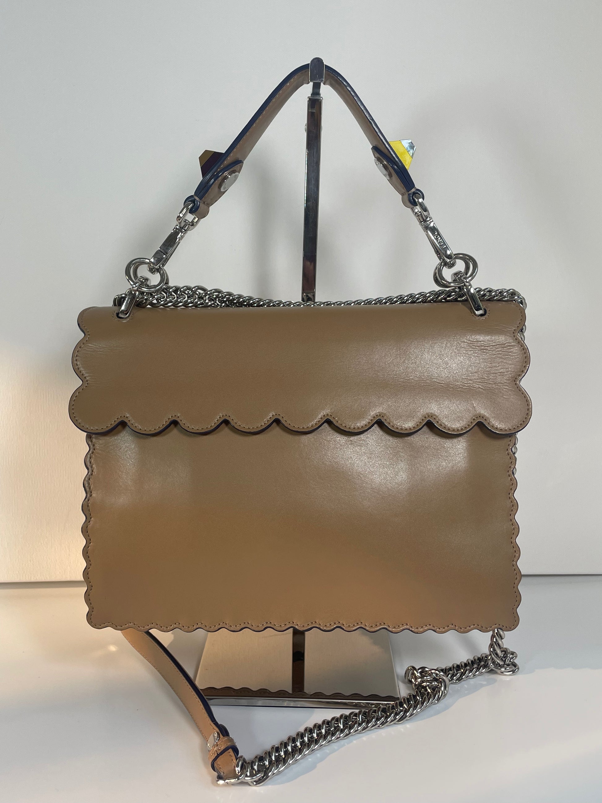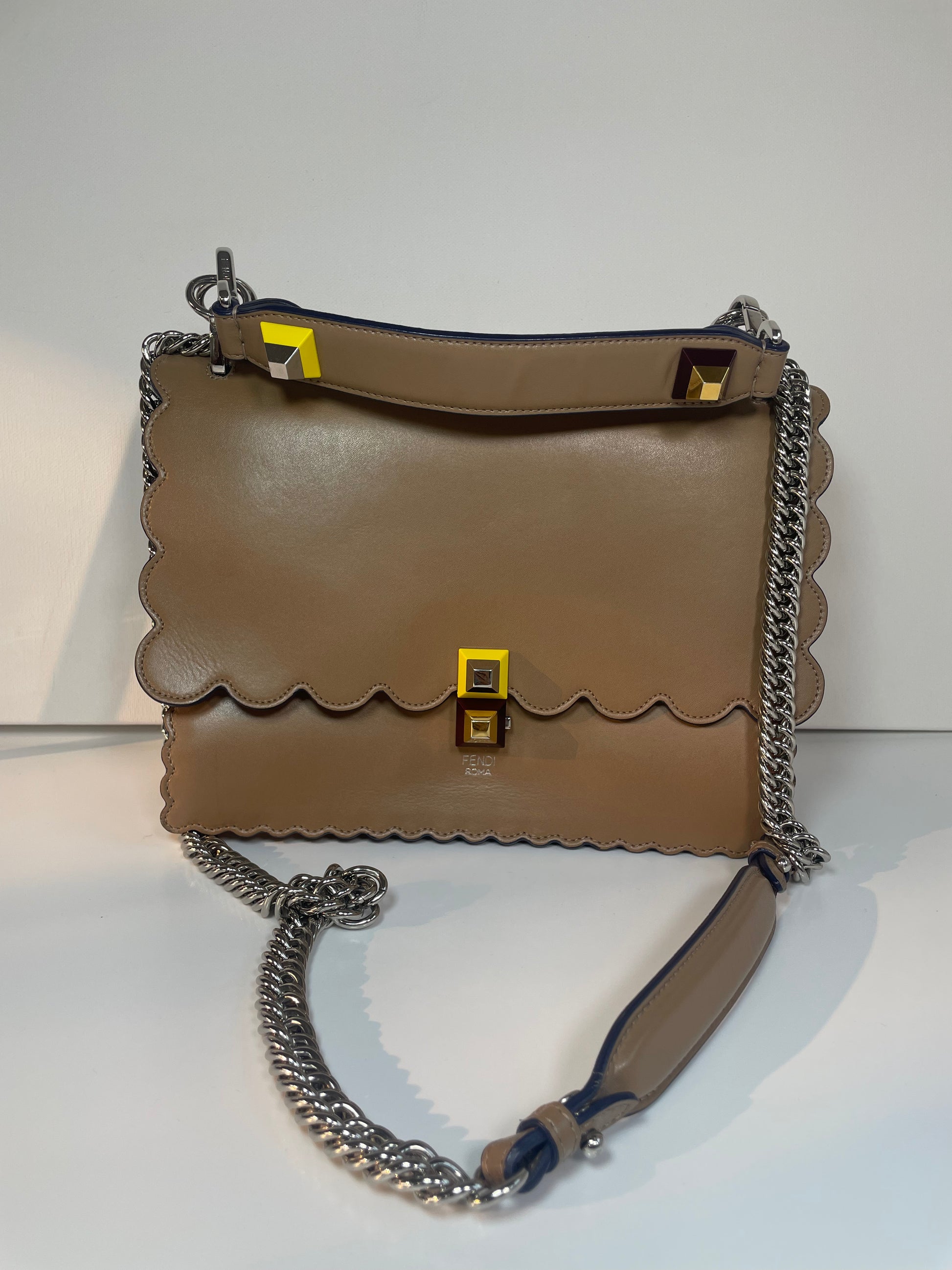 This is a gorgeous and playful Medium Fendi Kan I bag in sleek, deep beige with contrasting Blue Inking. This bag is crafted from smooth calfskin with scalloped edges and a push-clasp closure with contrasting pops of colour. The bag has a sliding chain strap and leather top handle again with the playful pops of colour. The flap opening, opens to a spacious interior with two compartments and a back wall open slip pockets. This is a bag that takes you