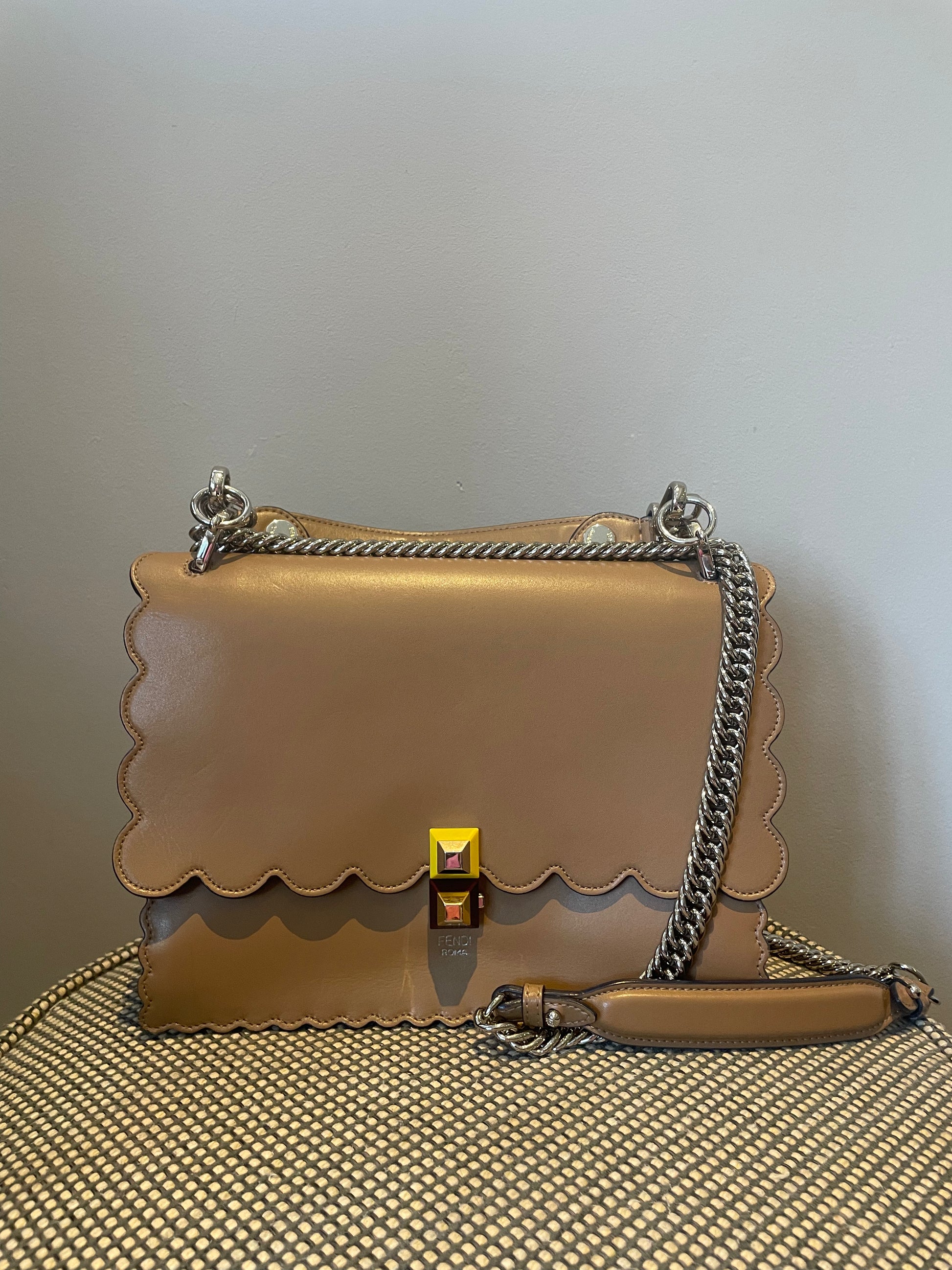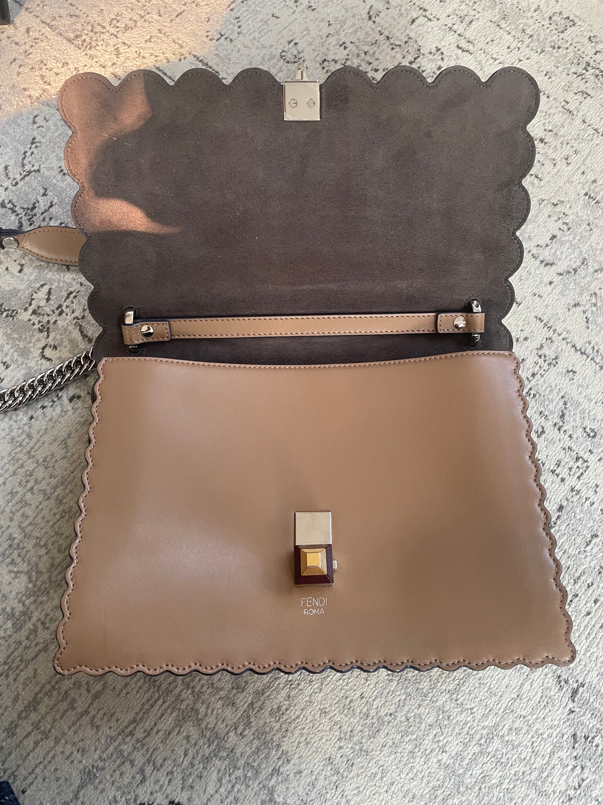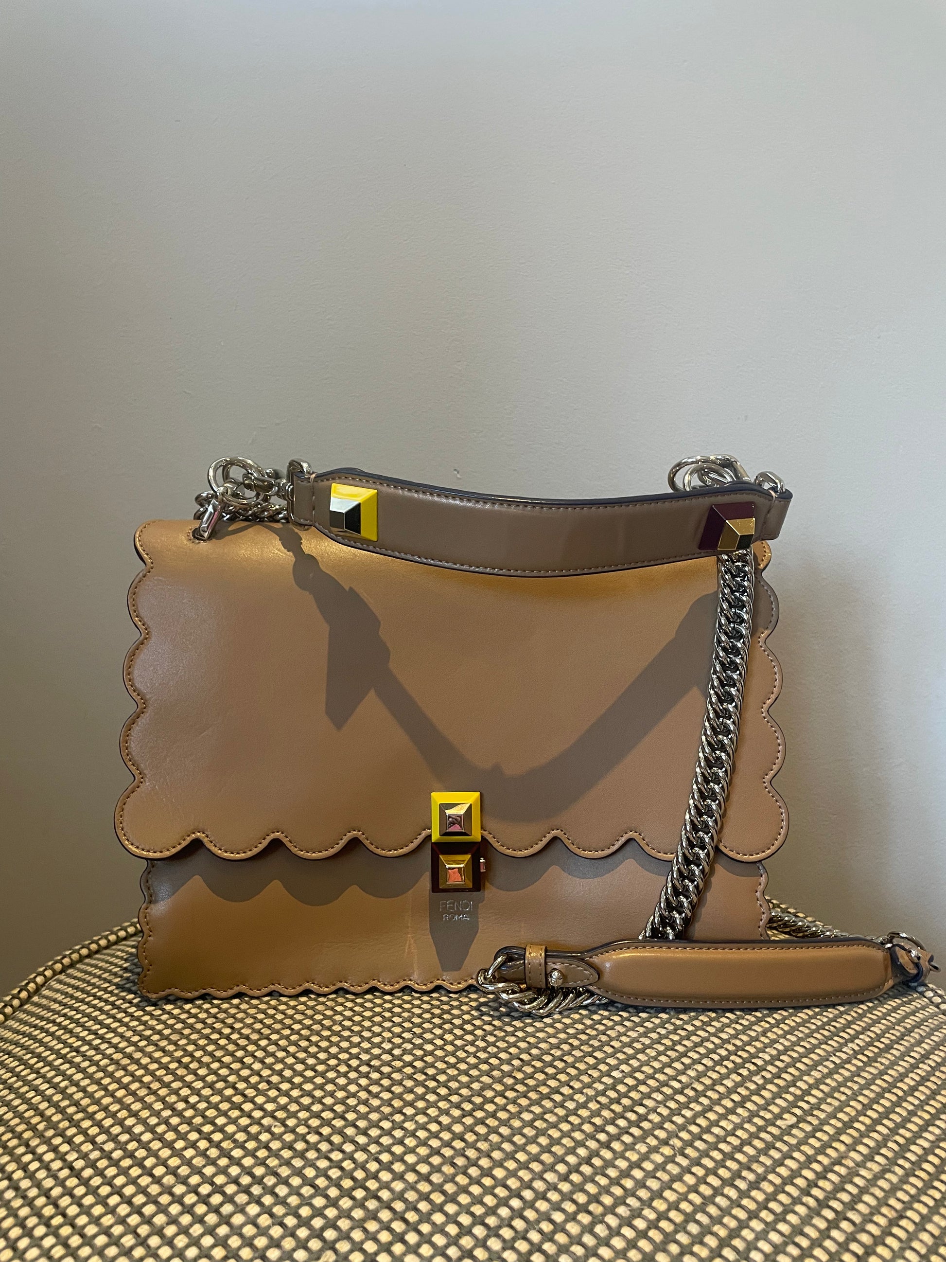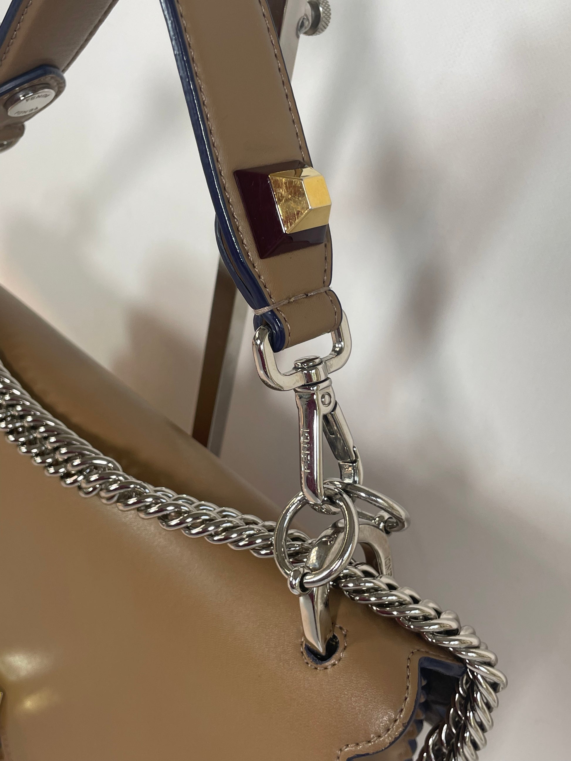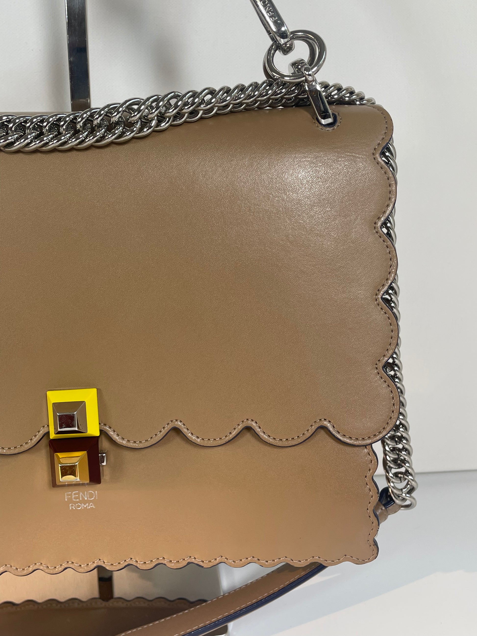 This is a gorgeous and playful Medium Fendi Kan I bag in sleek, deep beige with contrasting Blue Inking. This bag is crafted from smooth calfskin with scalloped edges and a push-clasp closure with contrasting pops of colour. The bag has a sliding chain strap and leather top handle again with the playful pops of colour. The flap opening, opens to a spacious interior with two compartments and a back wall open slip pockets. This is a bag that takes you