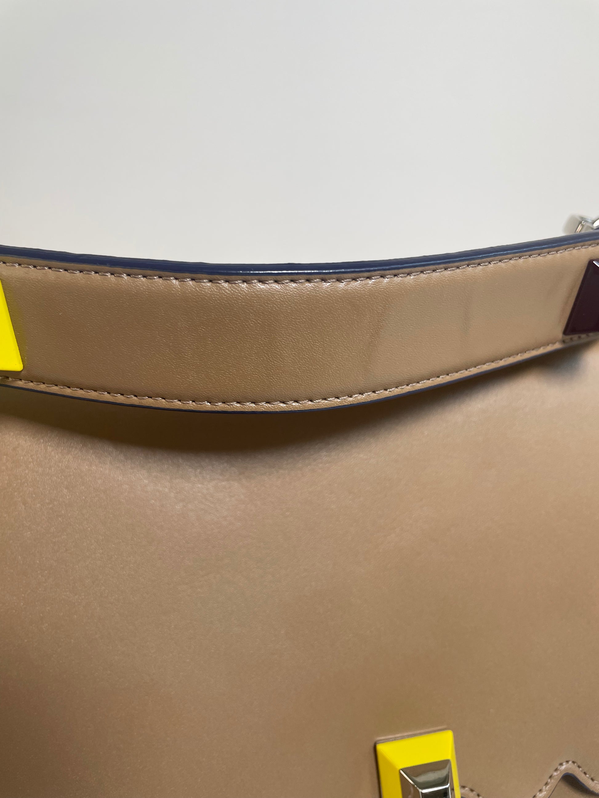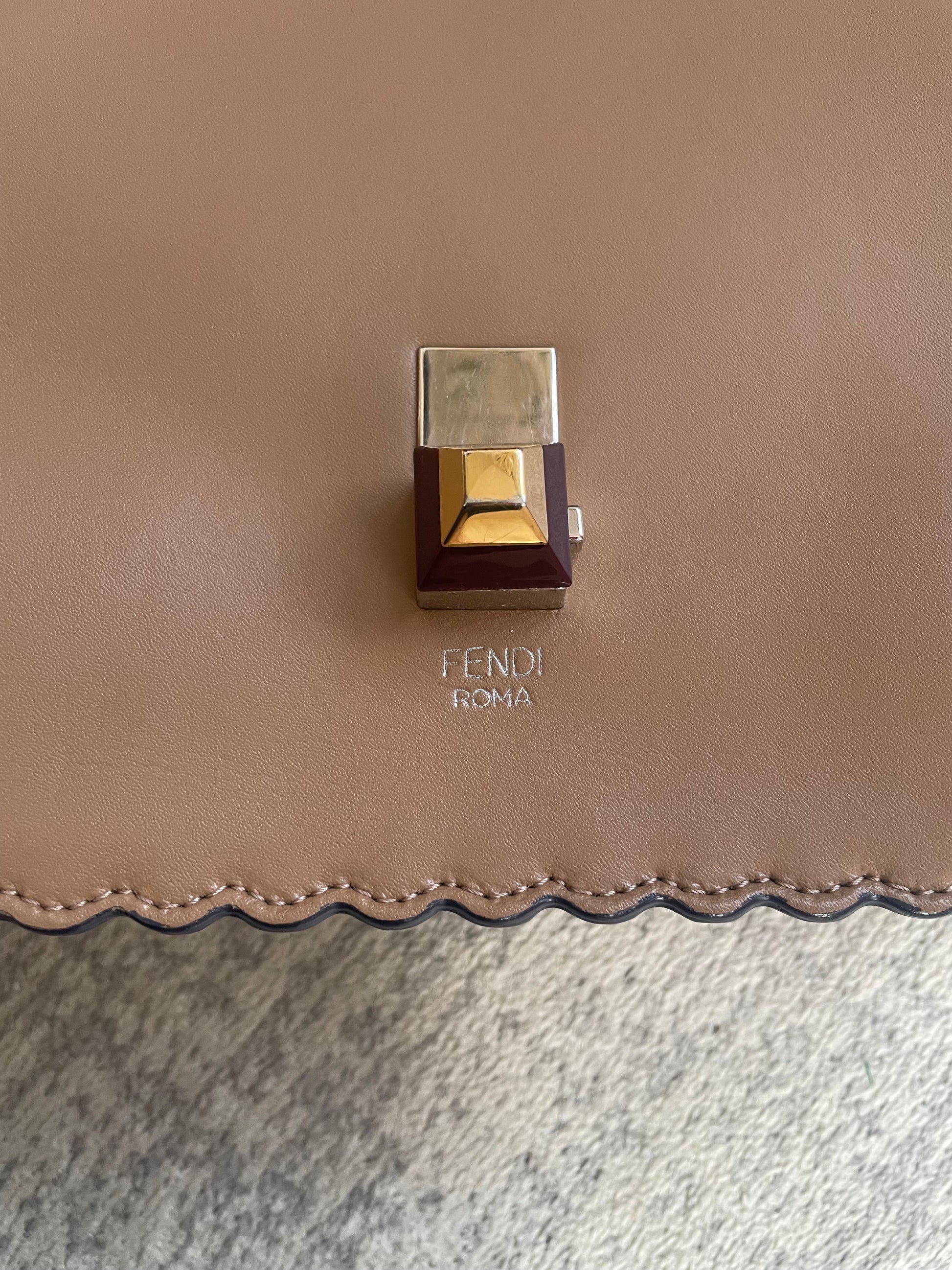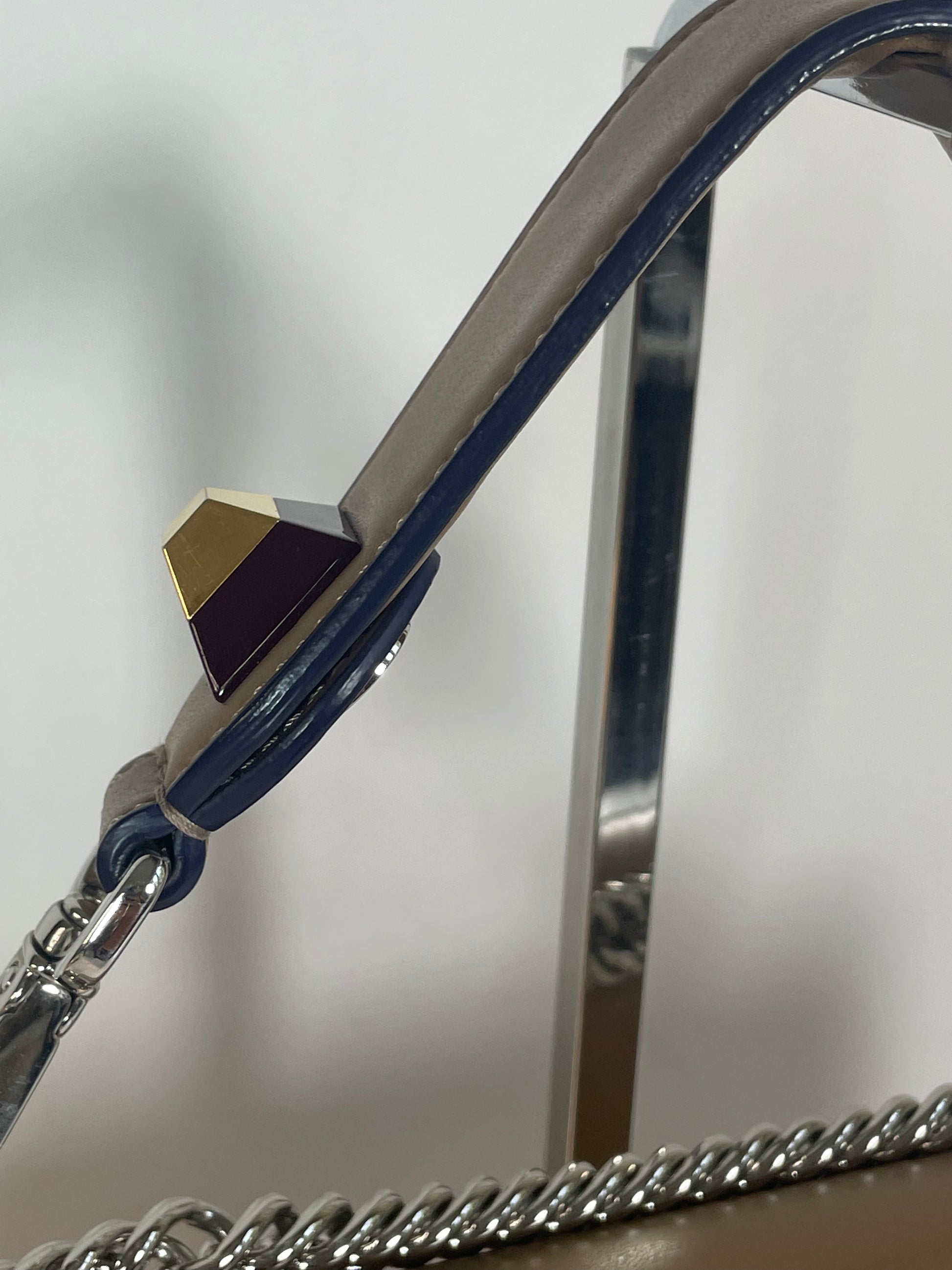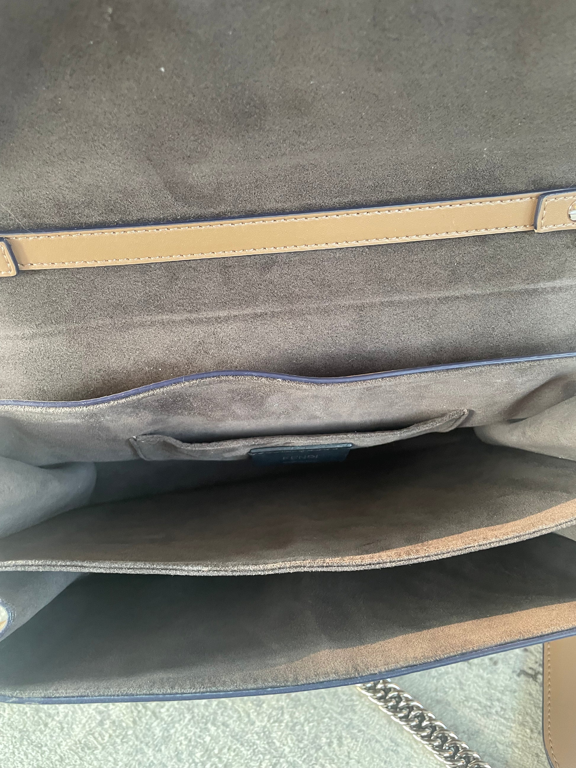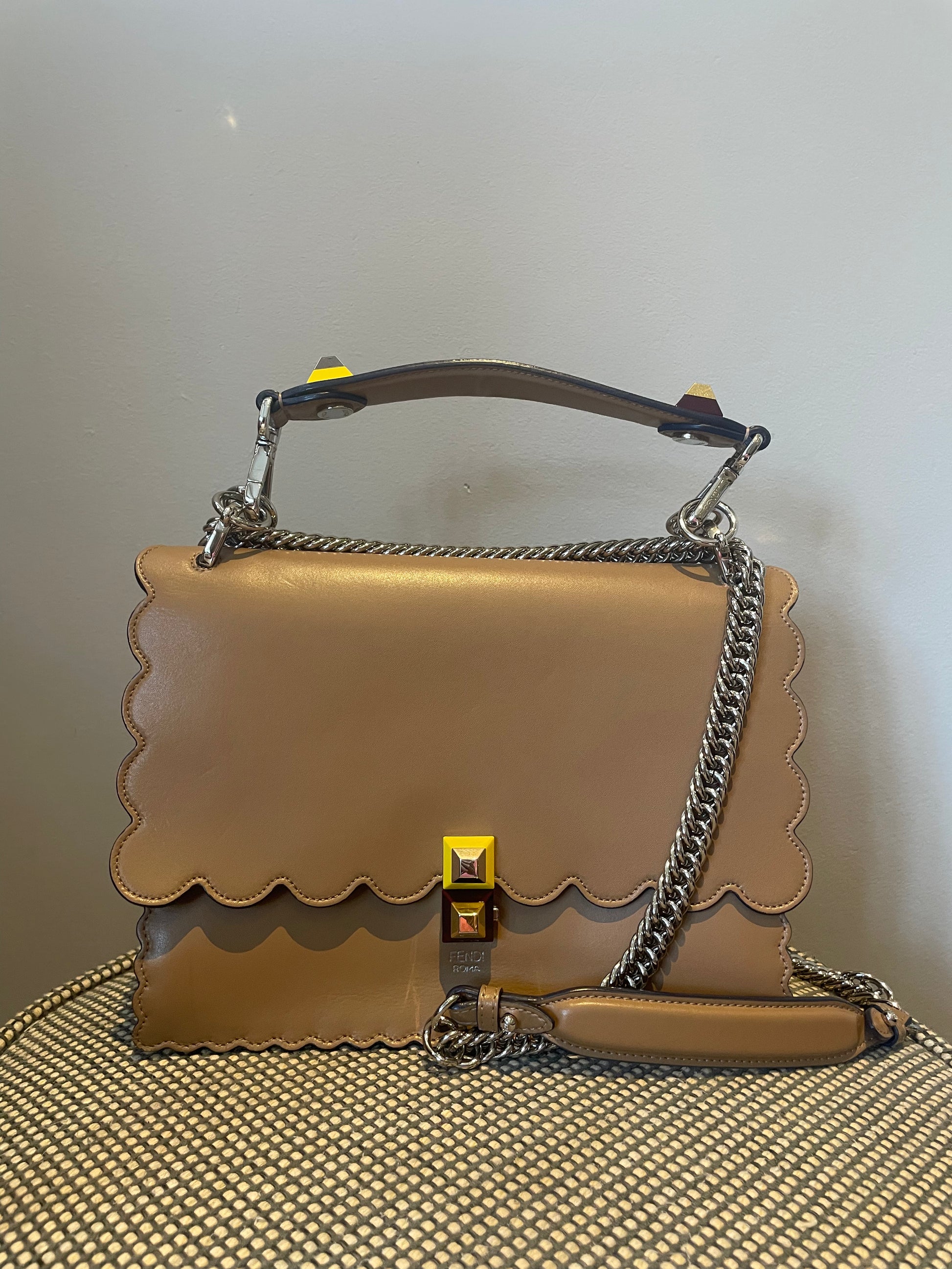 This is a gorgeous and playful Medium Fendi Kan I bag in sleek, deep beige with contrasting Blue Inking. This bag is crafted from smooth calfskin with scalloped edges and a push-clasp closure with contrasting pops of colour. The bag has a sliding chain strap and leather top handle again with the playful pops of colour. The flap opening, opens to a spacious interior with two compartments and a back wall open slip pockets. This is a bag that takes you