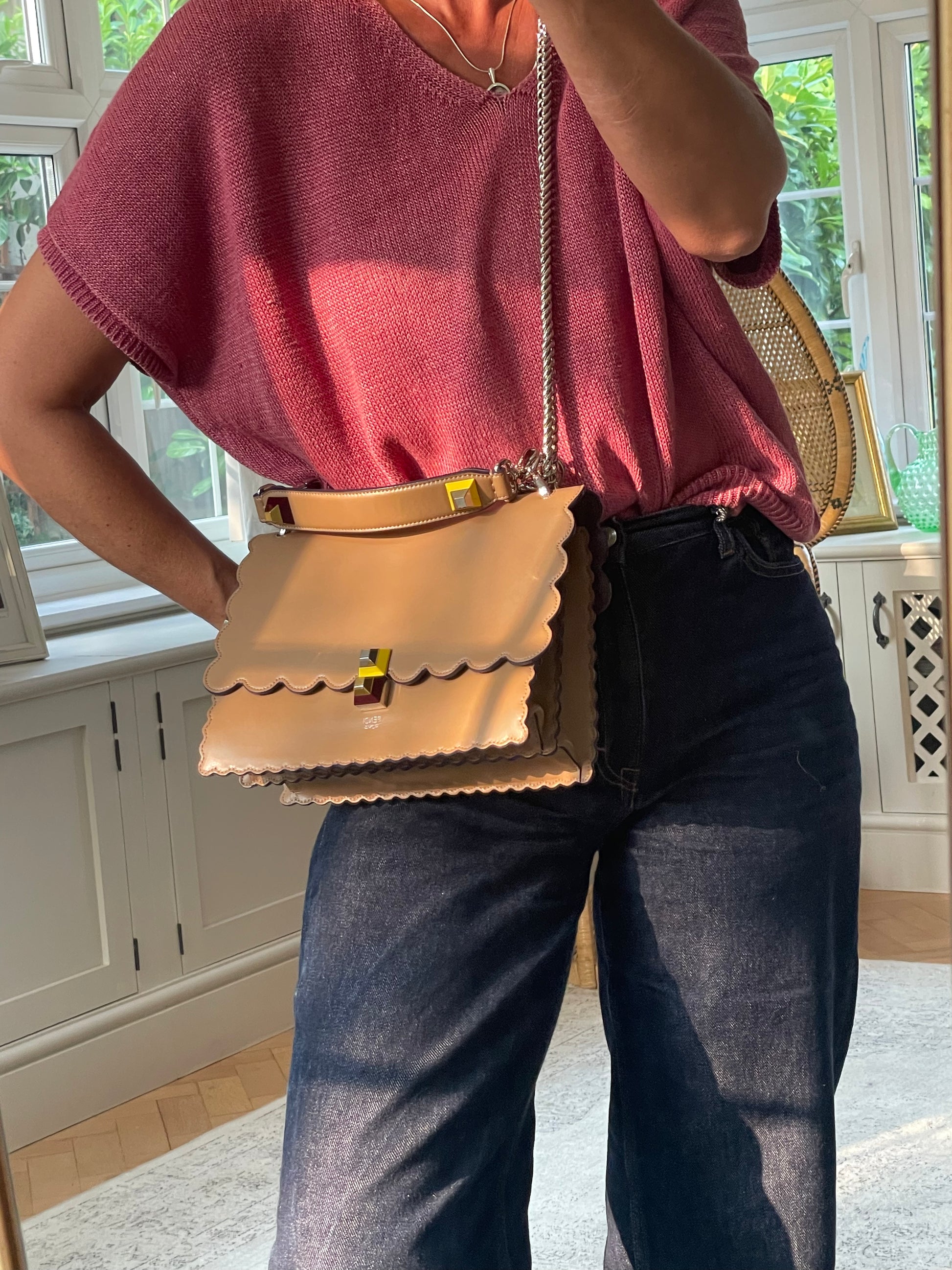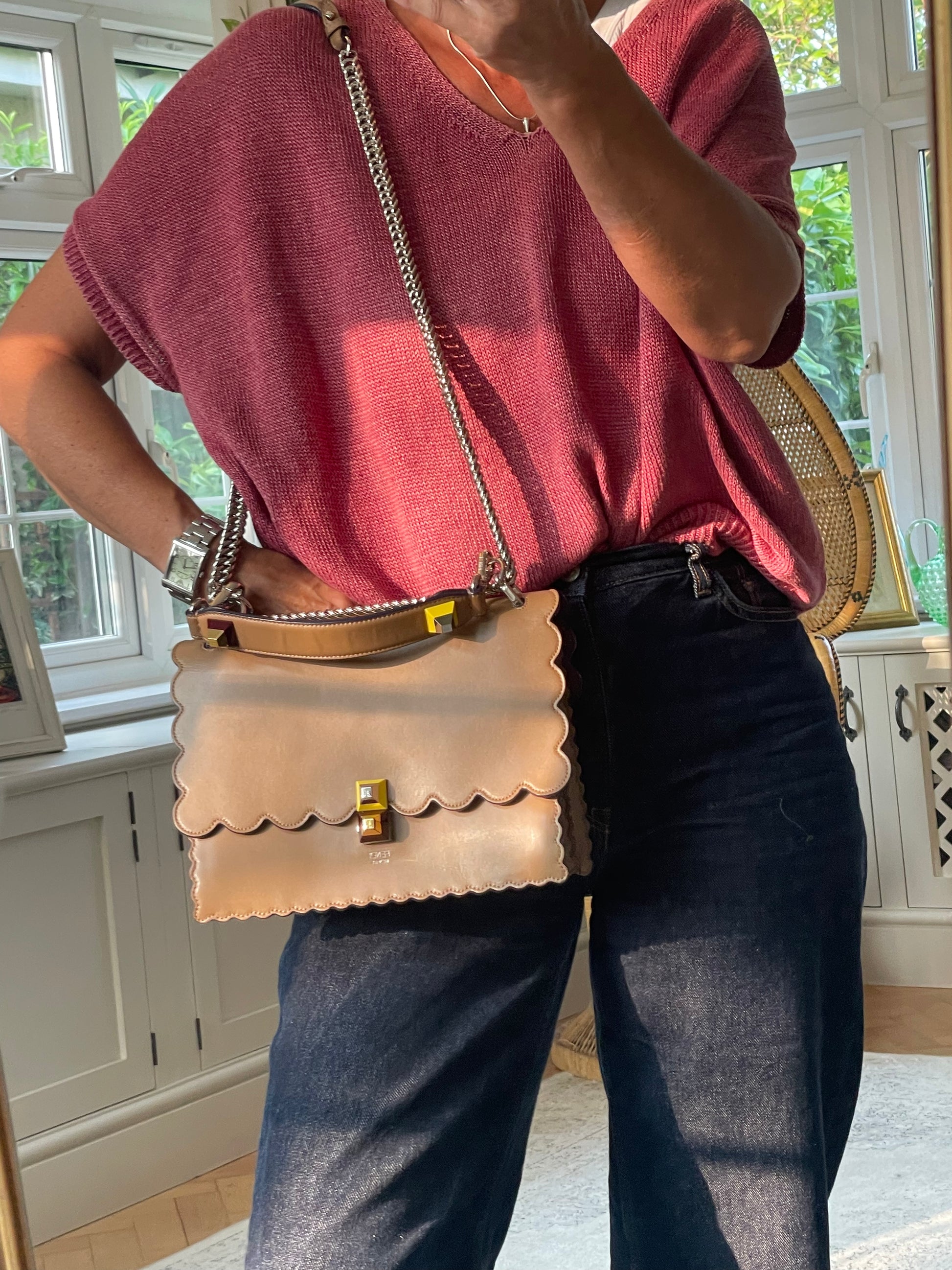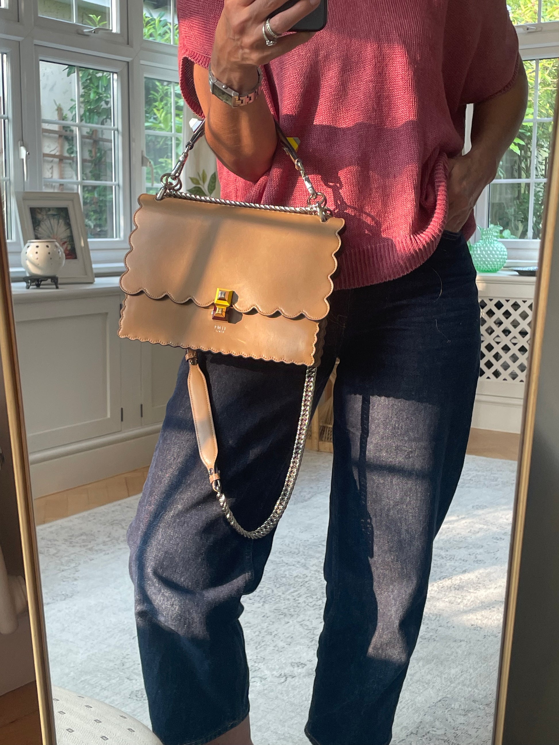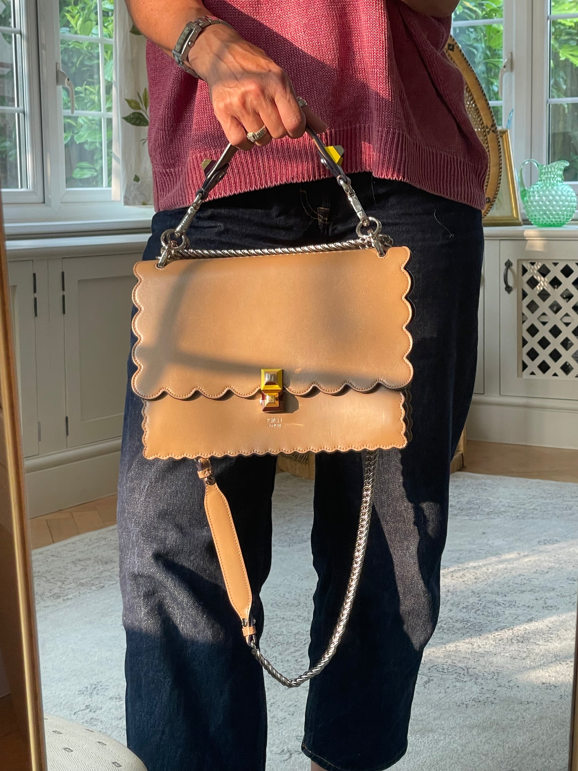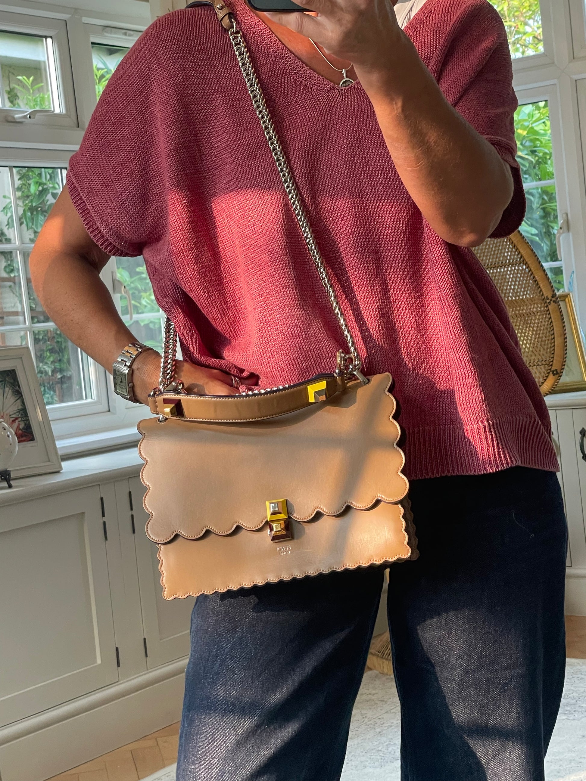 This is a gorgeous and playful Medium Fendi Kan I bag in sleek, deep beige with contrasting Blue Inking. This bag is crafted from smooth calfskin with scalloped edges and a push-clasp closure with contrasting pops of colour. The bag has a sliding chain strap and leather top handle again with the playful pops of colour. The flap opening, opens to a spacious interior with two compartments and a back wall open slip pockets. This is a bag that takes you
