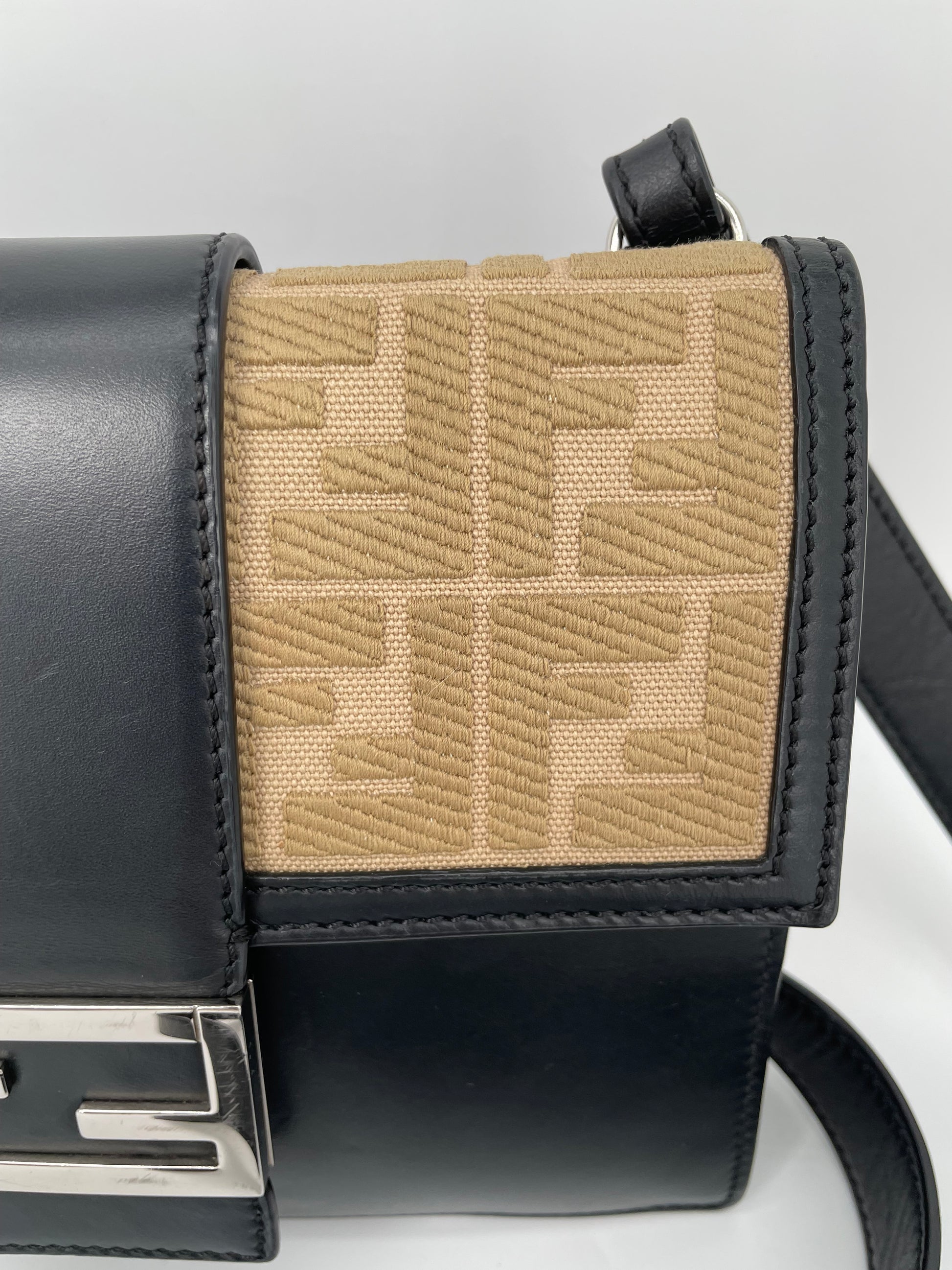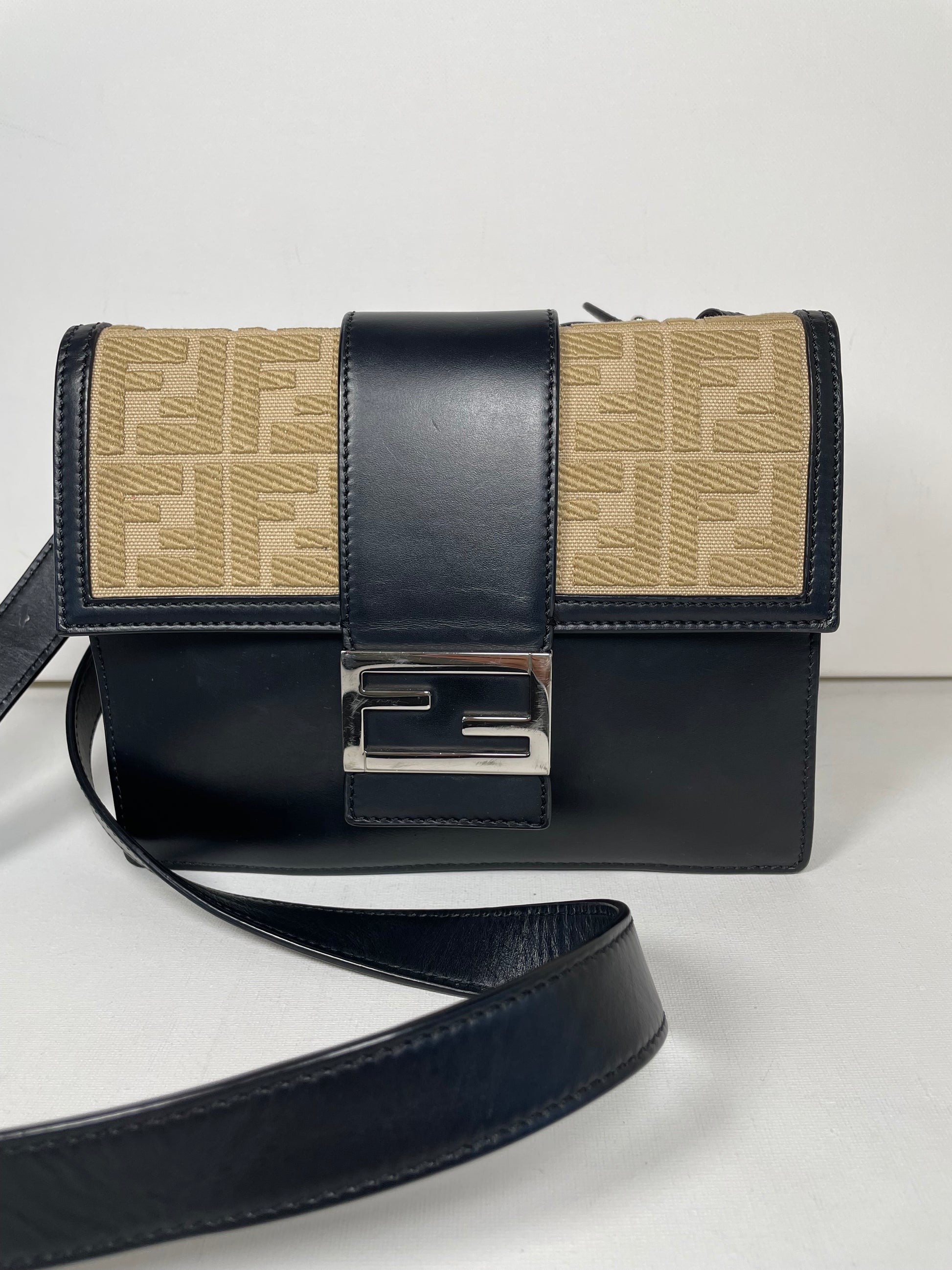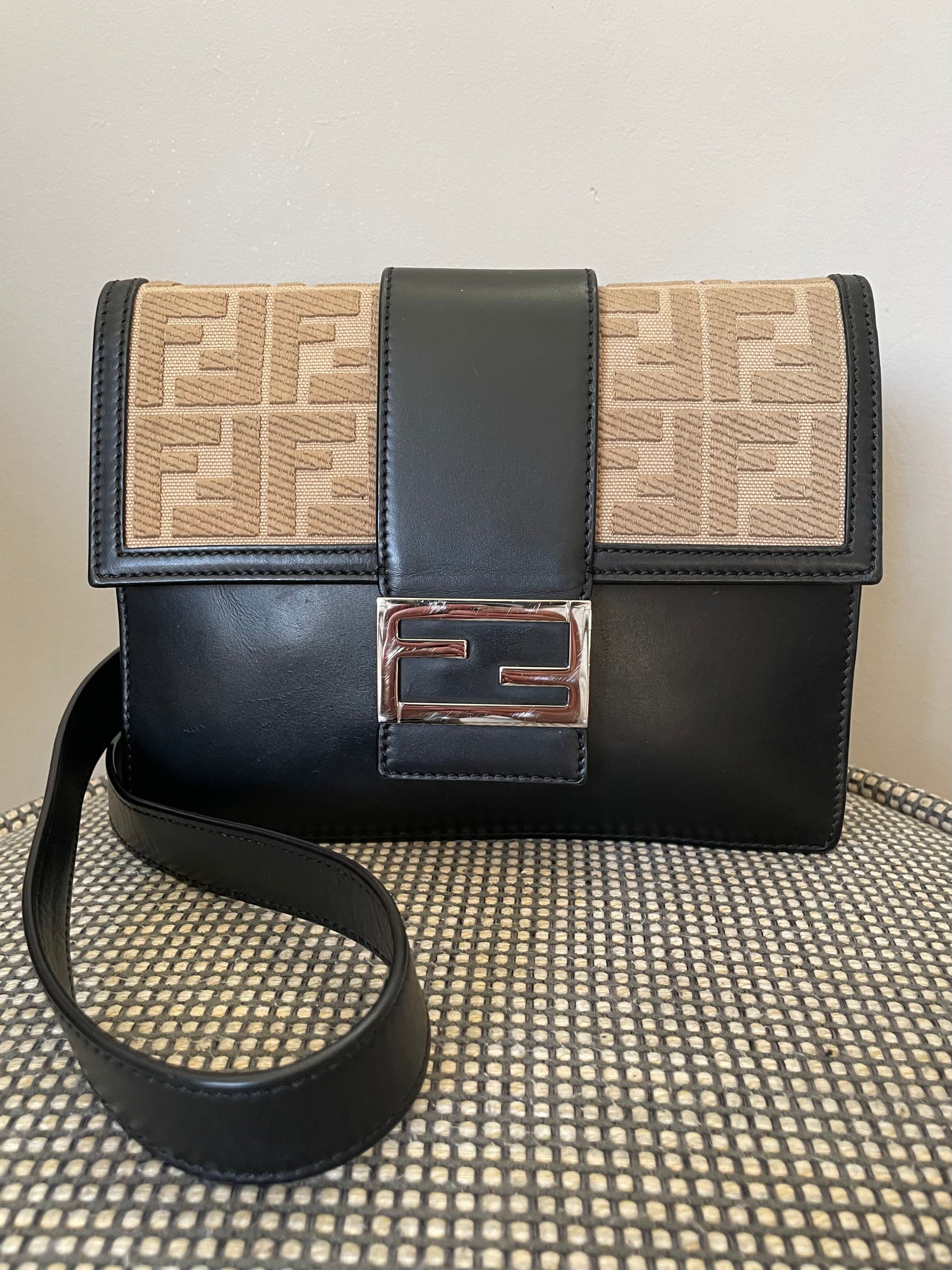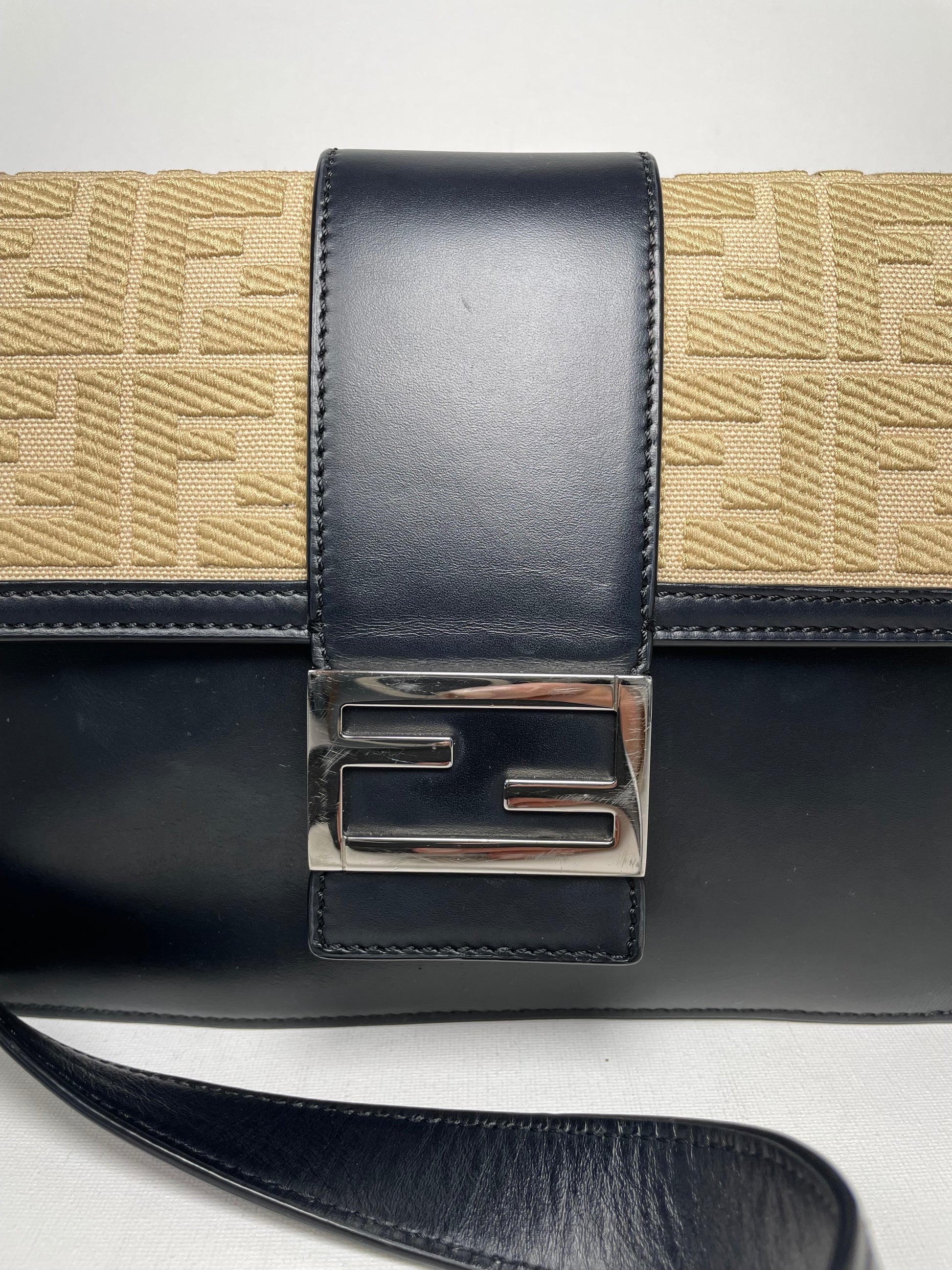 This is a beautiful Fendi Zucca Flat Baguette Crossbody Bag. This bag is made from a combination of leather and canvas, the front flap opening is secured with a magnetic fastener. The combination of soft tan canvas with the raised FF logo and the sleek black leather works perfectly together and creates a versatile bag. Inside there is a main compartment and back slip pocket and is perfect for carrying your essentials.
