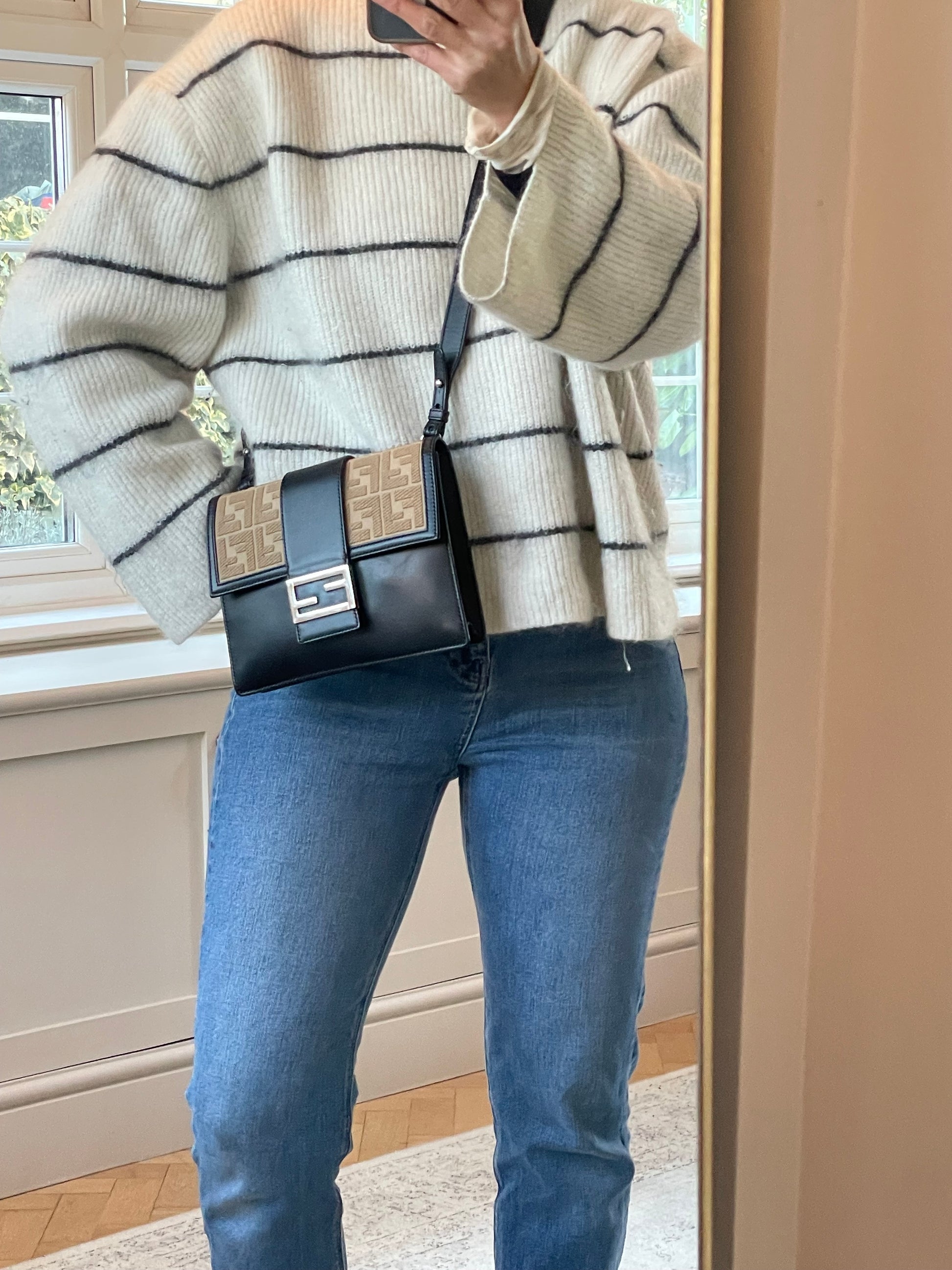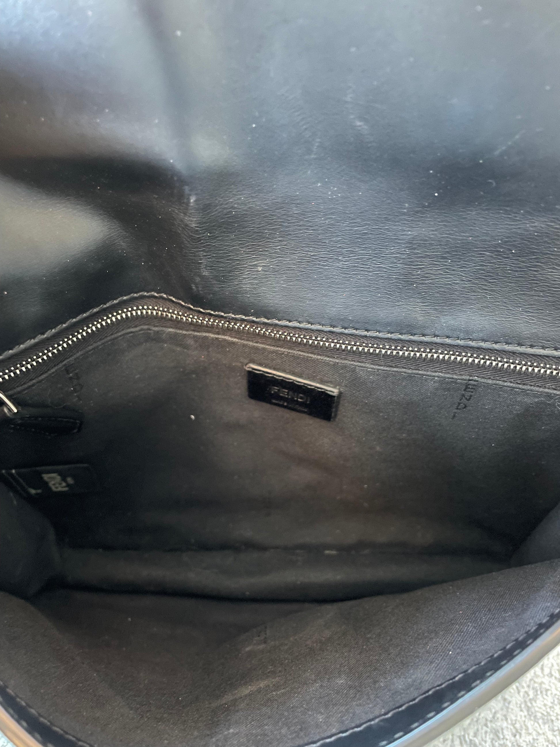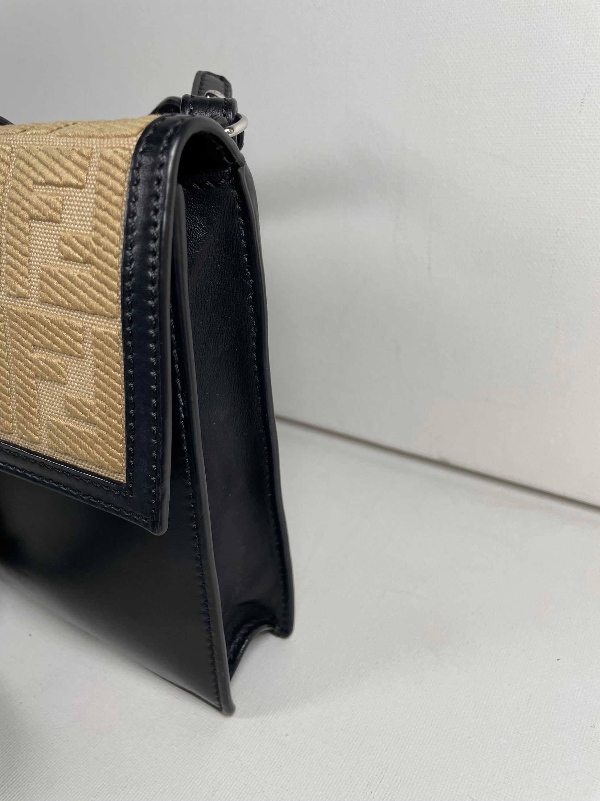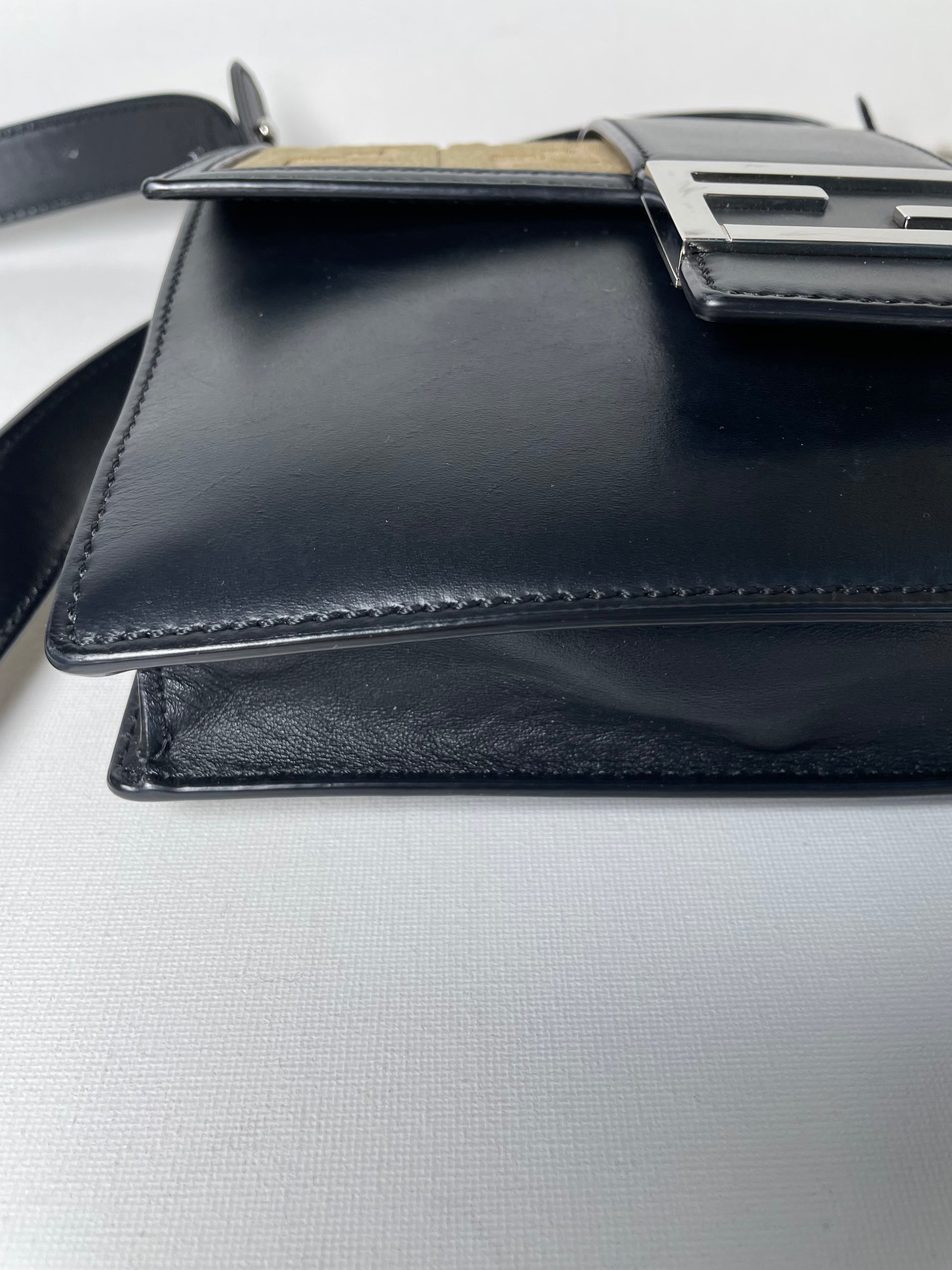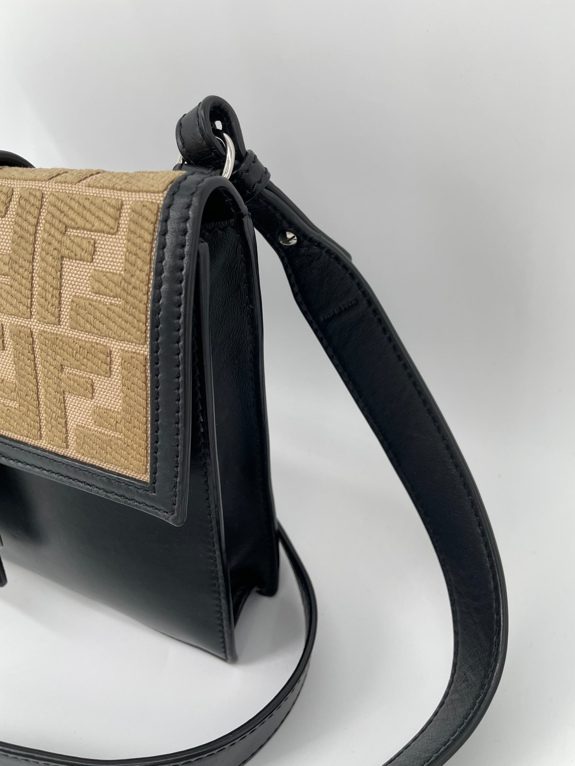 This is a beautiful Fendi Zucca Flat Baguette Crossbody Bag. This bag is made from a combination of leather and canvas, the front flap opening is secured with a magnetic fastener. The combination of soft tan canvas with the raised FF logo and the sleek black leather works perfectly together and creates a versatile bag. Inside there is a main compartment and back slip pocket and is perfect for carrying your essentials.