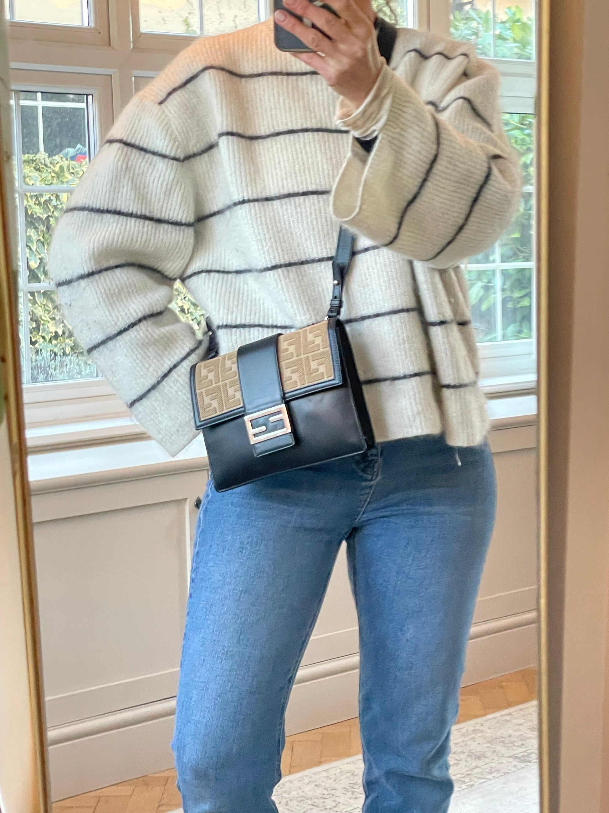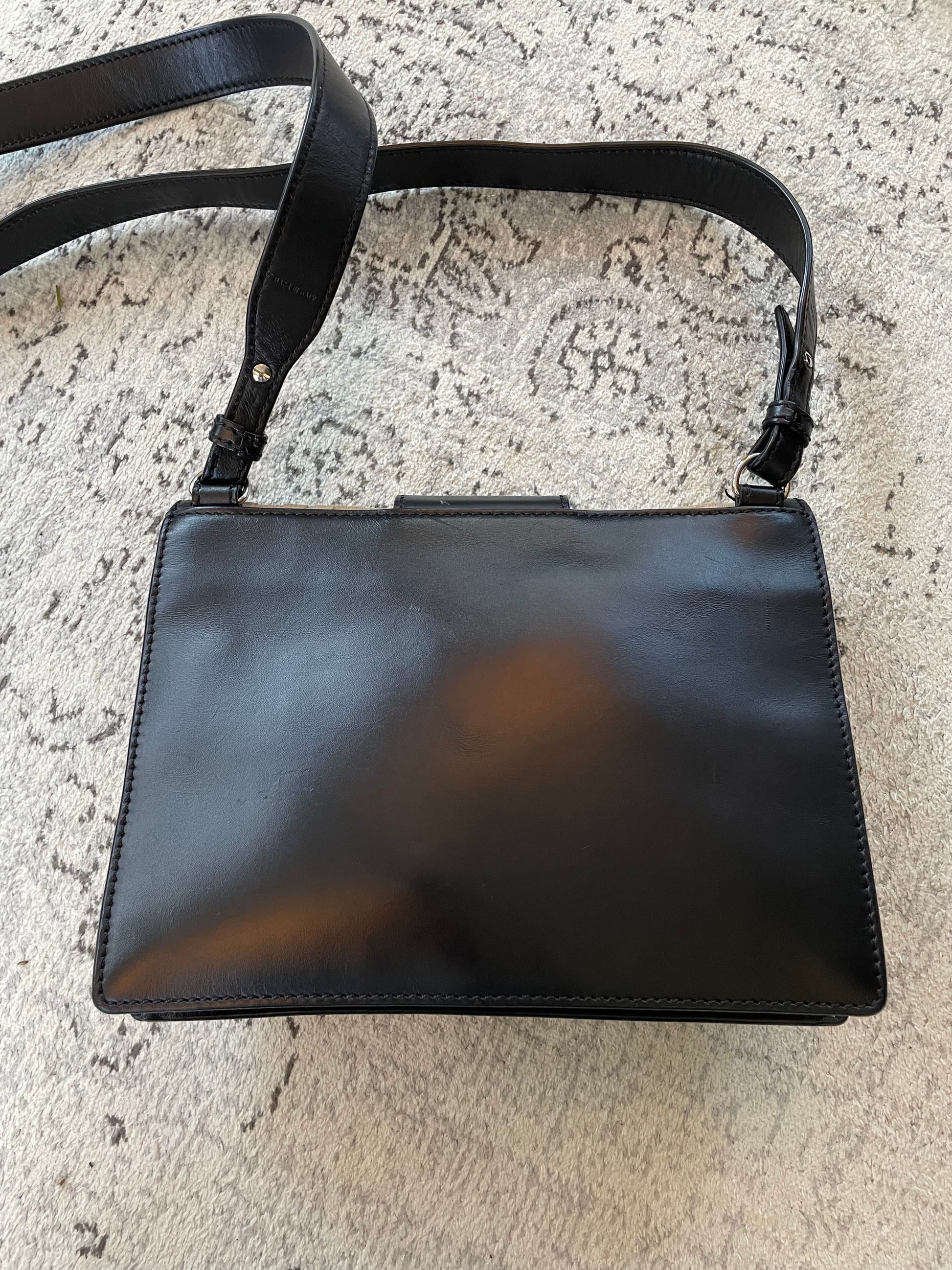 This bag sits neatly across the body. There is slight creasing to the leather and a couple of minor scratches to the body of the bag. Inside is clean and in great condition. Some scratches to the front closing plate.
