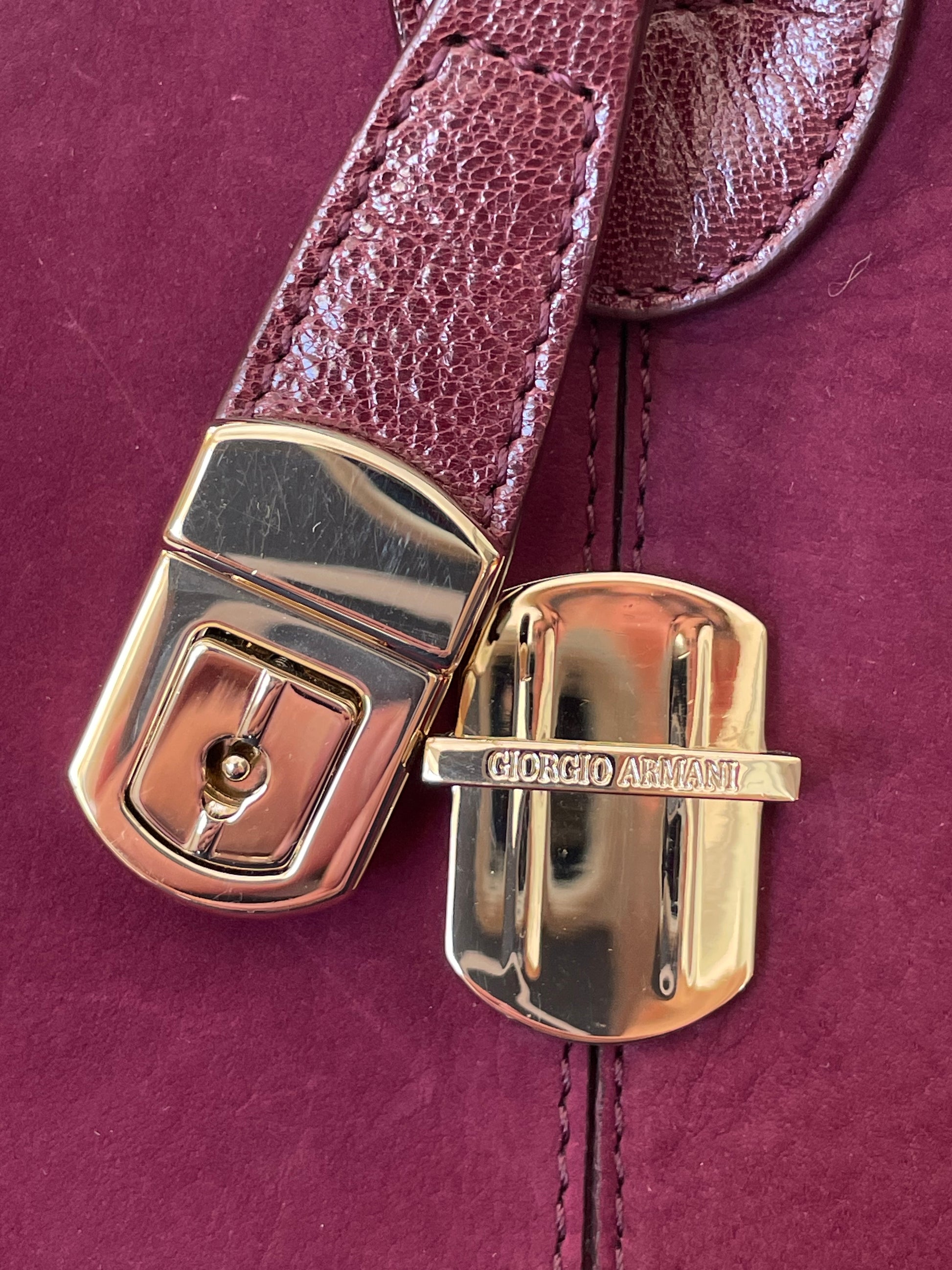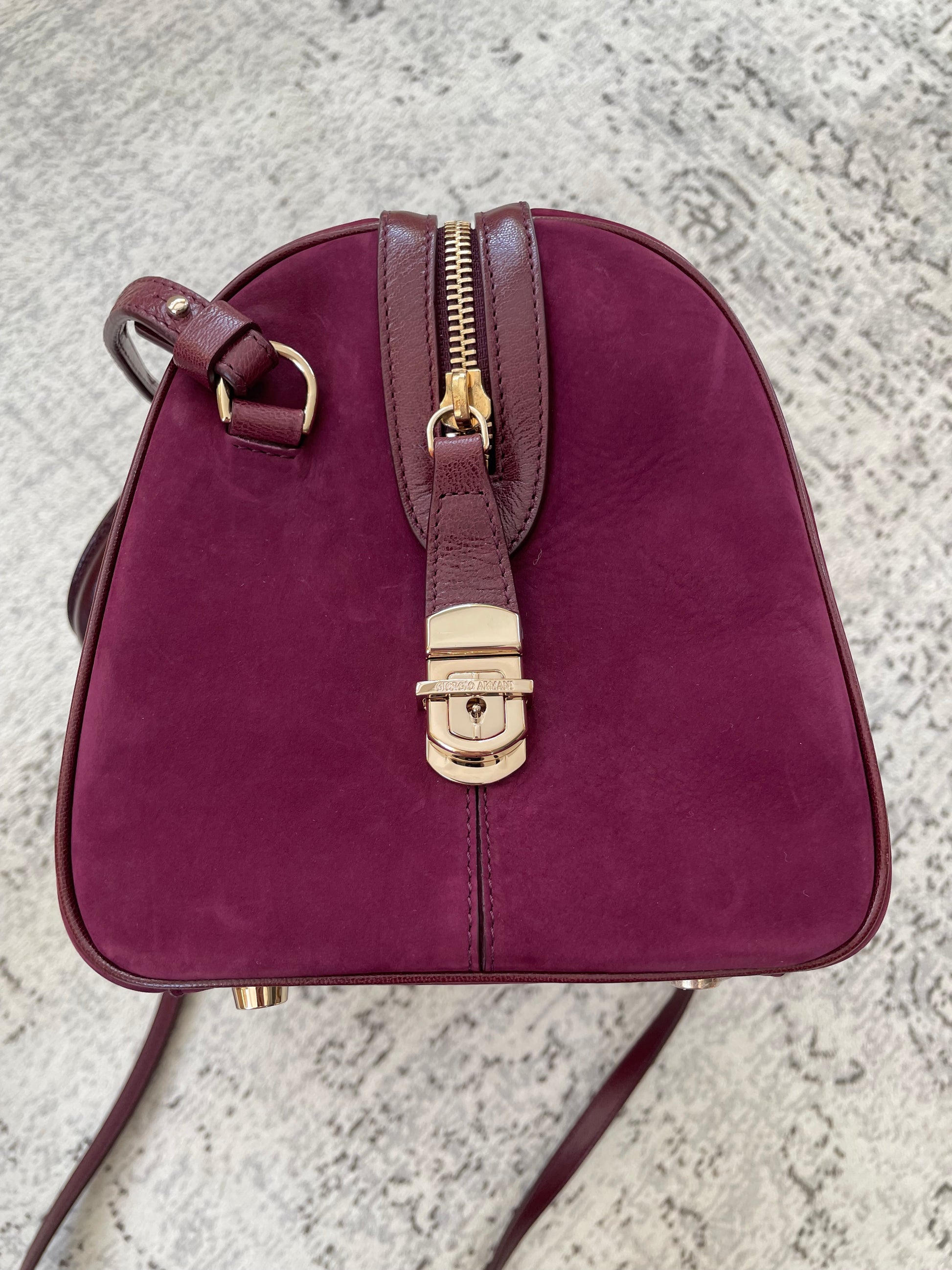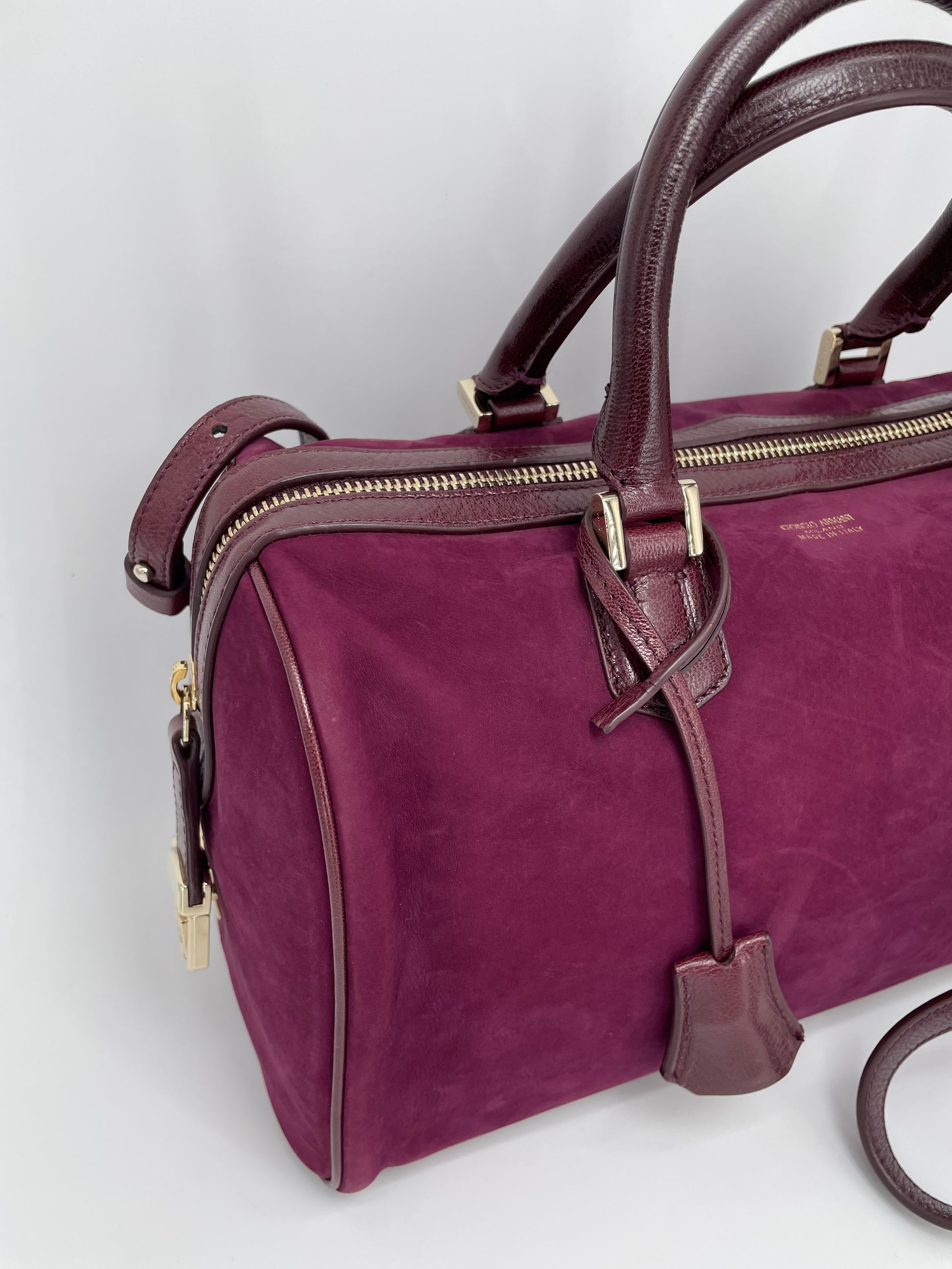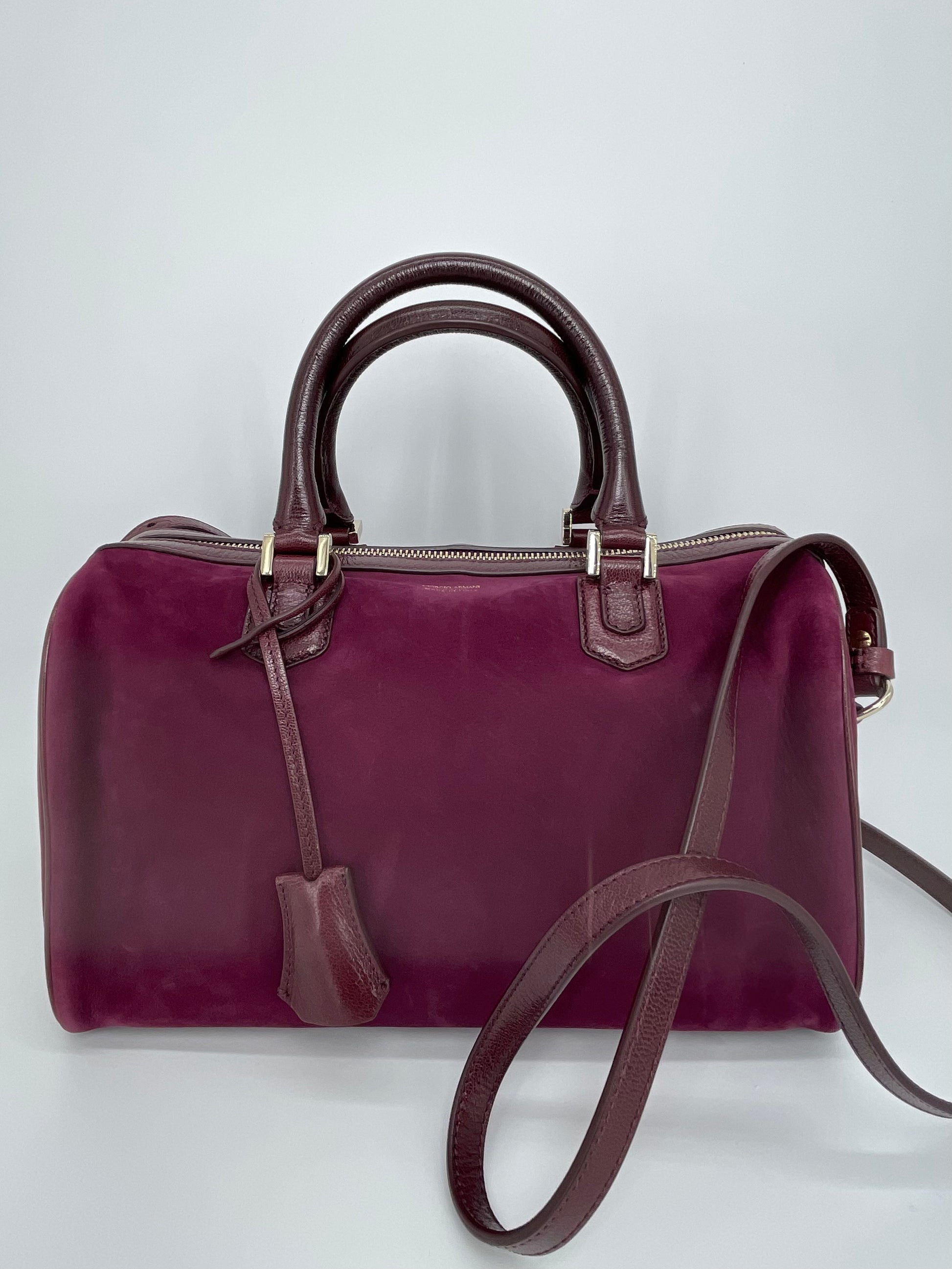 This is a stunning Giorgio Armani nubuck leather Boston bag in a rich burgundy. This iconic style, showcases exquisite Italian craftsmanship. This softly structured Boston bag features Palmellato leather trim, shoulder strap and handles. The shoulder strap can be worn at three different lengths for various styling options and the goldtone hardware complements the deep burgundy perfectly.
