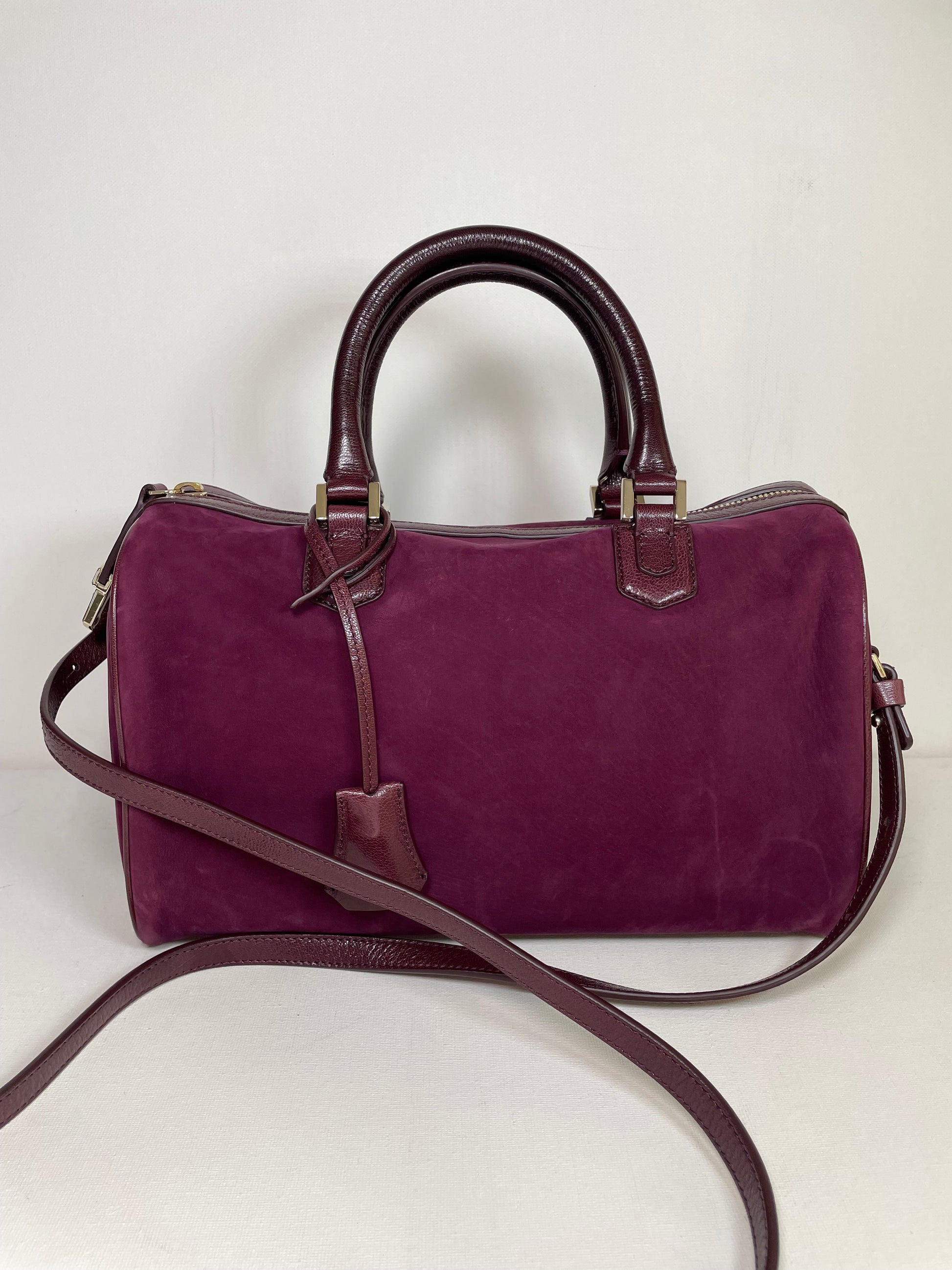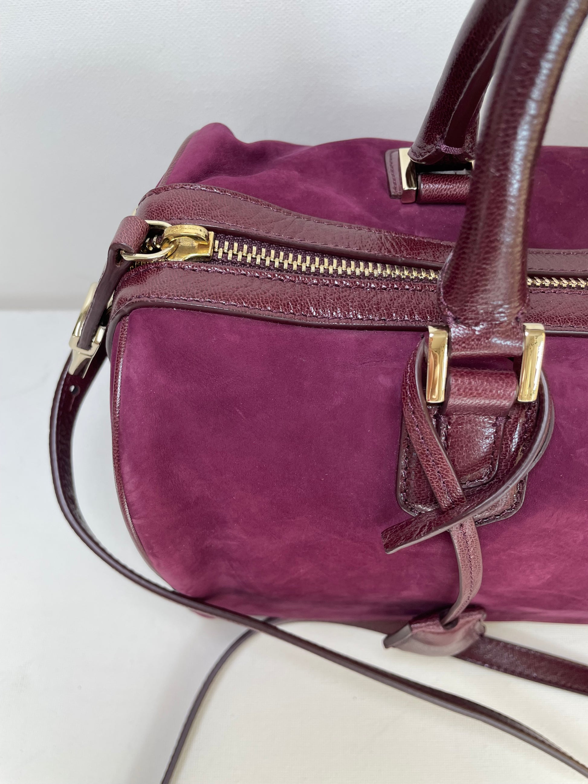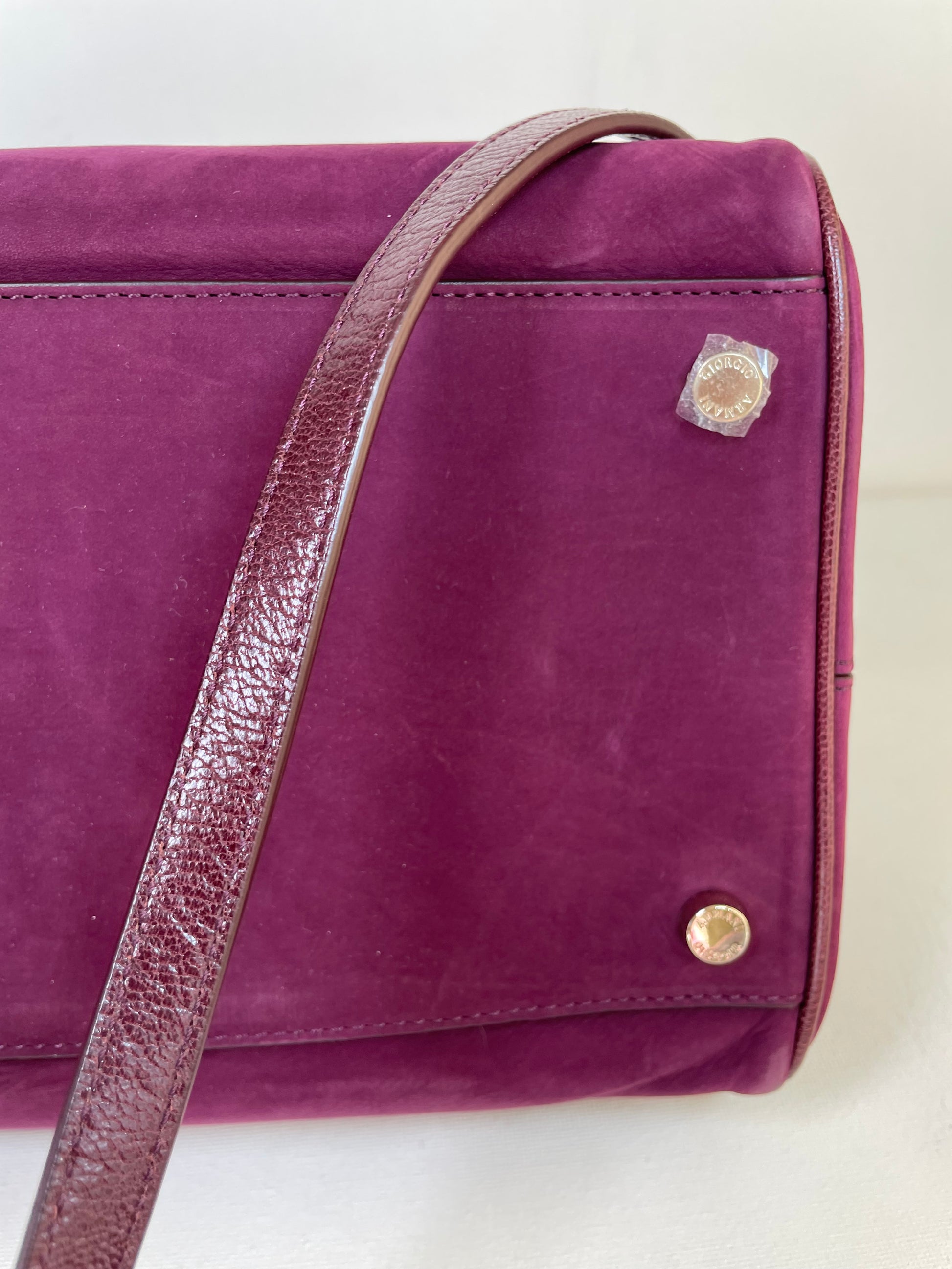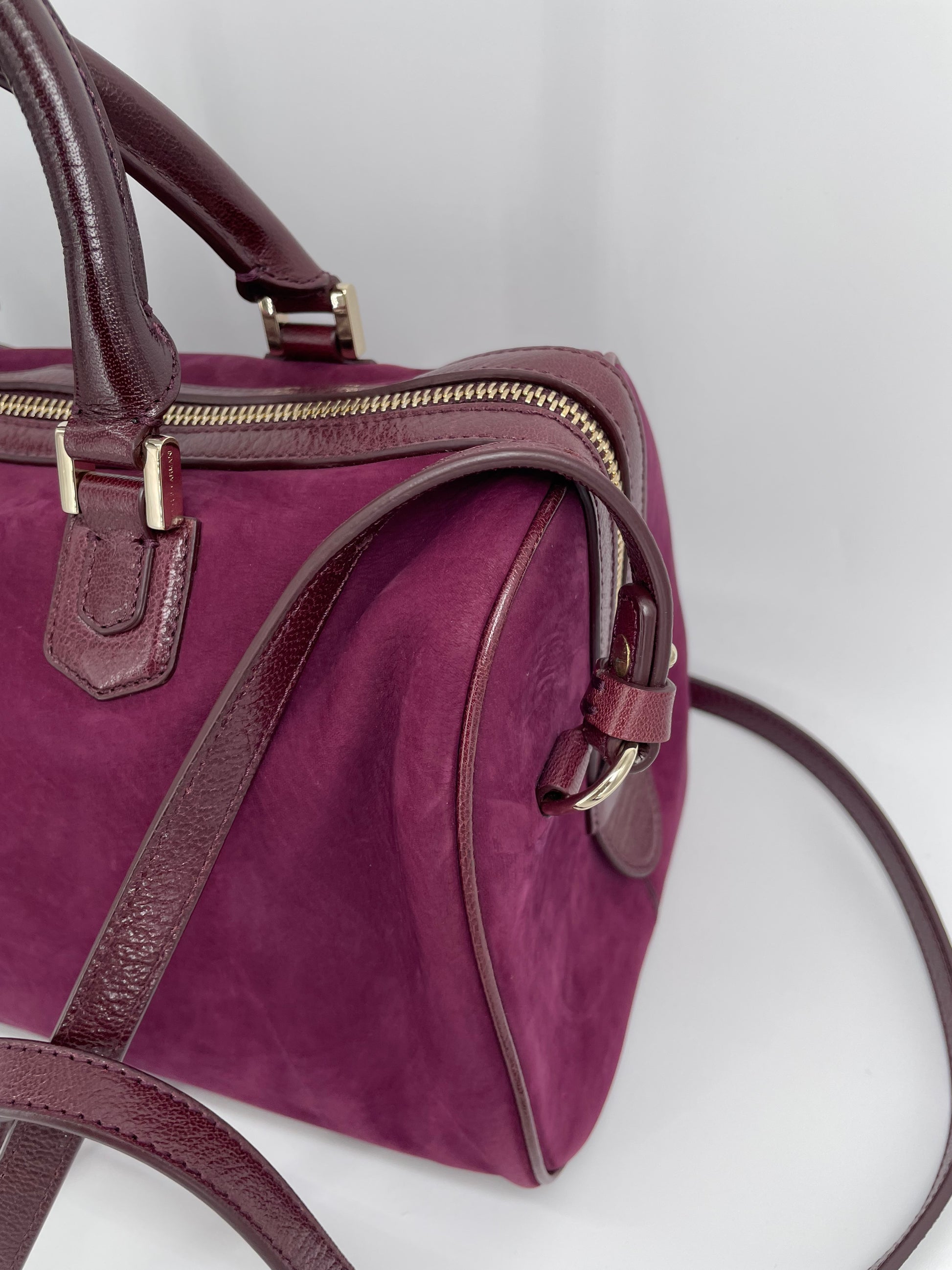 This is a stunning Giorgio Armani nubuck leather Boston bag in a rich burgundy. This iconic style, showcases exquisite Italian craftsmanship. This softly structured Boston bag features Palmellato leather trim, shoulder strap and handles. The shoulder strap can be worn at three different lengths for various styling options and the goldtone hardware complements the deep burgundy perfectly.