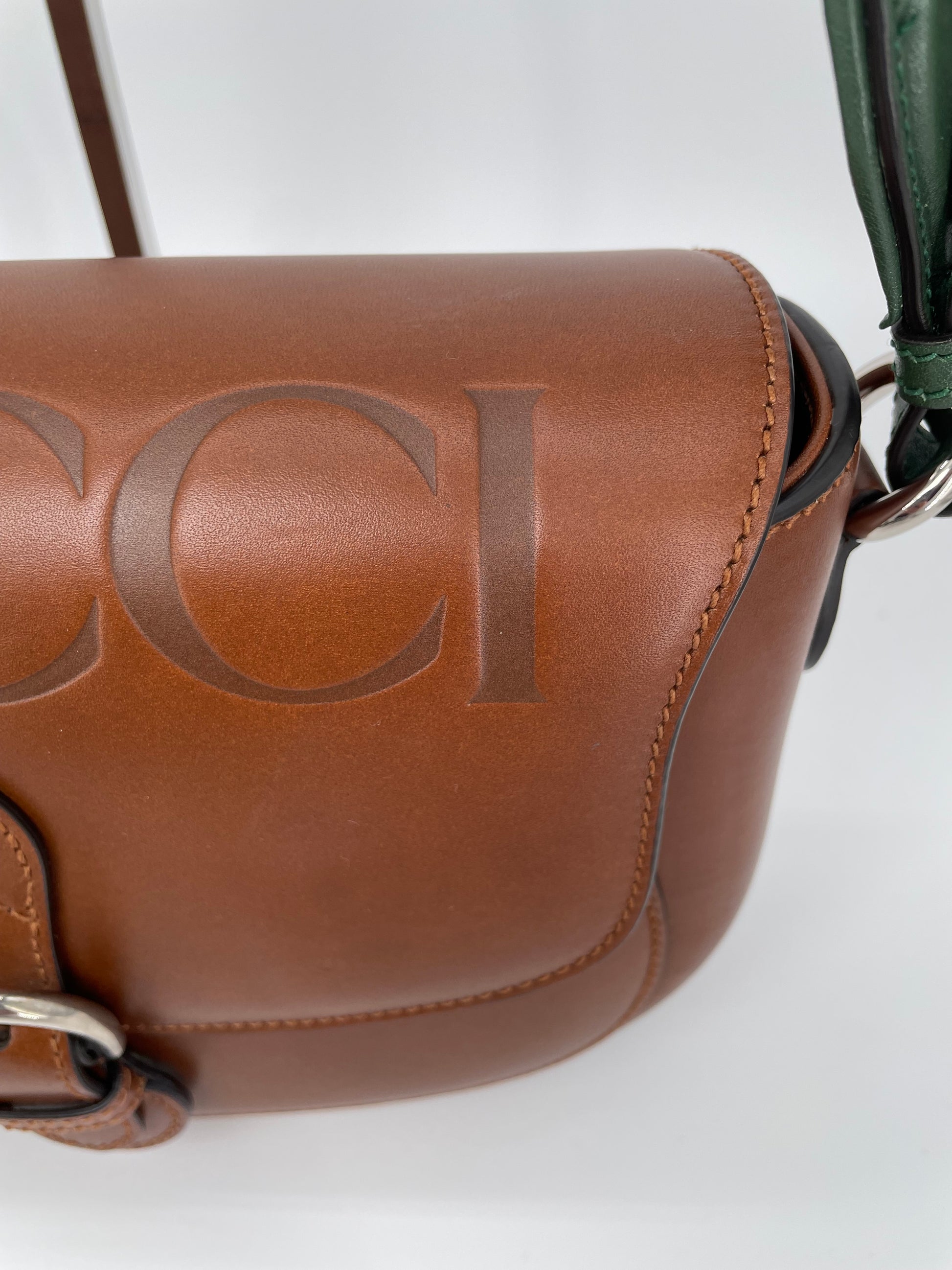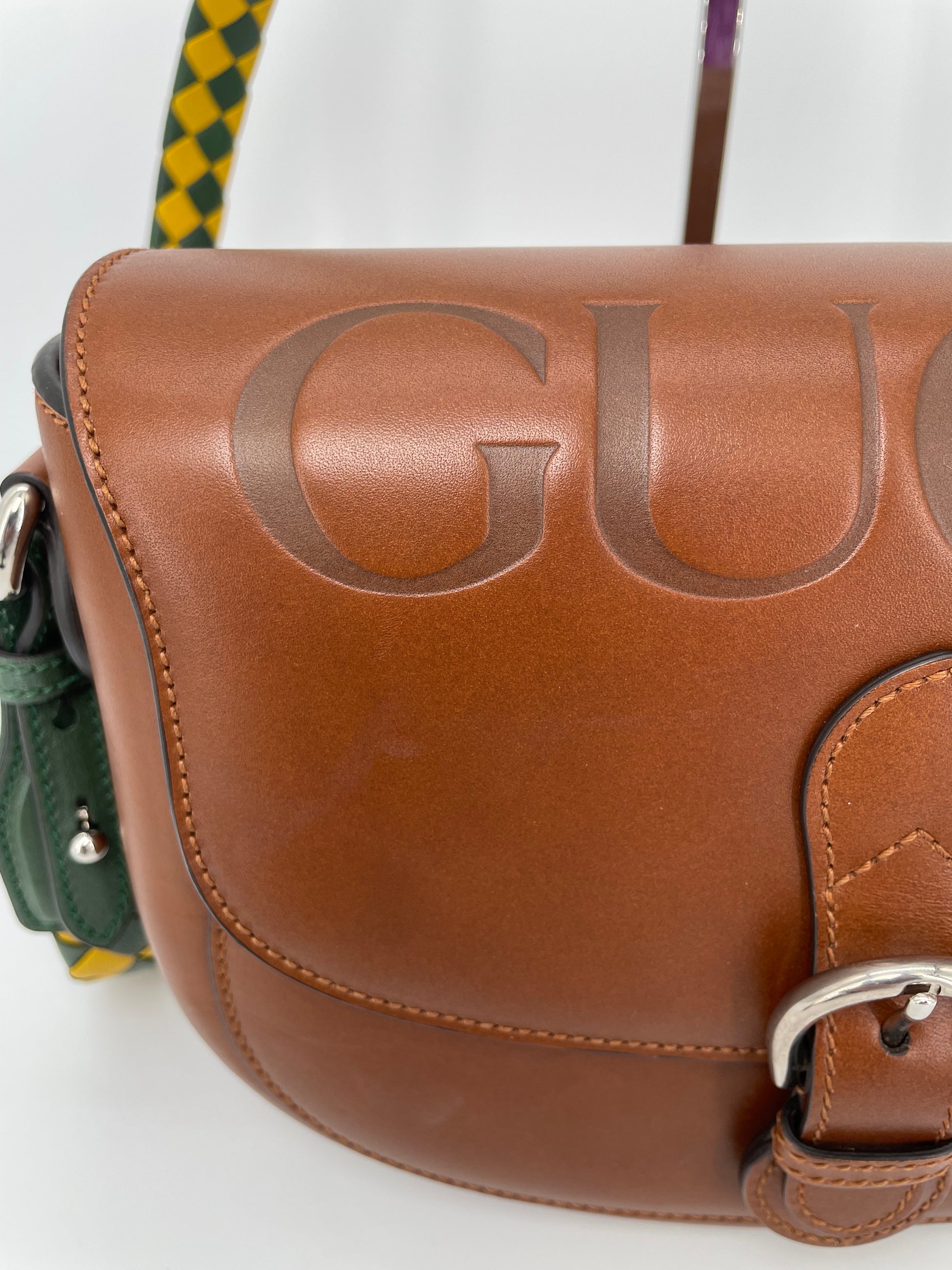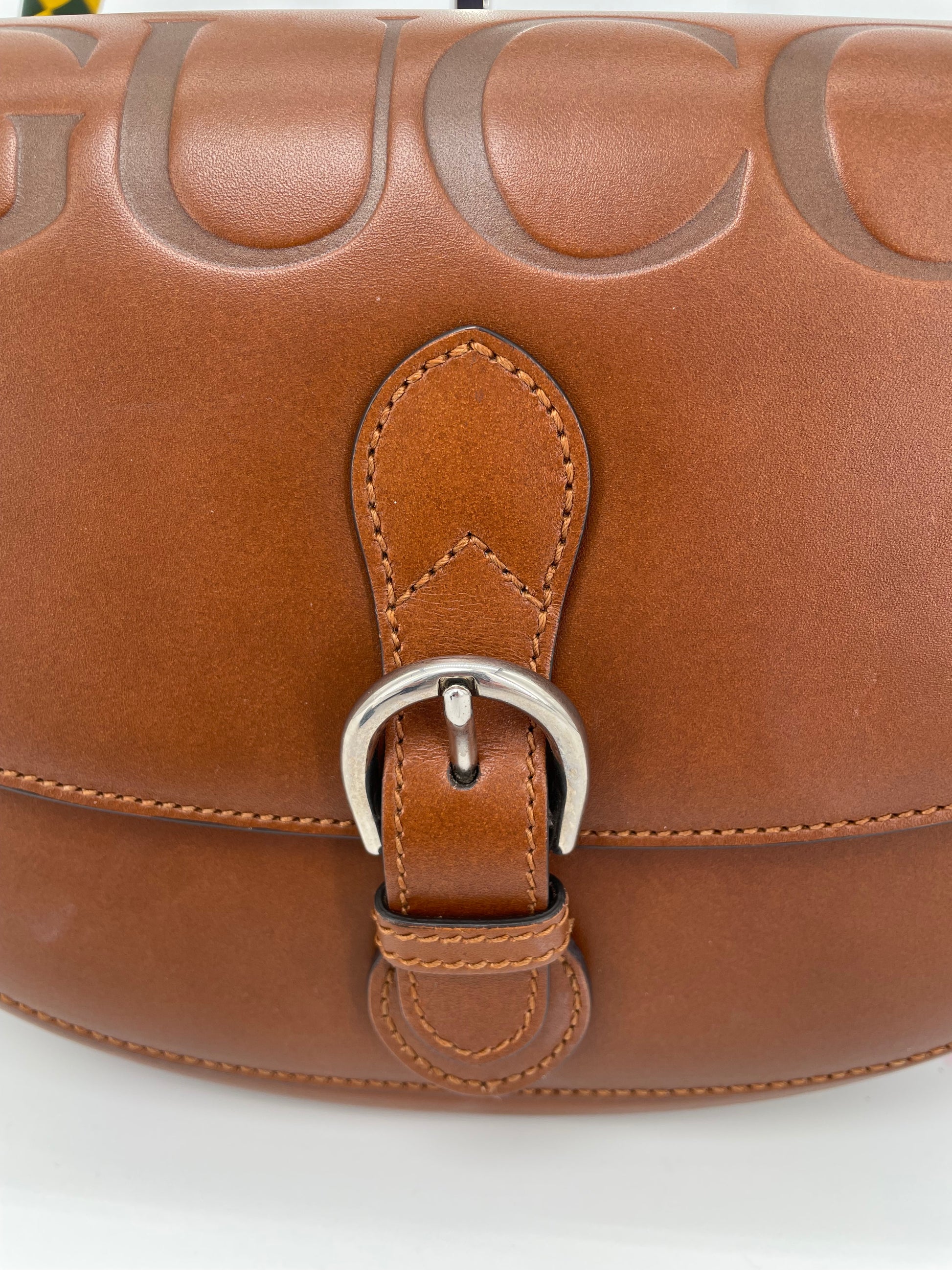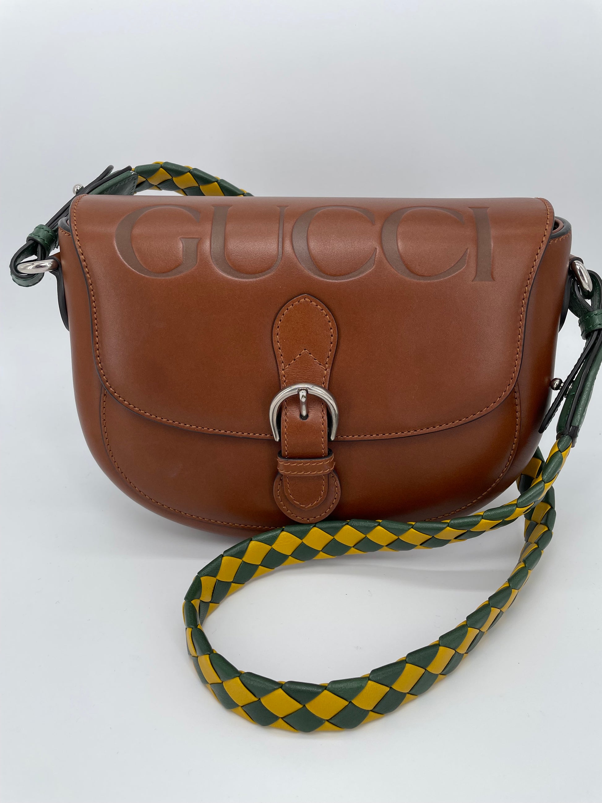 This is the Gucci Small Embossed Aria Logo Shoulder Bag. It features a large embossed logo on the leather body and a distinctive woven strap with silver-tone hardware. This collection was designed by Alessandro Michele and was to celebrate the iconic Italian brand’s 100th anniversary. This bag celebrates the rich equestrian heritage combined with the modern, sleek elegance the brand is known for.