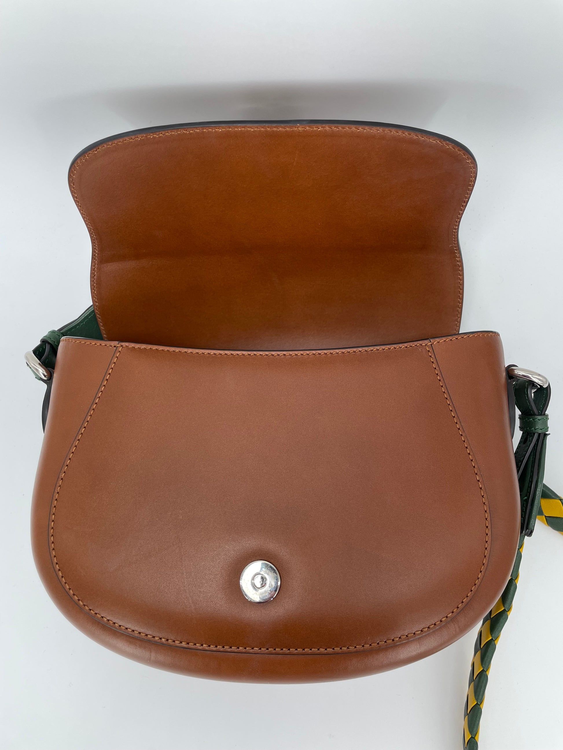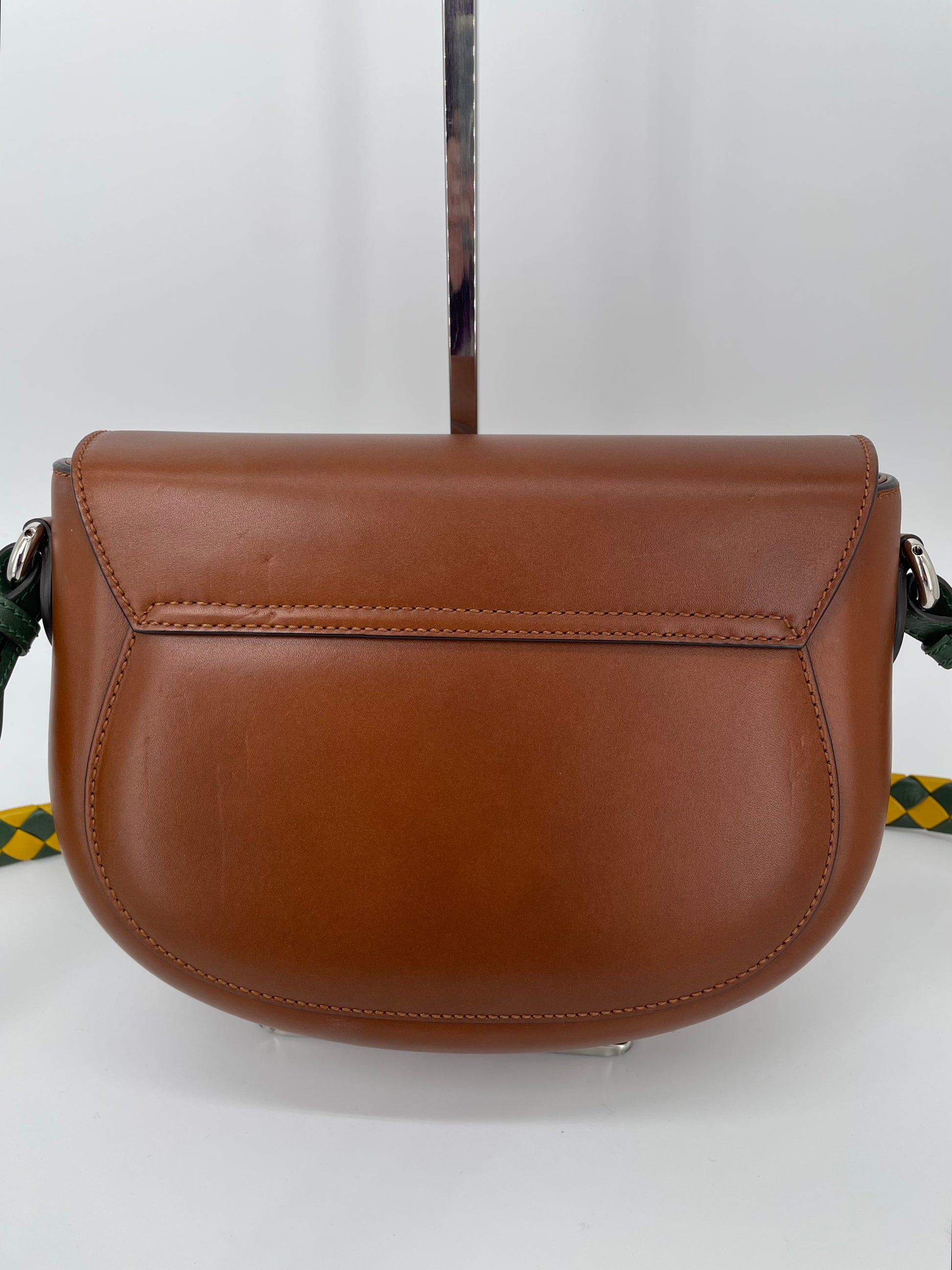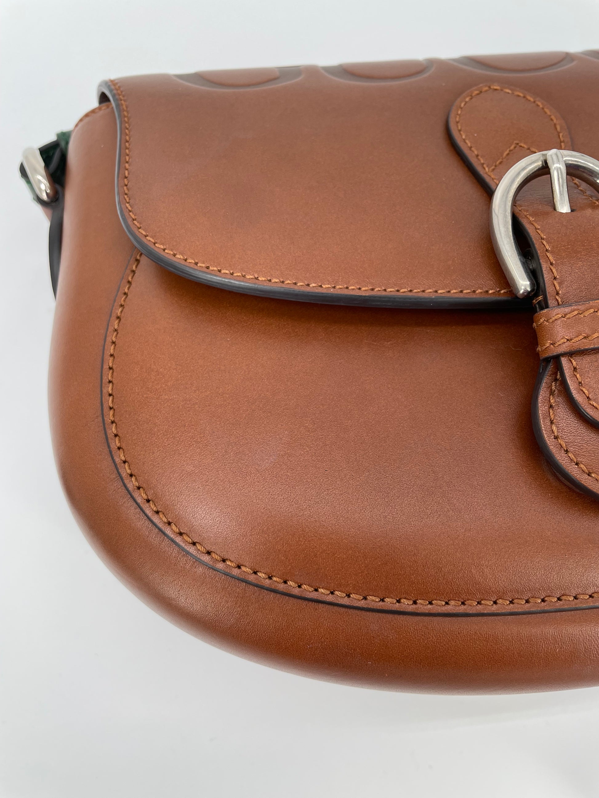 This is the Gucci Small Embossed Aria Logo Shoulder Bag. It features a large embossed logo on the leather body and a distinctive woven strap with silver-tone hardware. This collection was designed by Alessandro Michele and was to celebrate the iconic Italian brand’s 100th anniversary. This bag celebrates the rich equestrian heritage combined with the modern, sleek elegance the brand is known for.