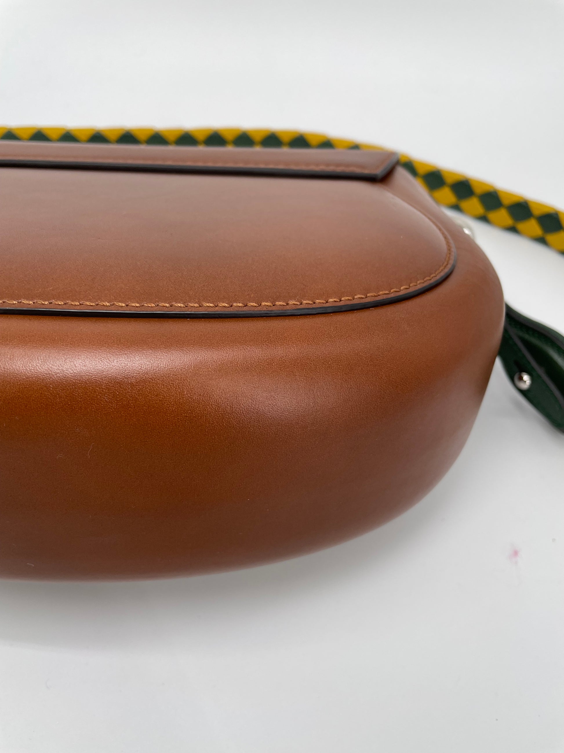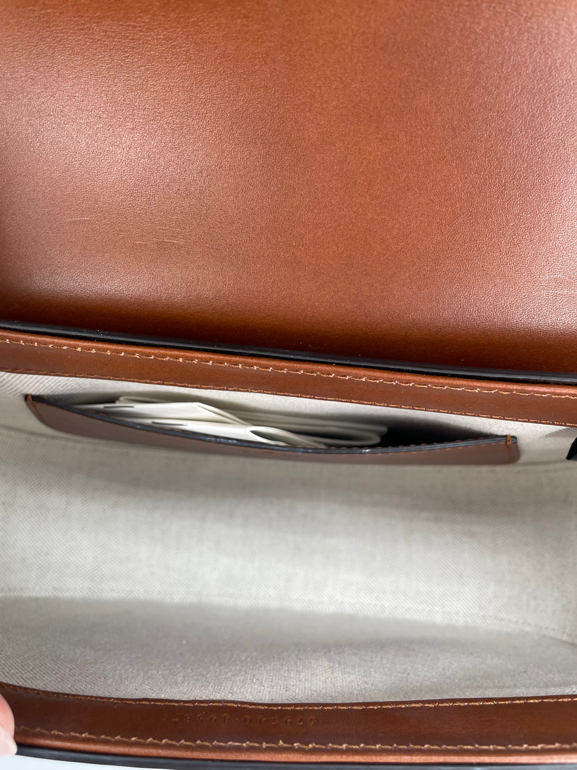 This shoulder bag is crafted from, sleek, brown leather and features a logo print to the front. It has silver-tone hardware and a foldover top with a press-stud fastening. The bag also has a single shoulder strap, a main compartment, and an internal slip pocket