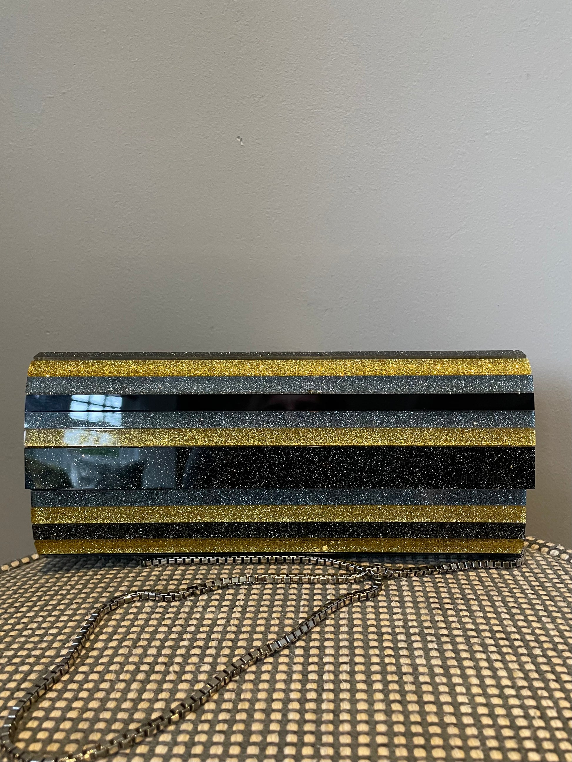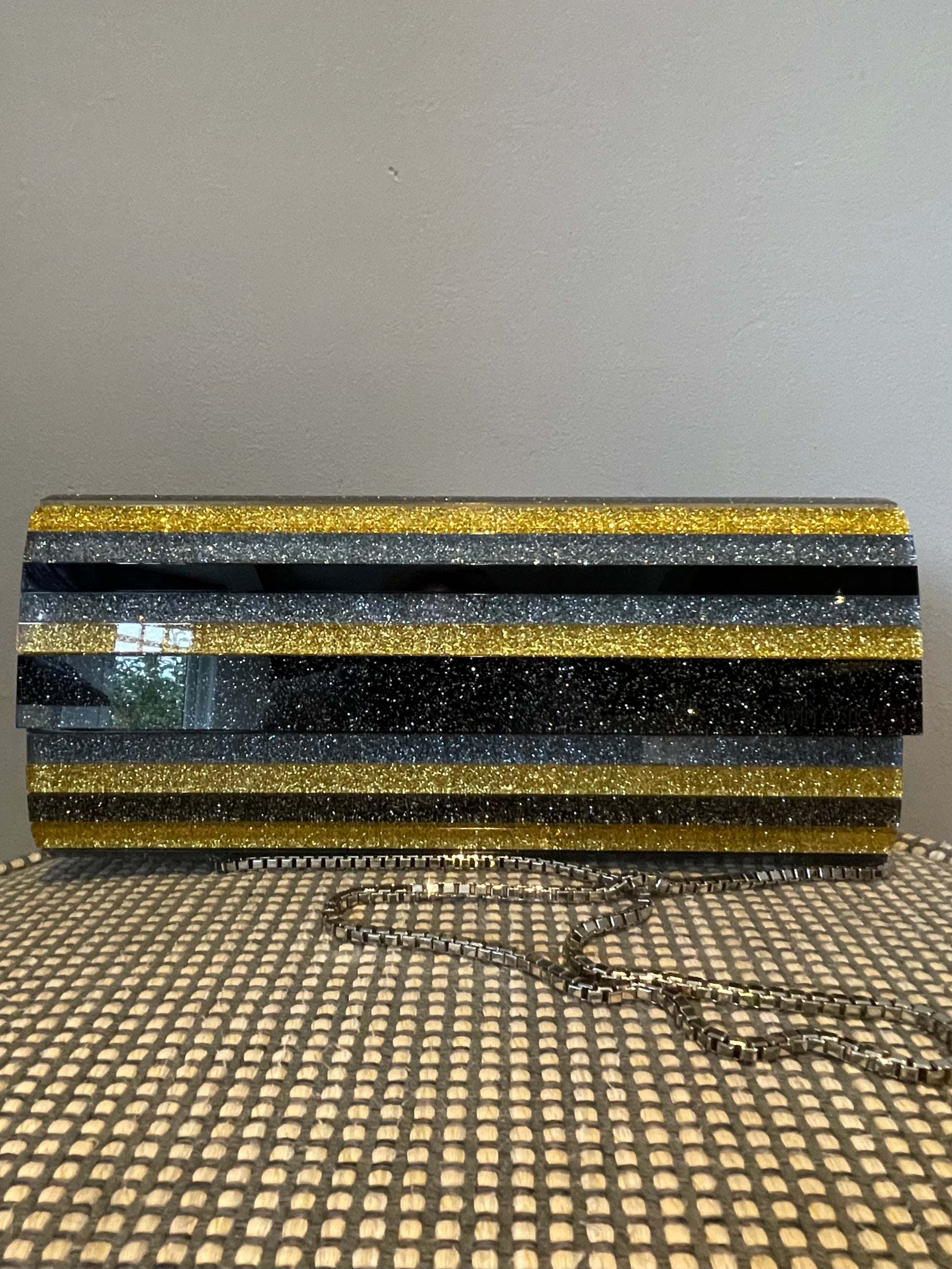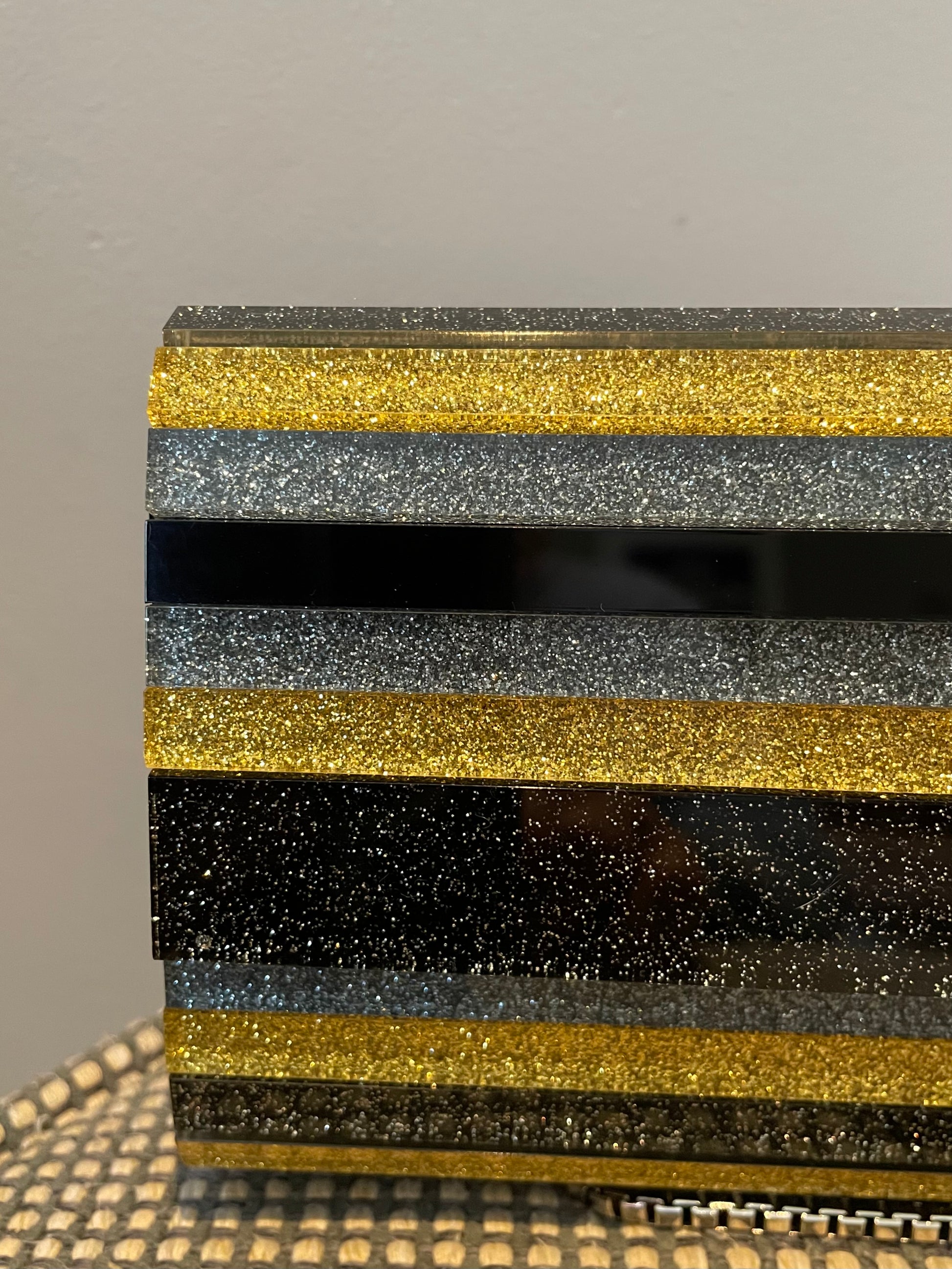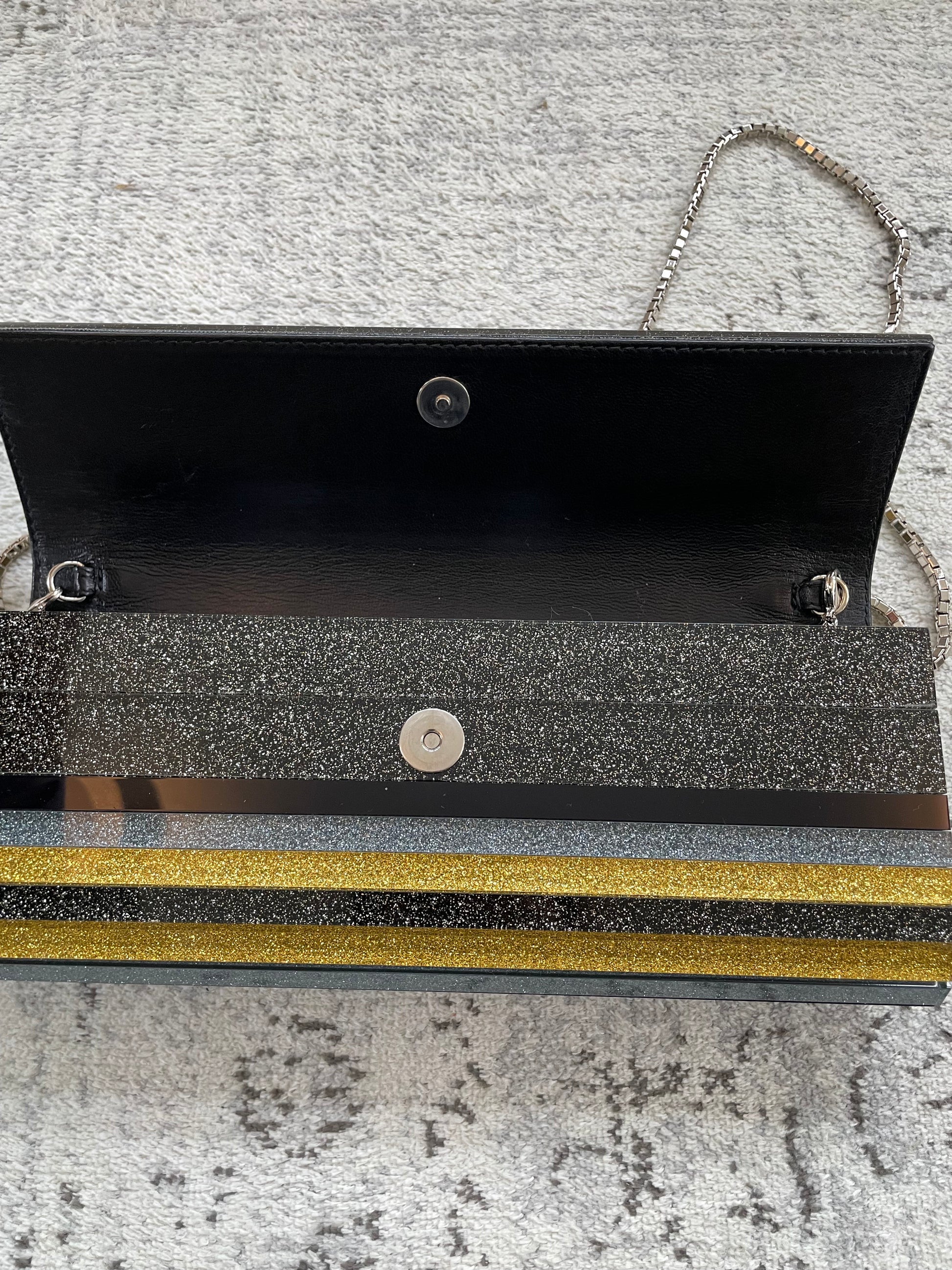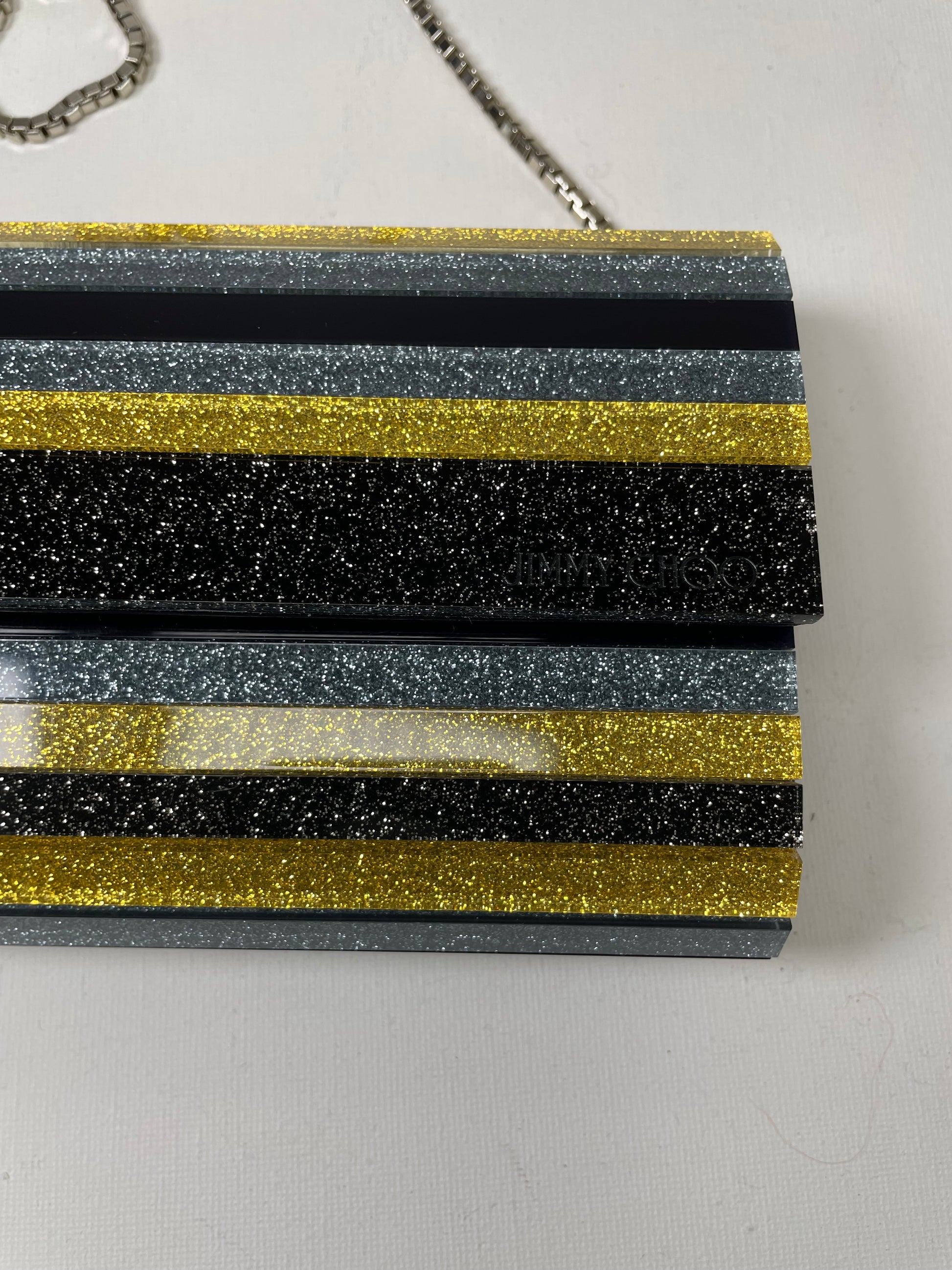 This is a stunning Jimmy Choo Sweetie clutch bag. The only bag you will need on a night out ! Fun and elegant, eye catching and timeless. This particular style features a black, gold, blue and silver glitter design with horizontal ribbed acrylic paneling. It is constructed with a hard case and includes a detachable chain shoulder strap. Internally the clutch has a magnetic snap closure and an internal side slip pocket with an engraved Jimmy Choo leather plaque.