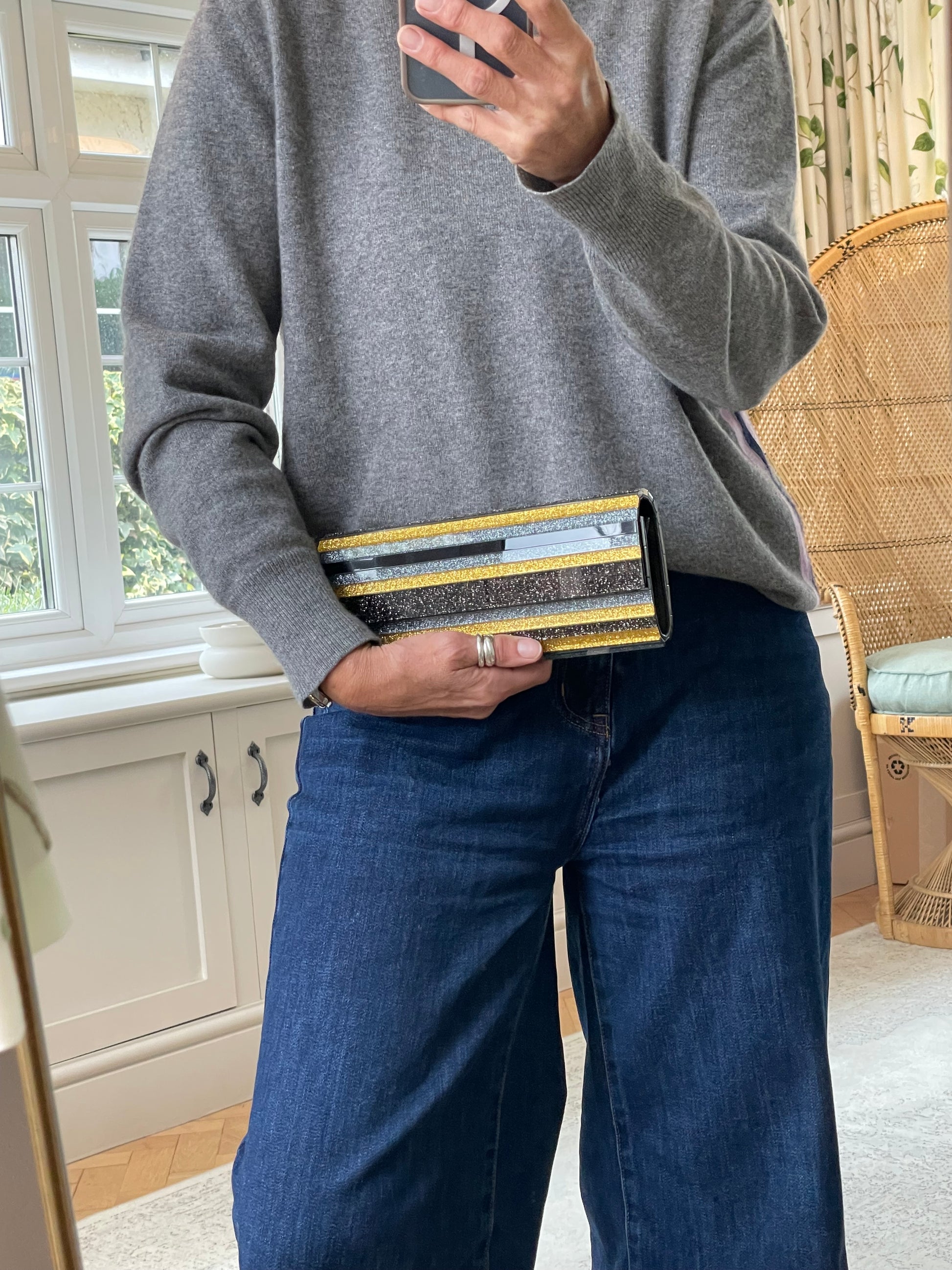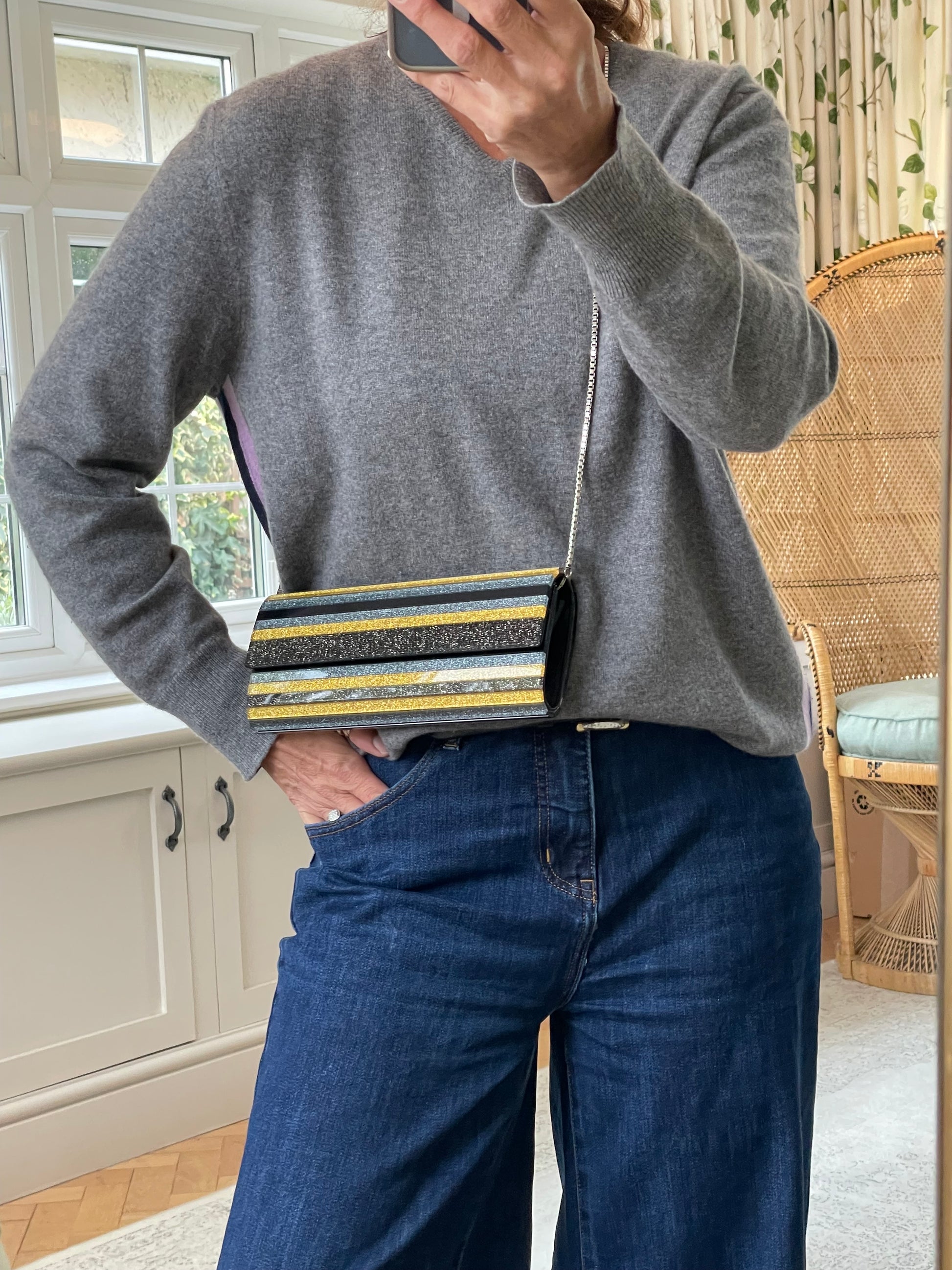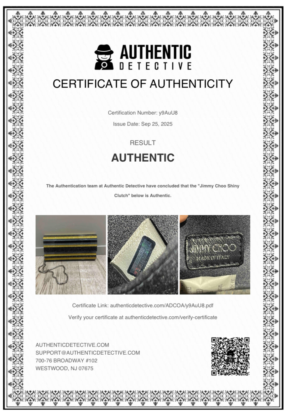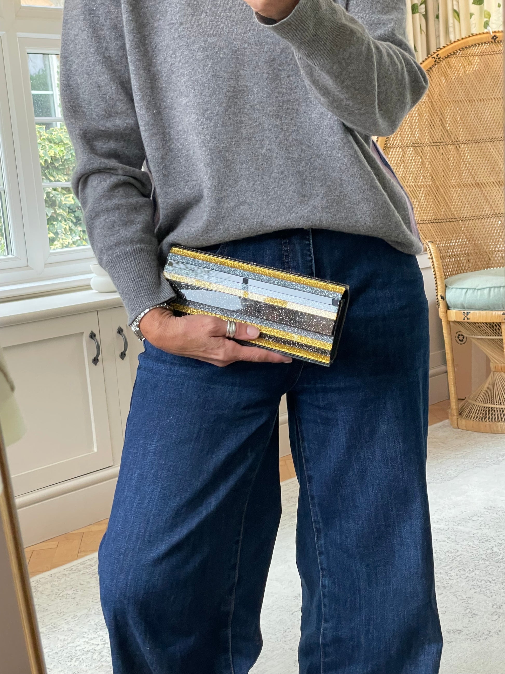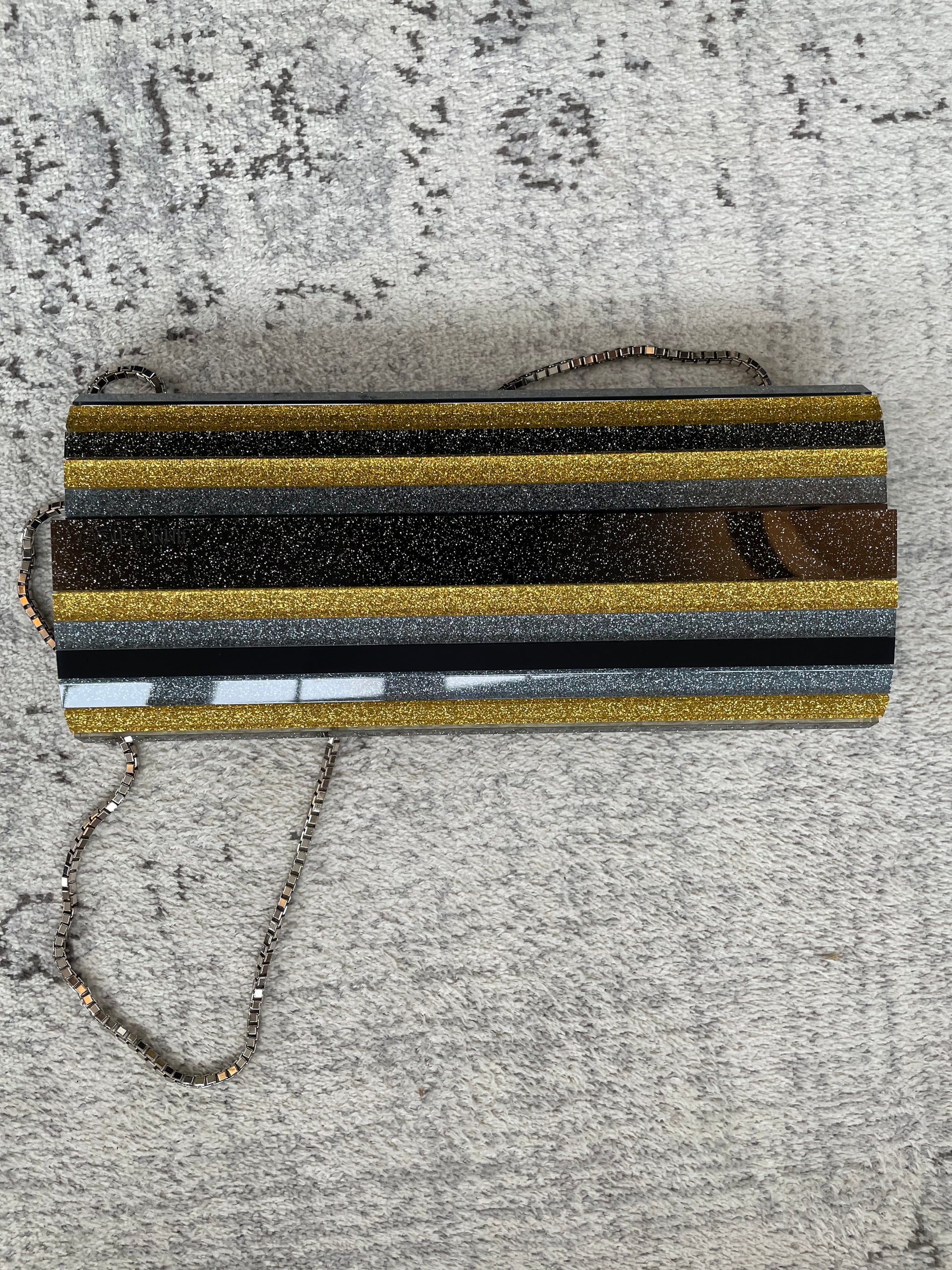 This is a stunning Jimmy Choo Sweetie clutch bag. The only bag you will need on a night out ! Fun and elegant, eye catching and timeless. This particular style features a black, gold, blue and silver glitter design with horizontal ribbed acrylic paneling. It is constructed with a hard case and includes a detachable chain shoulder strap. Internally the clutch has a magnetic snap closure and an internal side slip pocket with an engraved Jimmy Choo leather plaque.