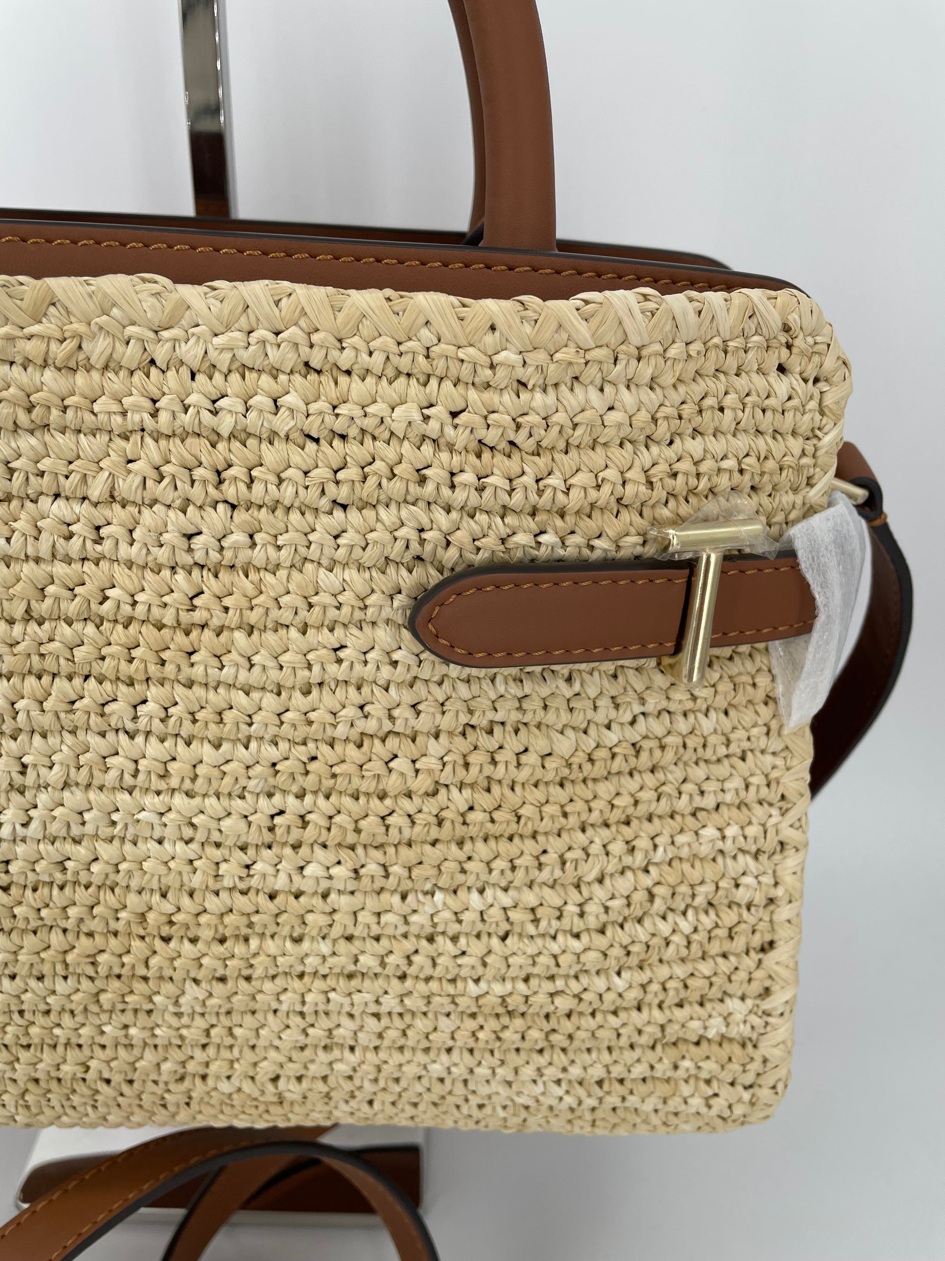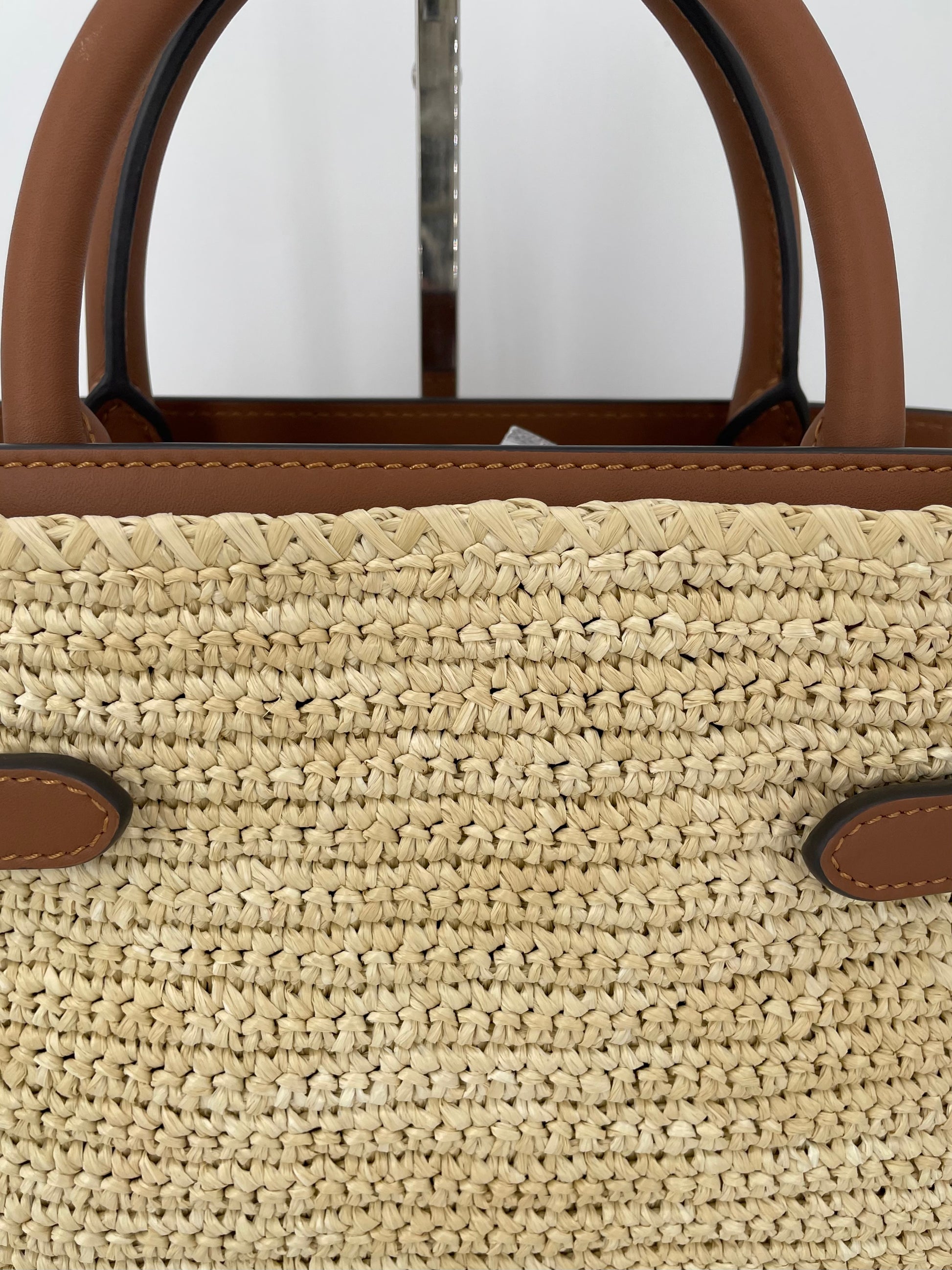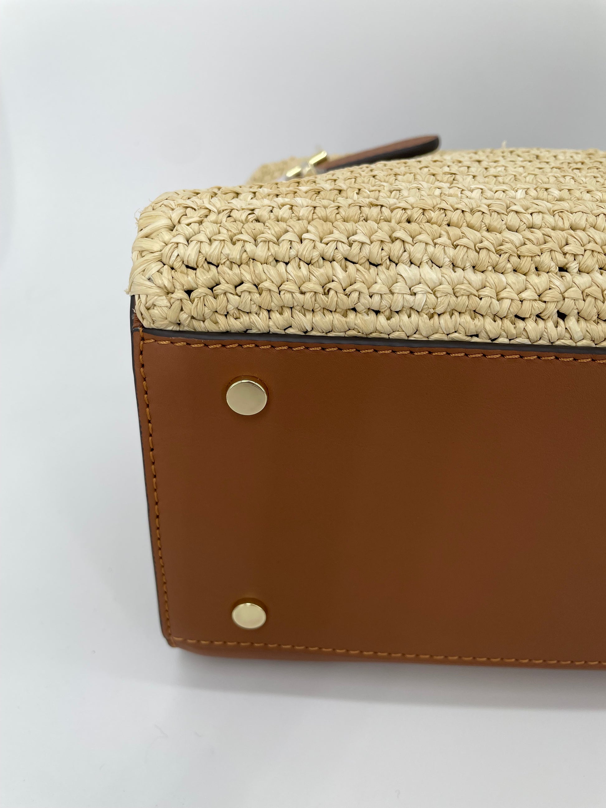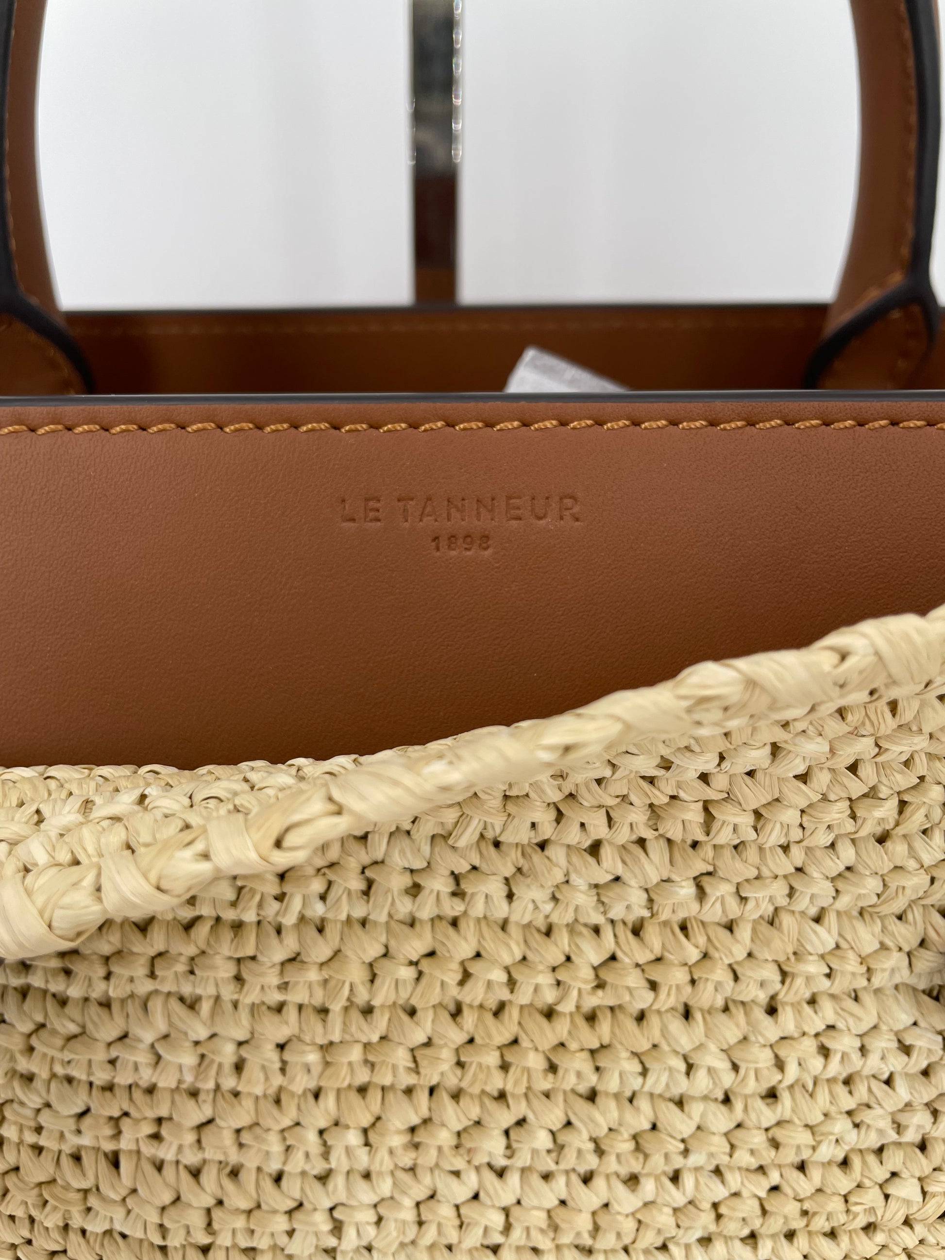 This is a stunning Le Tanneur Emilie Medium Raffia and Natural Smooth Leather Tan Handbag. This bag combines a classic, elegant design with the modern twist of the front raffia panel.