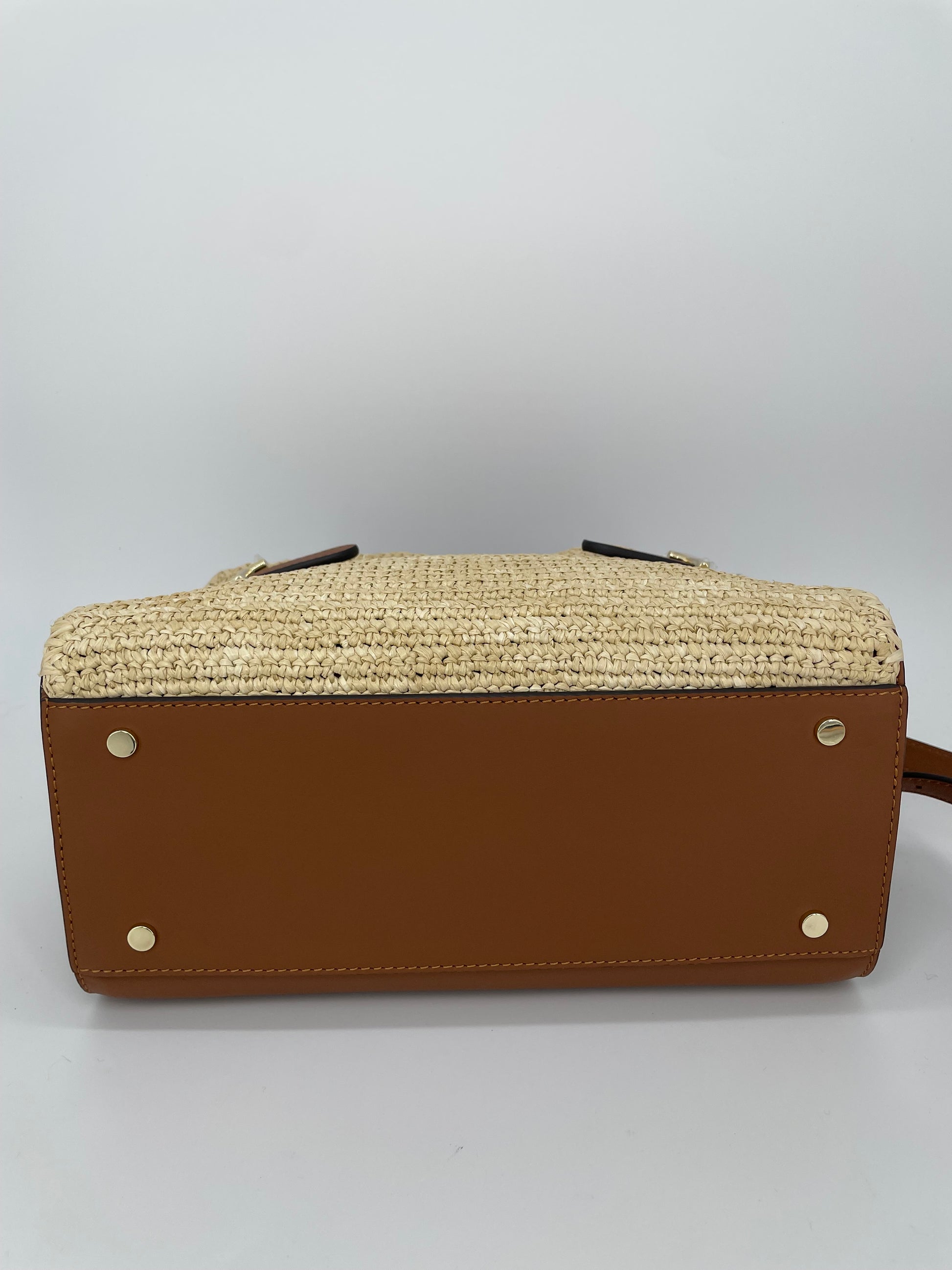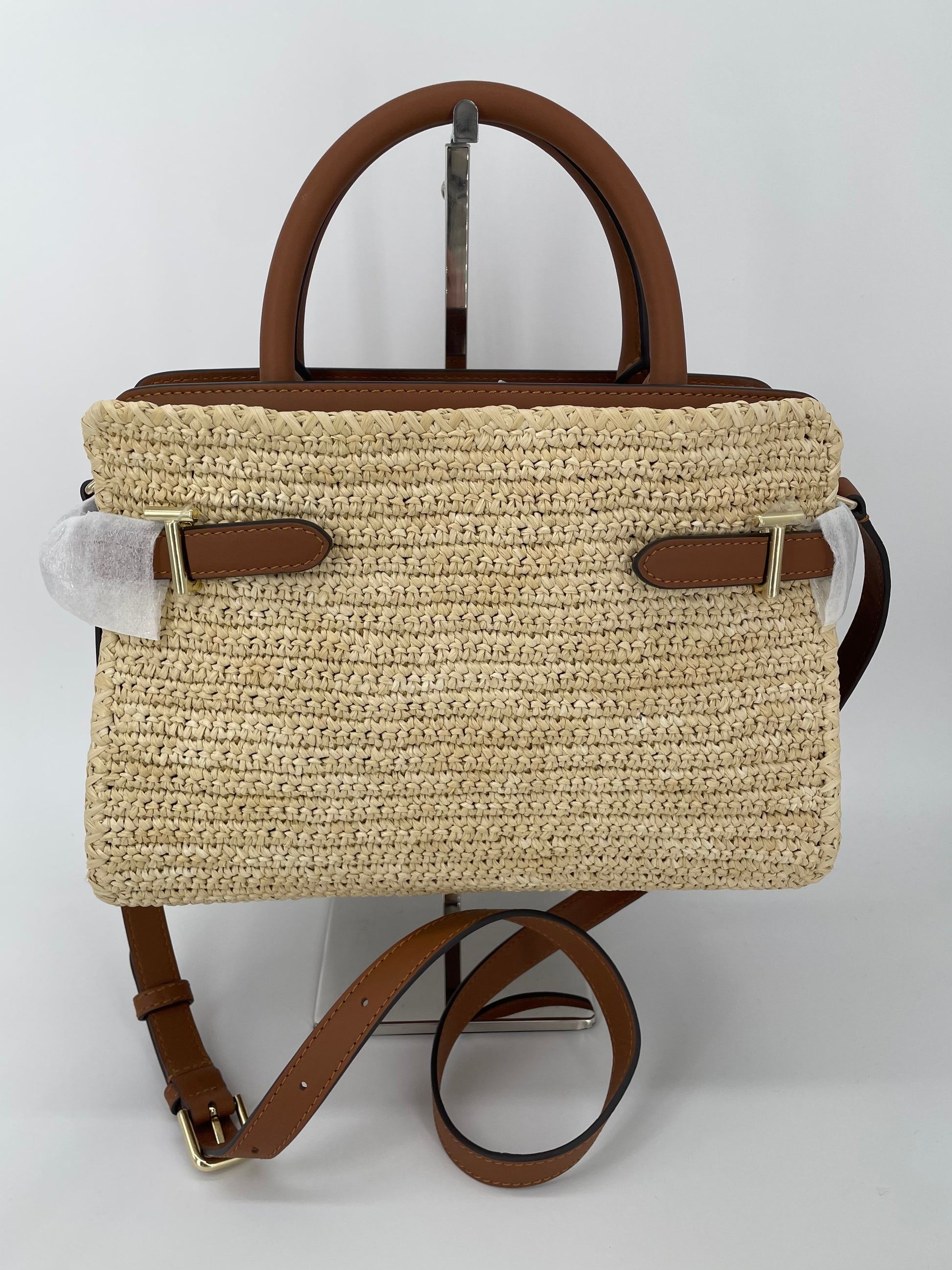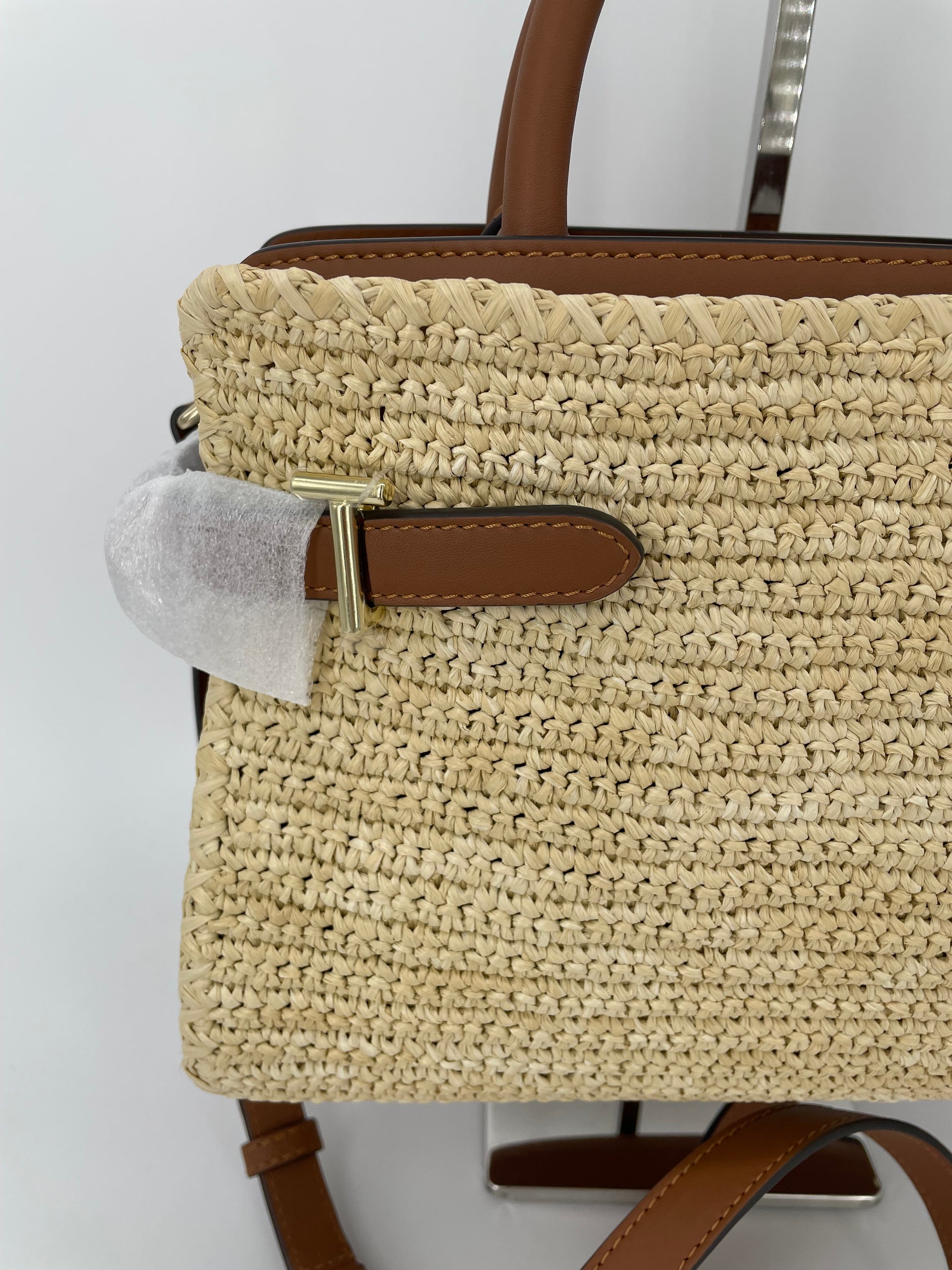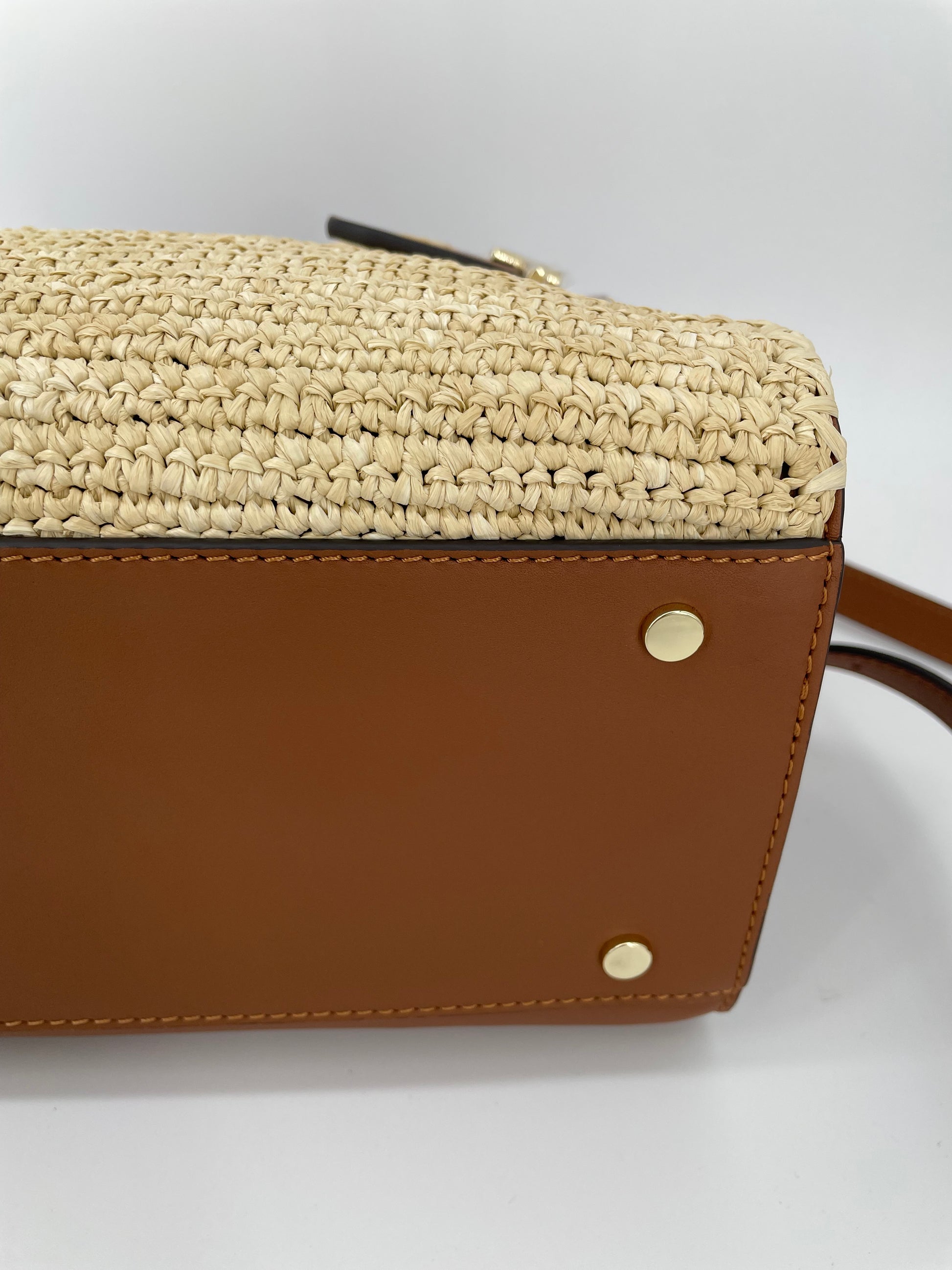 This is a stunning Le Tanneur Emilie Medium Raffia and Natural Smooth Leather Tan Handbag. This bag combines a classic, elegant design with the modern twist of the front raffia panel.