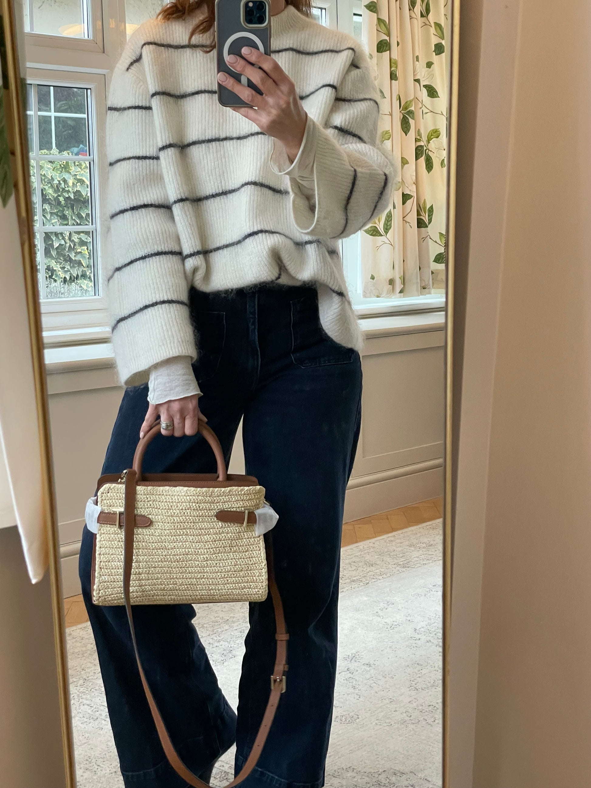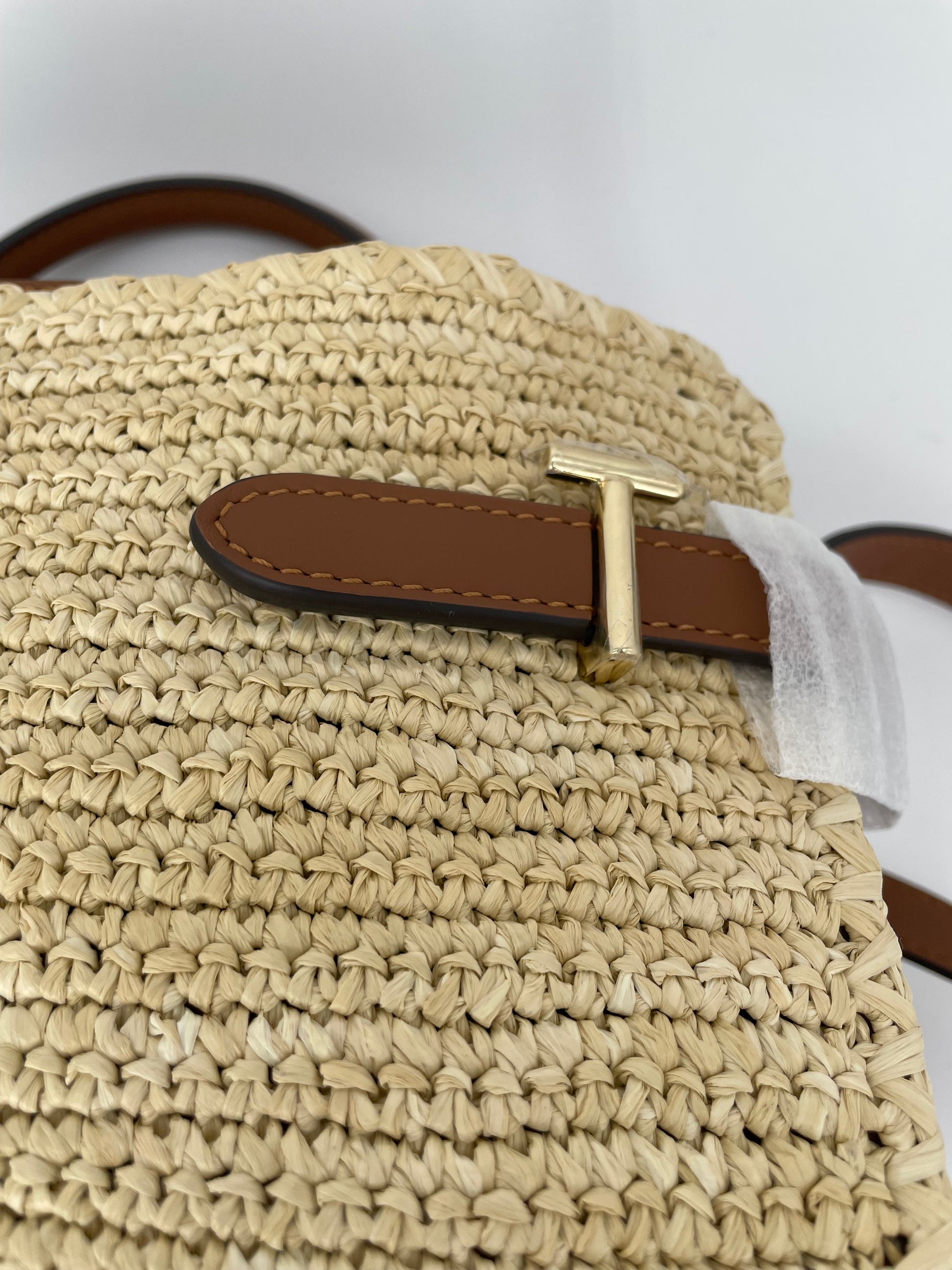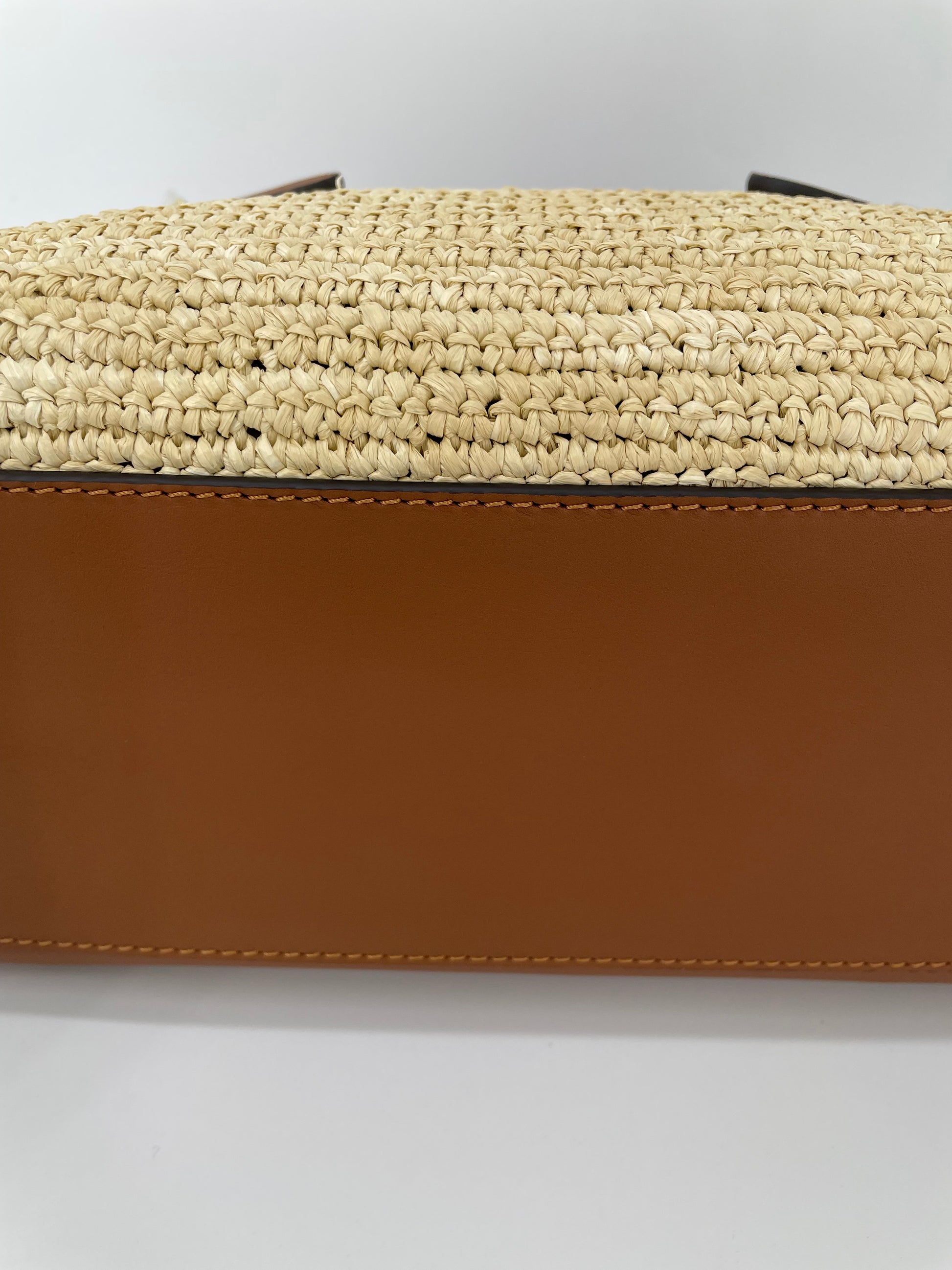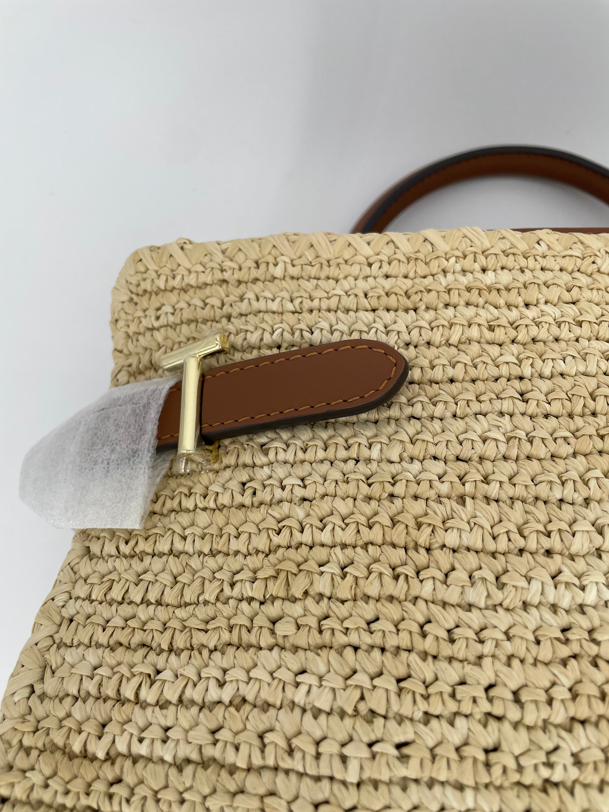 This is a stunning Le Tanneur Emilie Medium Raffia and Natural Smooth Leather Tan Handbag. This bag combines a classic, elegant design with the modern twist of the front raffia panel.