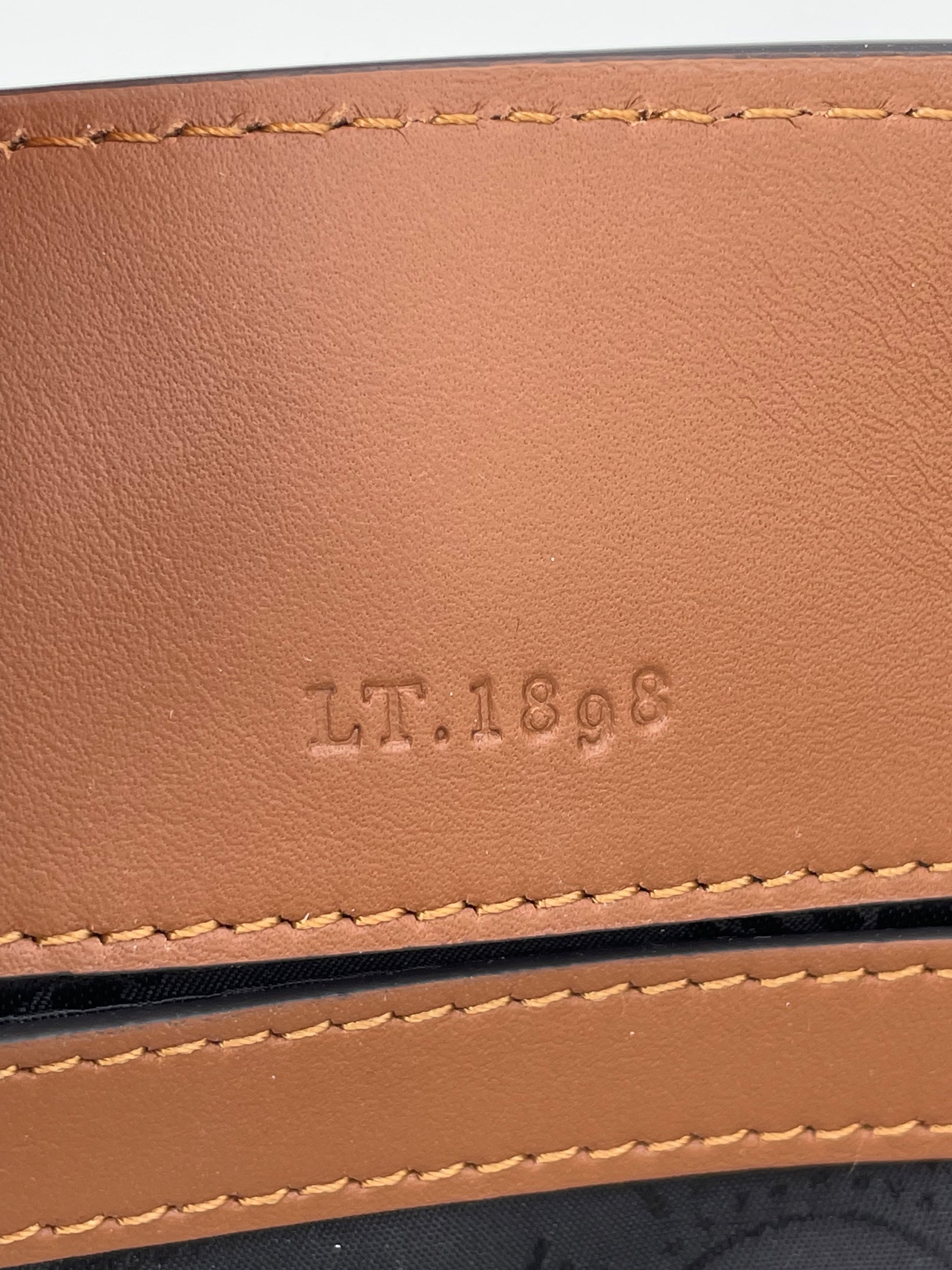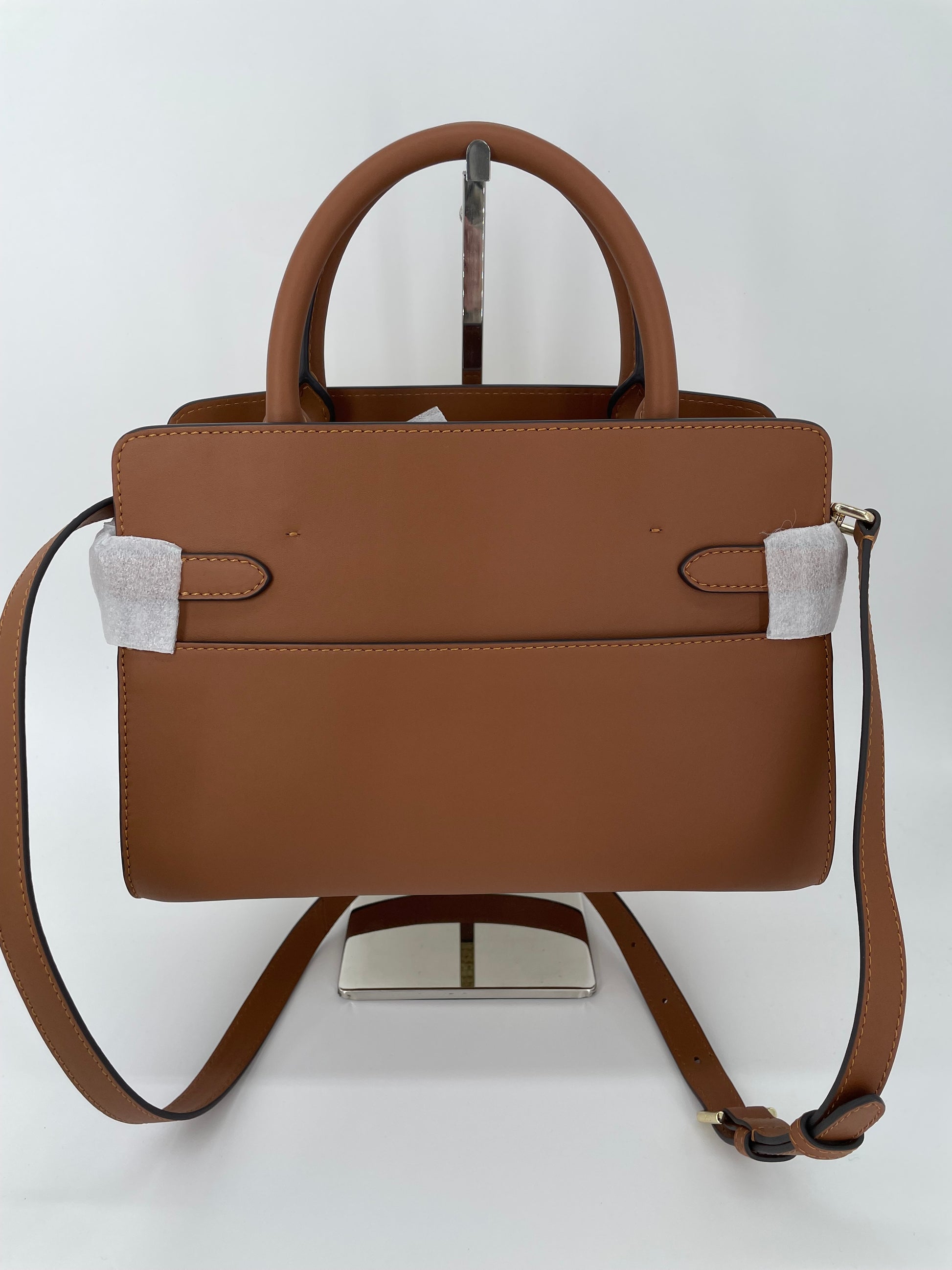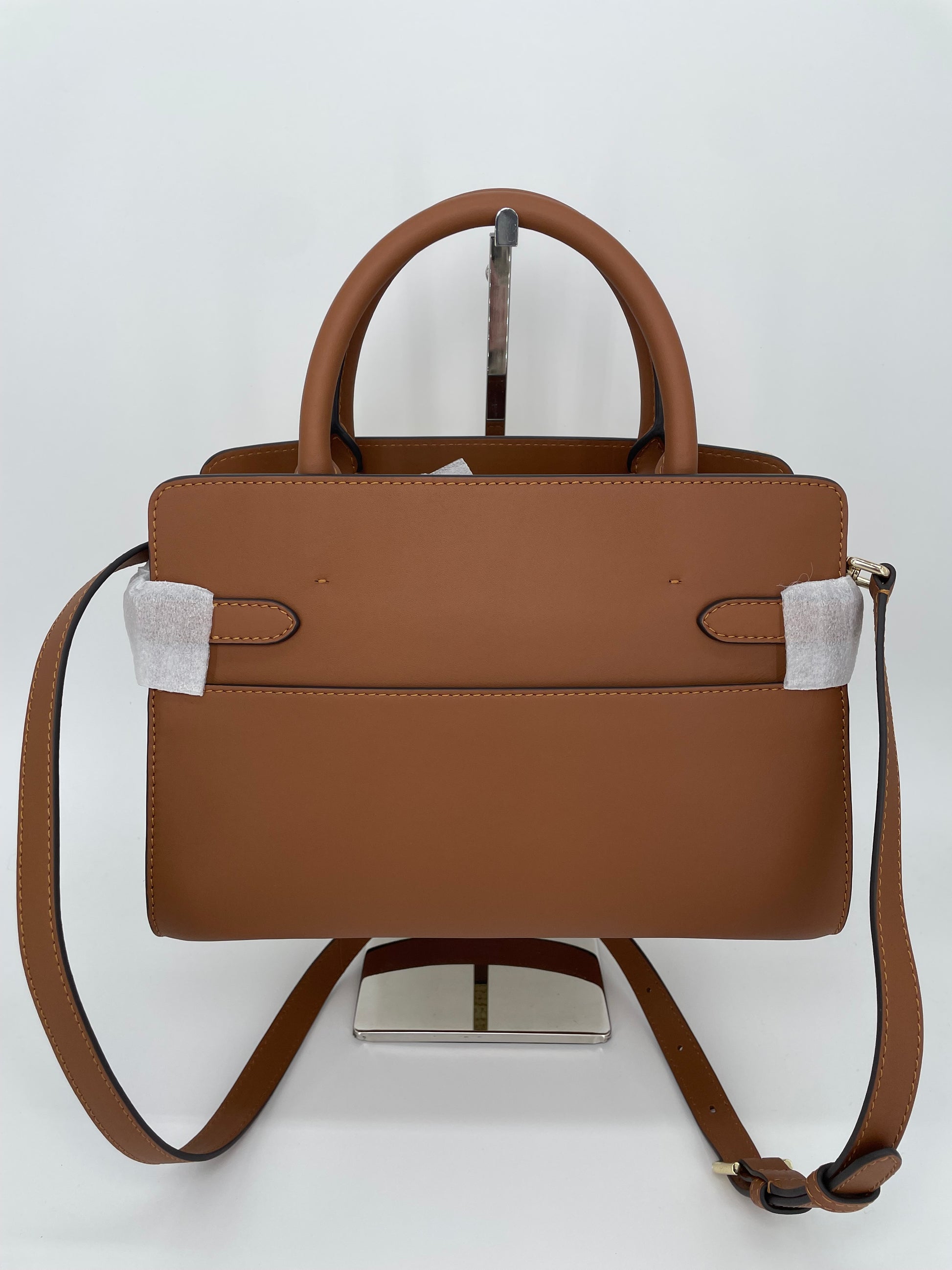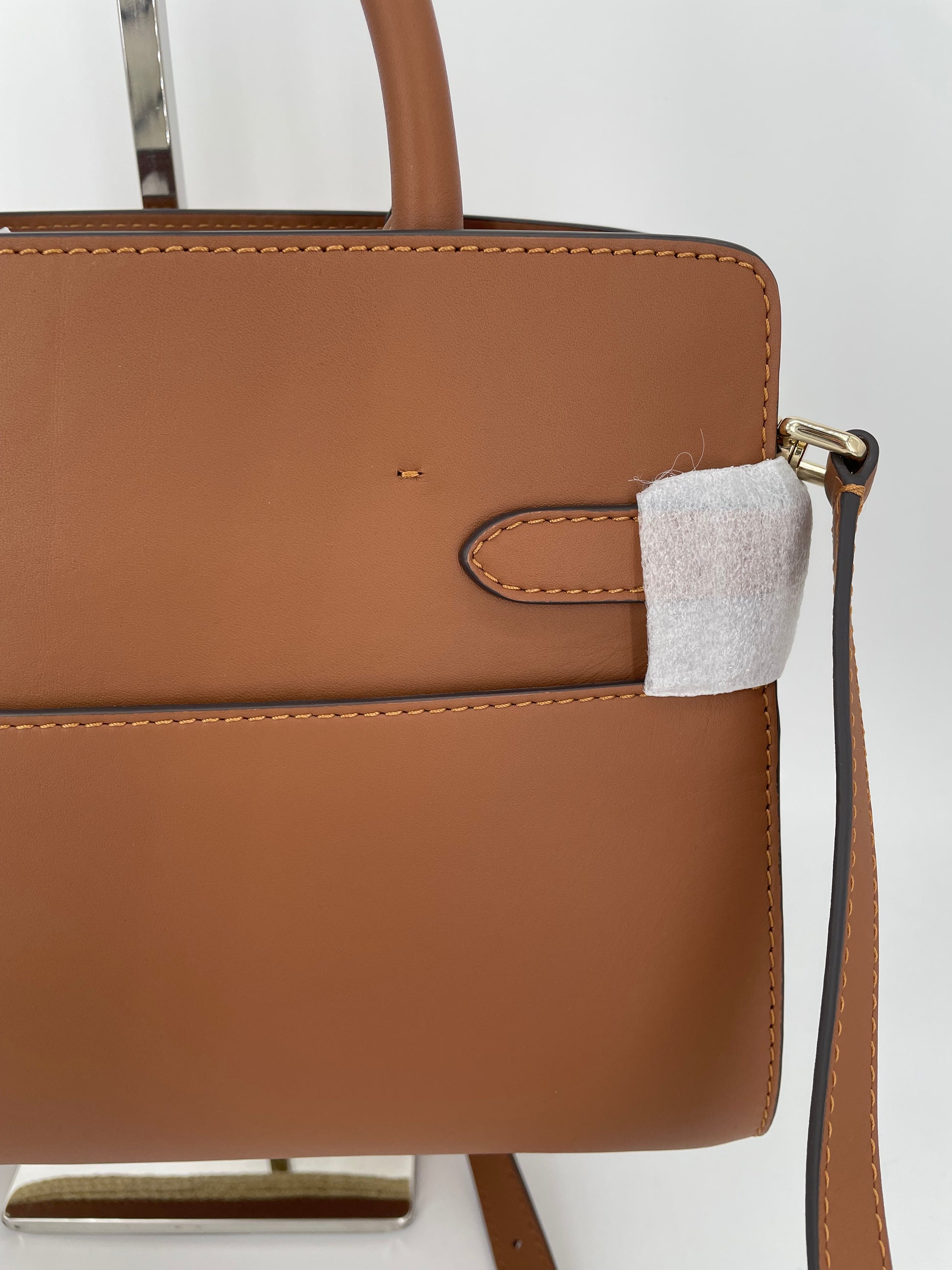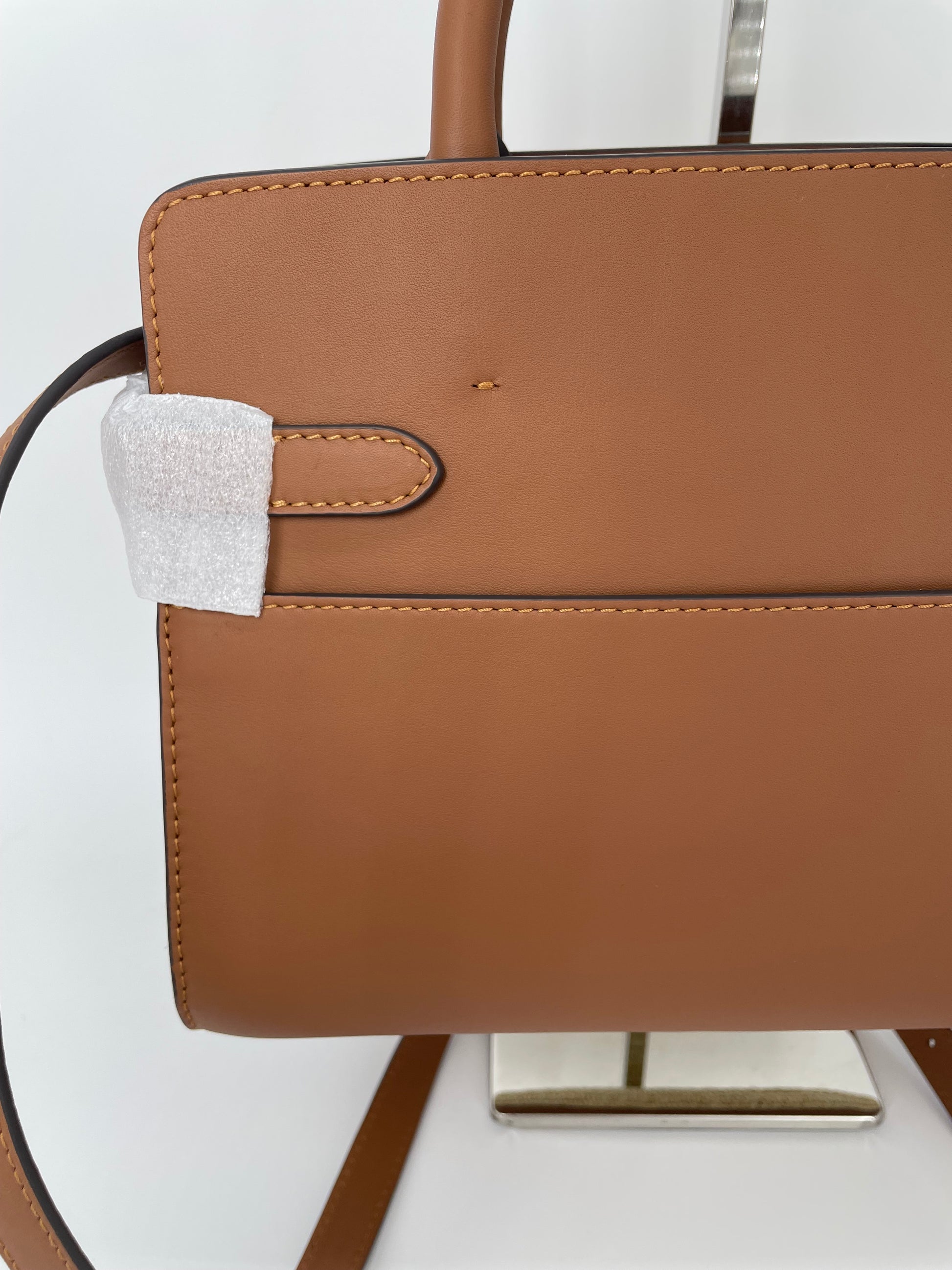 The handbag has rolled top handles and an adjustable and removable crossbody or shoulder strap. This tote features the line's signature T goldtone front hardware detailing. Internally there are two large compartments with a secure zip close pocket to the middle. There are two open zip pockets to both internal walls.