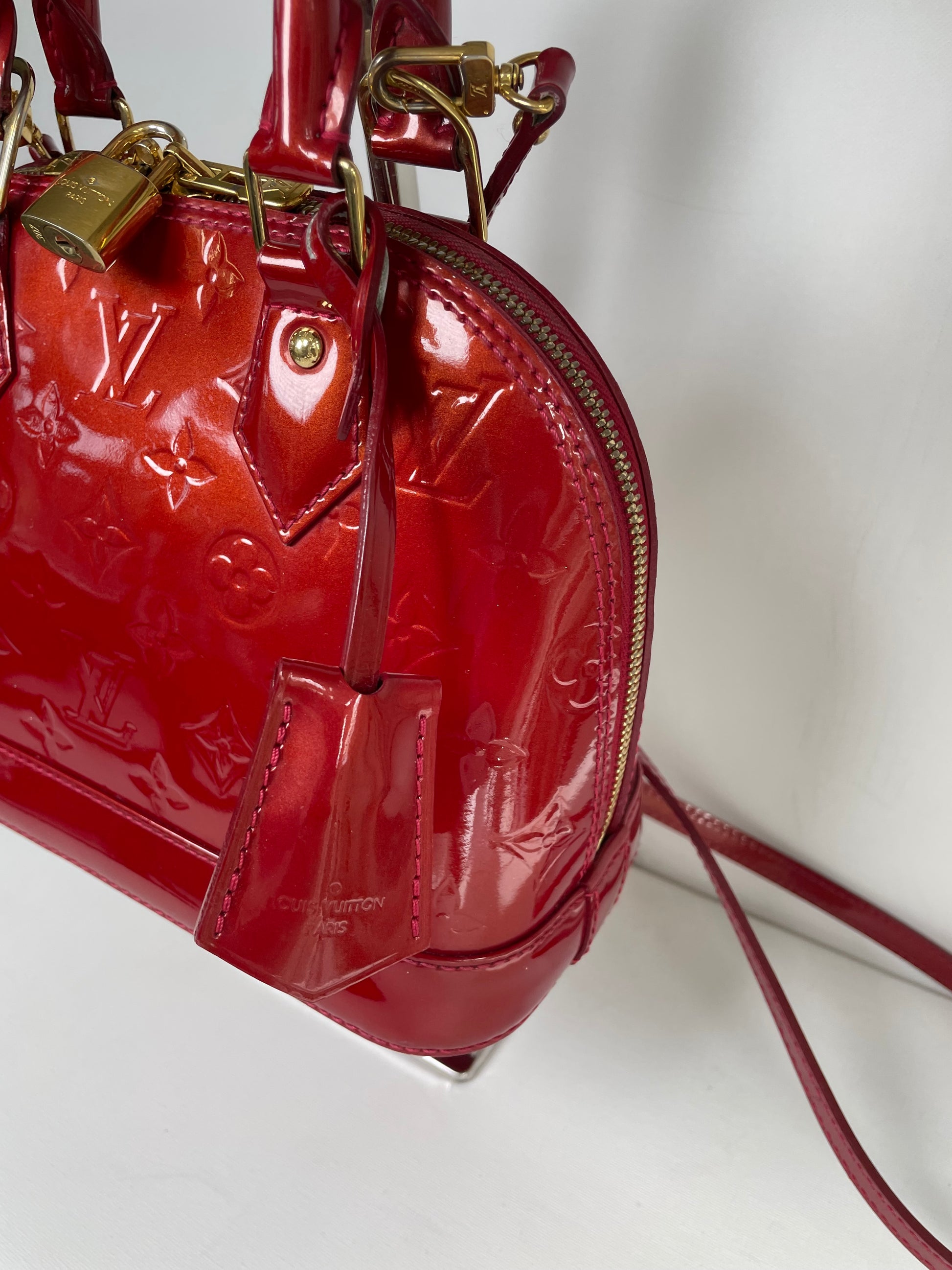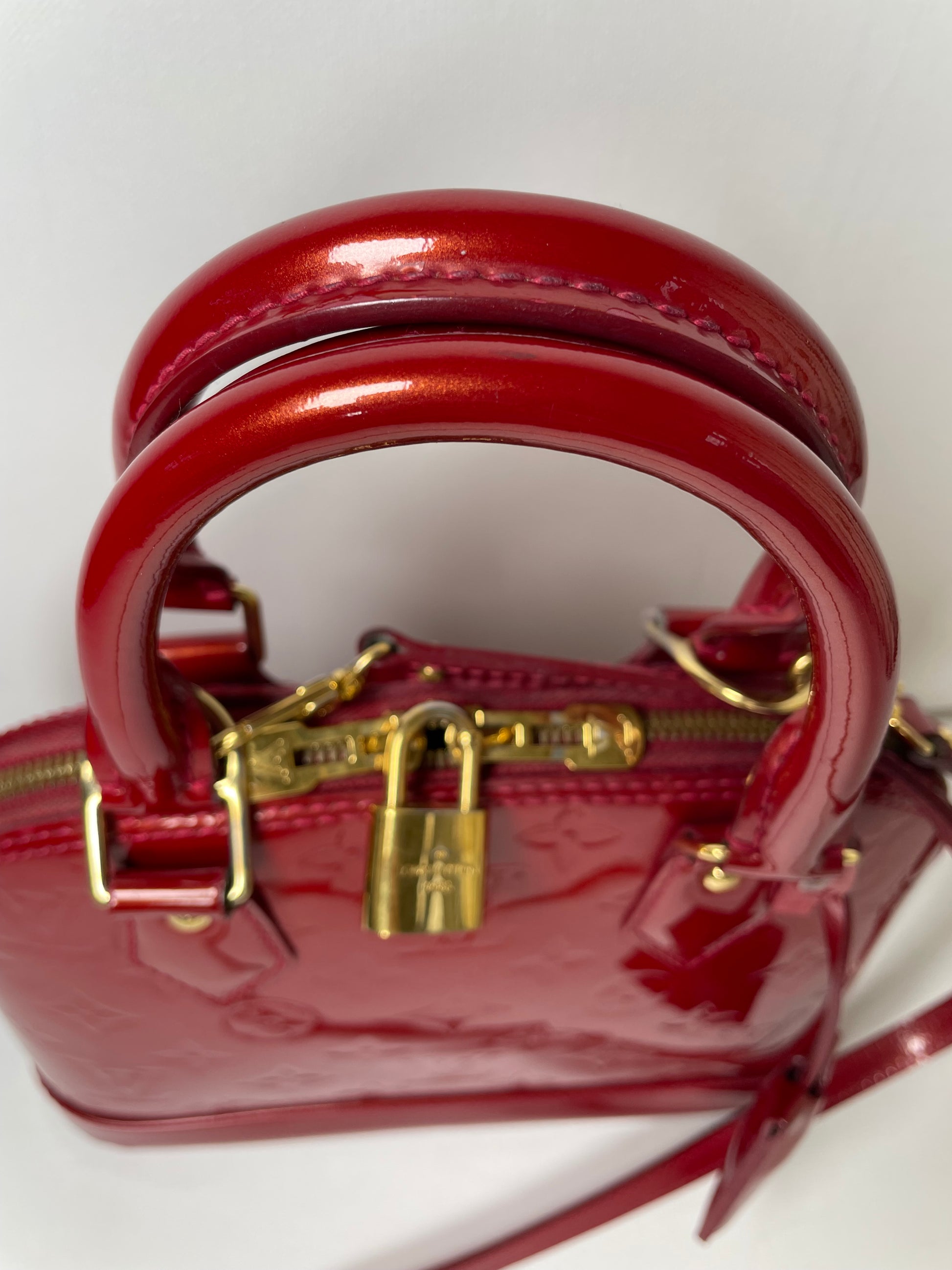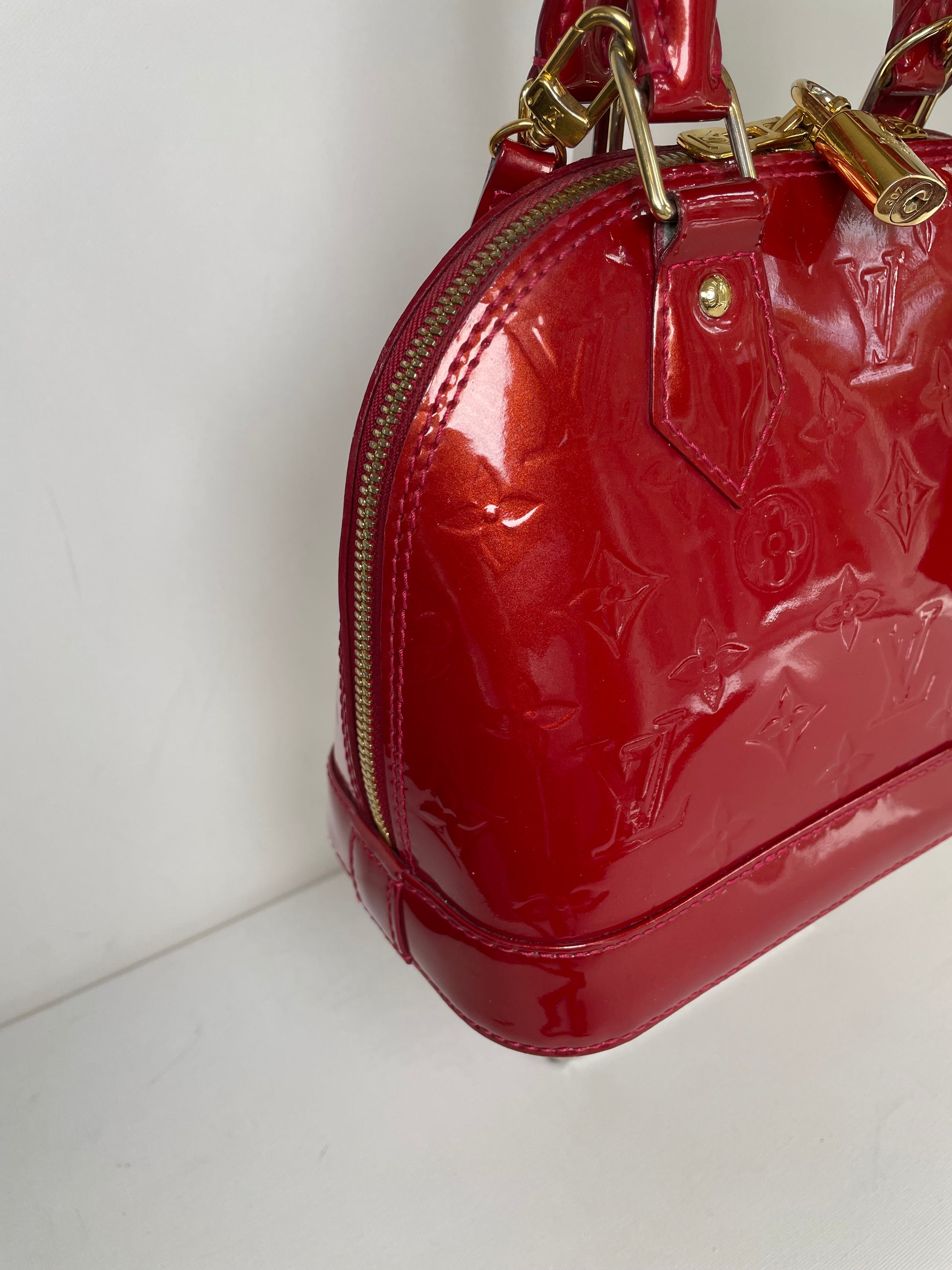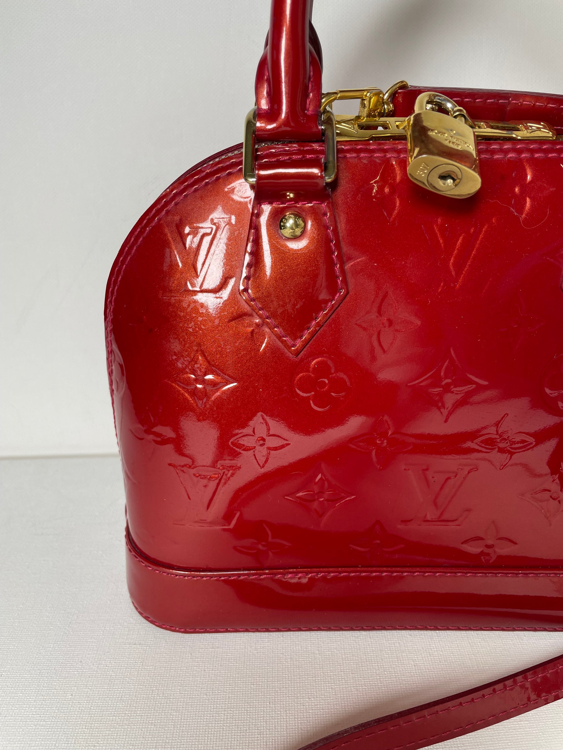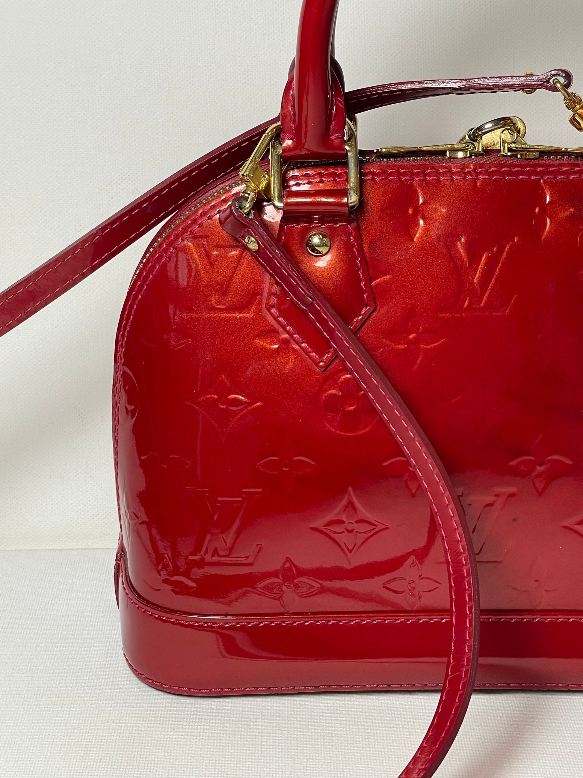 This is a beautiful Louis Vuitton Alma BB in a rich, deep red, high gloss Vernis leather (the colour is cherry red Pomme D'Amour)