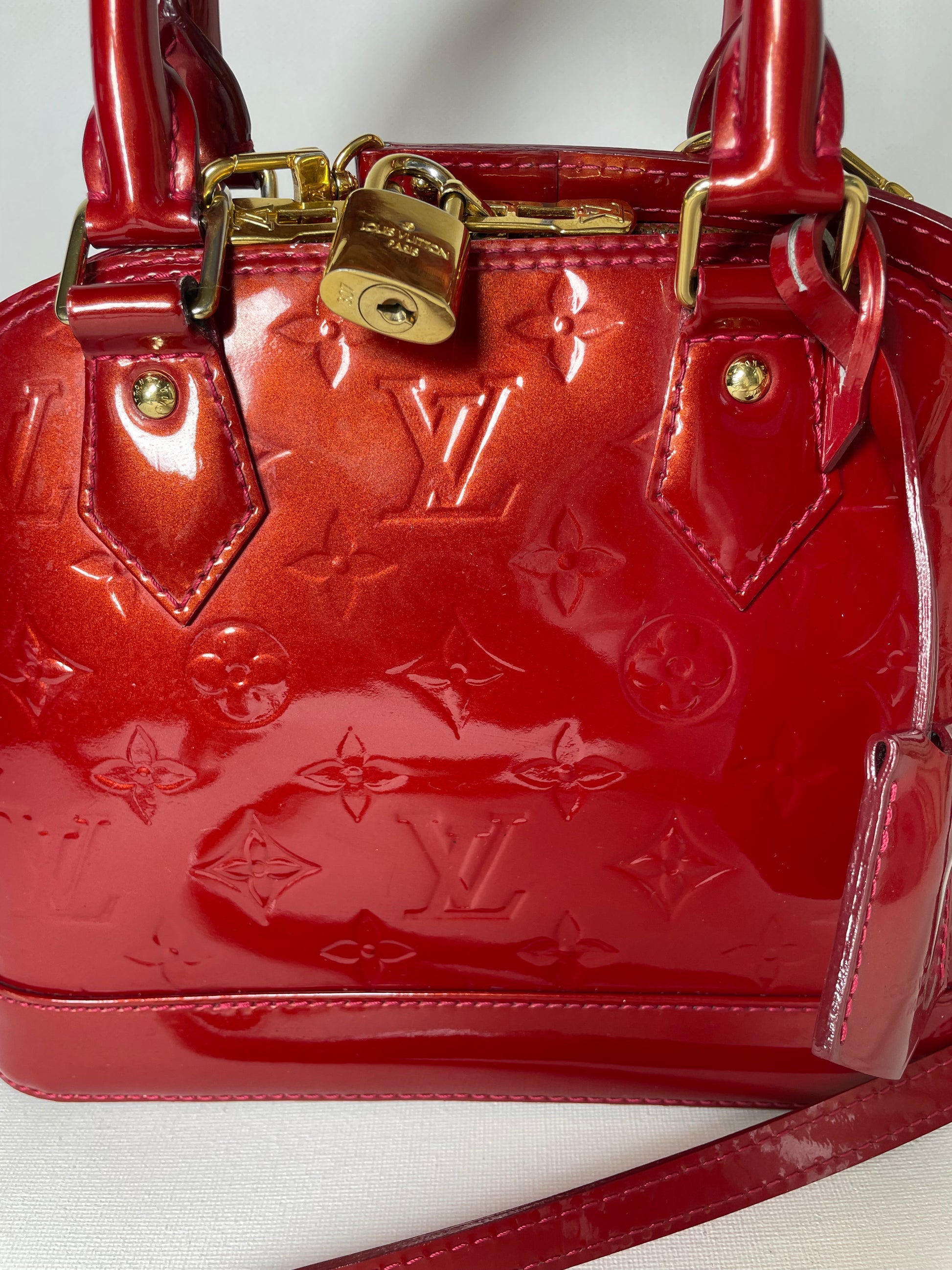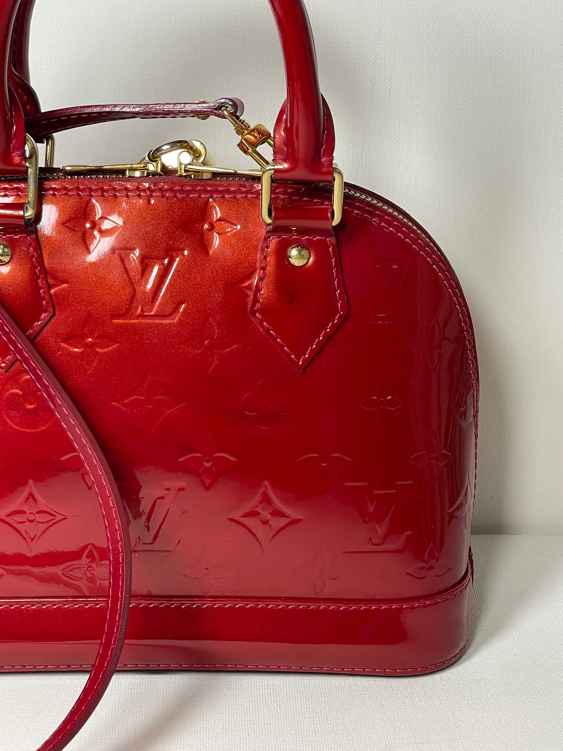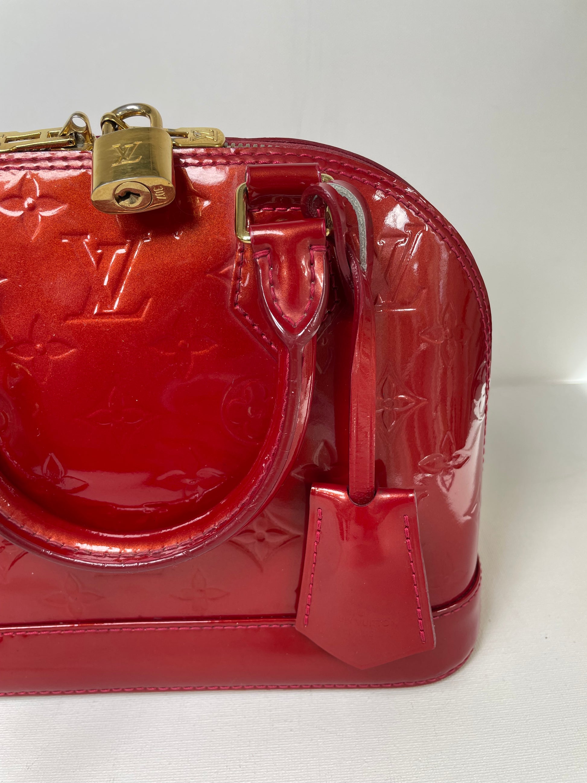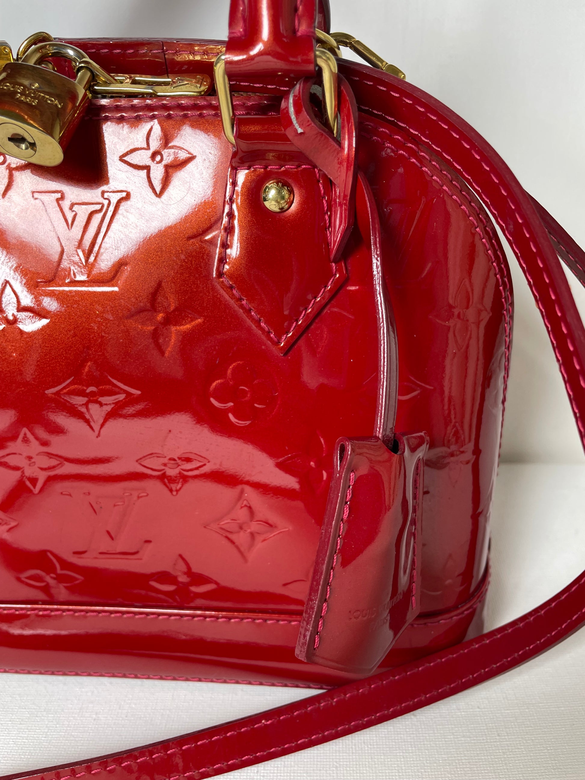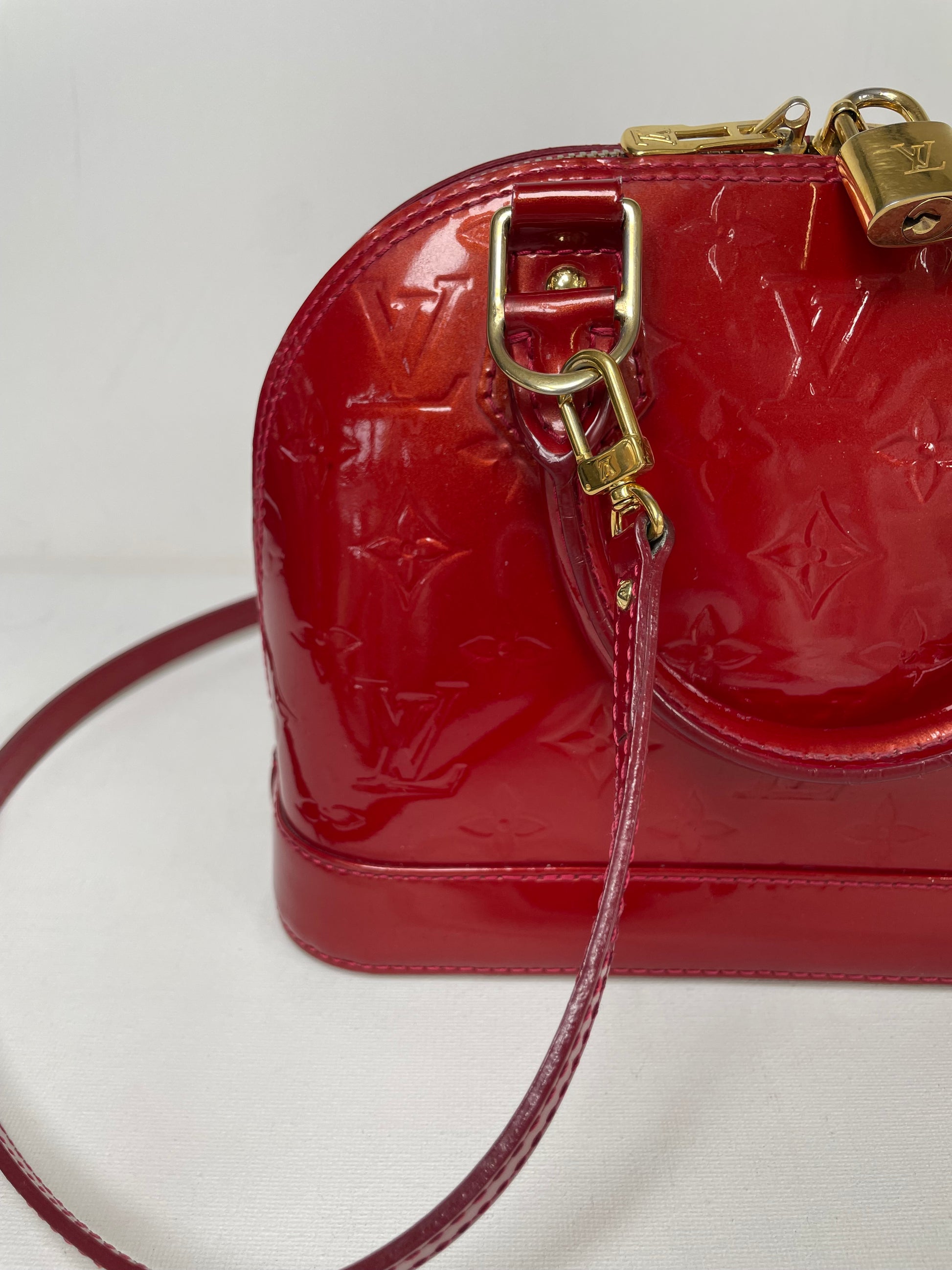 This is a beautiful Louis Vuitton Alma BB in a rich, deep red, high gloss Vernis leather (the colour is cherry red Pomme D'Amour)