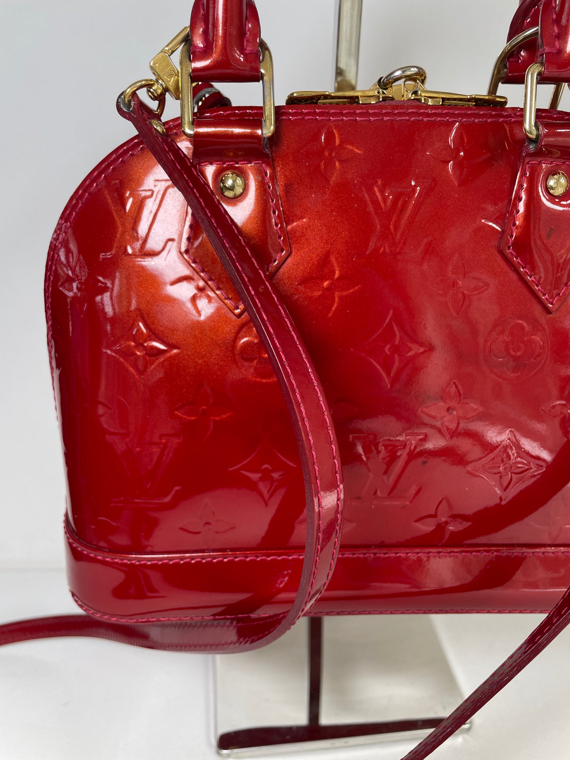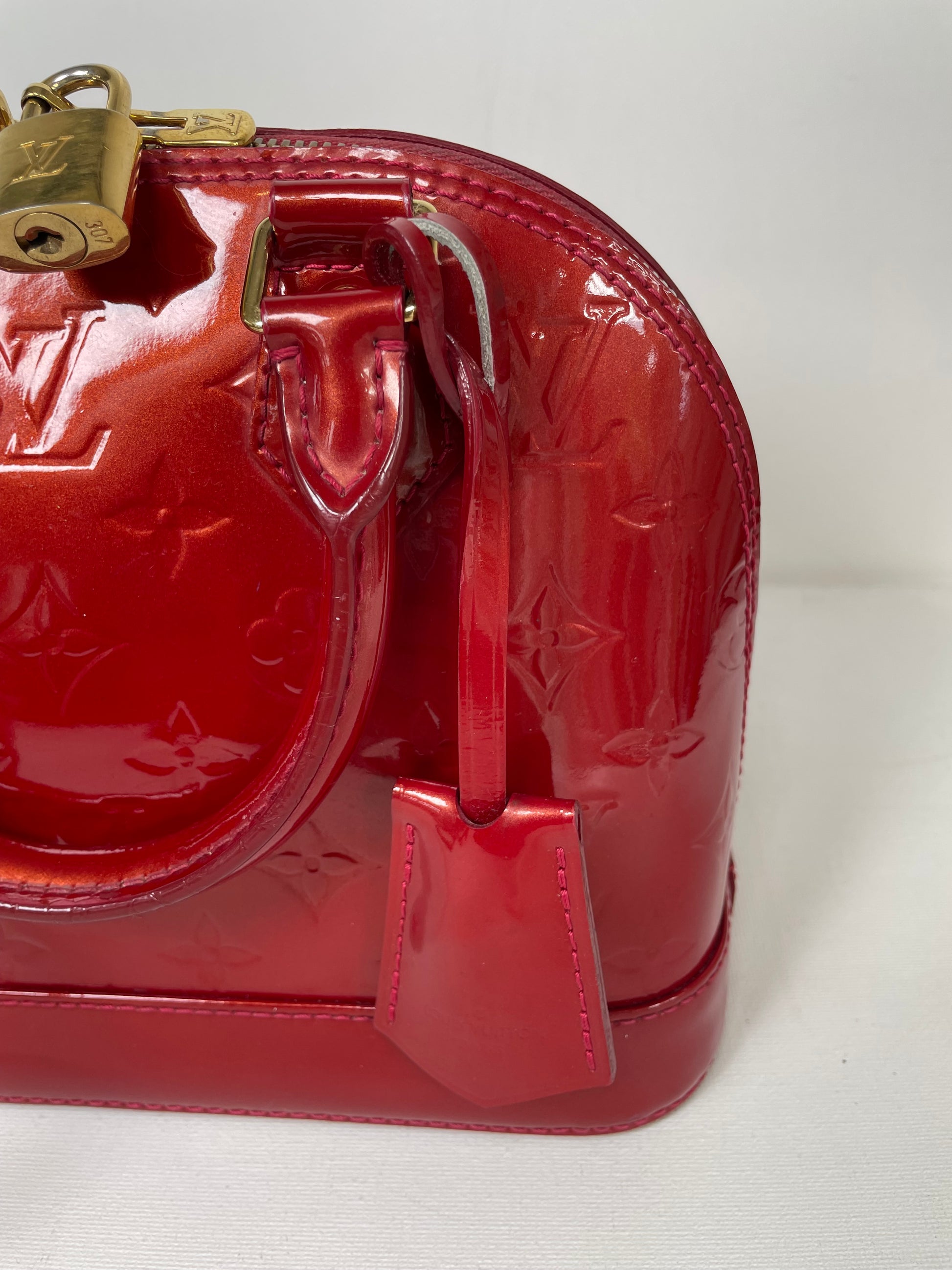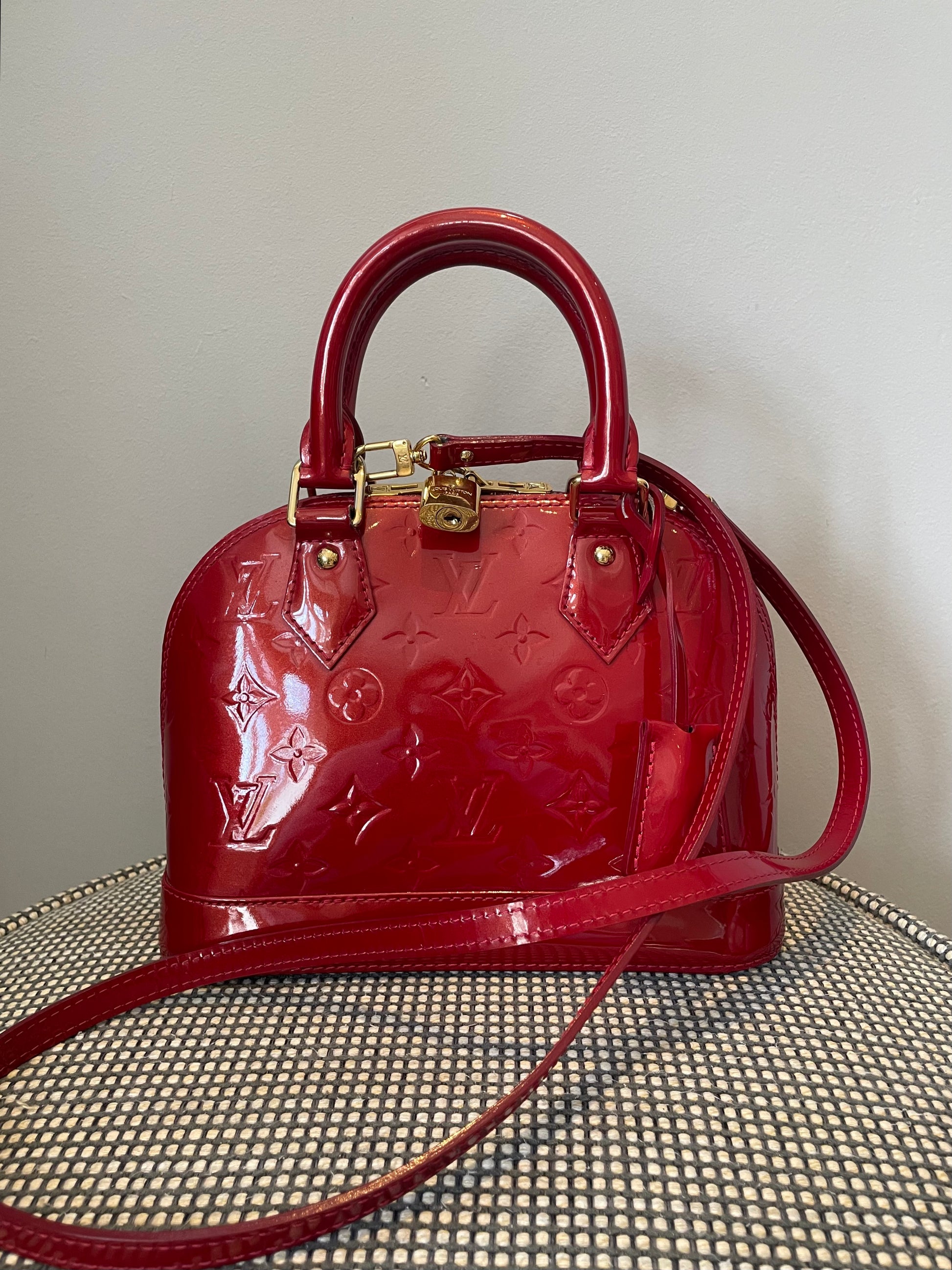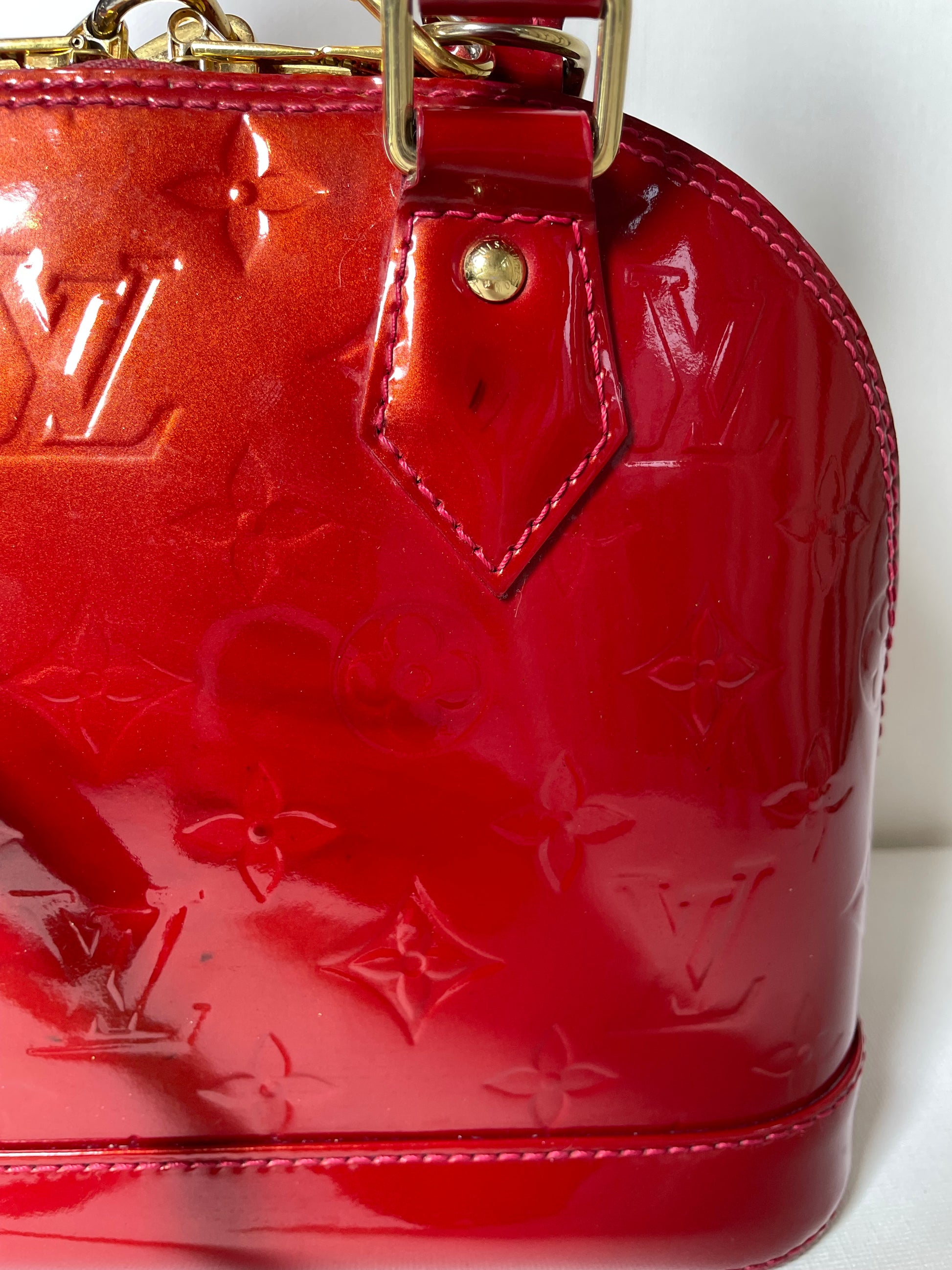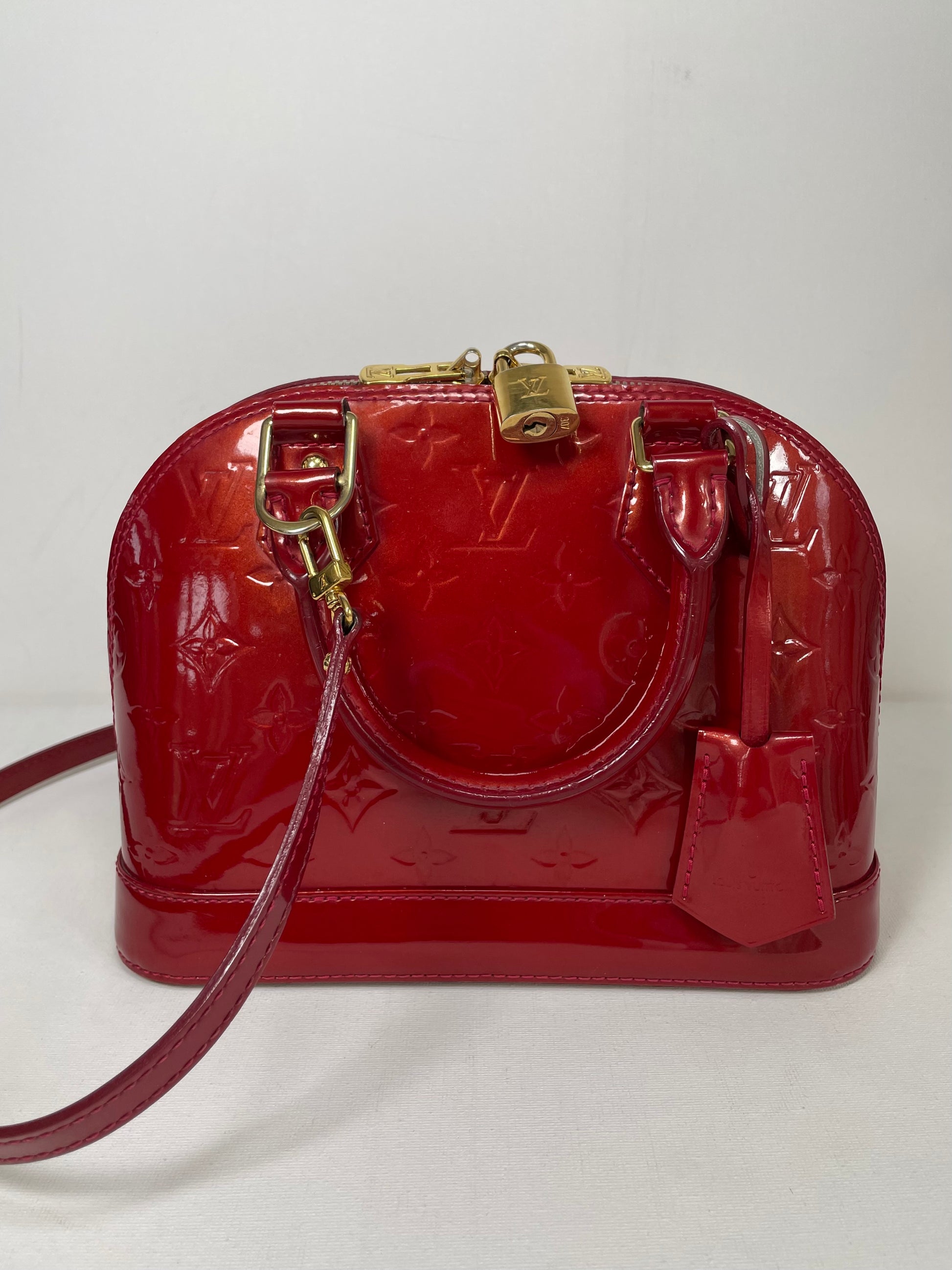 This is a beautiful Louis Vuitton Alma BB in a rich, deep red, high gloss Vernis leather (the colour is cherry red Pomme D'Amour)