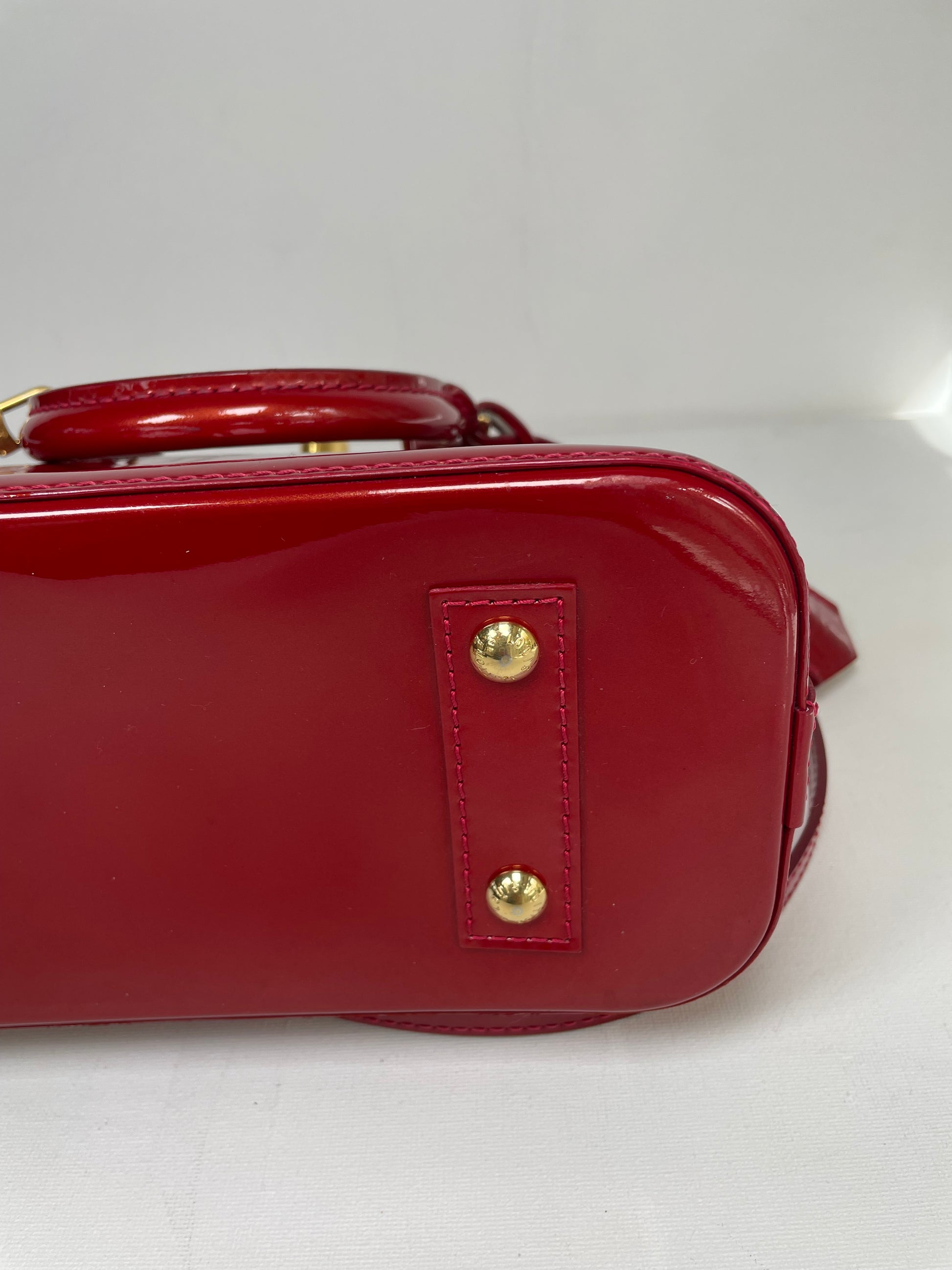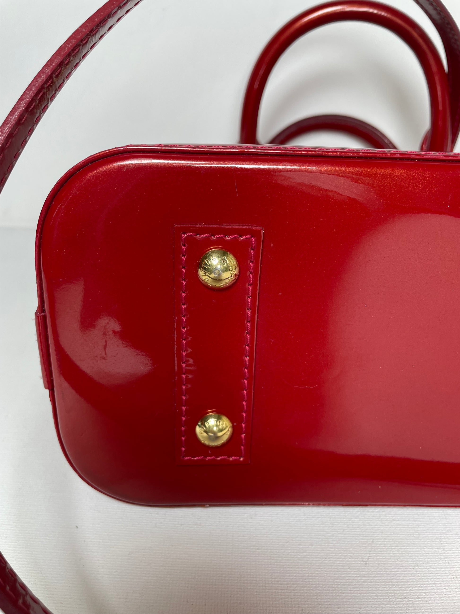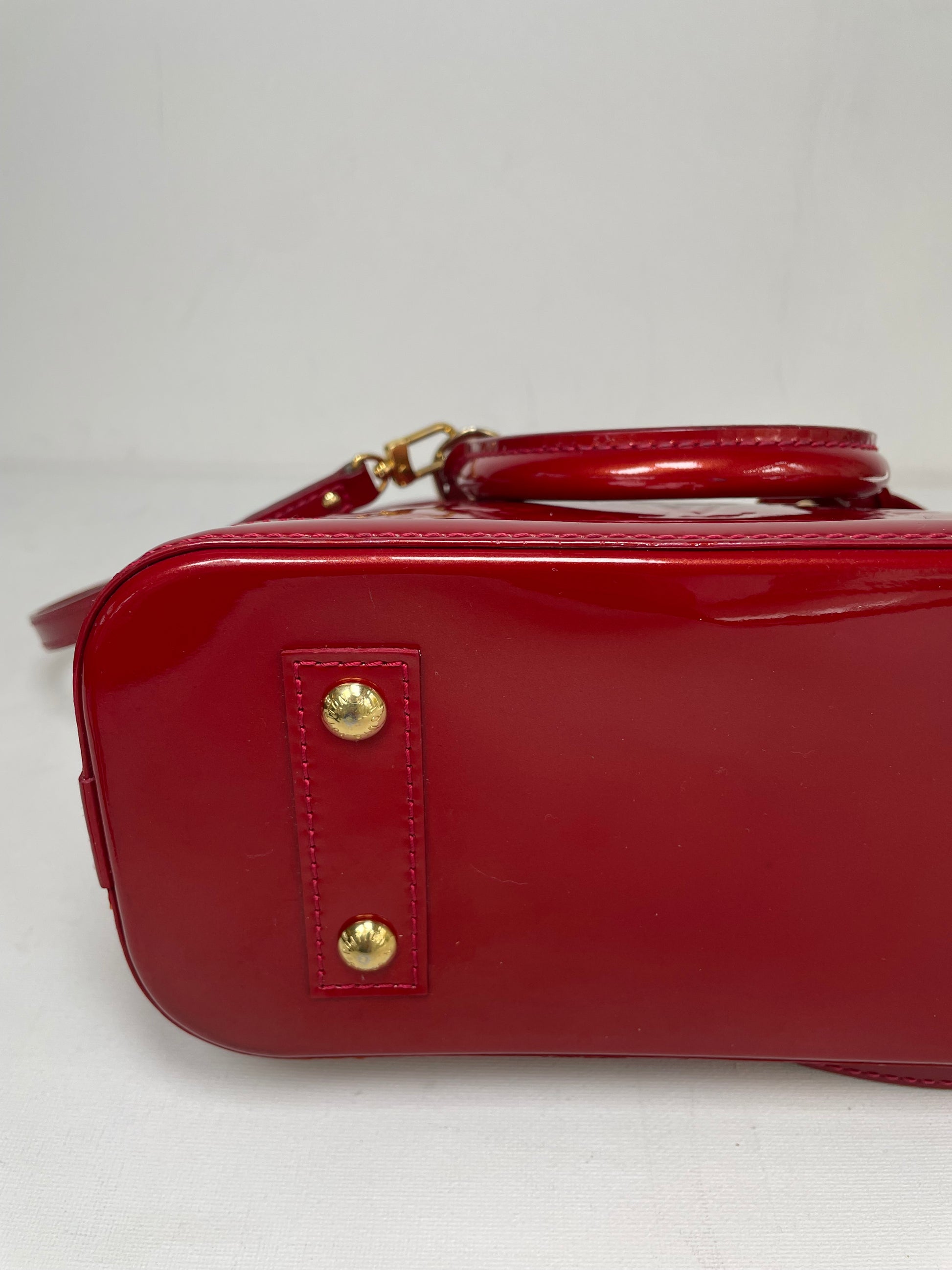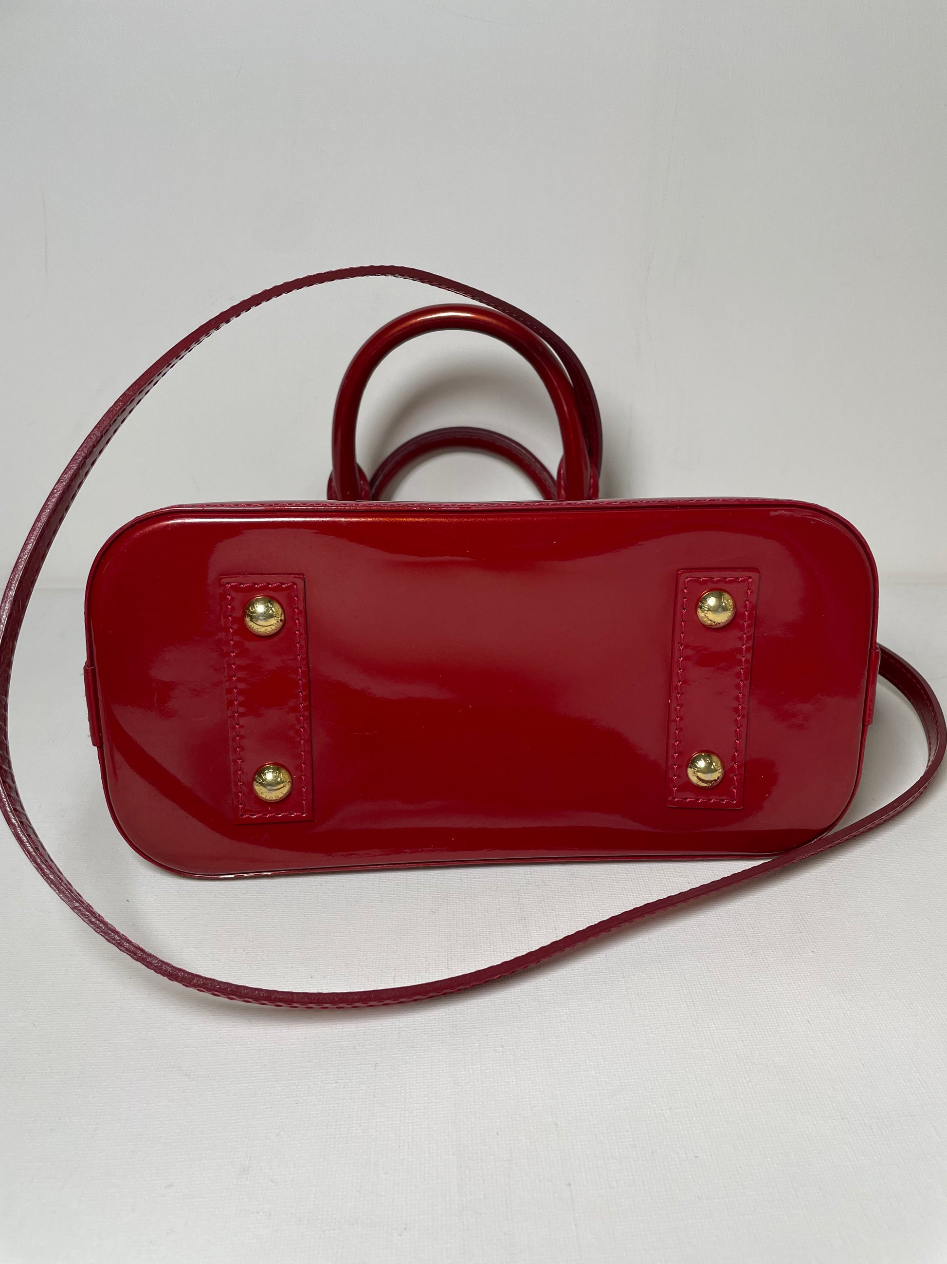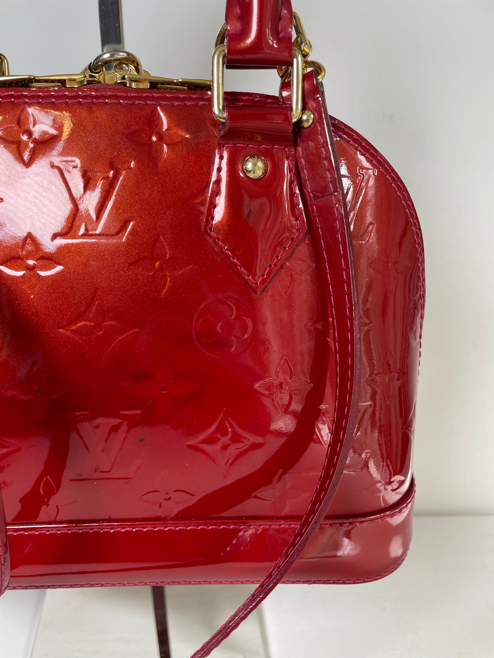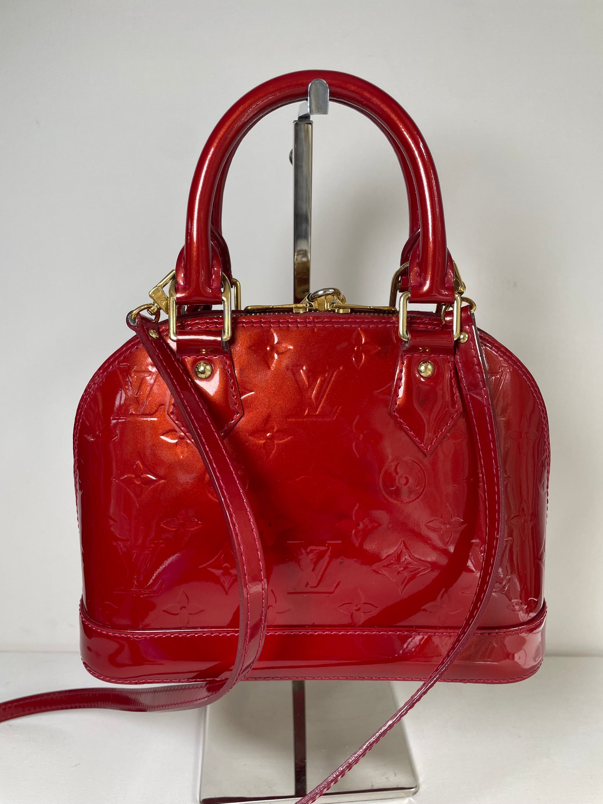This is a beautiful Louis Vuitton Alma BB in a rich, deep red, high gloss Vernis leather (the colour is cherry red Pomme D'Amour)