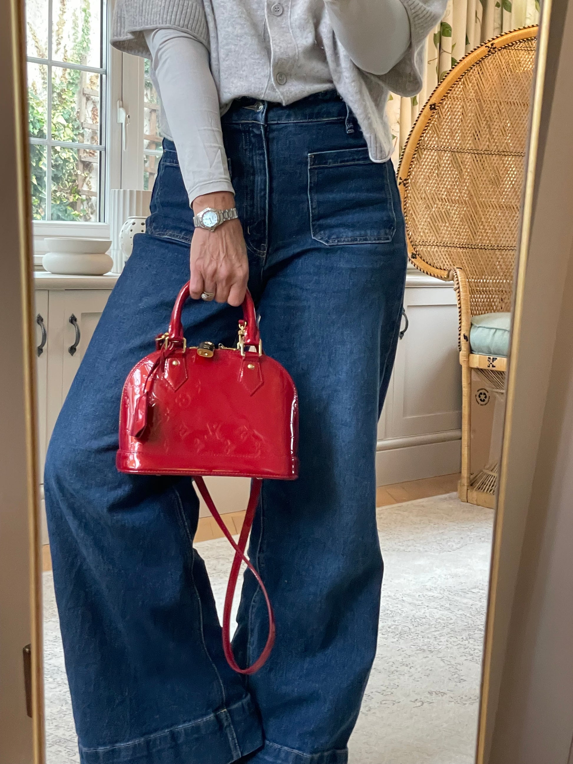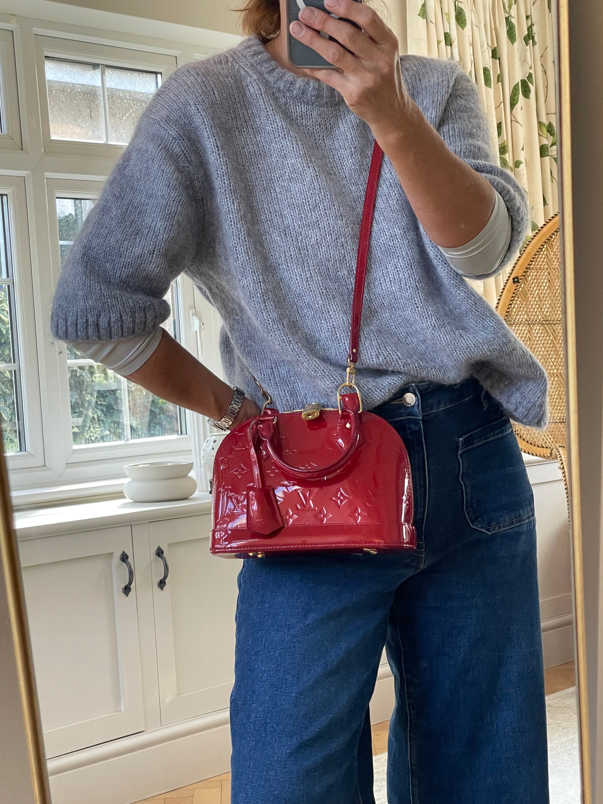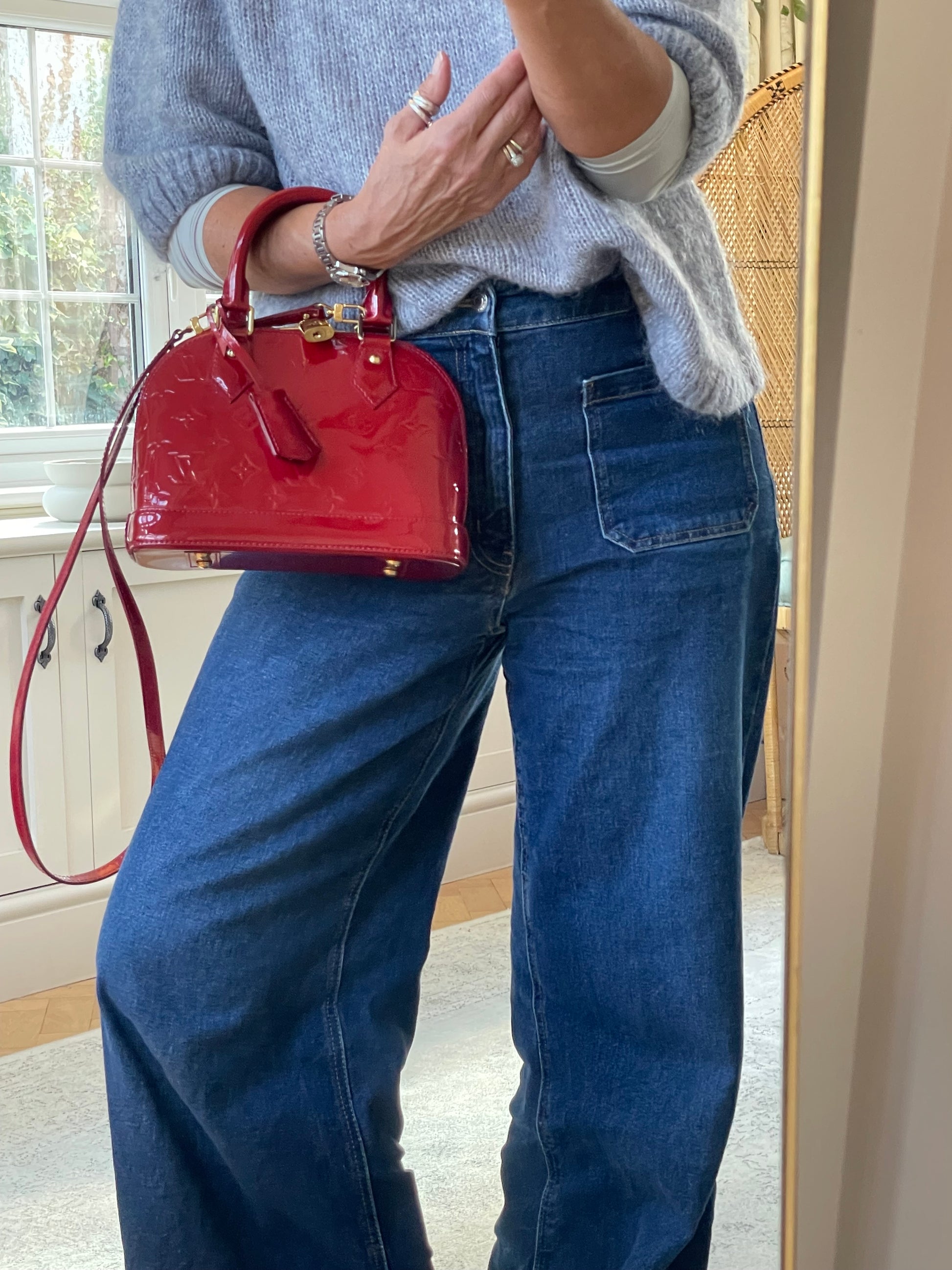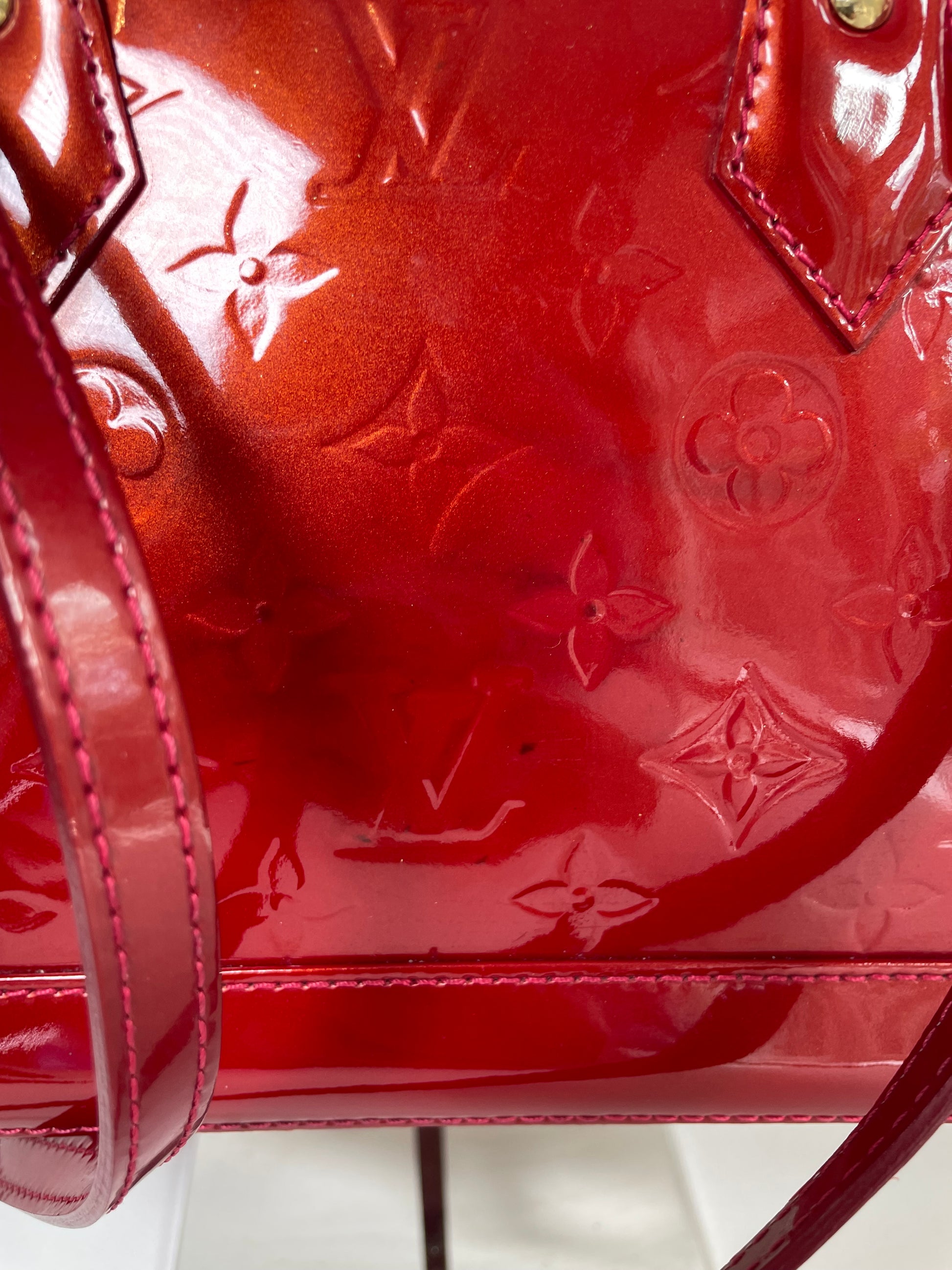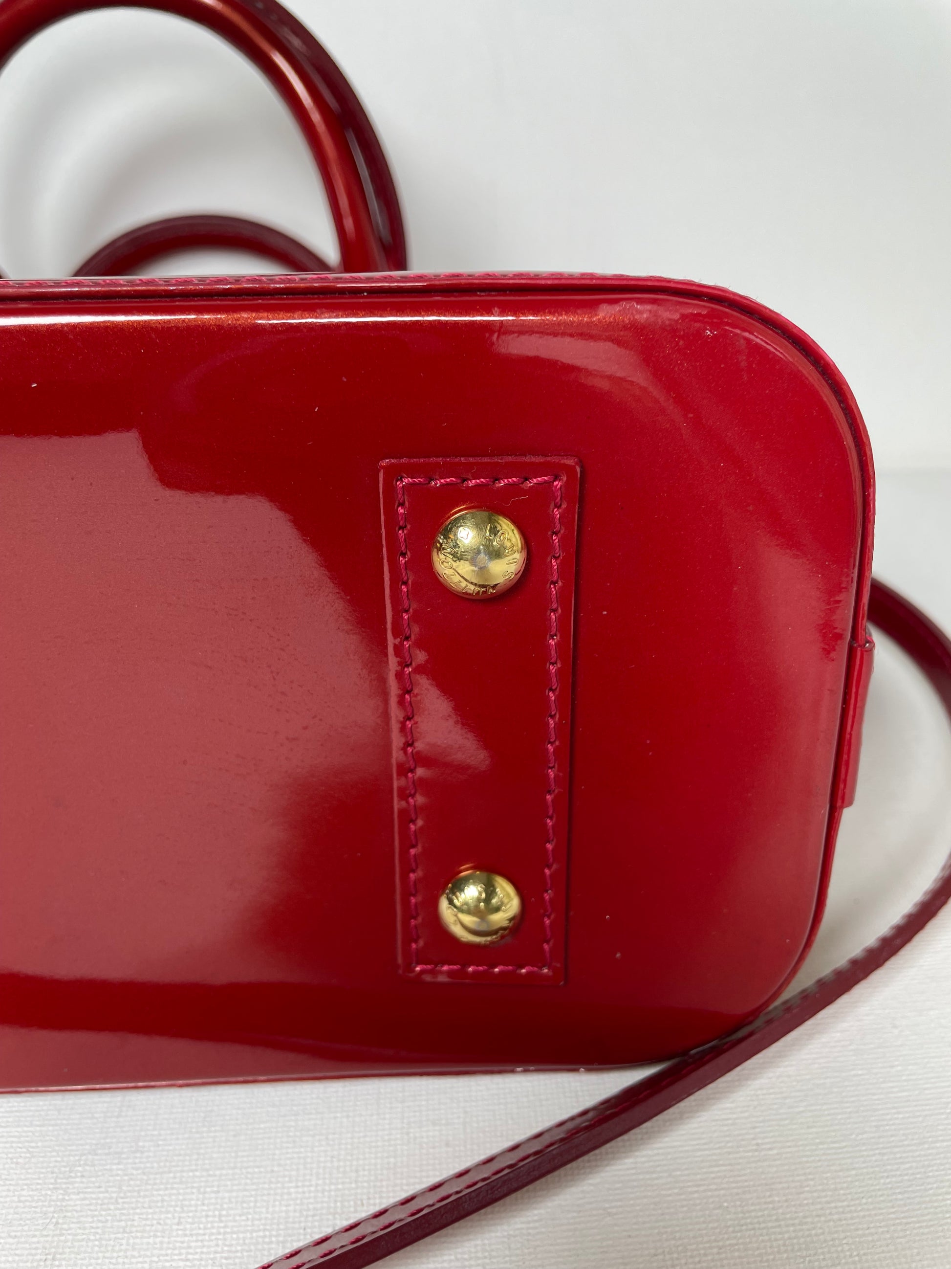 This is a beautiful Louis Vuitton Alma BB in a rich, deep red, high gloss Vernis leather (the colour is cherry red Pomme D'Amour)