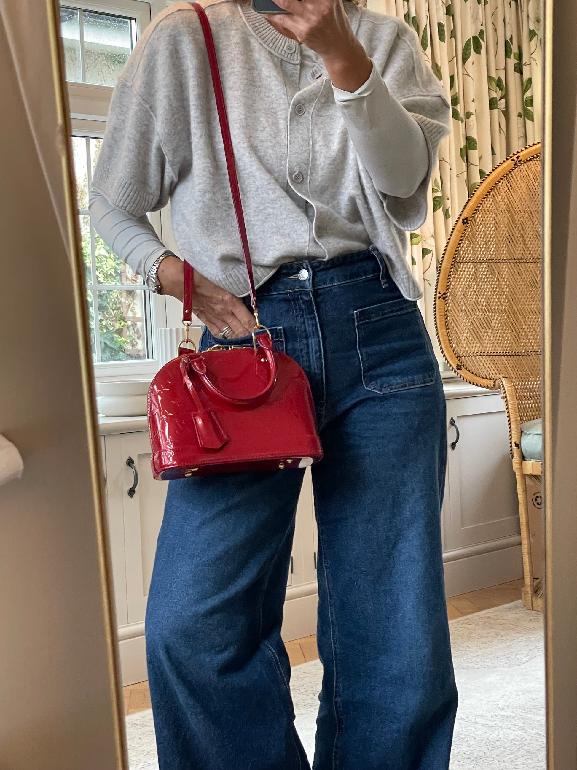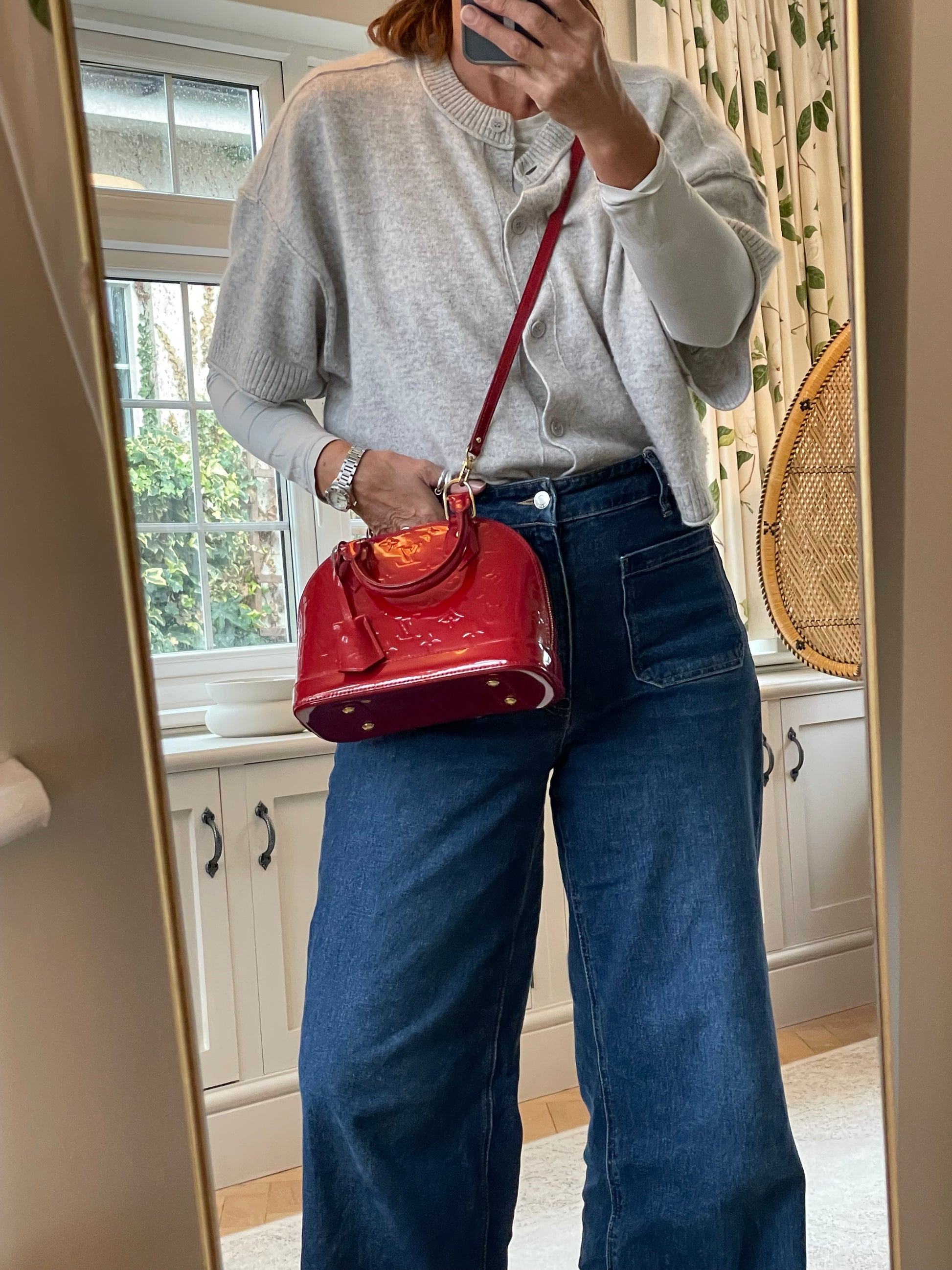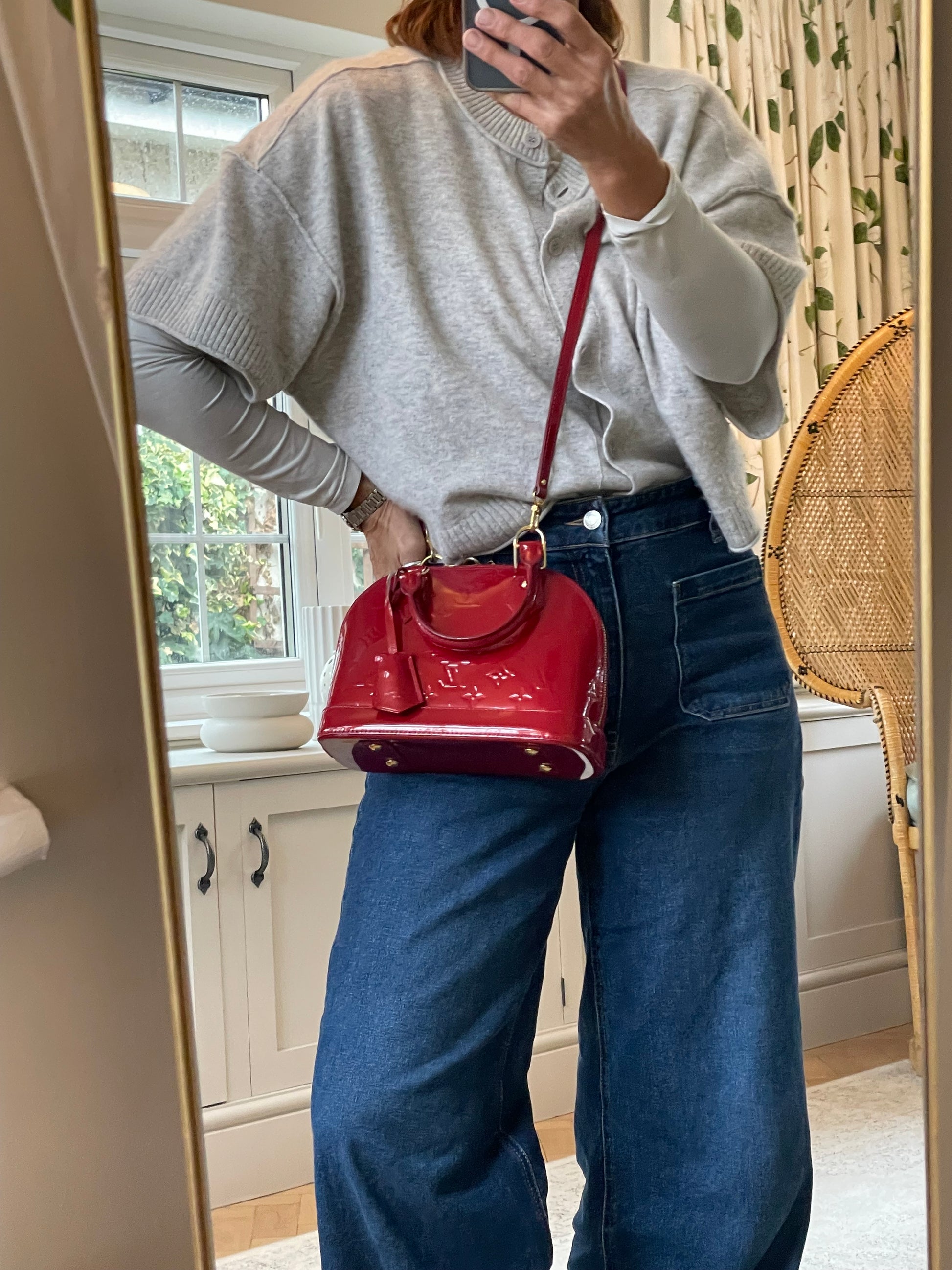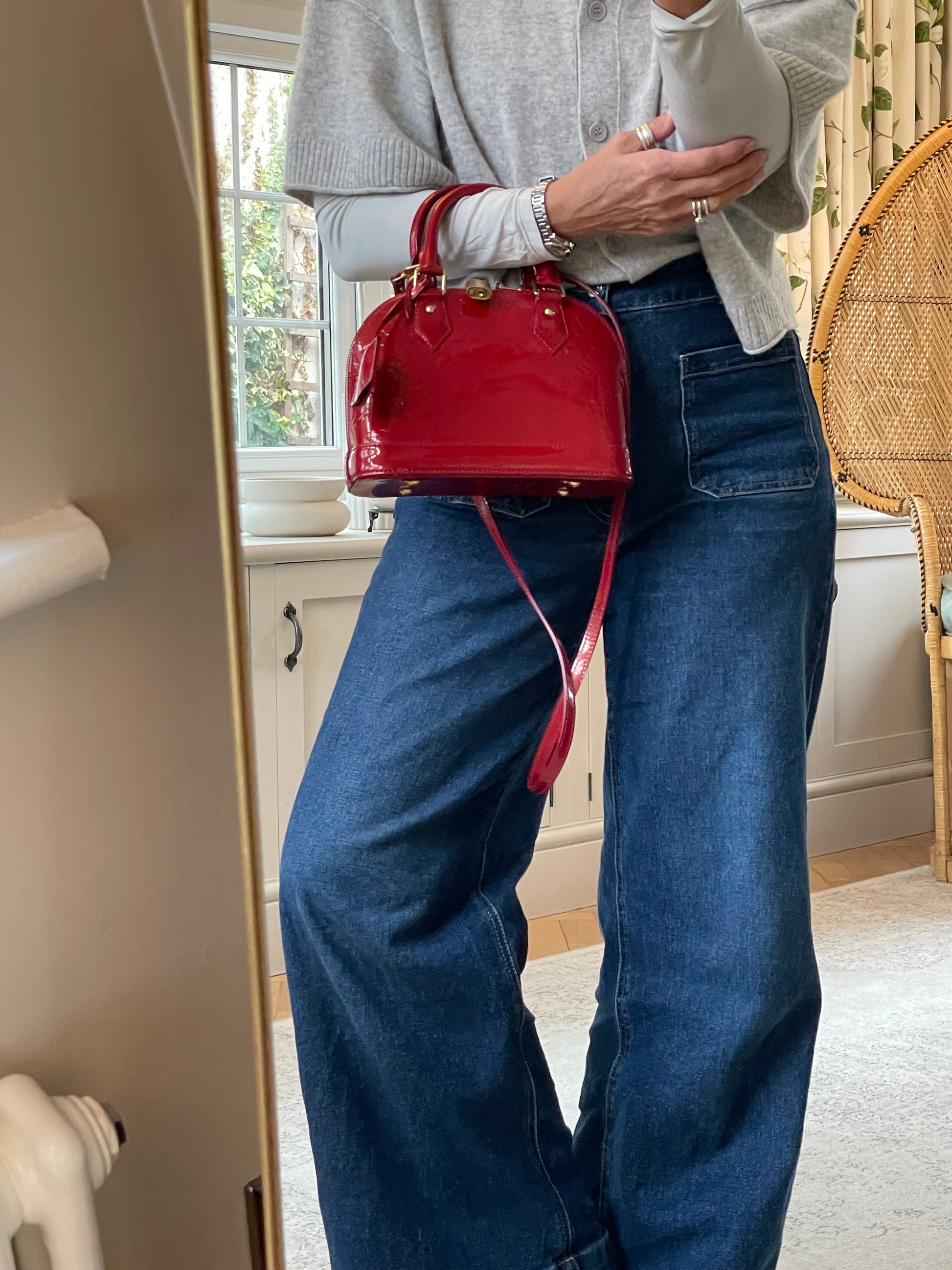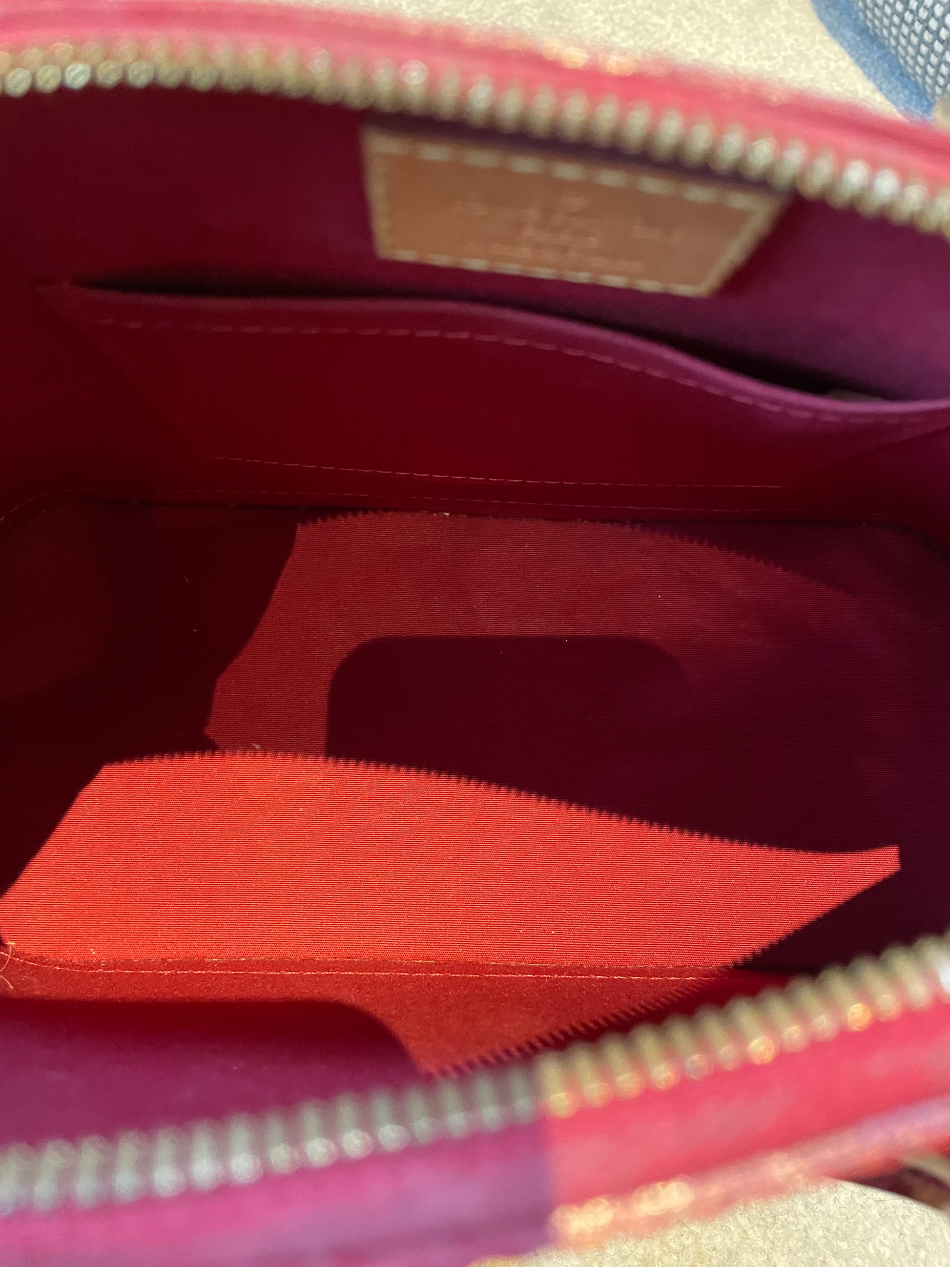 This is a beautiful Louis Vuitton Alma BB in a rich, deep red, high gloss Vernis leather (the colour is cherry red Pomme D'Amour)